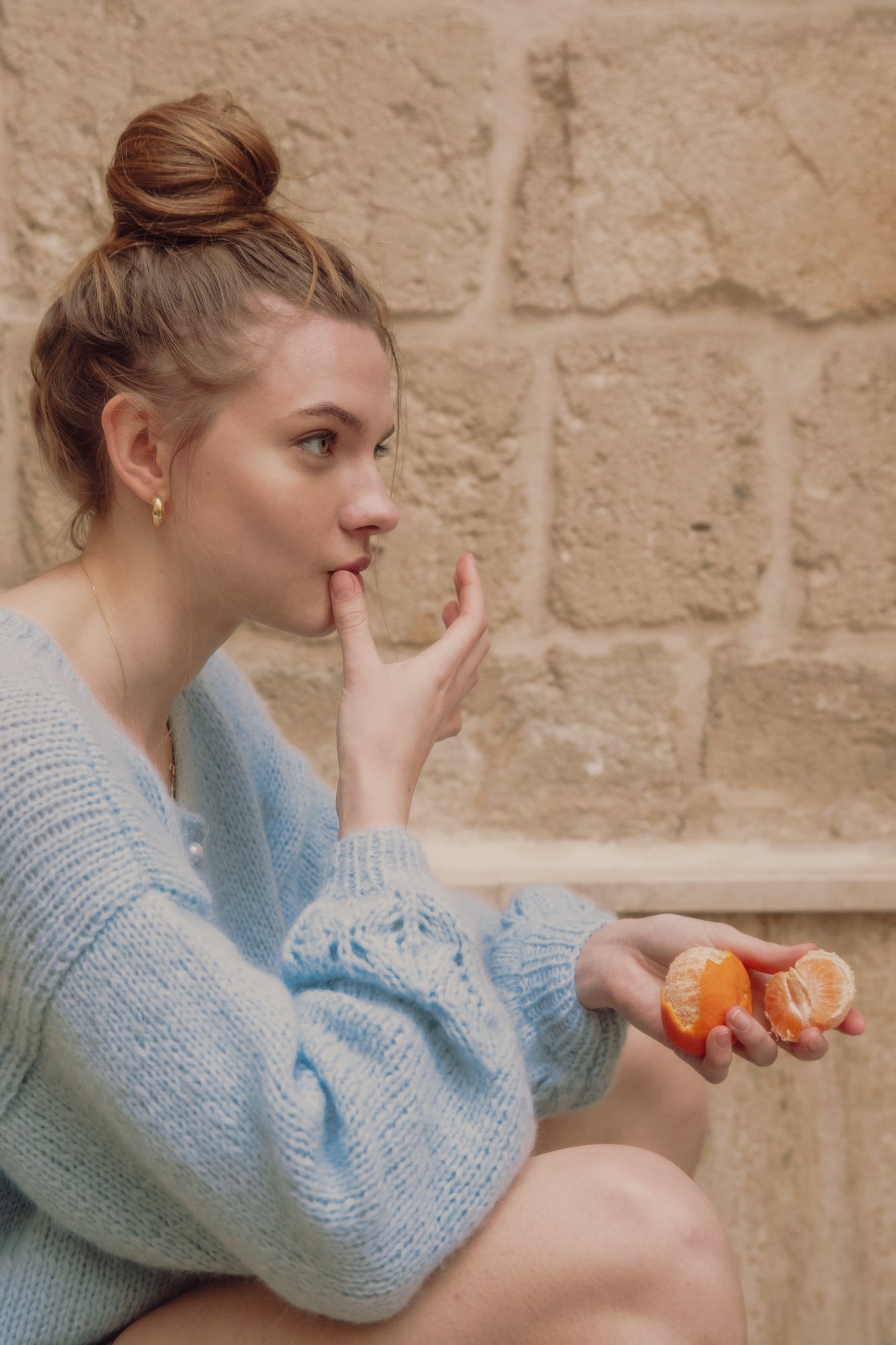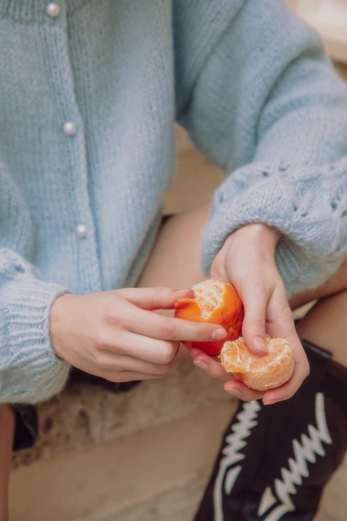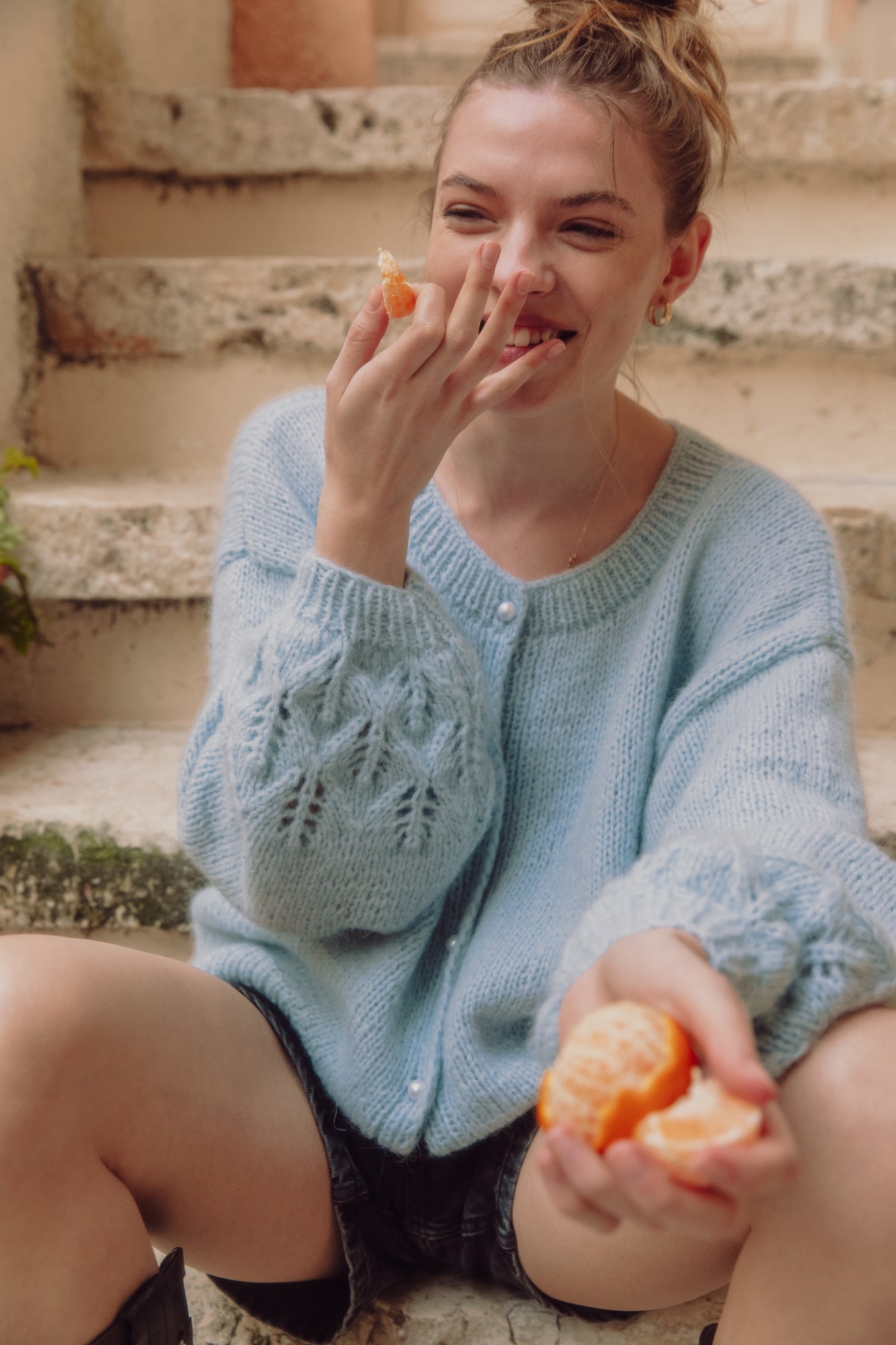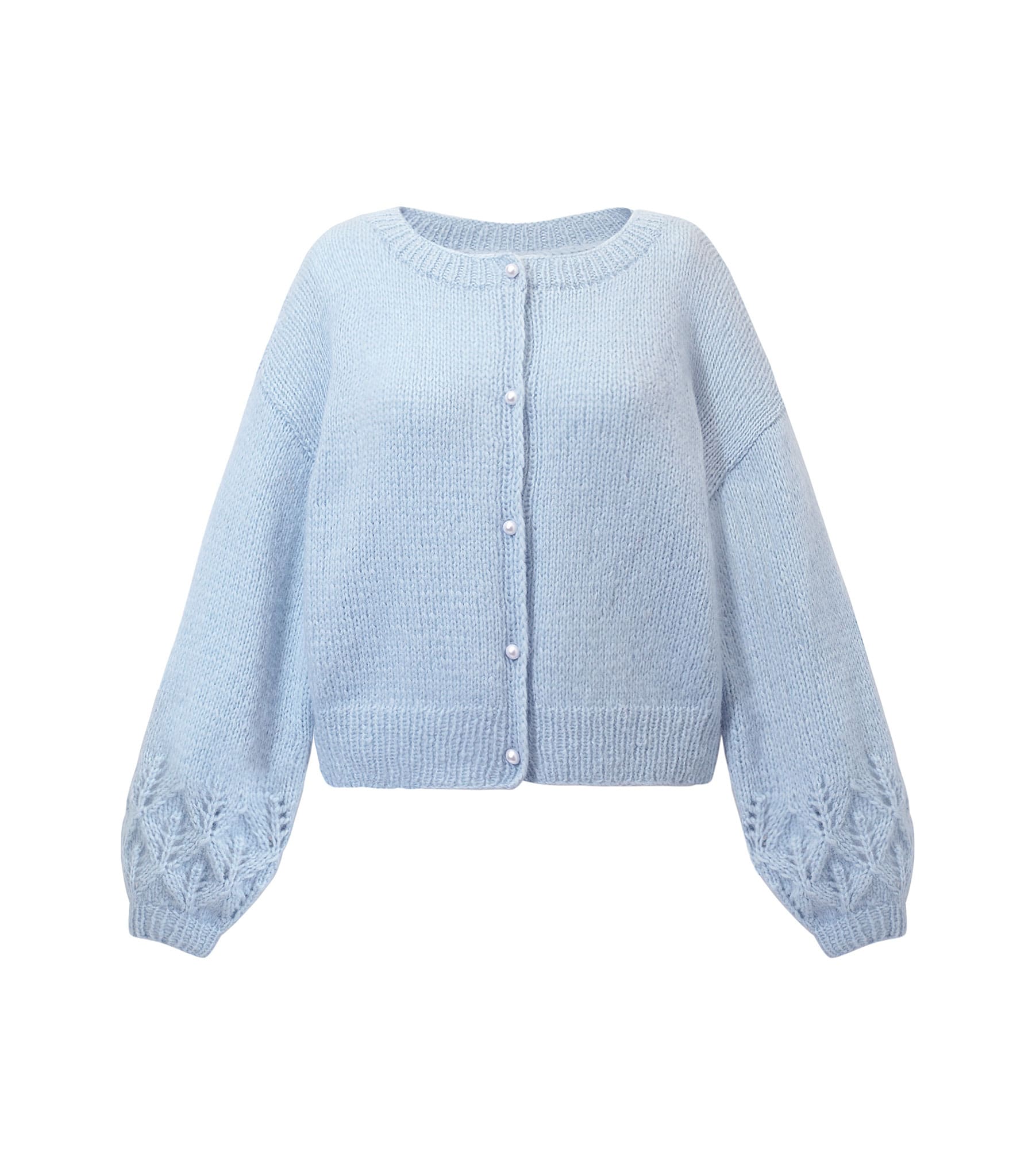 Co powstanie kiedy do najbardziej pastelowego z pastelowych odcieni niebieskiego dodacie dwie szczpty pereł i jedną szczyptę ażurów? Powstanie ultramiękki sweter o romantycznym zabarwieniu. W komplecie z jasnymi jeansami stworzy dziewczęcy look. Wolisz podkręconą opcję? Włóż szorty i kowbojki! Wydziergany ręcznie, w Polsce.