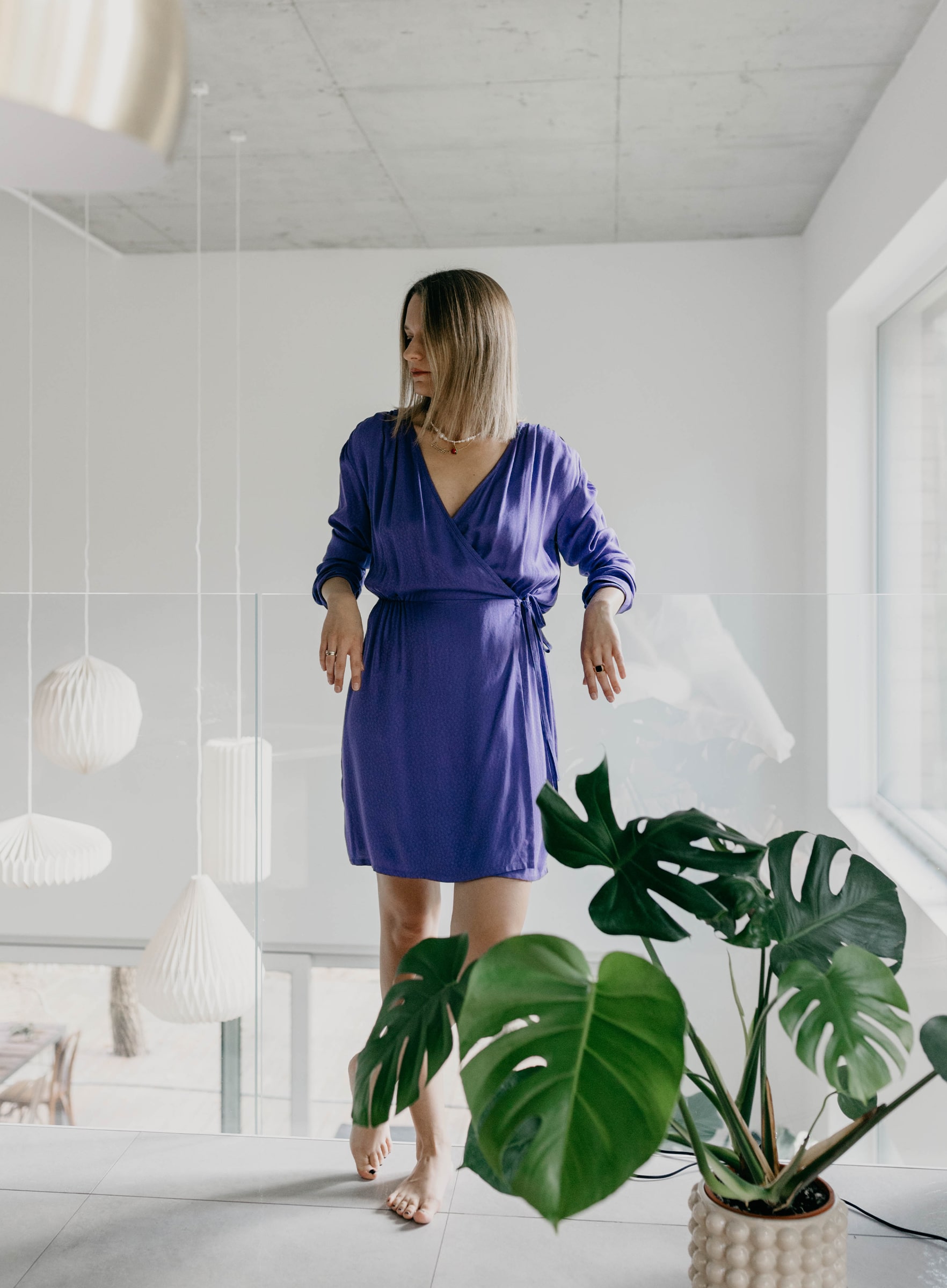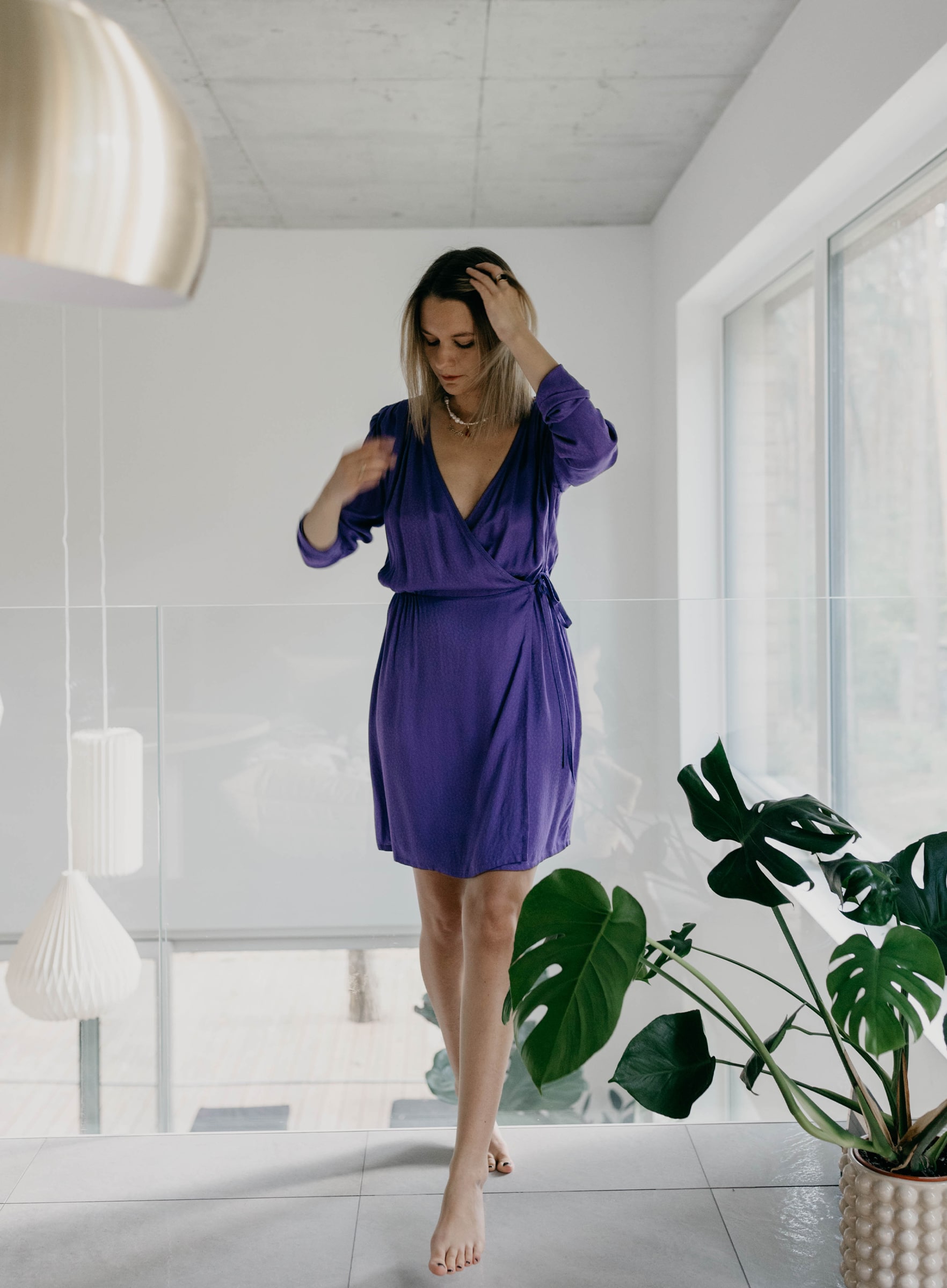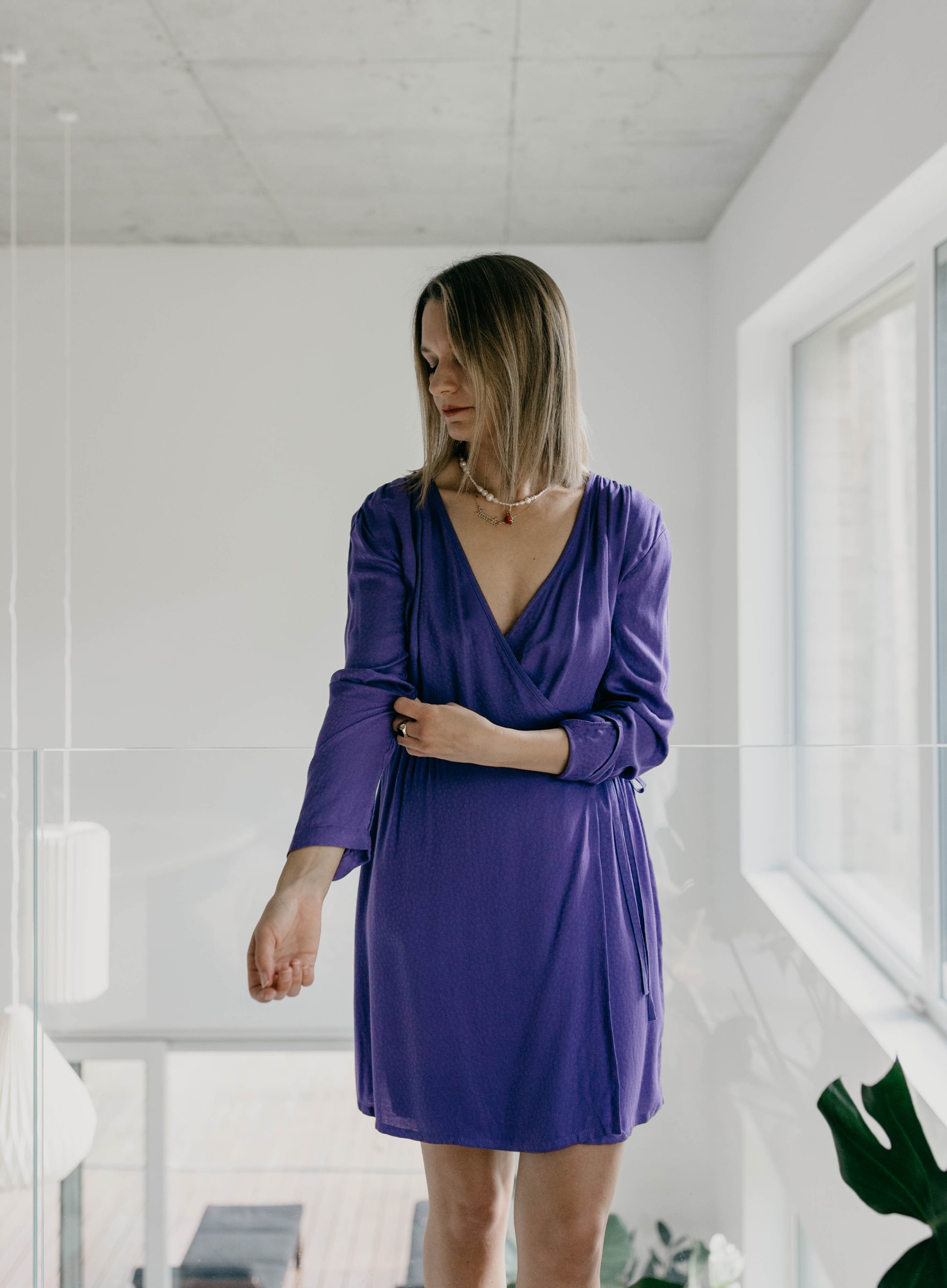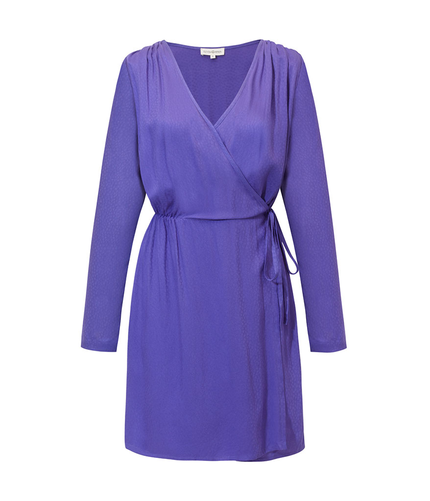 Hipnotyzująca sukienka mini w fiolecie uszyta z tkaniny w delikatny, żakardowy wzór. Wiązana na kopertę podkreśla sylwetkę, ale tylko tyle ile chcecie (można poluzować!). Delikatna gumka w talii utrzymuje kształt sukienki i sylwetki (nawet przy luźnym wiązaniu). Marszczenia na ramionach- obecne!