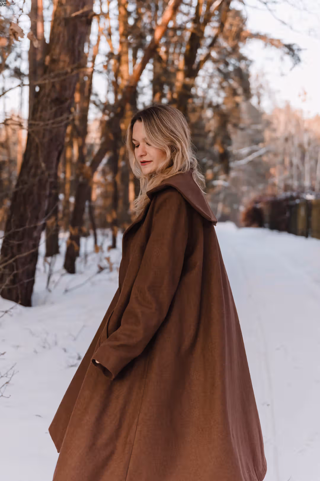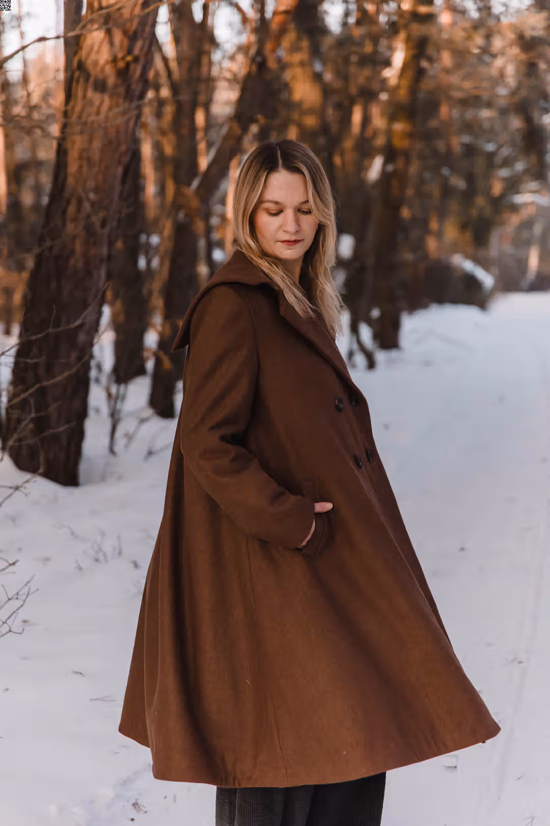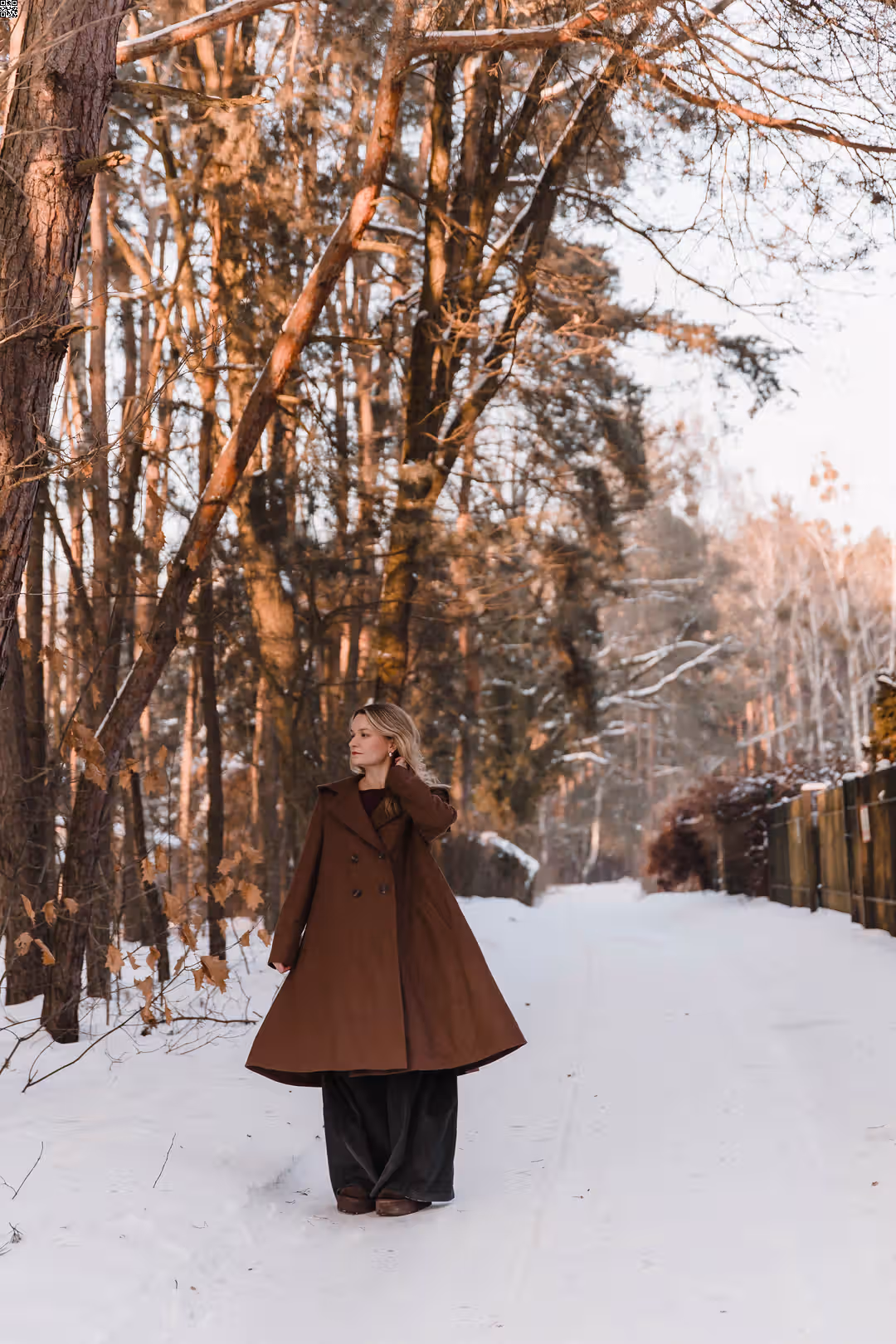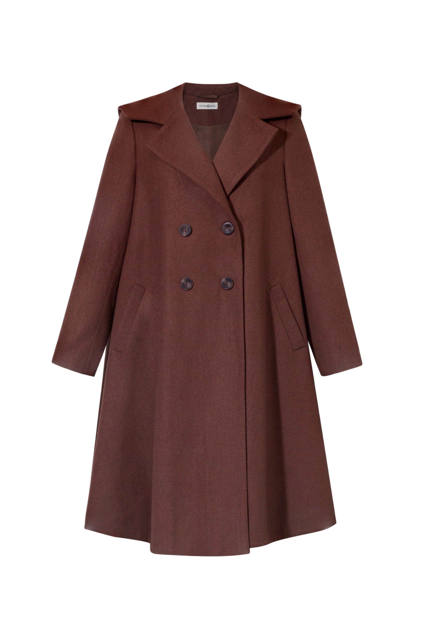 To ten rodzaj płaszcza, który po prostu się zakłada. Bez zastanawiania się, czy pasuje — bo pasuje do wszystkiego. Dobrze wygląda z sukienkami i spódnicami, ale równie naturalnie z prostymi spodniami czy sportowymi zestawami. Jest elegancki, kiedy tego chcesz, i zupełnie swobodny na co dzień. Ma mocno rozkloszowaną formę, dzięki której pięknie pracuje w ruchu — miękko się układa, faluje, żyje razem z sylwetką. Poduszki w ramionach dodają mu charakteru, a kieszenie są po prostu tam, gdzie trzeba. To płaszcz, który nie ogranicza stylizacji — tylko je dopełnia.