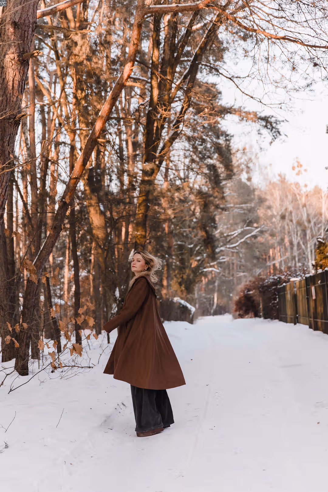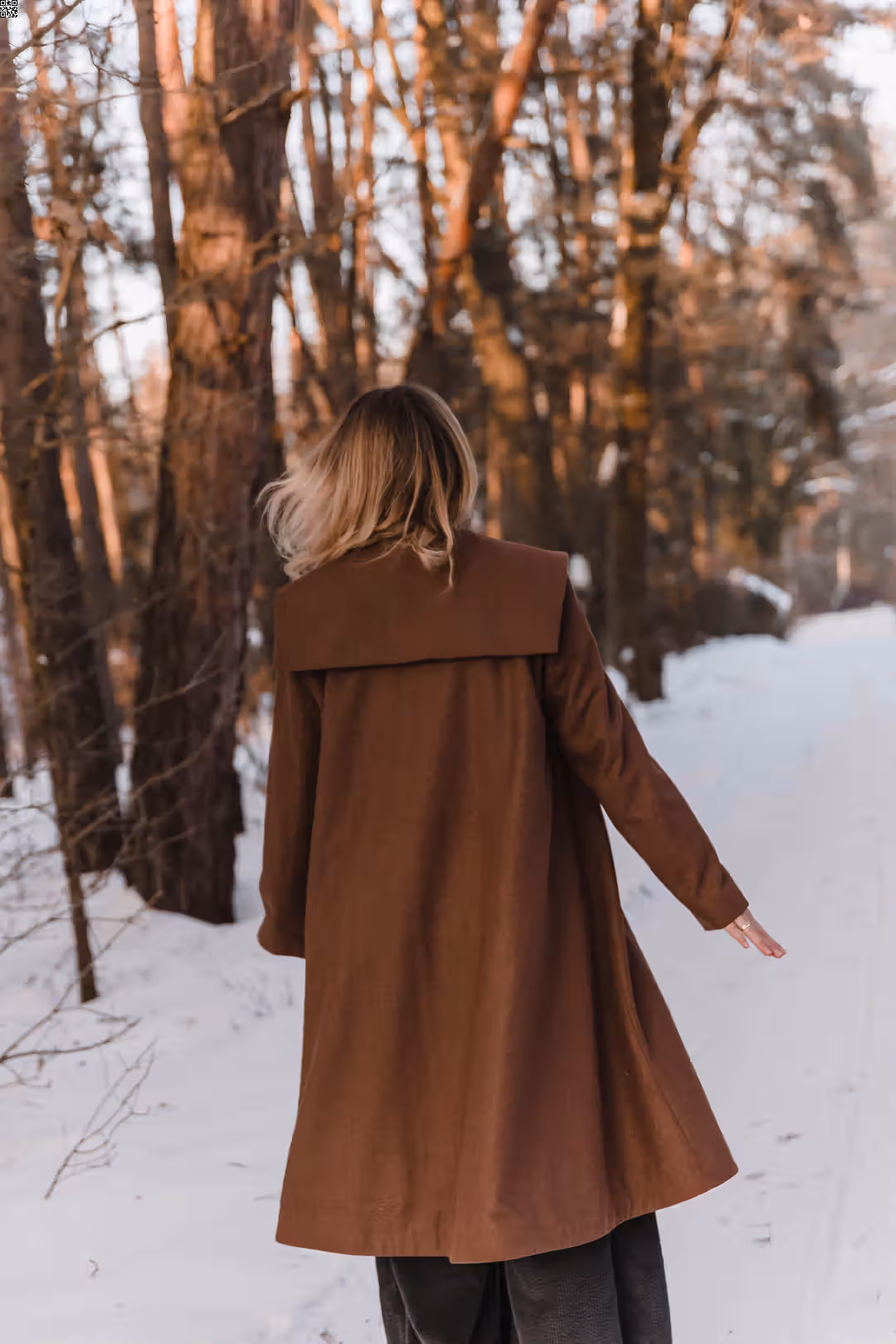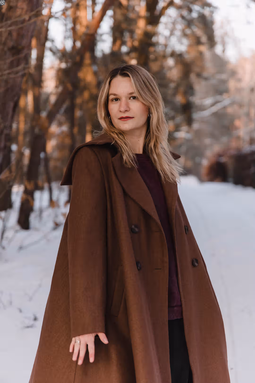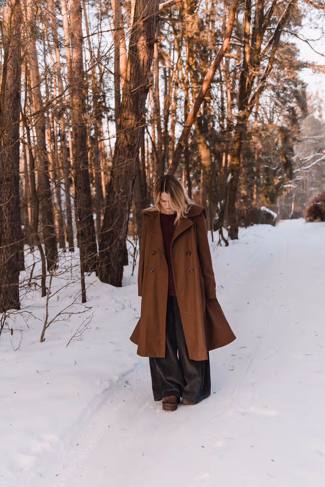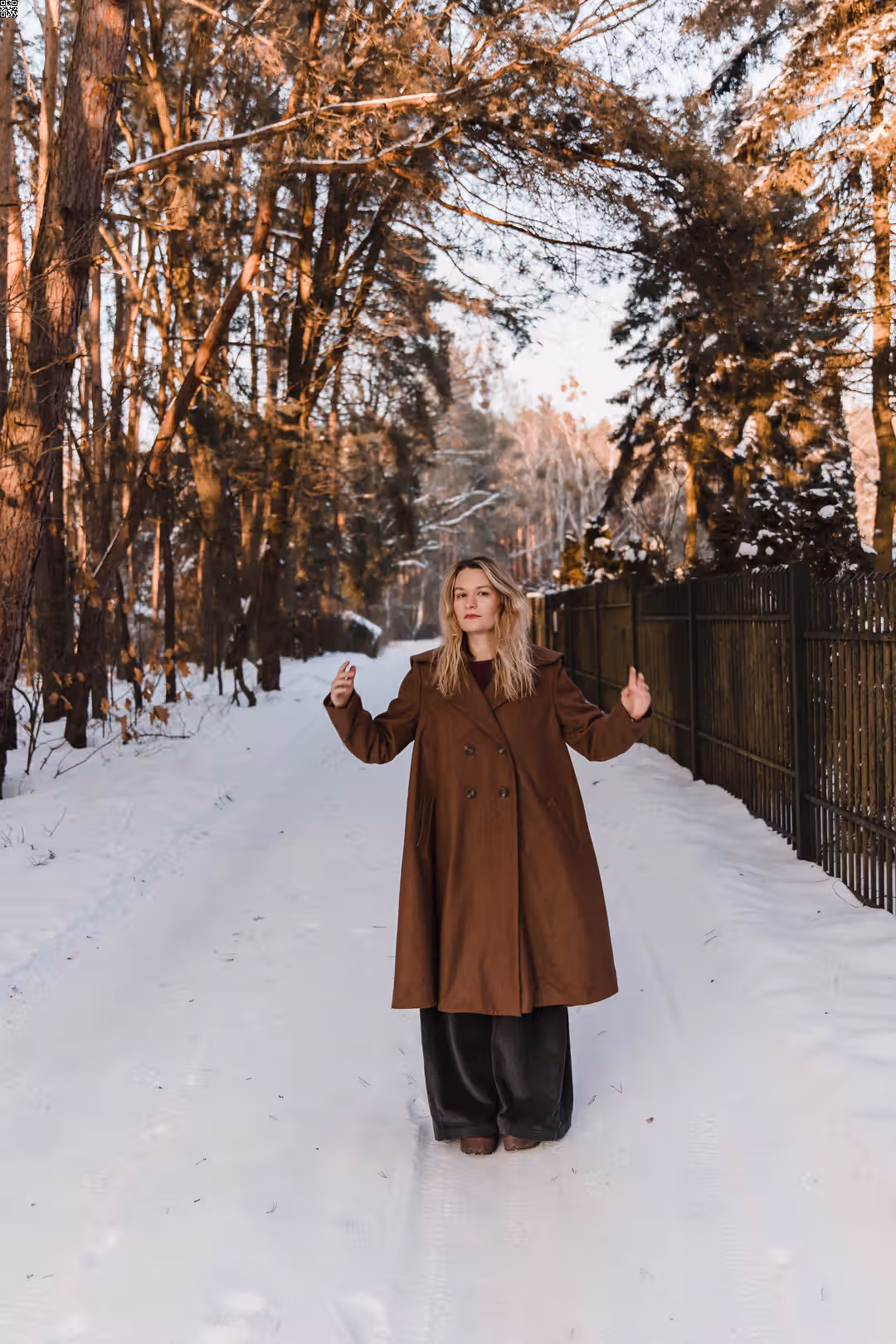 To ten rodzaj płaszcza, który po prostu się zakłada. Bez zastanawiania się, czy pasuje — bo pasuje do wszystkiego. Dobrze wygląda z sukienkami i spódnicami, ale równie naturalnie z prostymi spodniami czy sportowymi zestawami. Jest elegancki, kiedy tego chcesz, i zupełnie swobodny na co dzień. Ma mocno rozkloszowaną formę, dzięki której pięknie pracuje w ruchu — miękko się układa, faluje, żyje razem z sylwetką. Poduszki w ramionach dodają mu charakteru, a kieszenie są po prostu tam, gdzie trzeba. To płaszcz, który nie ogranicza stylizacji — tylko je dopełnia.