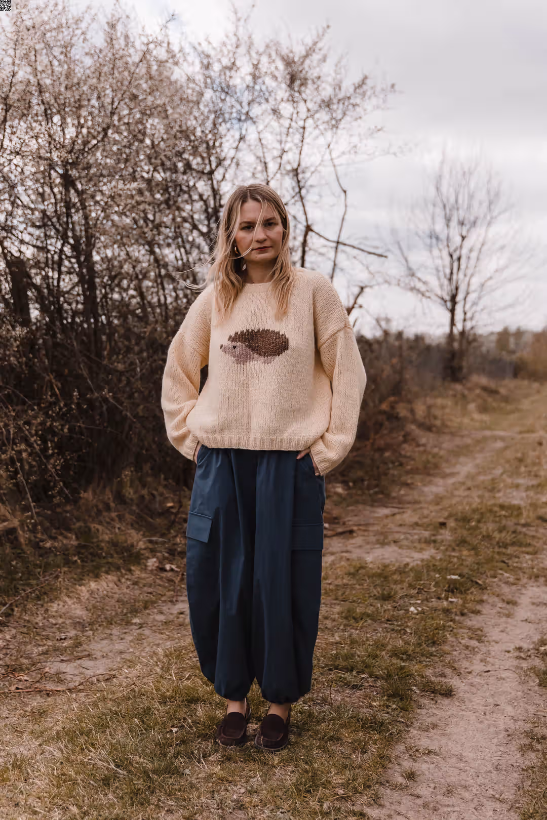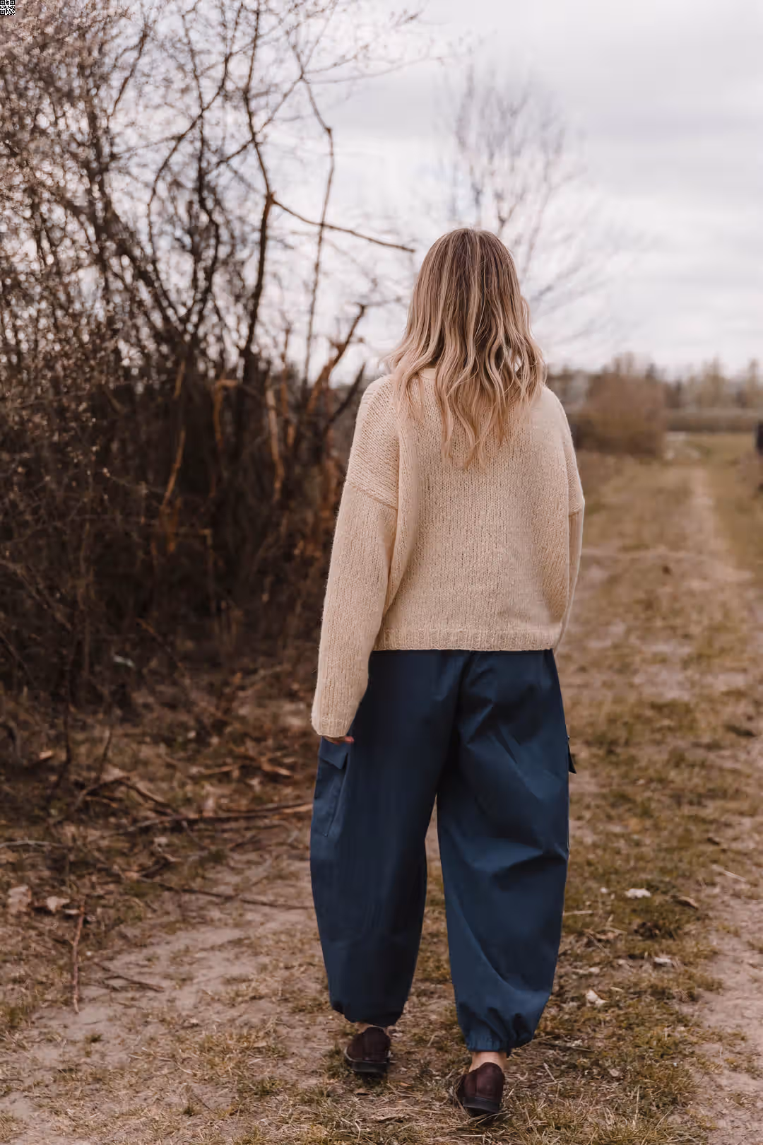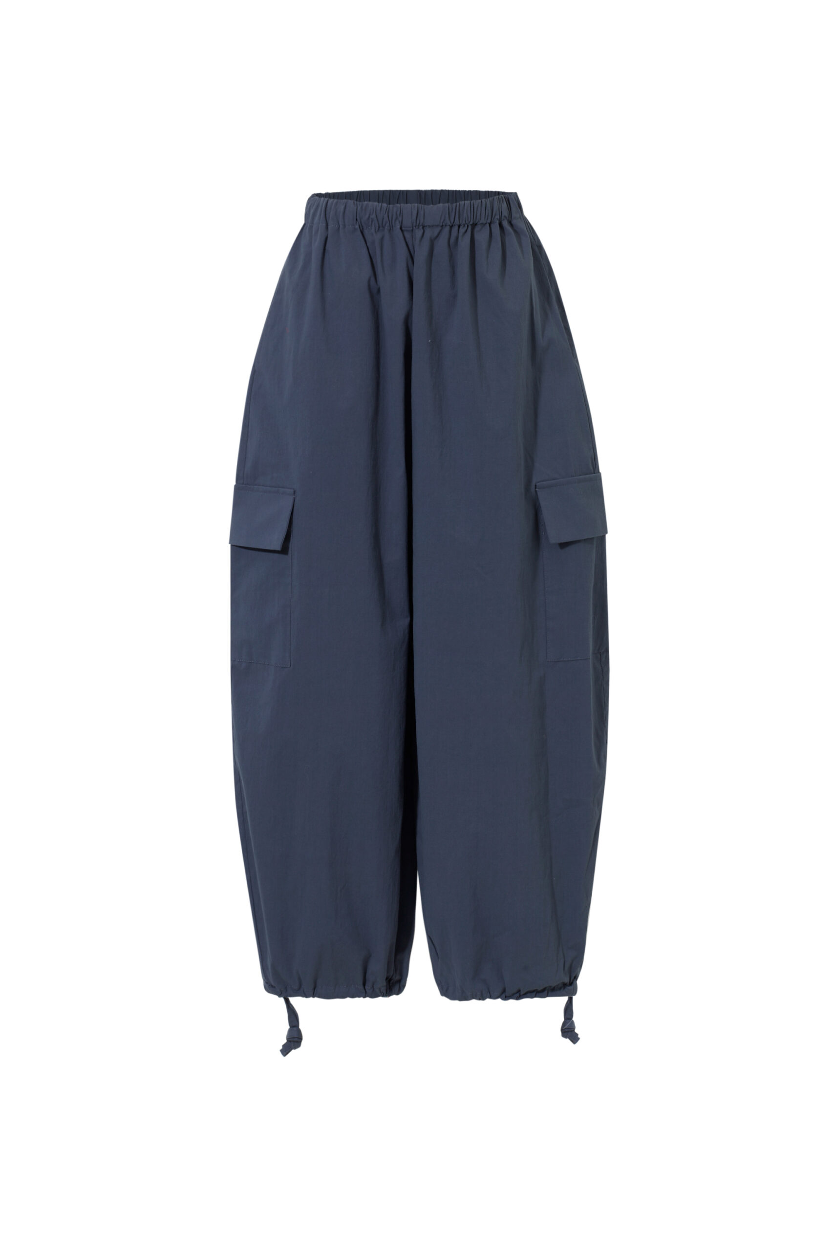 Spodnie o balonowej formie, które naturalnie układają się na sylwetce i nadają jej lekko rzeźbiarskiego kształtu. Materiał pracuje w ruchu, dzięki czemu całość wygląda swobodnie, ale nie traci formy. W pasie mają wygodną gumkę, a dół nogawek możesz regulować troczkami — nosić je bardziej zamknięte, podkreślając ich kształt, albo luźniej, w bardziej casualowy sposób. Z przodu znajdziesz klasyczne kieszenie w szwach, a po bokach dodatkowe kieszenie z klapkami, które wprowadzają lekko użytkowy charakter. To model, który łączy wygodę z wyrazistą formą — do noszenia na co dzień, bez większego zastanawiania się.