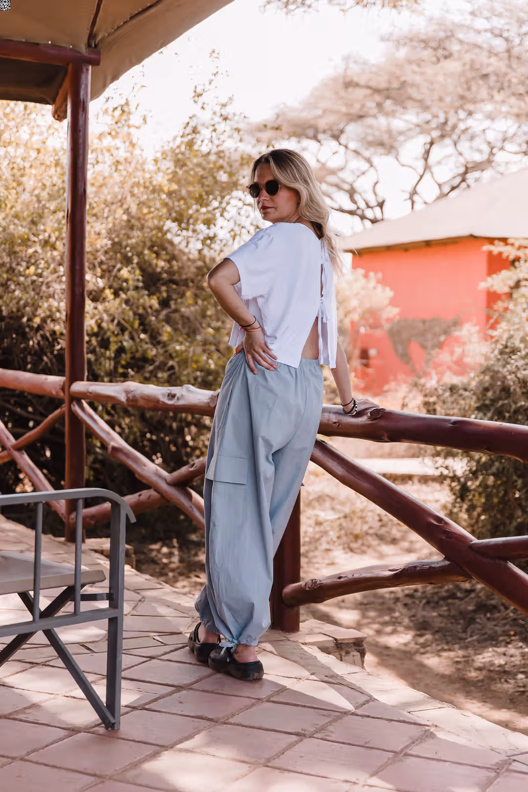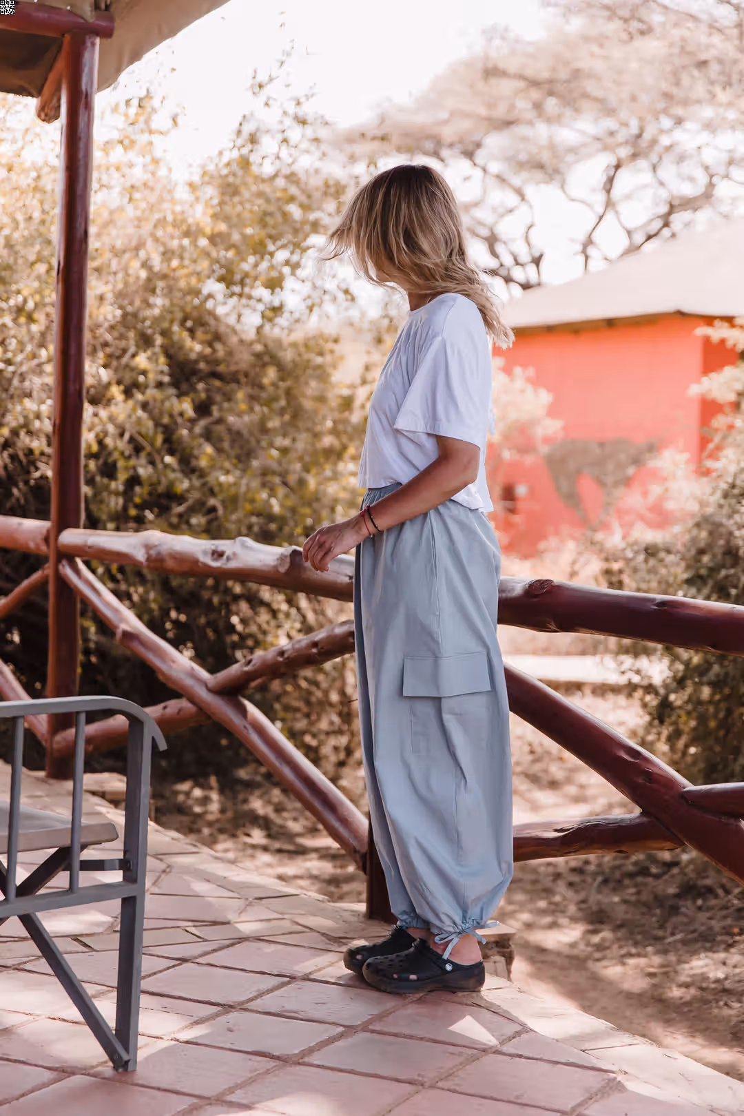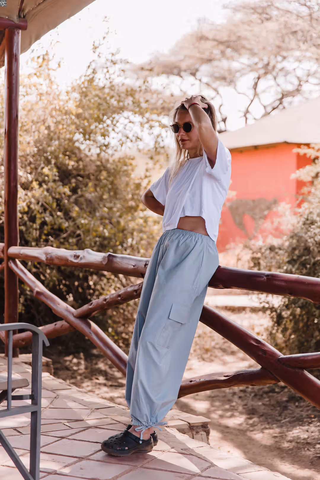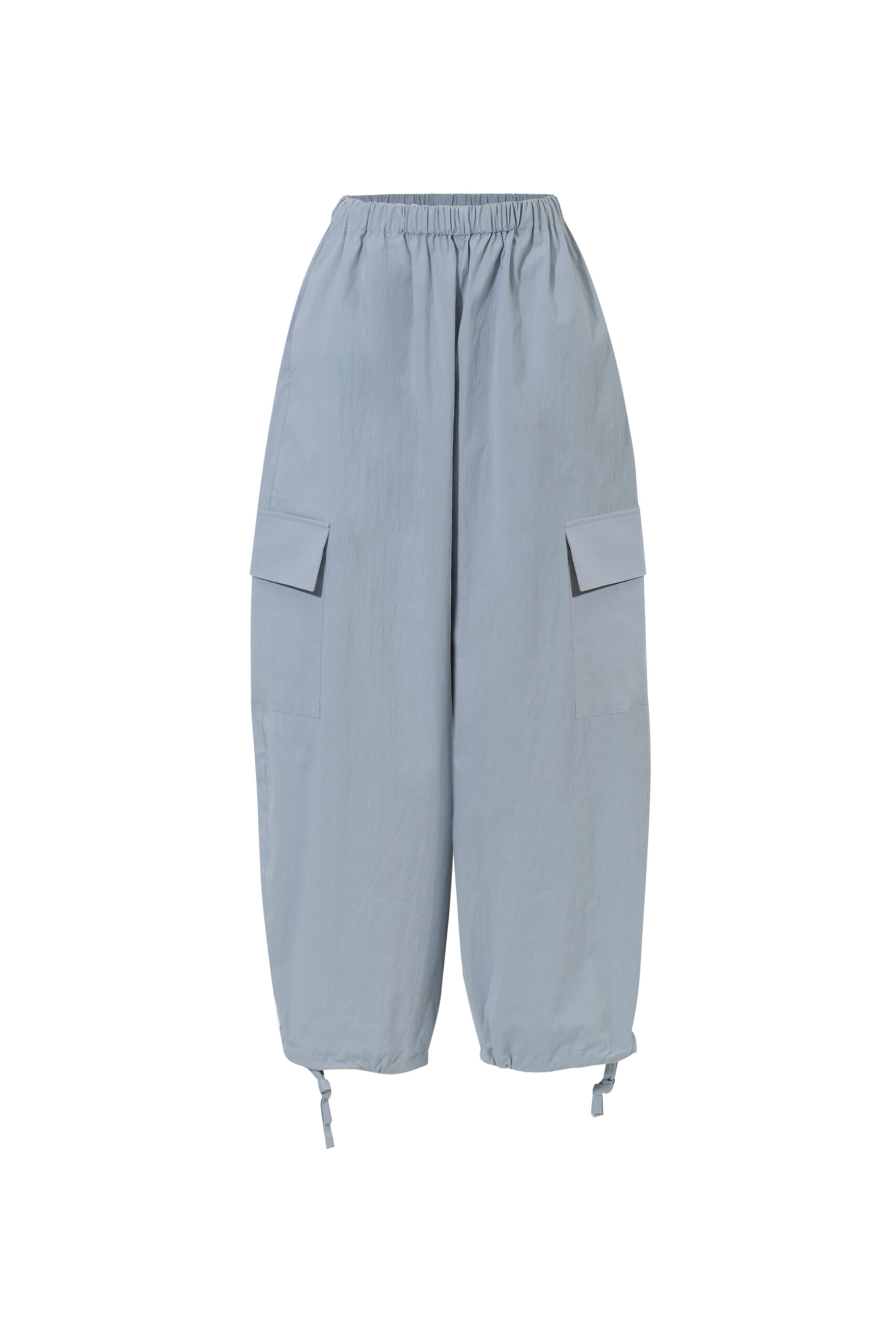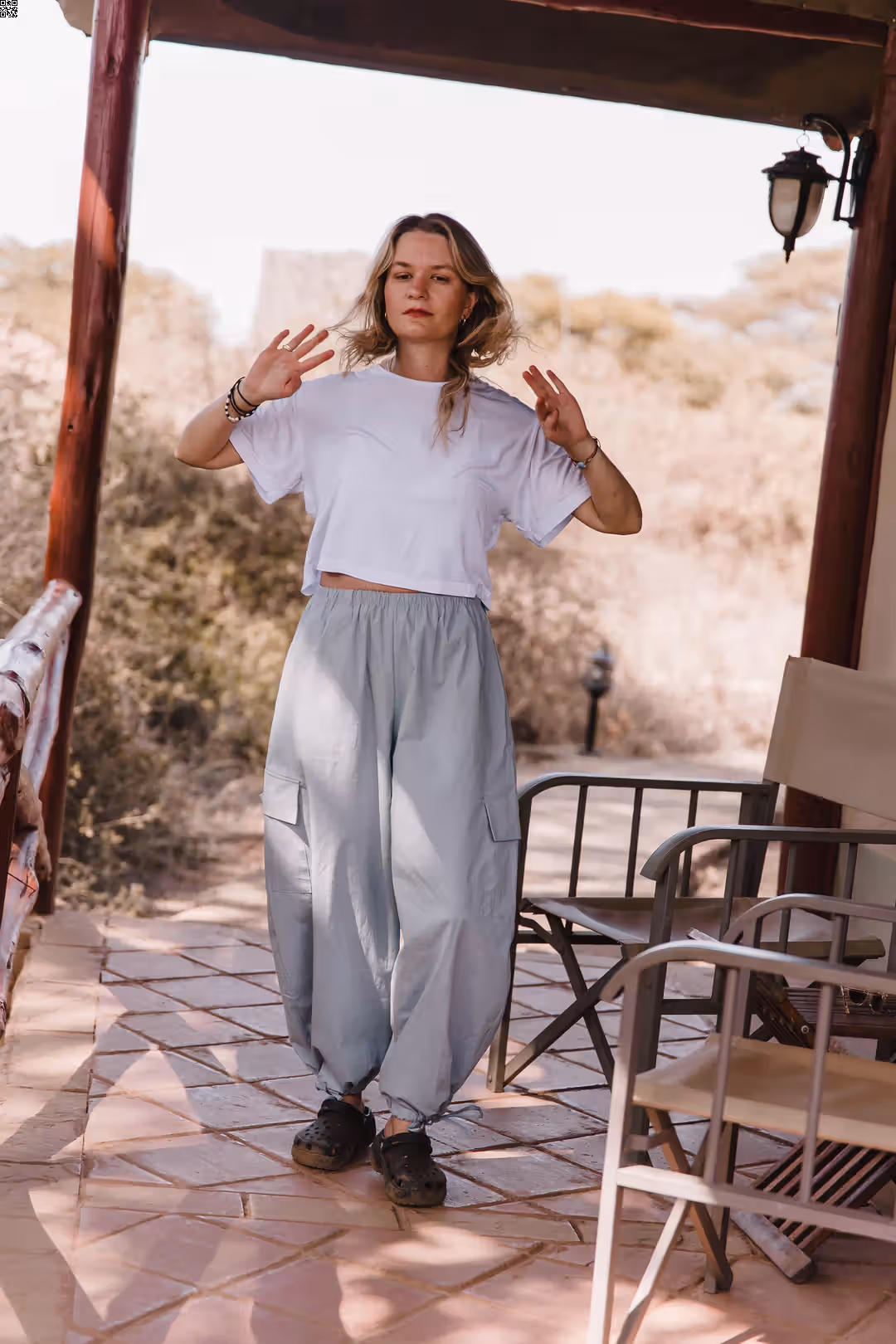 Spodnie o balonowej formie, które naturalnie układają się na sylwetce i nadają jej lekko rzeźbiarskiego kształtu. Materiał pracuje w ruchu, dzięki czemu całość wygląda swobodnie, ale nie traci formy. W pasie mają wygodną gumkę, a dół nogawek możesz regulować troczkami — nosić je bardziej zamknięte, podkreślając ich kształt, albo luźniej, w bardziej casualowy sposób. Z przodu znajdziesz klasyczne kieszenie w szwach, a po bokach dodatkowe kieszenie z klapkami, które wprowadzają lekko użytkowy charakter. To model, który łączy wygodę z wyrazistą formą — do noszenia na co dzień, bez większego zastanawiania się.