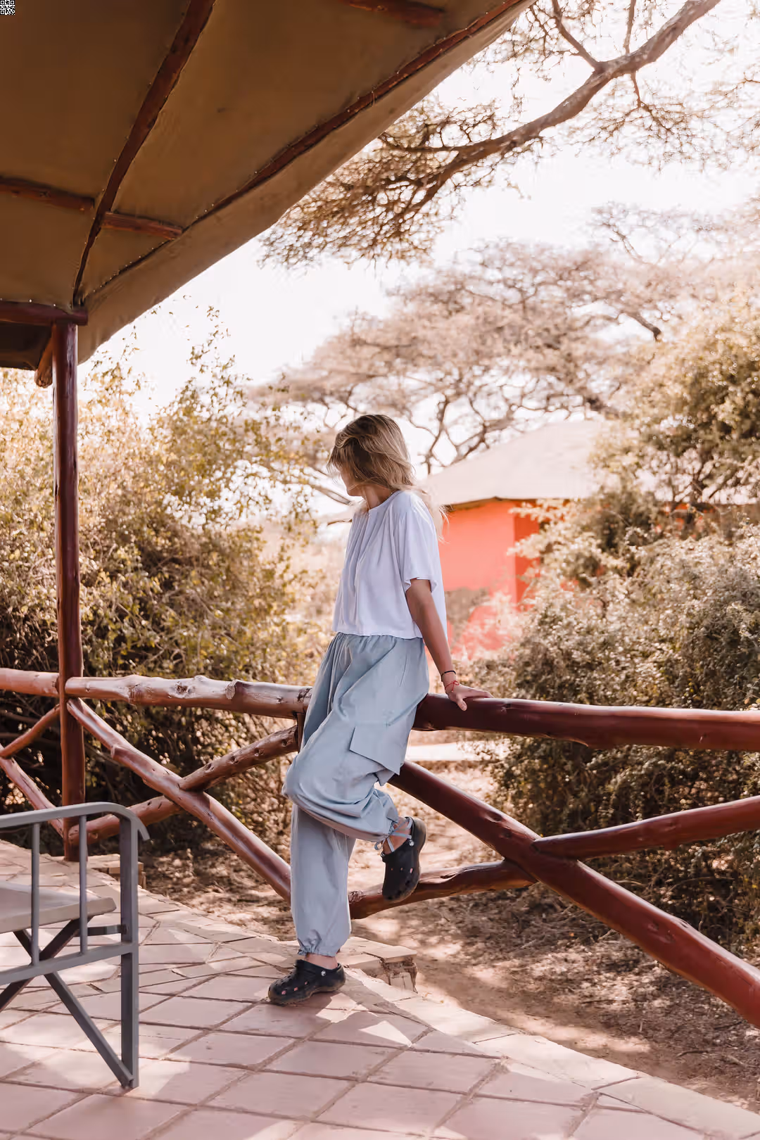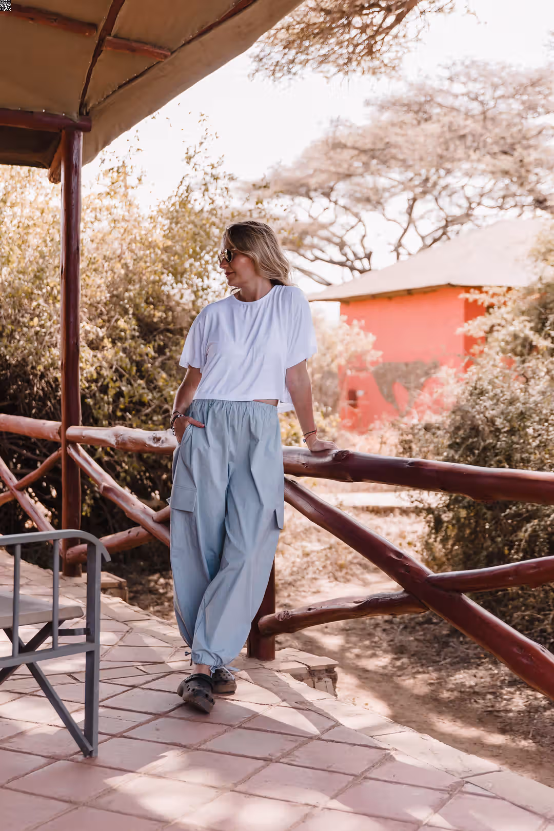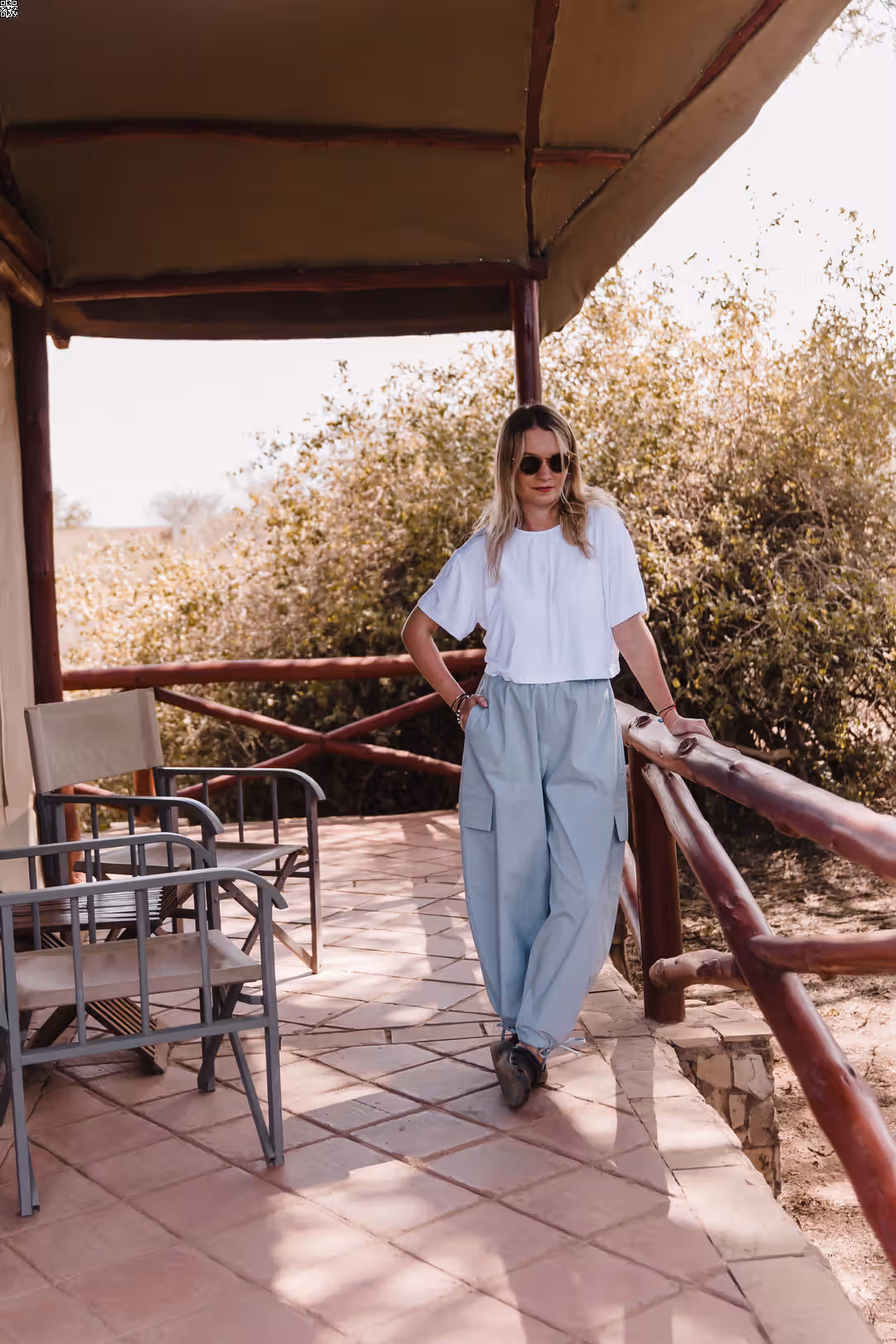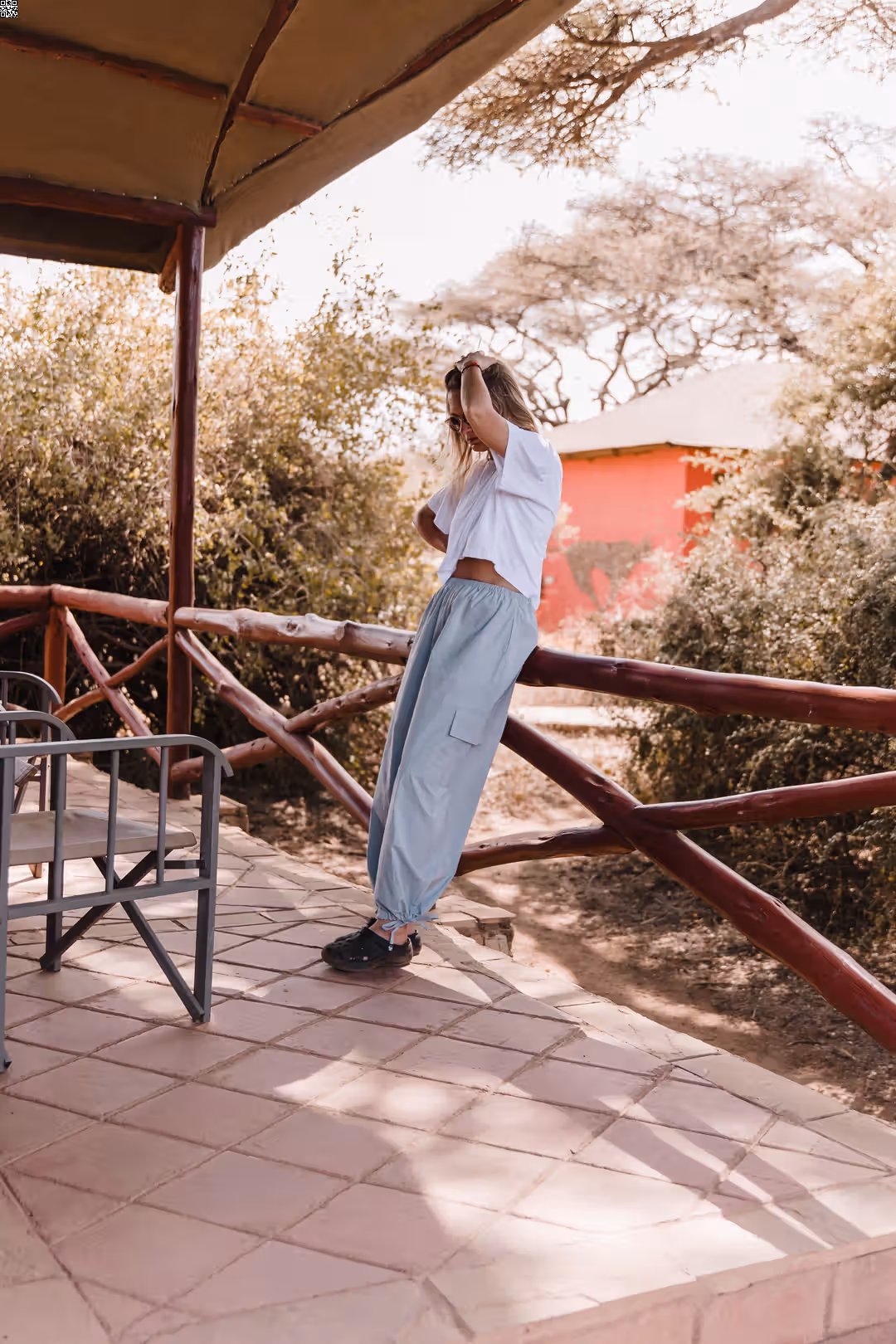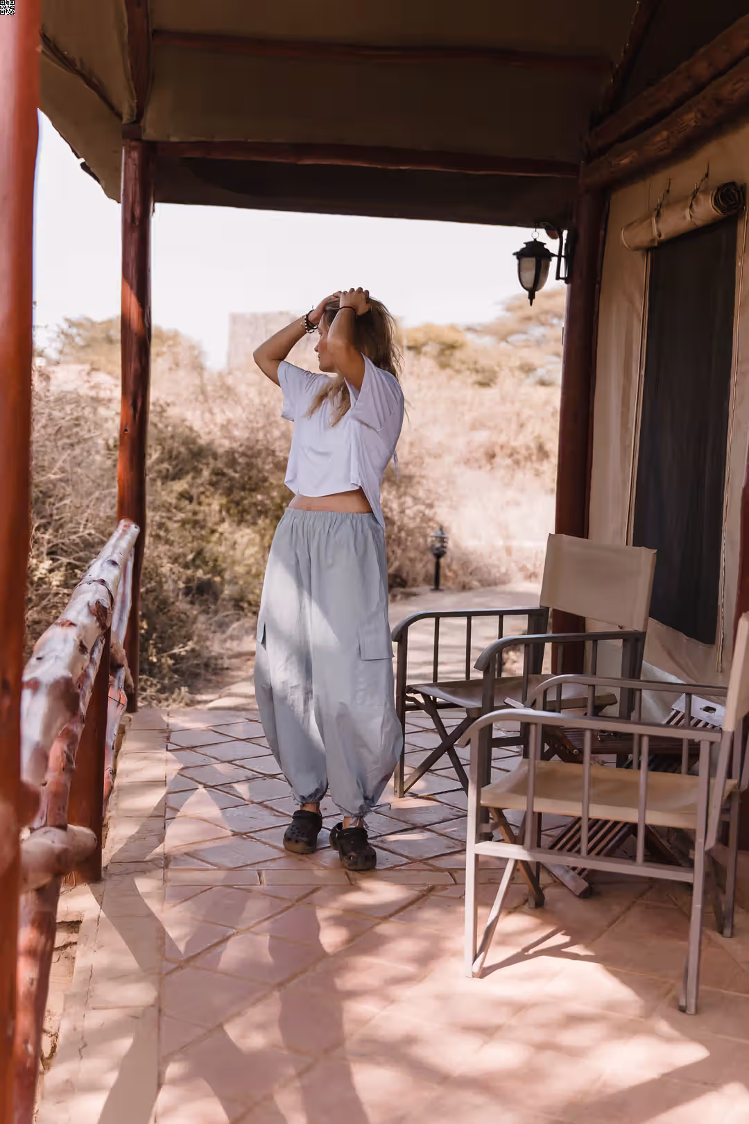 Spodnie o balonowej formie, które naturalnie układają się na sylwetce i nadają jej lekko rzeźbiarskiego kształtu. Materiał pracuje w ruchu, dzięki czemu całość wygląda swobodnie, ale nie traci formy. W pasie mają wygodną gumkę, a dół nogawek możesz regulować troczkami — nosić je bardziej zamknięte, podkreślając ich kształt, albo luźniej, w bardziej casualowy sposób. Z przodu znajdziesz klasyczne kieszenie w szwach, a po bokach dodatkowe kieszenie z klapkami, które wprowadzają lekko użytkowy charakter. To model, który łączy wygodę z wyrazistą formą — do noszenia na co dzień, bez większego zastanawiania się.