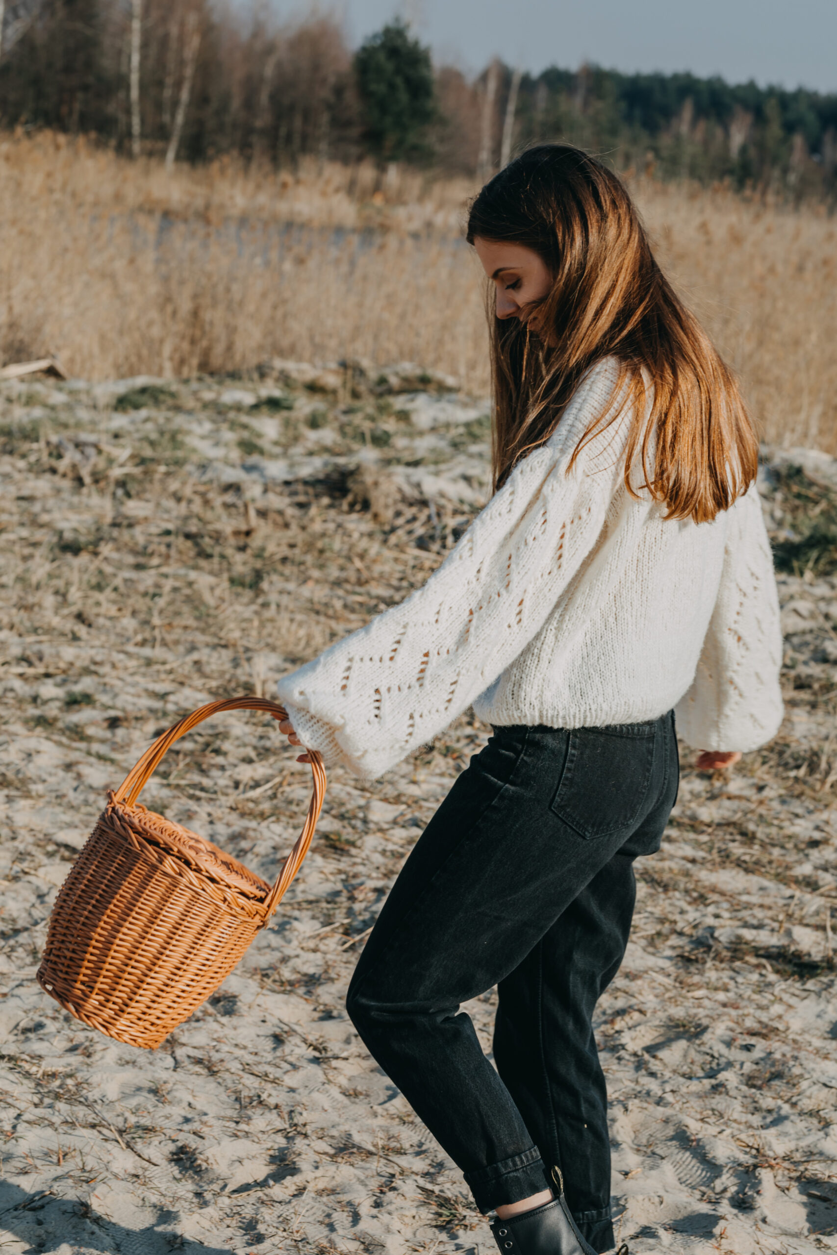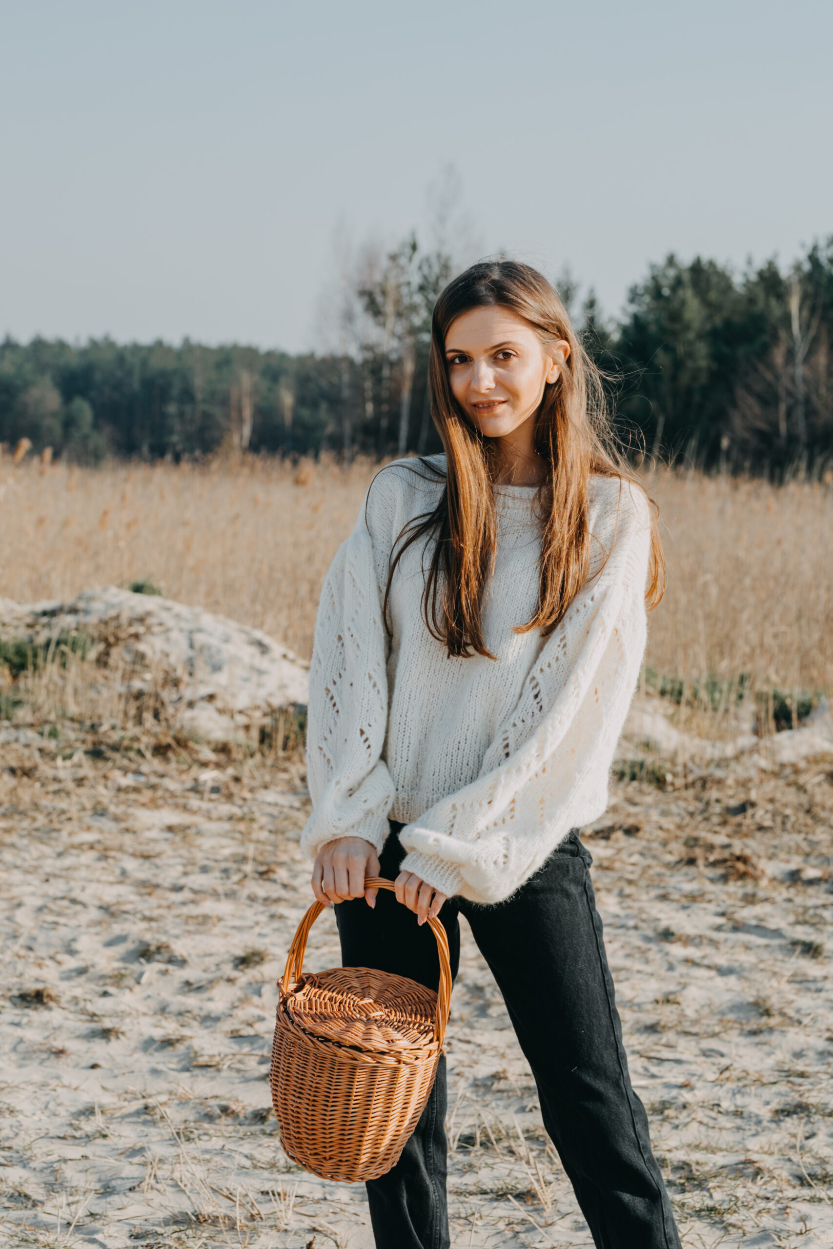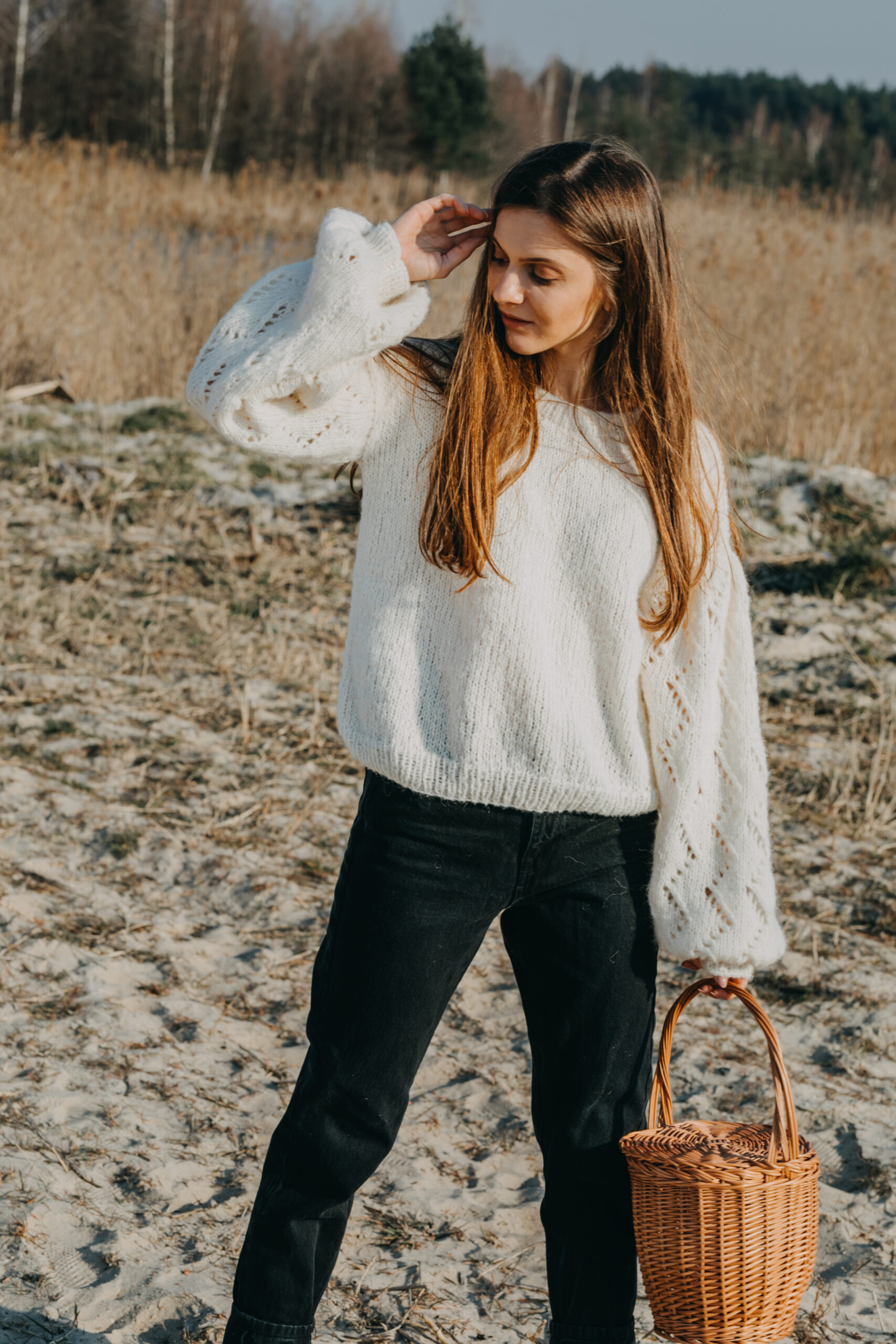 Ręcznie wykonany sweter z bufiastymi rękawami zdobionymi ażurowym wzorem. Luźny fason wykończony ściągaczem. Na zamówienie sweter dostępny jest w innych kolorach.