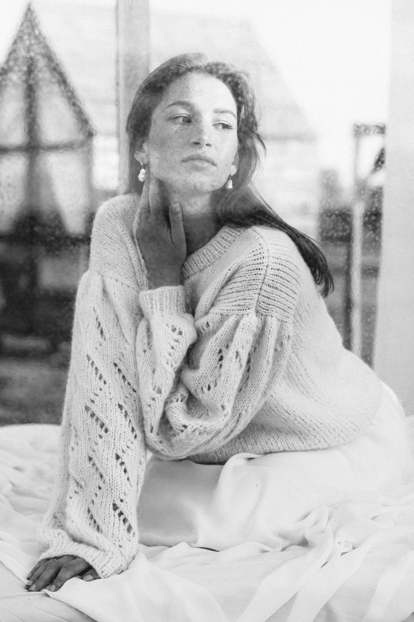 Ręcznie wykonany sweter z bufiastymi rękawami zdobionymi ażurowym wzorem. Luźny fason wykończony ściągaczem. Na zamówienie sweter dostępny jest w innych kolorach.