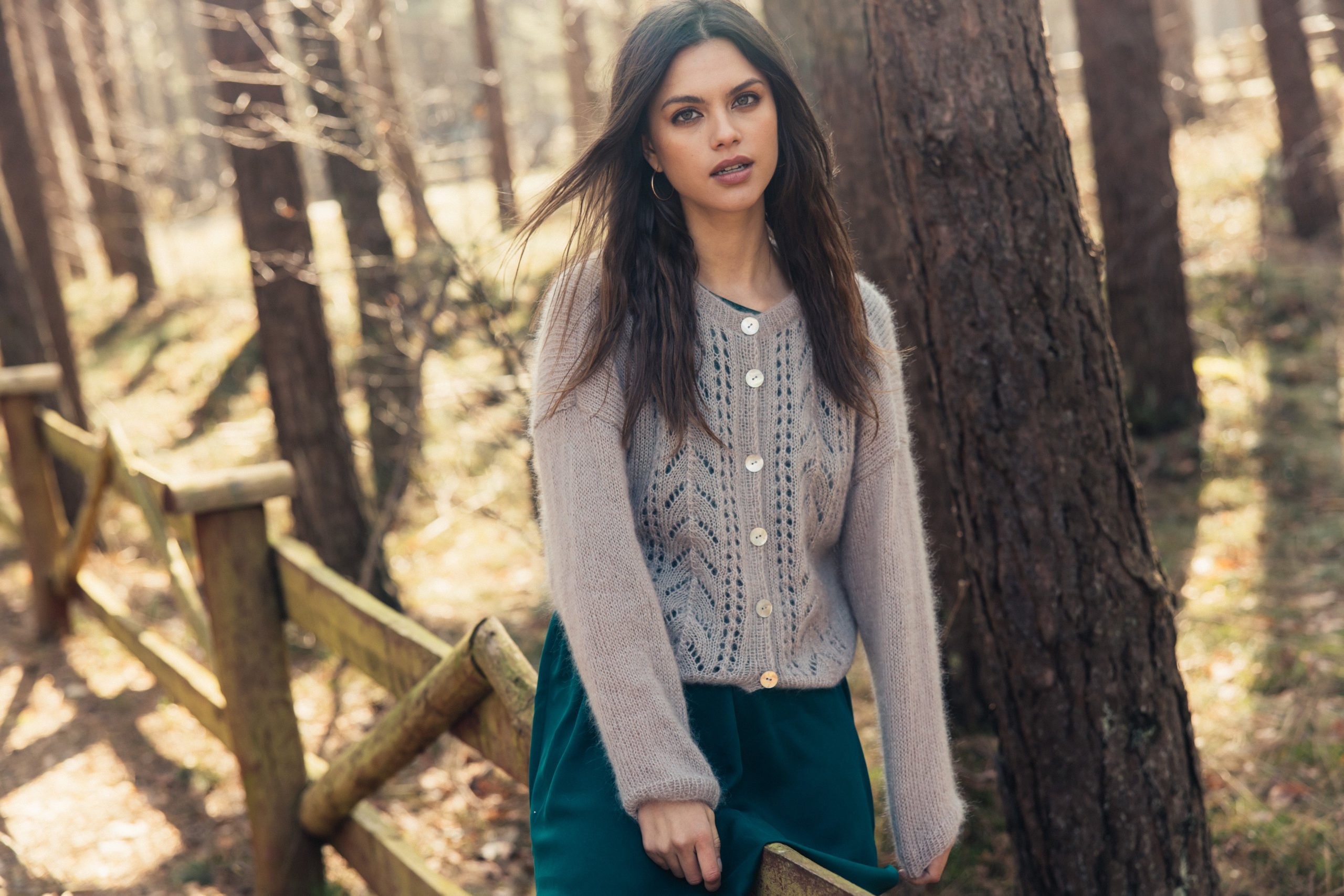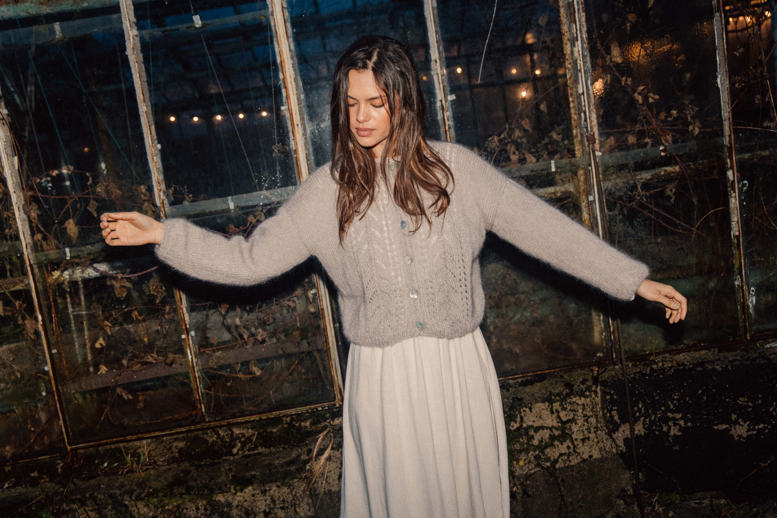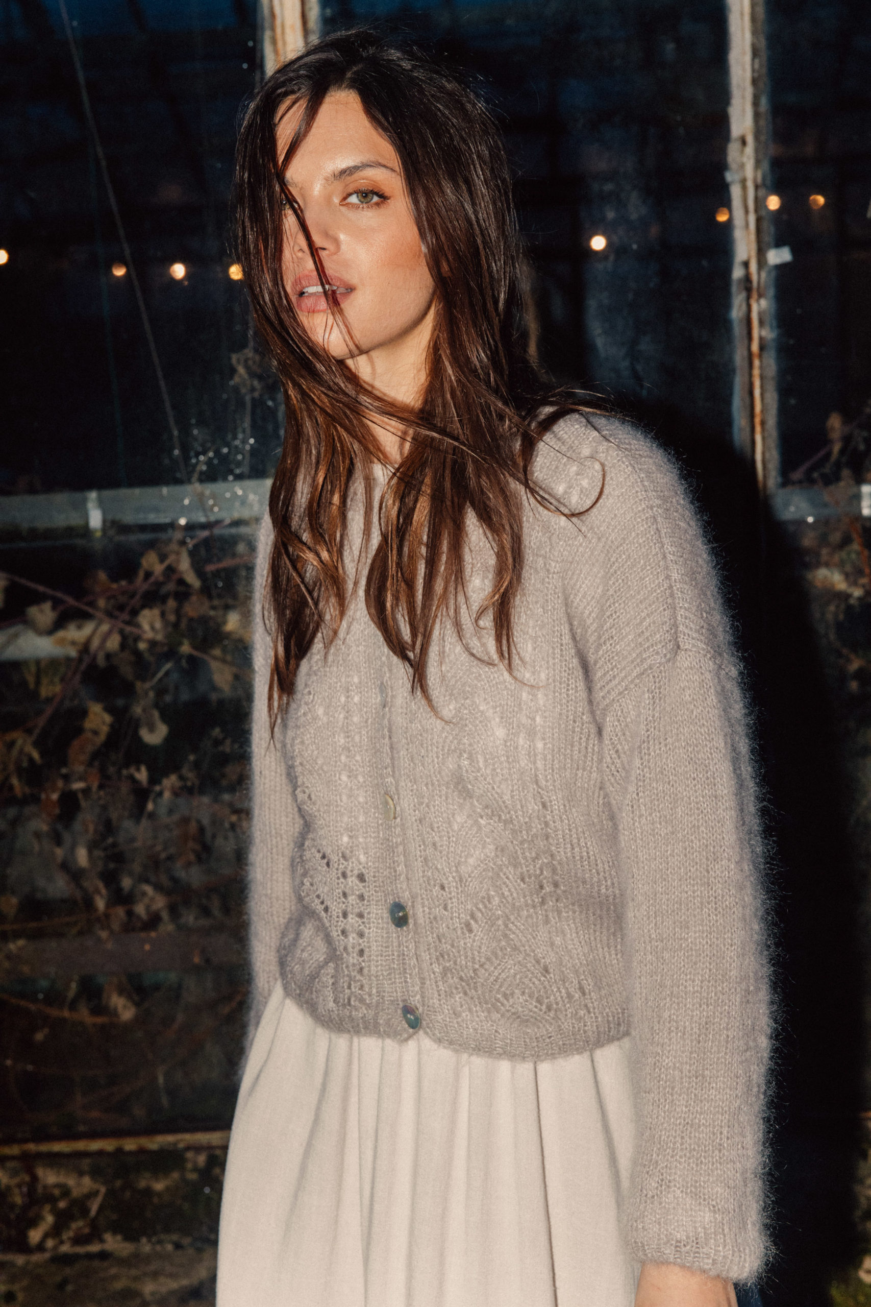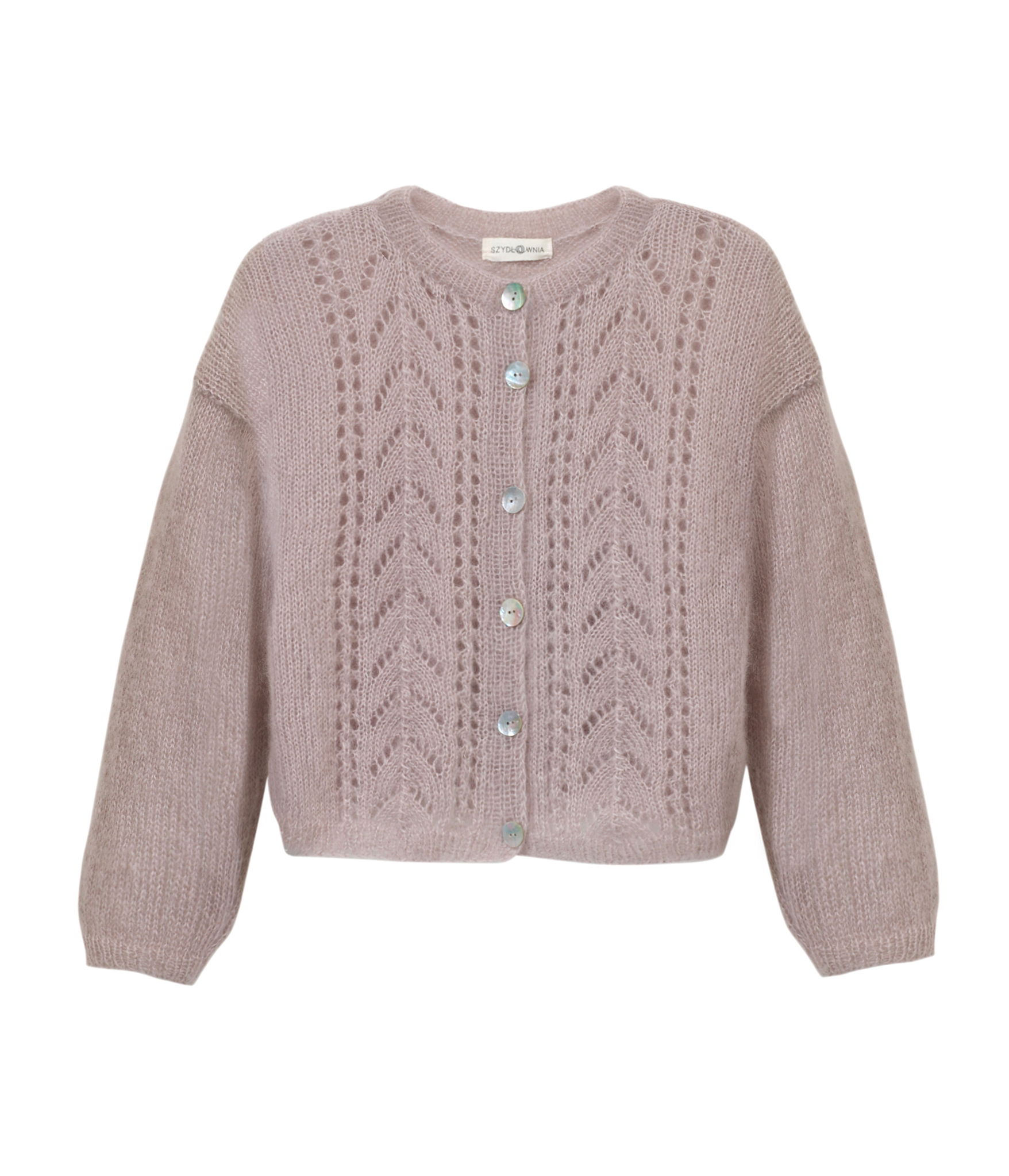 Sweter z ażurowymi zdobieniami z przodu, wydziergany ręcznie z włóczki z alpaki z dodatkiem jedwabiu. Zapinany na guziki z masy perłowej i wykończony ściągaczem.