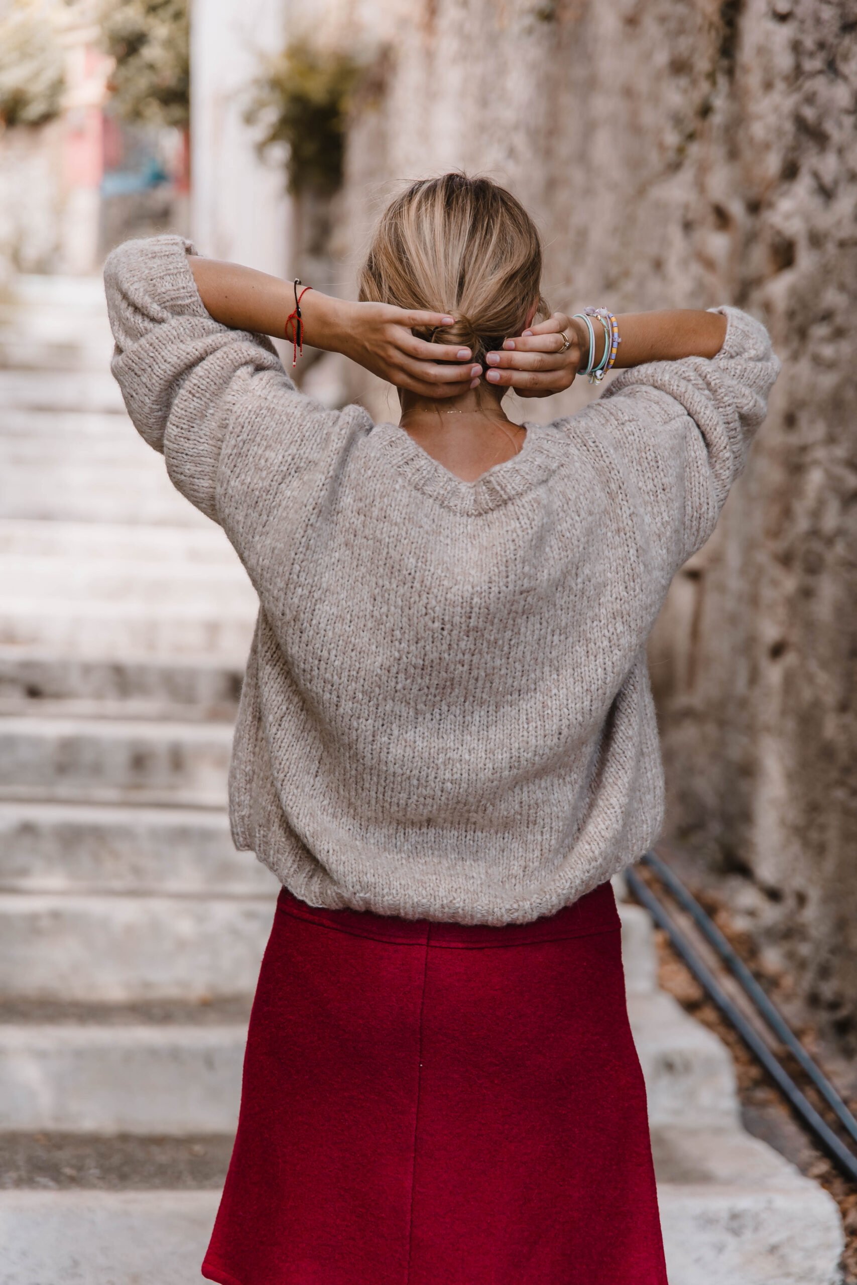 Każdy sweter wykonywany jest ręcznie, dlatego podane wymiary są orientacyjne i mogą się nieznacznie różnić. Należy przyjąć margines +- 3 cm.