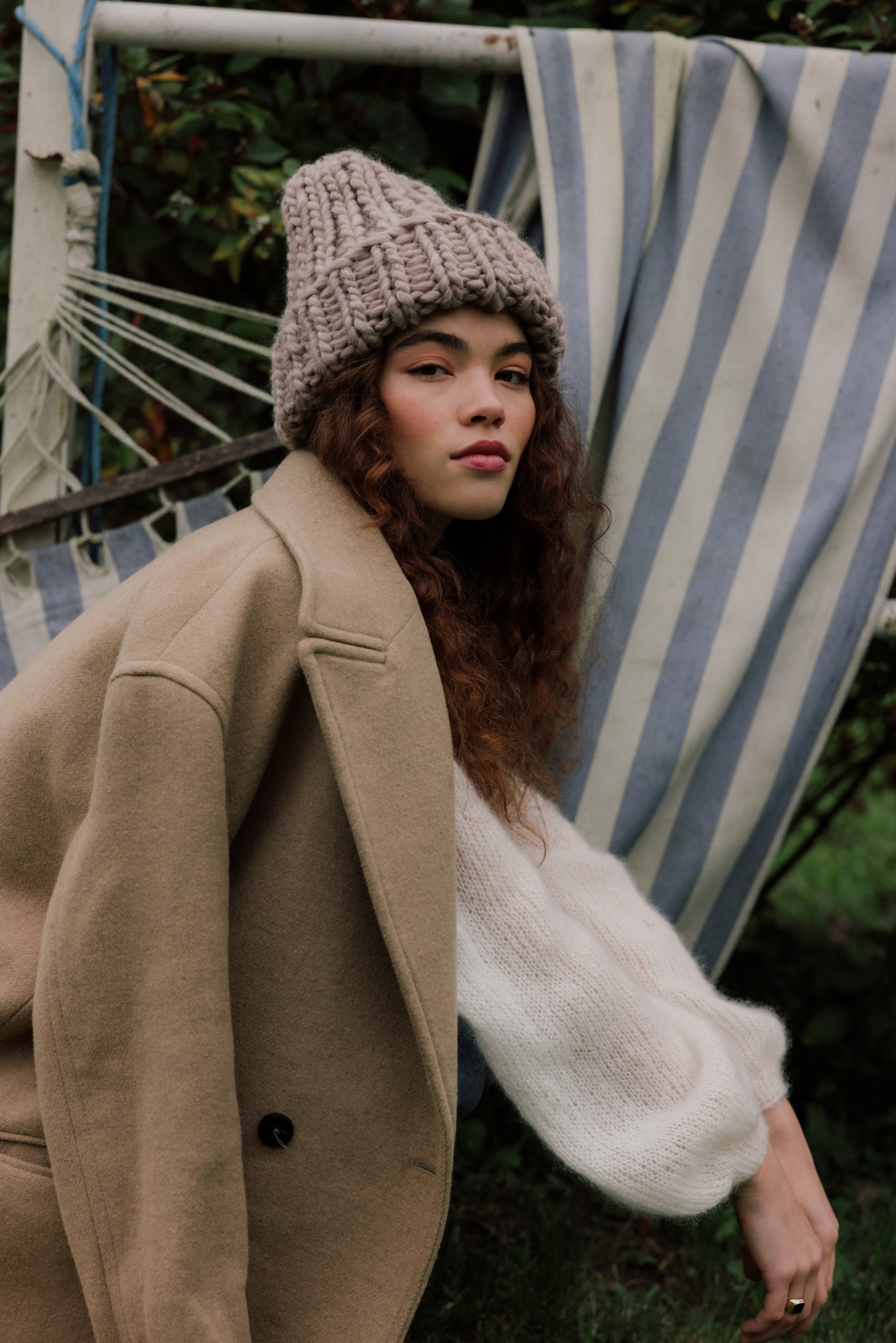 Beżowa czapka typu beanie wydziergana z bardzo grubej, wełnianej włóczki. Na zamówienie dostępna w innych kolorach.