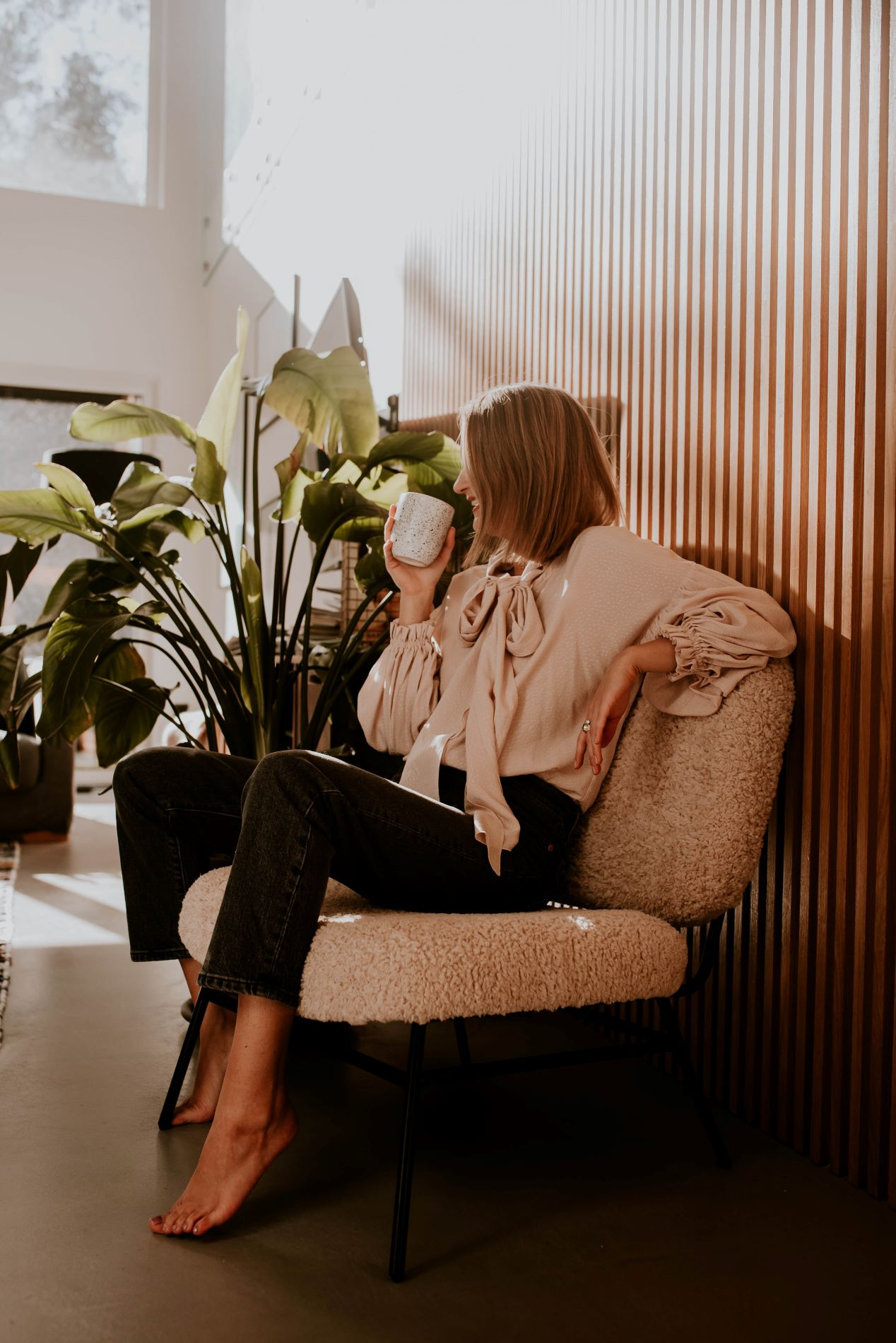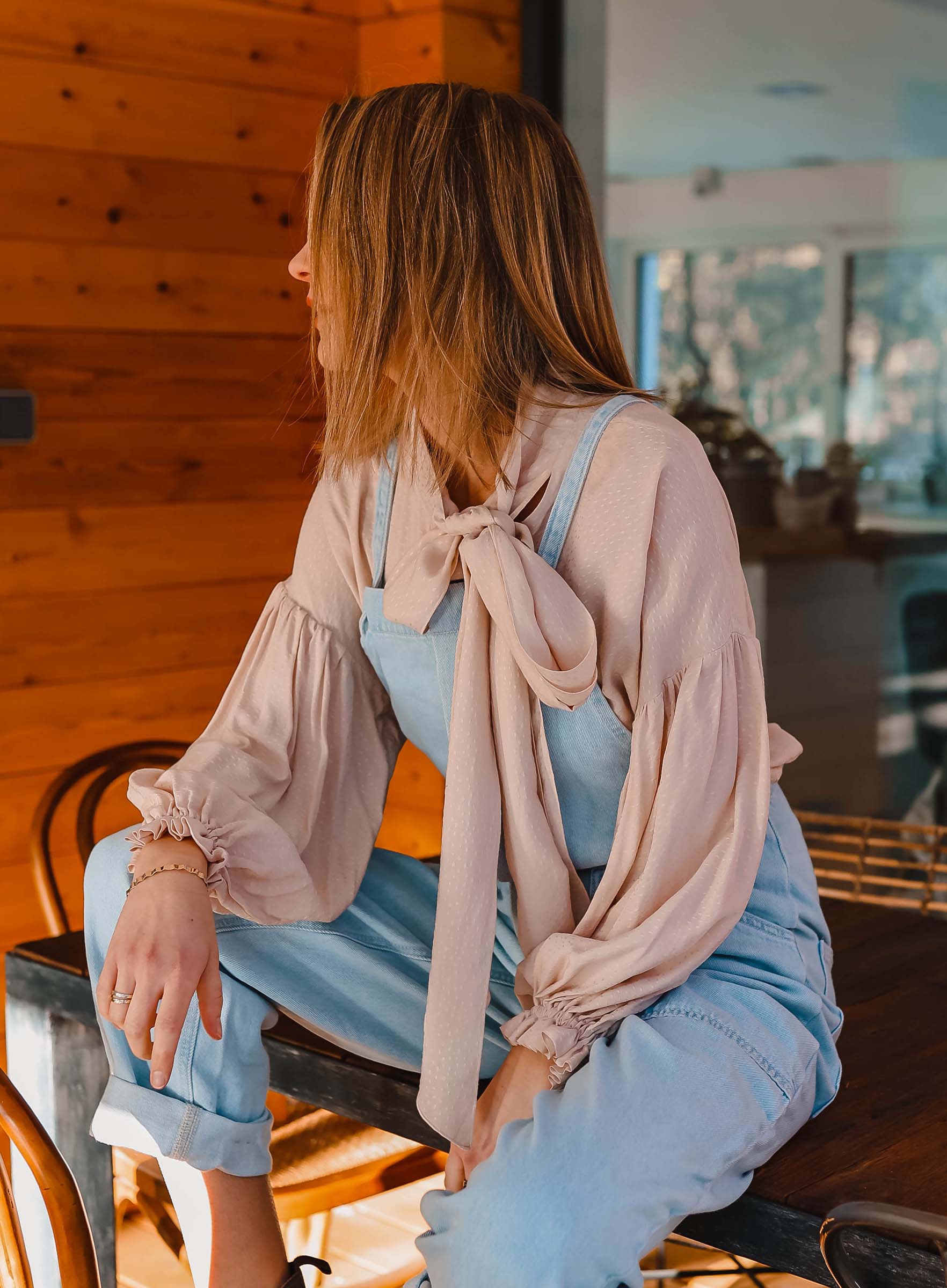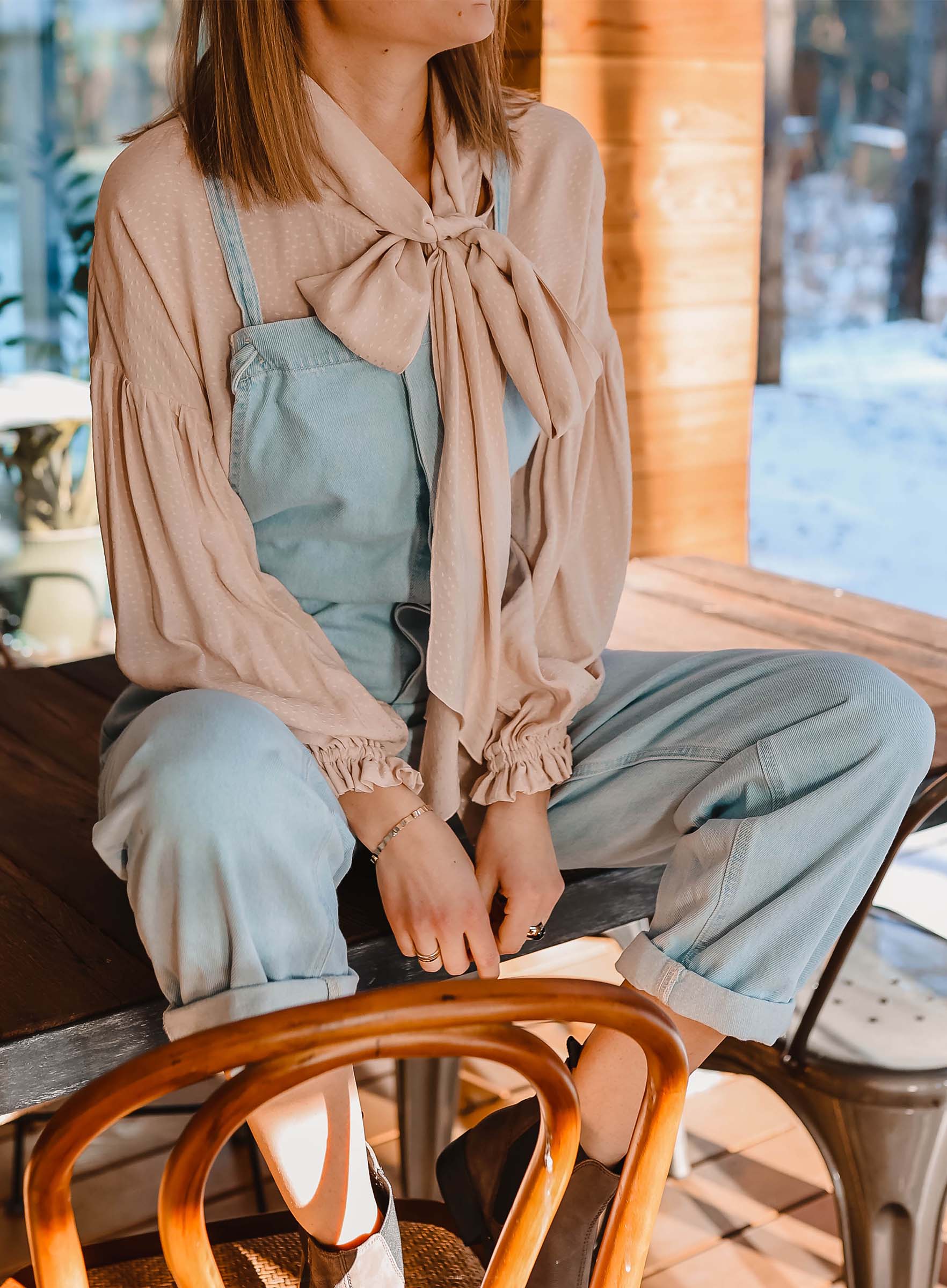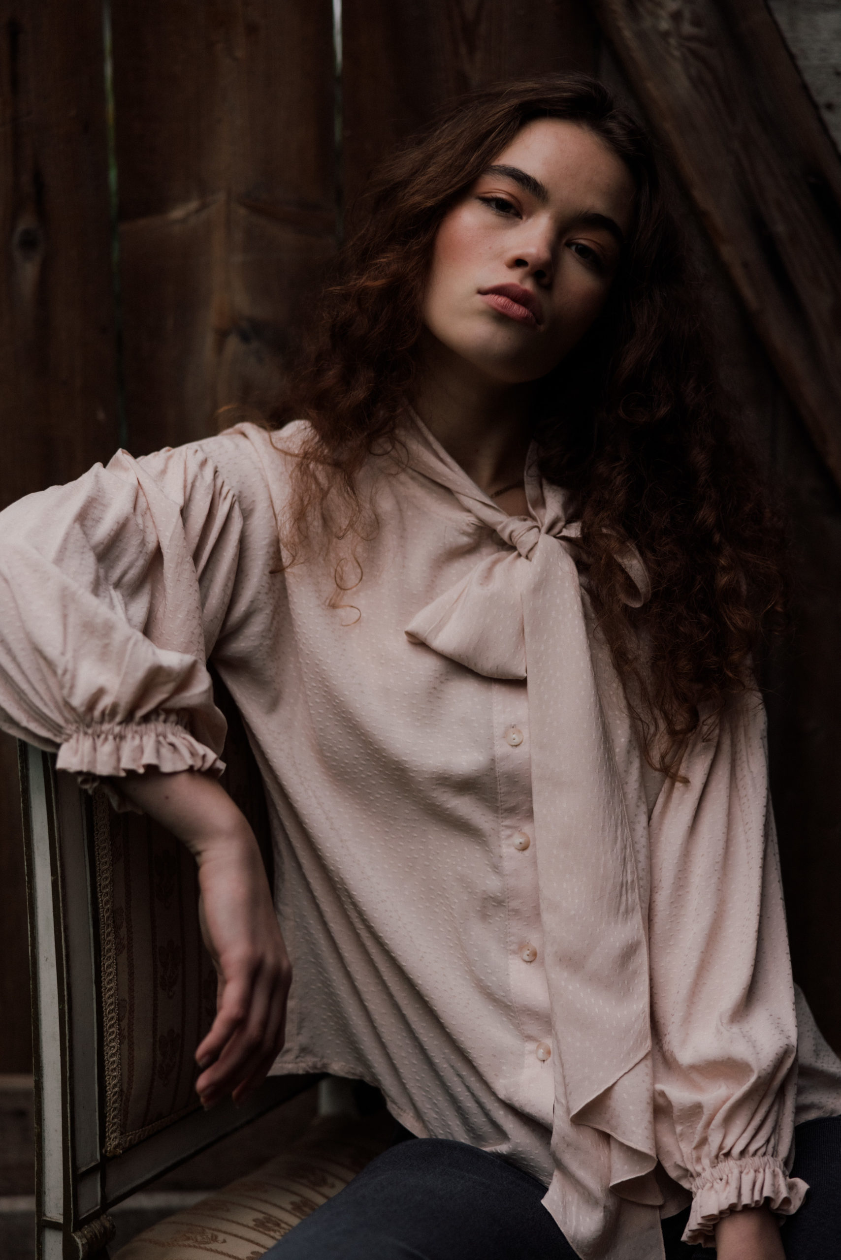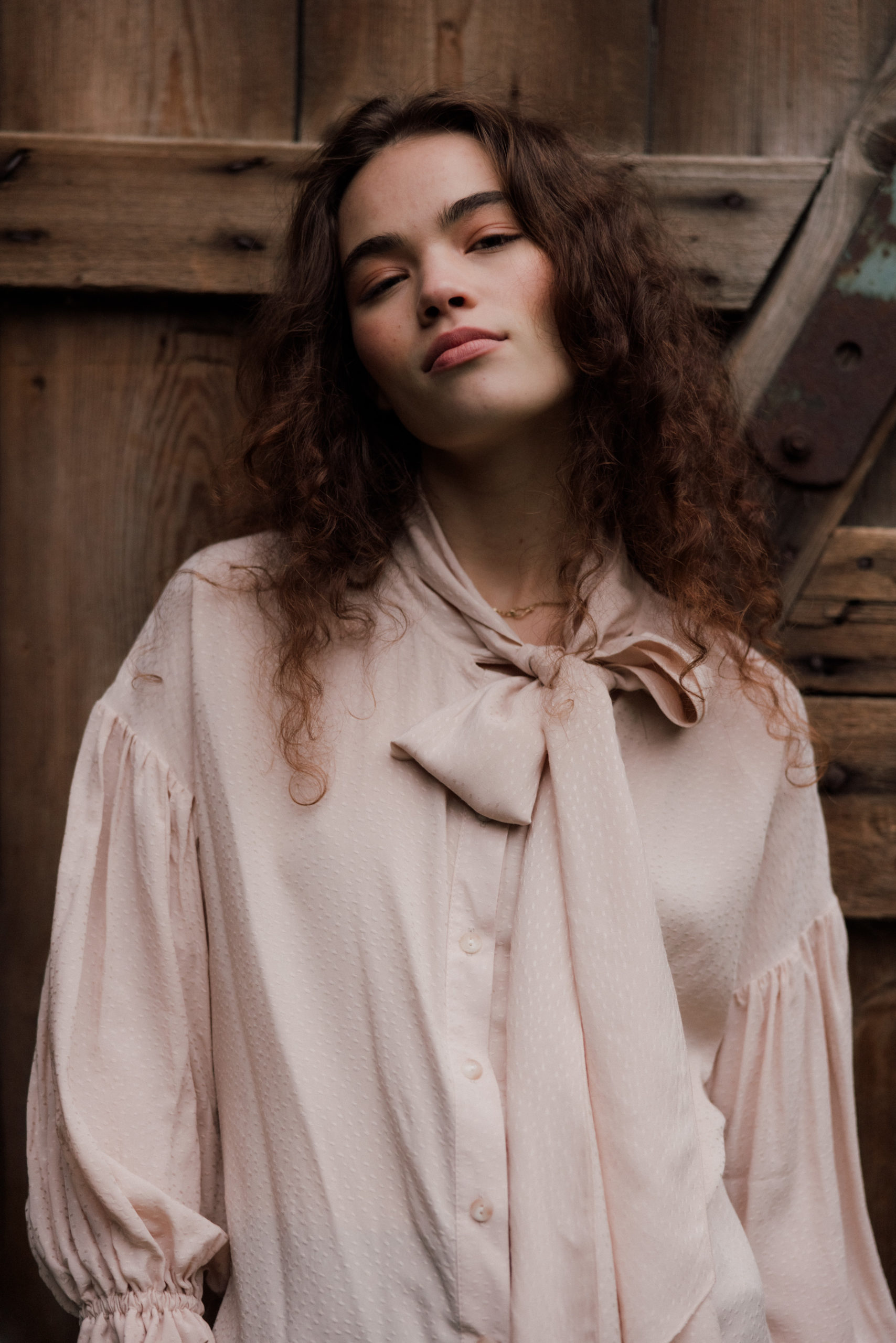 Romantyczna koszula z długim rękawem i fantazyjnymi taśmami przy szyi, które można zawiązać na kokardę. Uszyliśmy ją z lekkiej, lejącej się tkaniny, która podkreśla jej romantyczny i kobiecy vibe. Zawiąż taśmy pod szyją jeśli chcesz wyglądać bardziej charakternie albo puść luźno jeśli wolisz frywolny look. Z przodu zapinana na guziki.