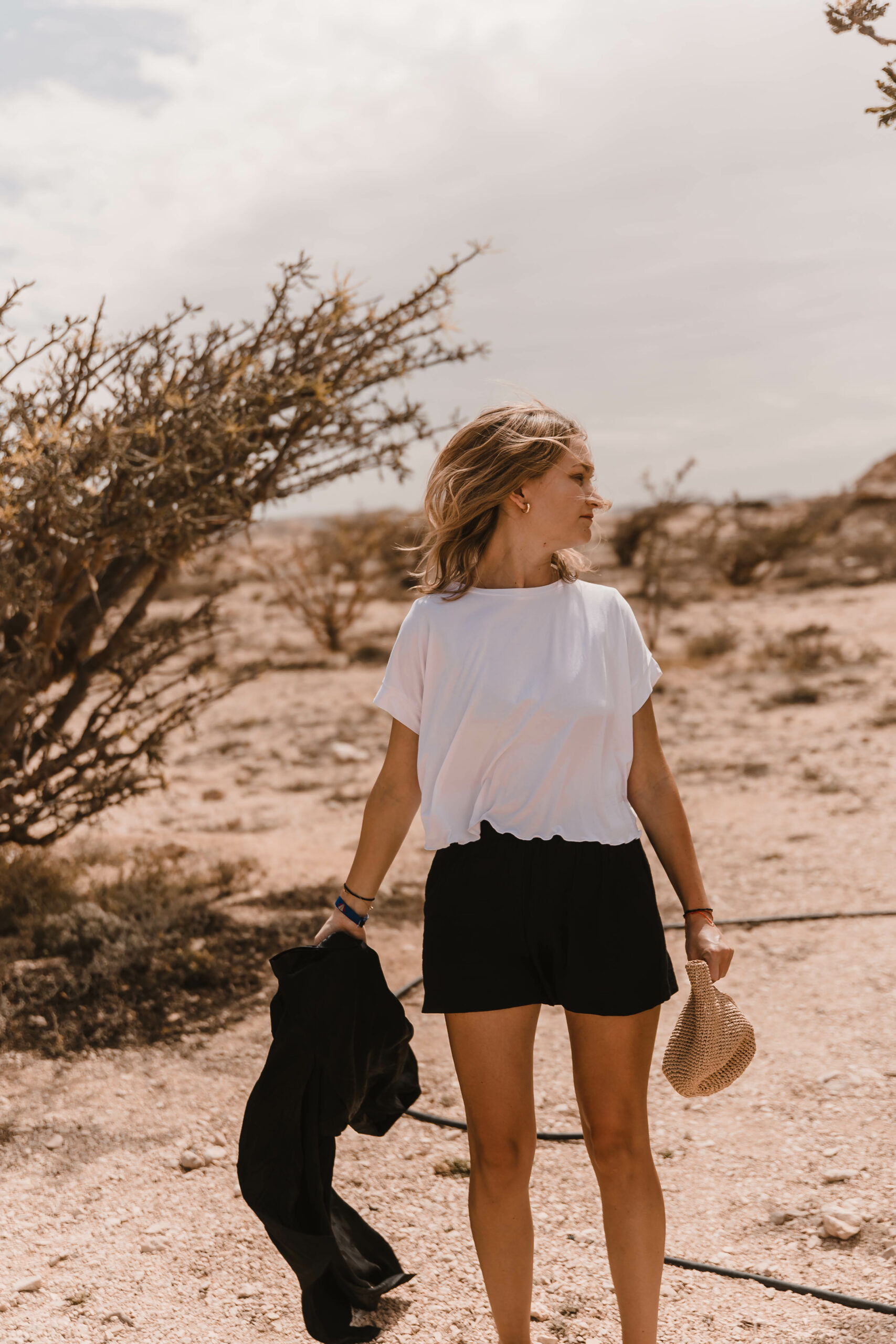 Uszyte z delikatnej, lekko prześwitującej tkaniny spodenki zapewnią Ci wygodę i swobodę przez cały dzień. Elastyczna gumka w pasie dopasuje się do Twojej figury, podczas gdy praktyczne kieszenie dodają im funkcjonalności i wygody. Gotowa na letnie przygody w najwyższym komforcie?