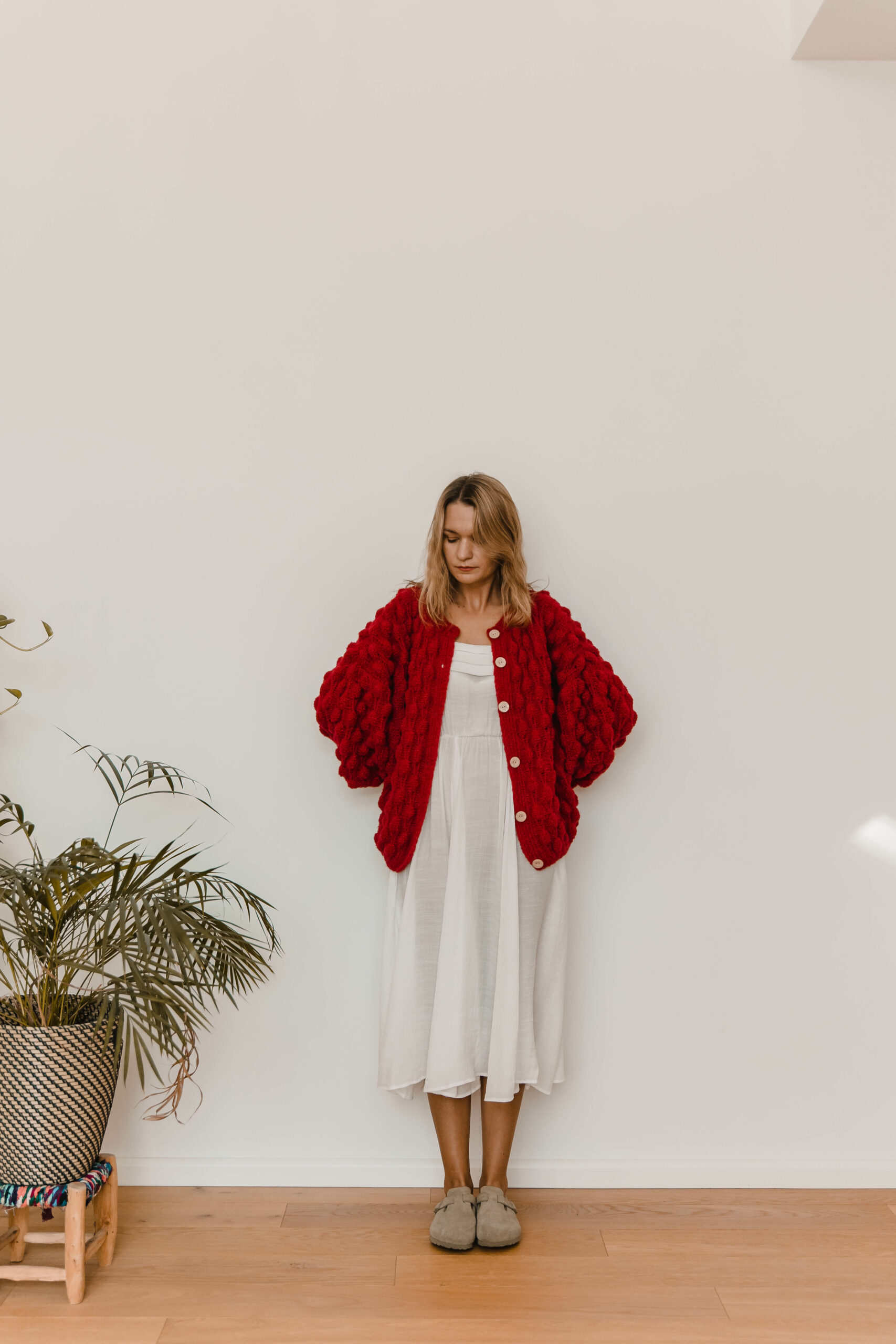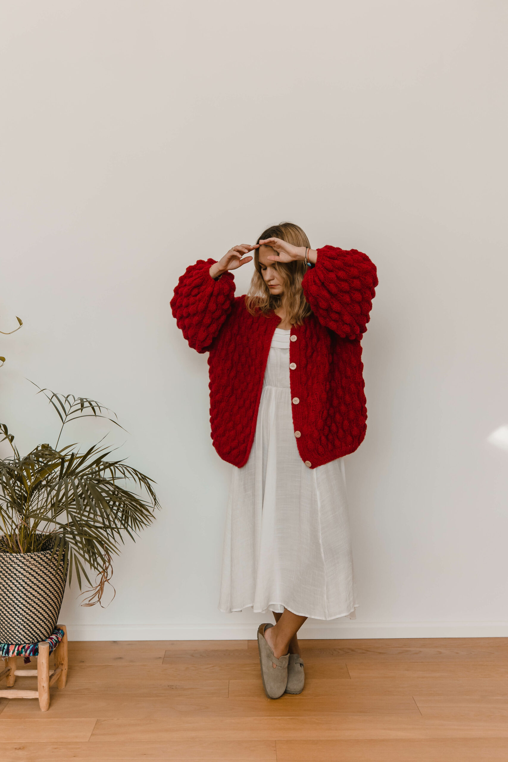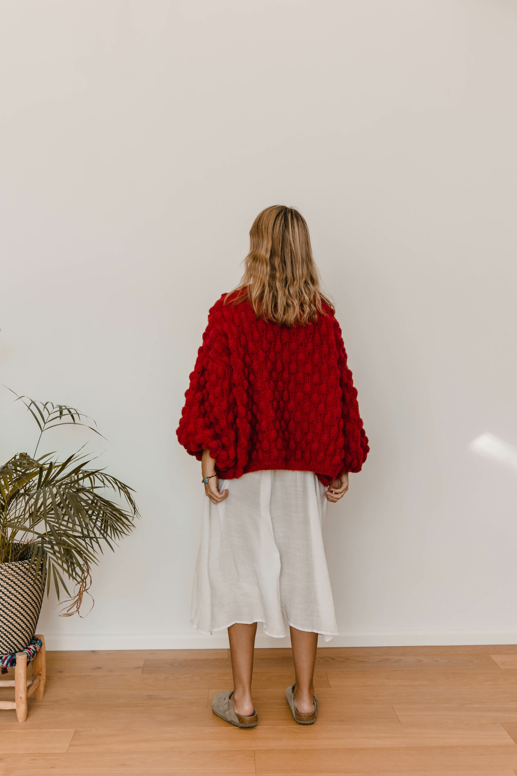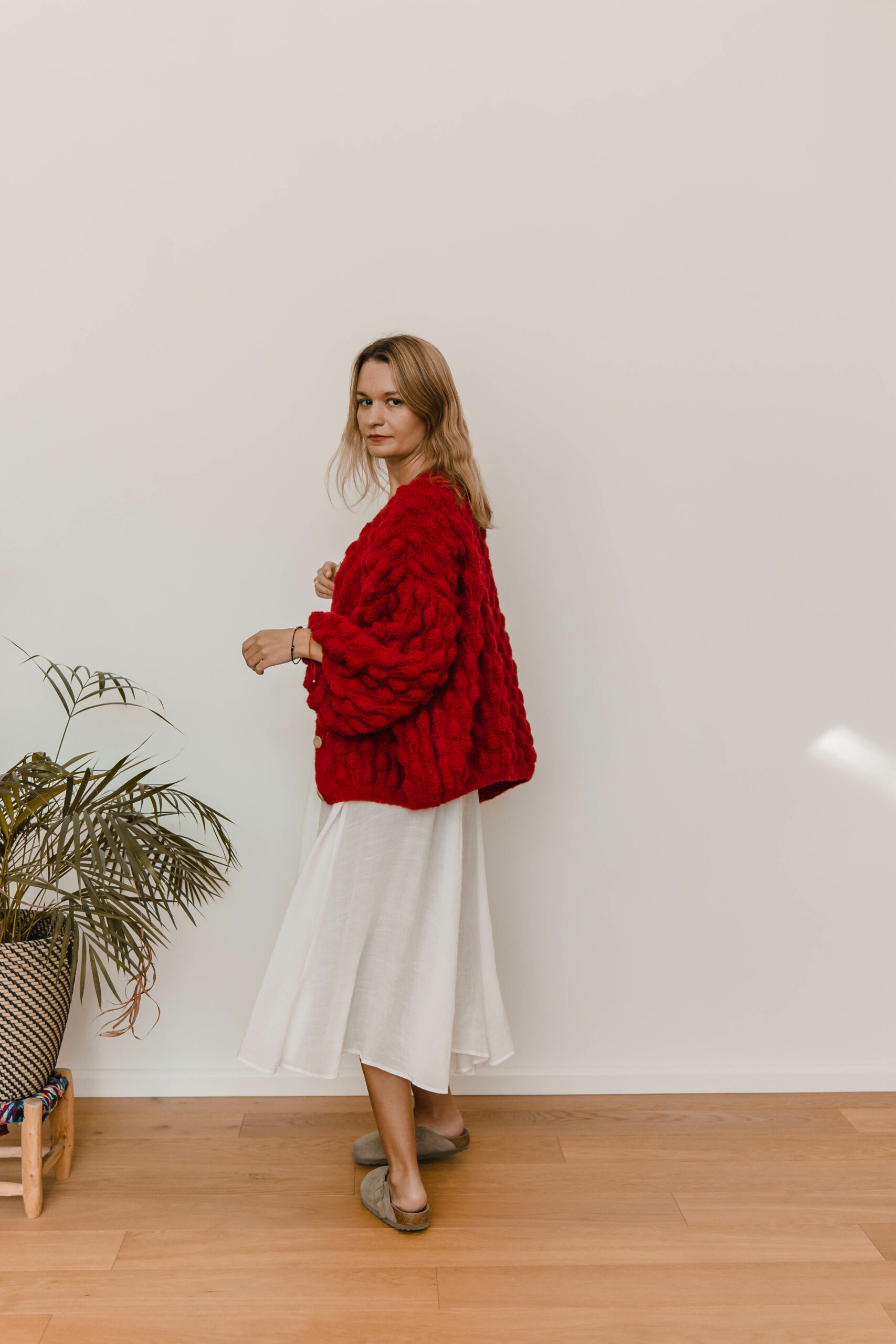 Carmine Bubble to sweter o intensywnym, głębokim odcieniu czerwieni. Gwarantujemy, że stanie się niezaprzeczalną gwiazdą w Twojej szafie. Ten wyjątkowy sweter suto zdobią bąble, które dodają mu niepowtarzalnego uroku i tekstury. Jego znaczącą cechą są ogromne rękawy, które dodają mu charakteru i sprawiają, że jest to idealny wybór na chłodniejsze dni lub wieczory. Guziki sprawiają, że może posłużyć jako płaszcz/ kurtka. Jeśli cenisz sobie unikalność będzie to wybór idealny dla Ciebie 😉