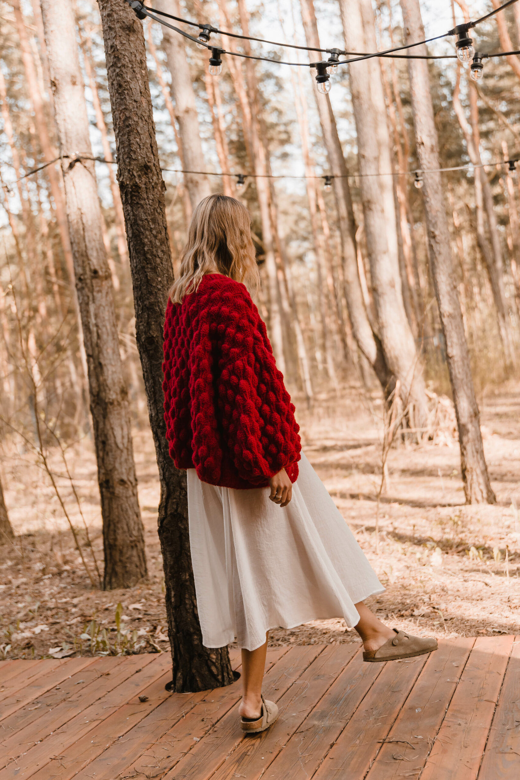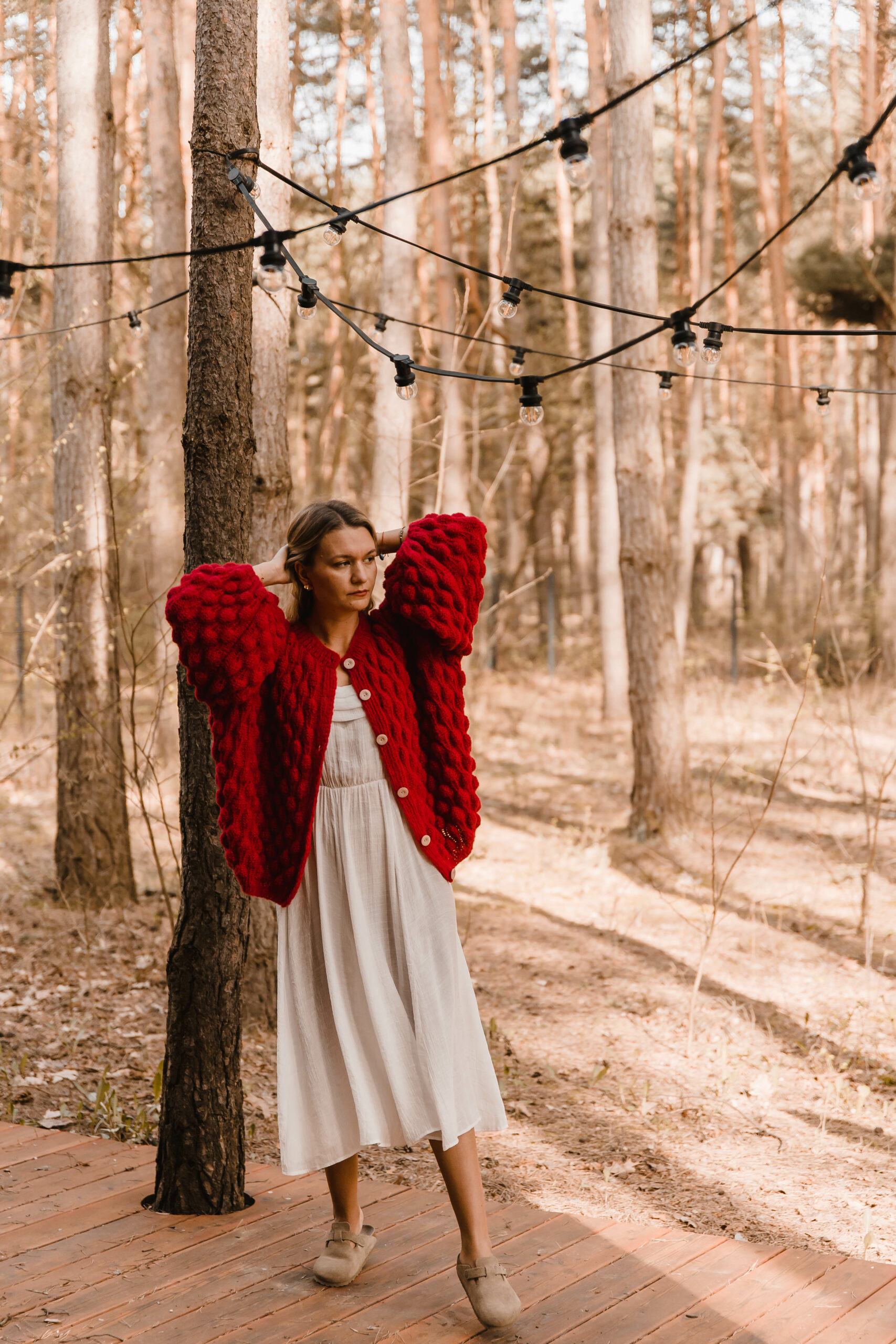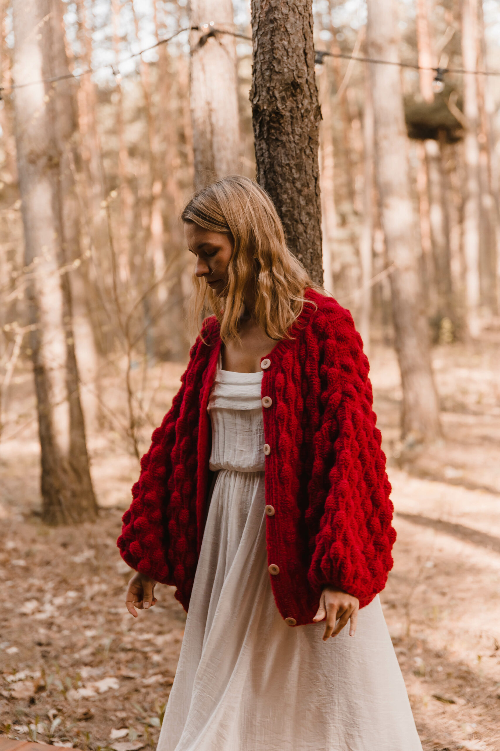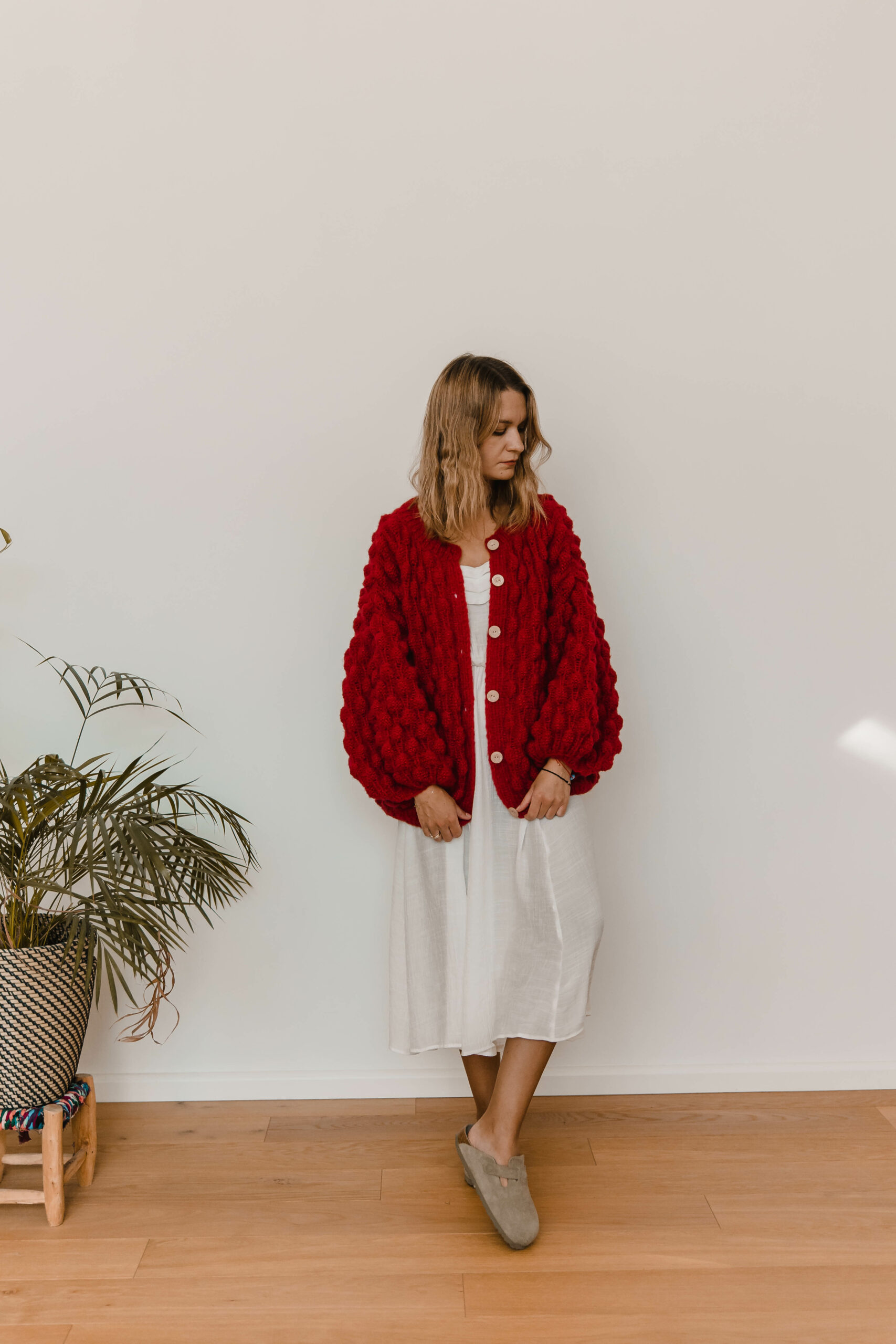 Carmine Bubble to sweter o intensywnym, głębokim odcieniu czerwieni. Gwarantujemy, że stanie się niezaprzeczalną gwiazdą w Twojej szafie. Ten wyjątkowy sweter suto zdobią bąble, które dodają mu niepowtarzalnego uroku i tekstury. Jego znaczącą cechą są ogromne rękawy, które dodają mu charakteru i sprawiają, że jest to idealny wybór na chłodniejsze dni lub wieczory. Guziki sprawiają, że może posłużyć jako płaszcz/ kurtka. Jeśli cenisz sobie unikalność będzie to wybór idealny dla Ciebie 😉