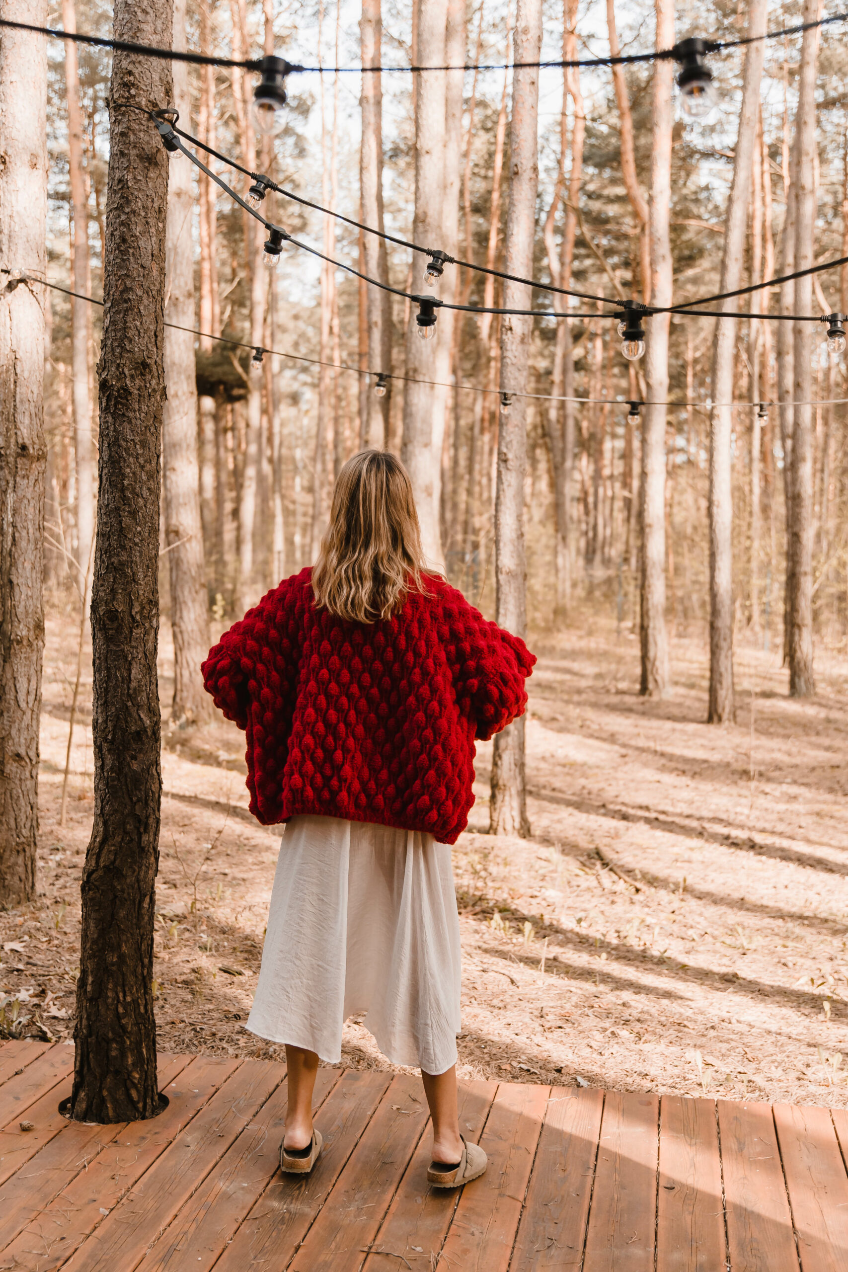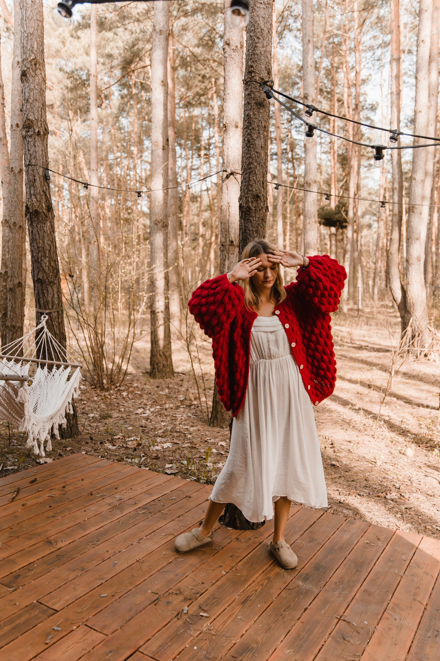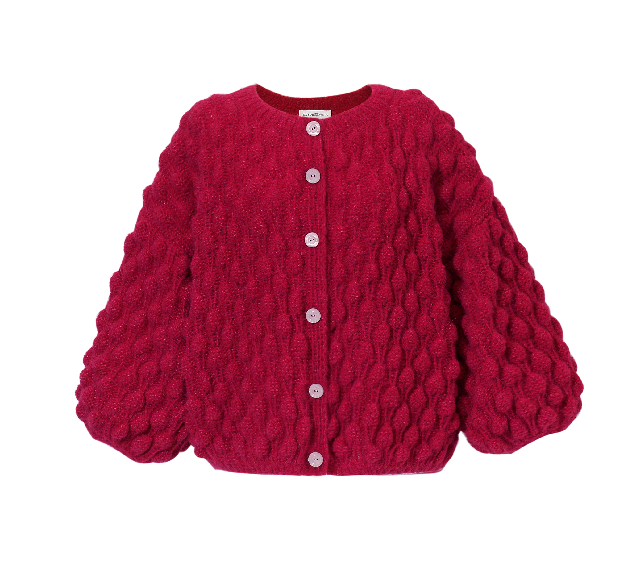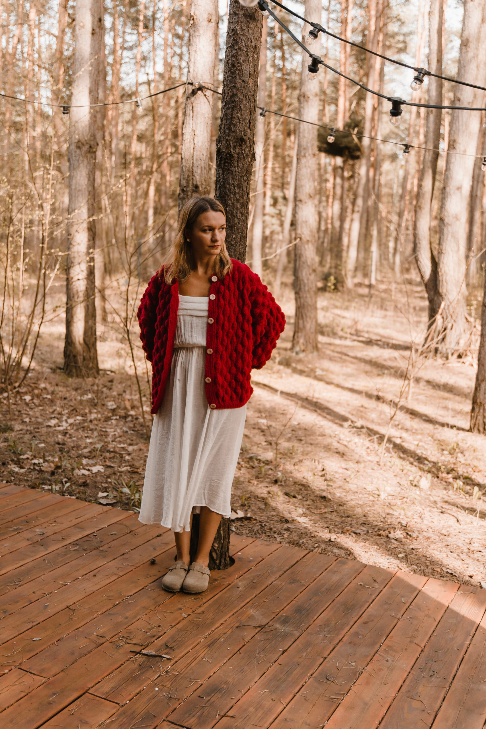 Carmine Bubble to sweter o intensywnym, głębokim odcieniu czerwieni. Gwarantujemy, że stanie się niezaprzeczalną gwiazdą w Twojej szafie. Ten wyjątkowy sweter suto zdobią bąble, które dodają mu niepowtarzalnego uroku i tekstury. Jego znaczącą cechą są ogromne rękawy, które dodają mu charakteru i sprawiają, że jest to idealny wybór na chłodniejsze dni lub wieczory. Guziki sprawiają, że może posłużyć jako płaszcz/ kurtka. Jeśli cenisz sobie unikalność będzie to wybór idealny dla Ciebie 😉