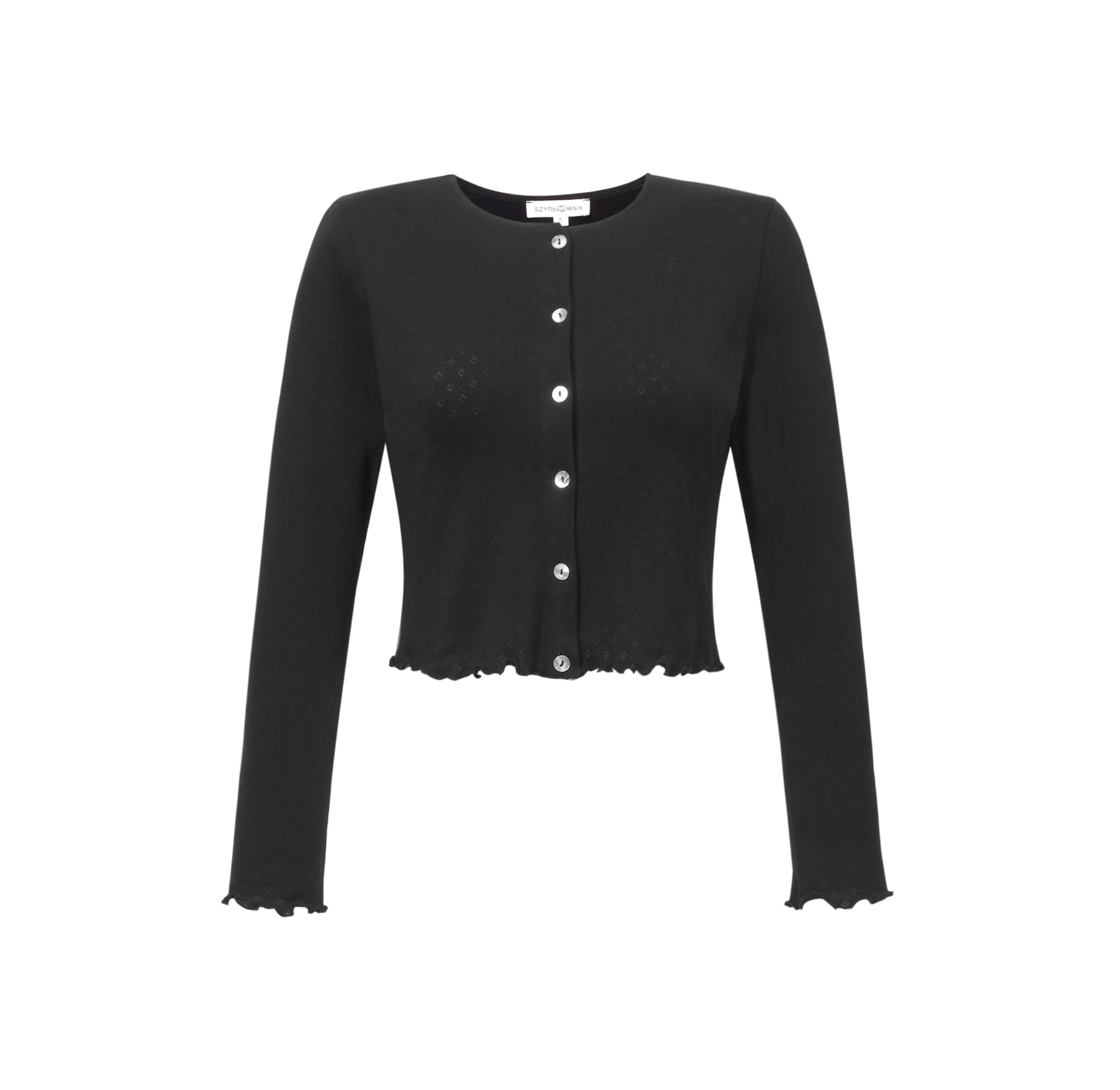 Lekka, czarna koszulka z ażurowej dzianiny — taka, którą zakładasz rano i już wiesz, że dzień będzie dobry. Guziki z masy perłowej łapią światło i aż proszą się, żeby się nimi pobawić — możesz je rozpinać i zapinać w zależności od nastroju, pogody czy planów na dzień. Mereżkowe wykończenia dodają jej lekkości, a miękki materiał sprawia, że jest przyjemna w noszeniu od świtu do nocy. Pasuje do wszystkiego — od ulubionych jeansów po zwiewną spódnicę — i bez wysiłku dopasowuje się do Twojego rytmu.
