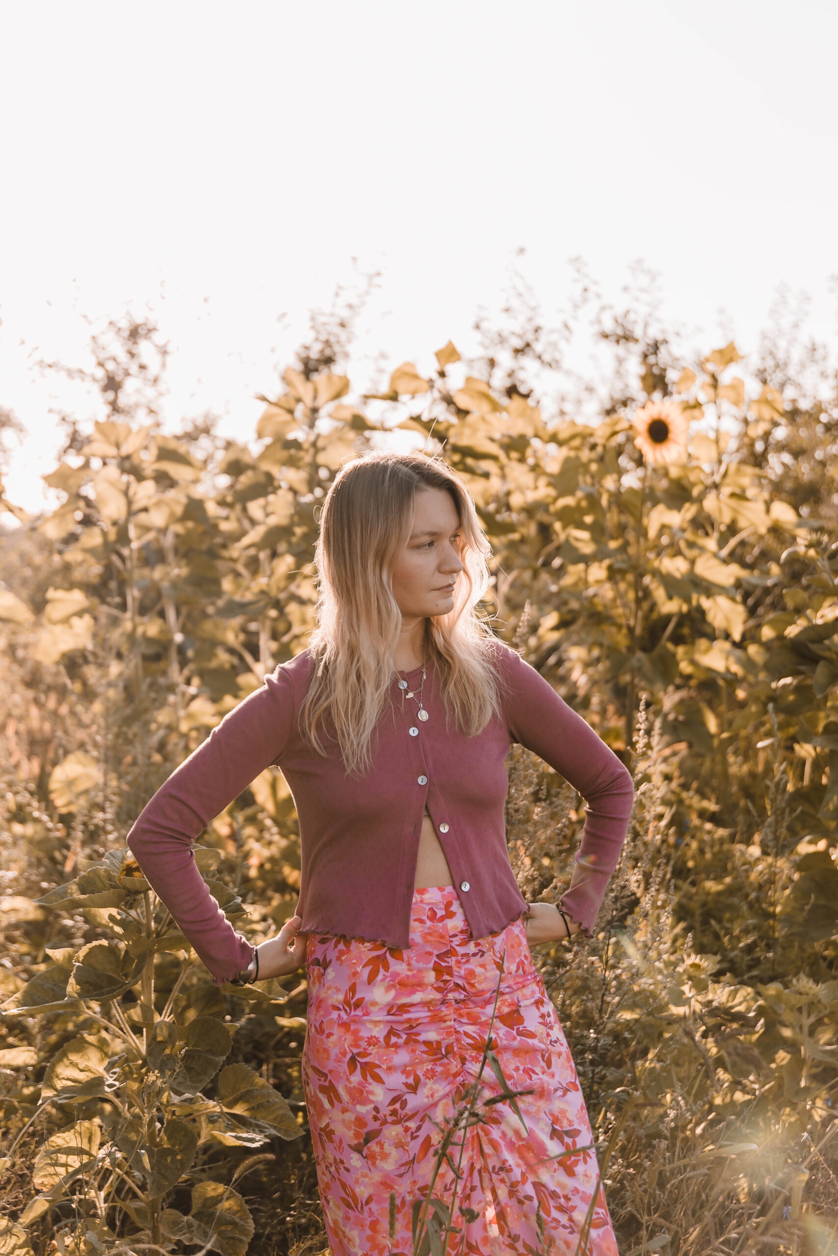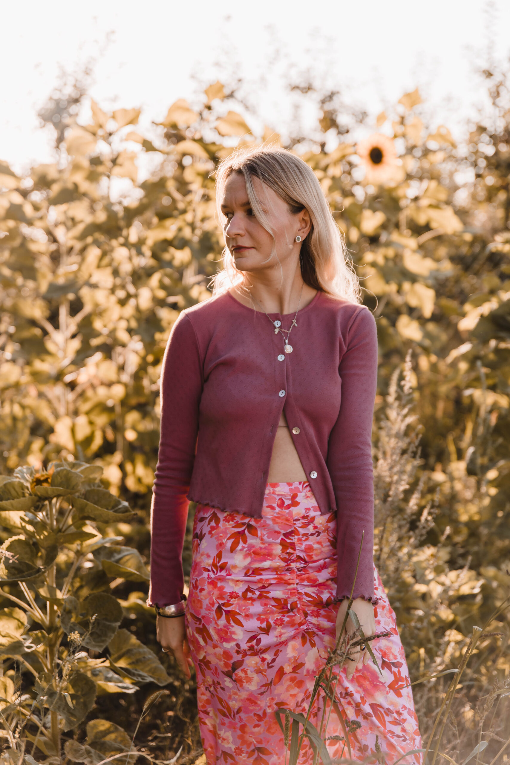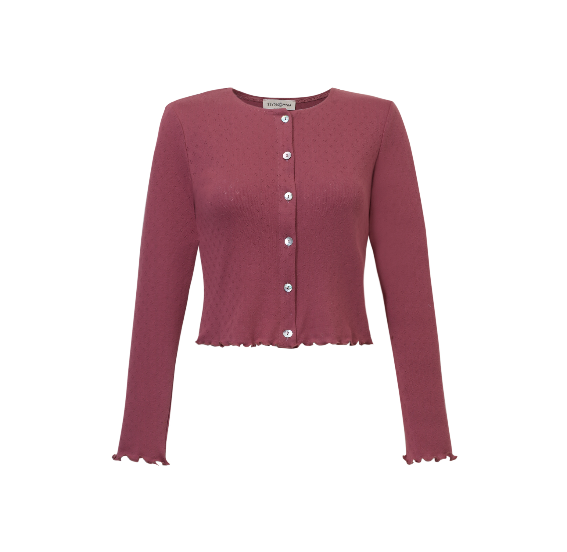 Lekka, wrzosowa koszulka z ażurowej dzianiny — taka, którą zakładasz rano i już wiesz, że dzień będzie dobry. Guziki z masy perłowej łapią światło i aż proszą się, żeby się nimi pobawić — możesz je rozpinać i zapinać w zależności od nastroju, pogody czy planów na dzień. Mereżkowe wykończenia dodają jej lekkości, a miękki materiał sprawia, że jest przyjemna w noszeniu od świtu do nocy. Pasuje do wszystkiego — od ulubionych jeansów po zwiewną spódnicę — i bez wysiłku dopasowuje się do Twojego rytmu.