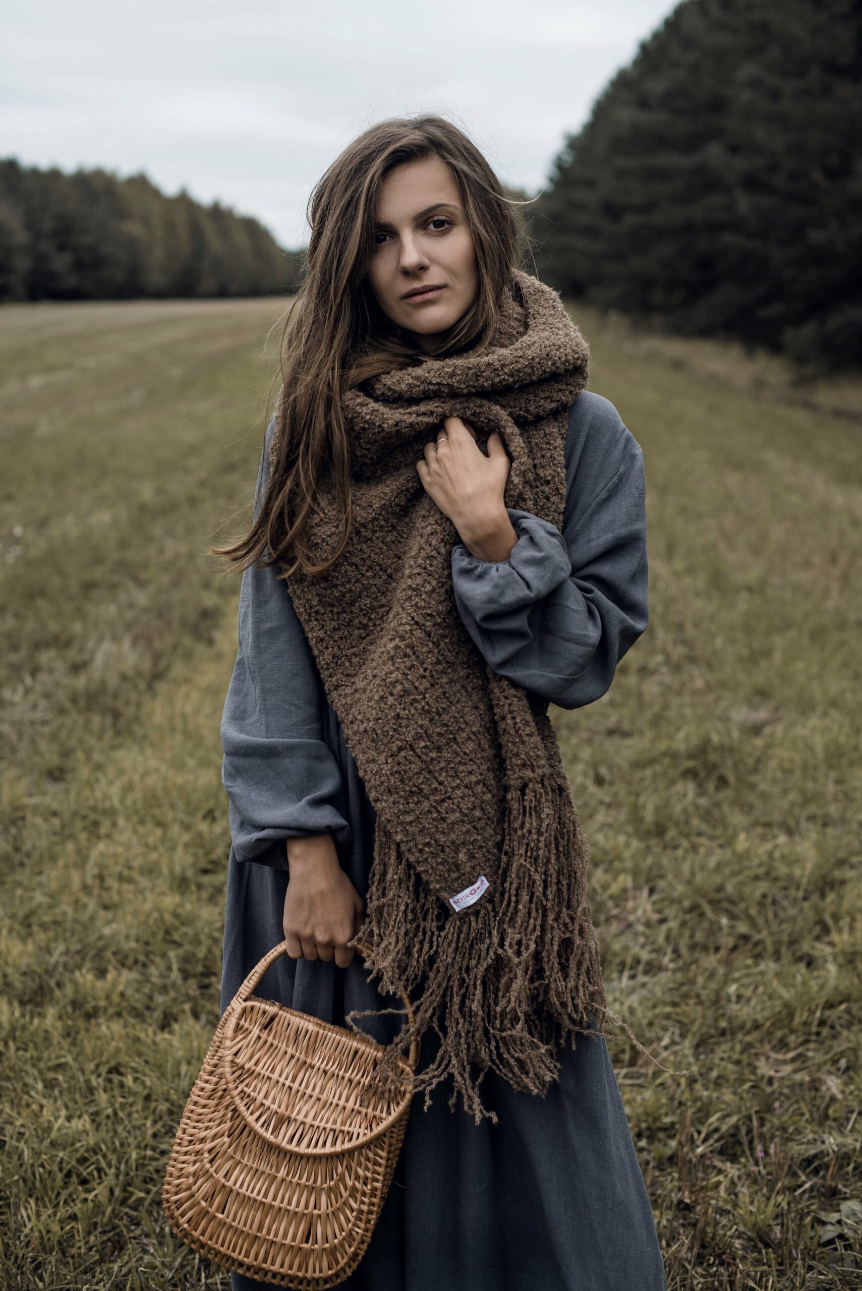 Długi, brązowy szalik wykonany z miękkiej i przyjemnej w dotyku włóczki alpaki. Wykończony frędzlami. Na zamówienie szalik jest dostępny w innych kolorach.