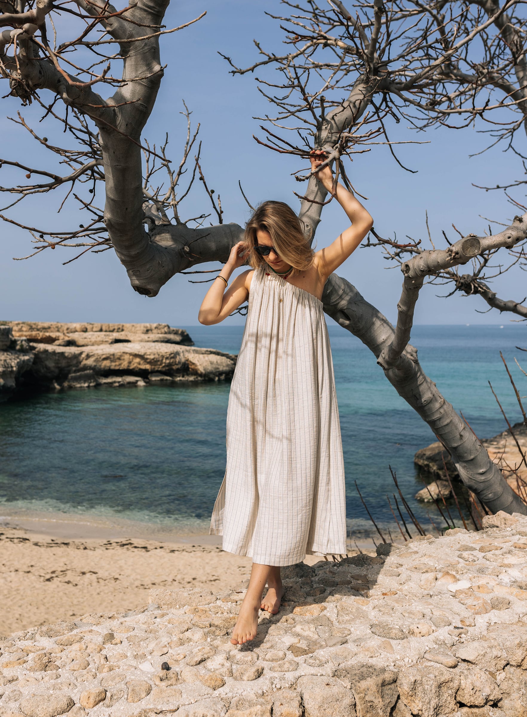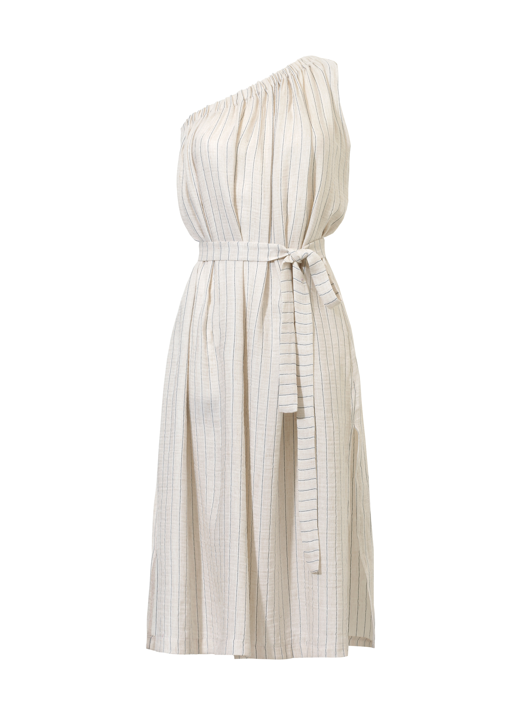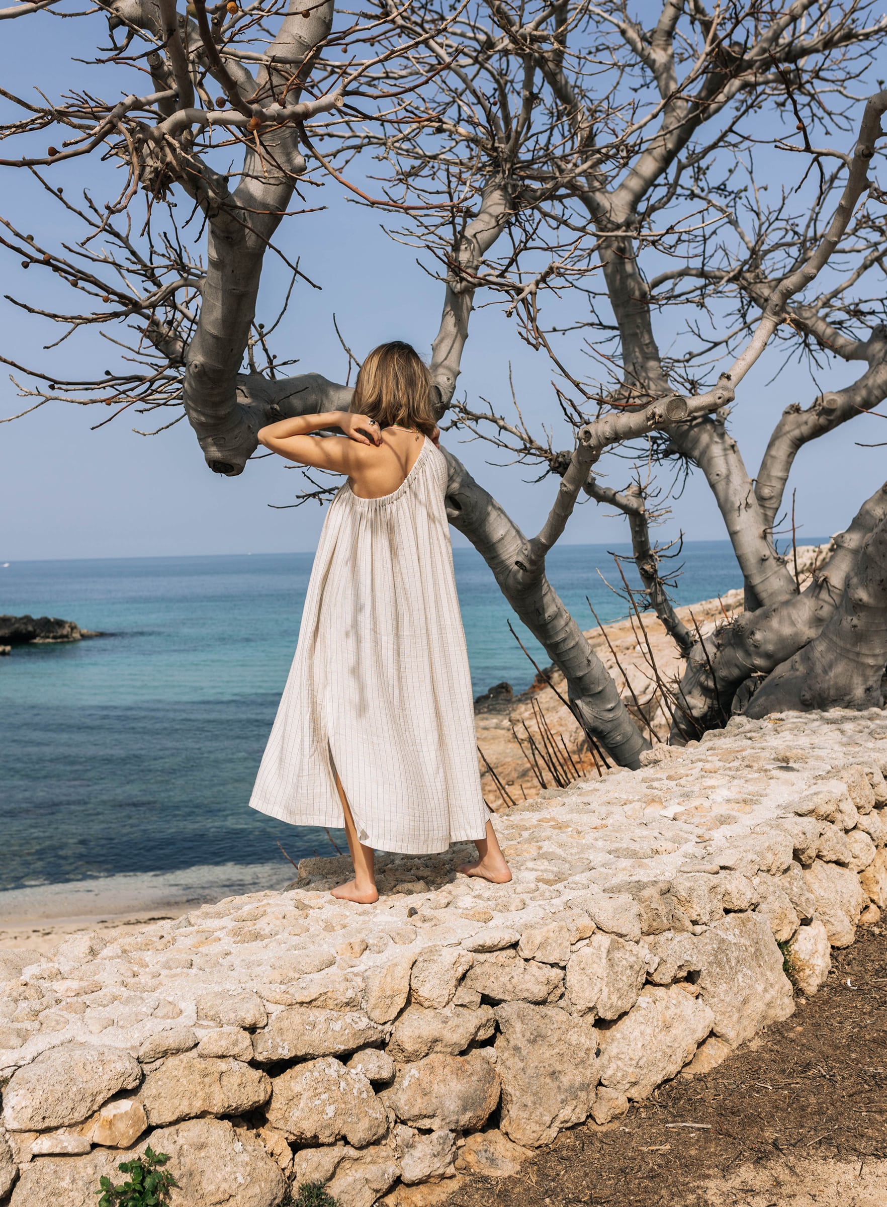 Ta sukienka będzie elegancka jeśli tego zapragniesz. W zestawie z sandałkami na delikatnym obcasie, pójdzie z Tobą na kolację przy świecach. Ale ale odnajdzie się nawet w towarzystwie japonek i koszyka podczas spaceru na targ. Uszyta z lekkiej tkaniny w subtelne paski. Oversizowy krój. W zestawie z paskiem, do swobodnego noszenia razem lub osobno.