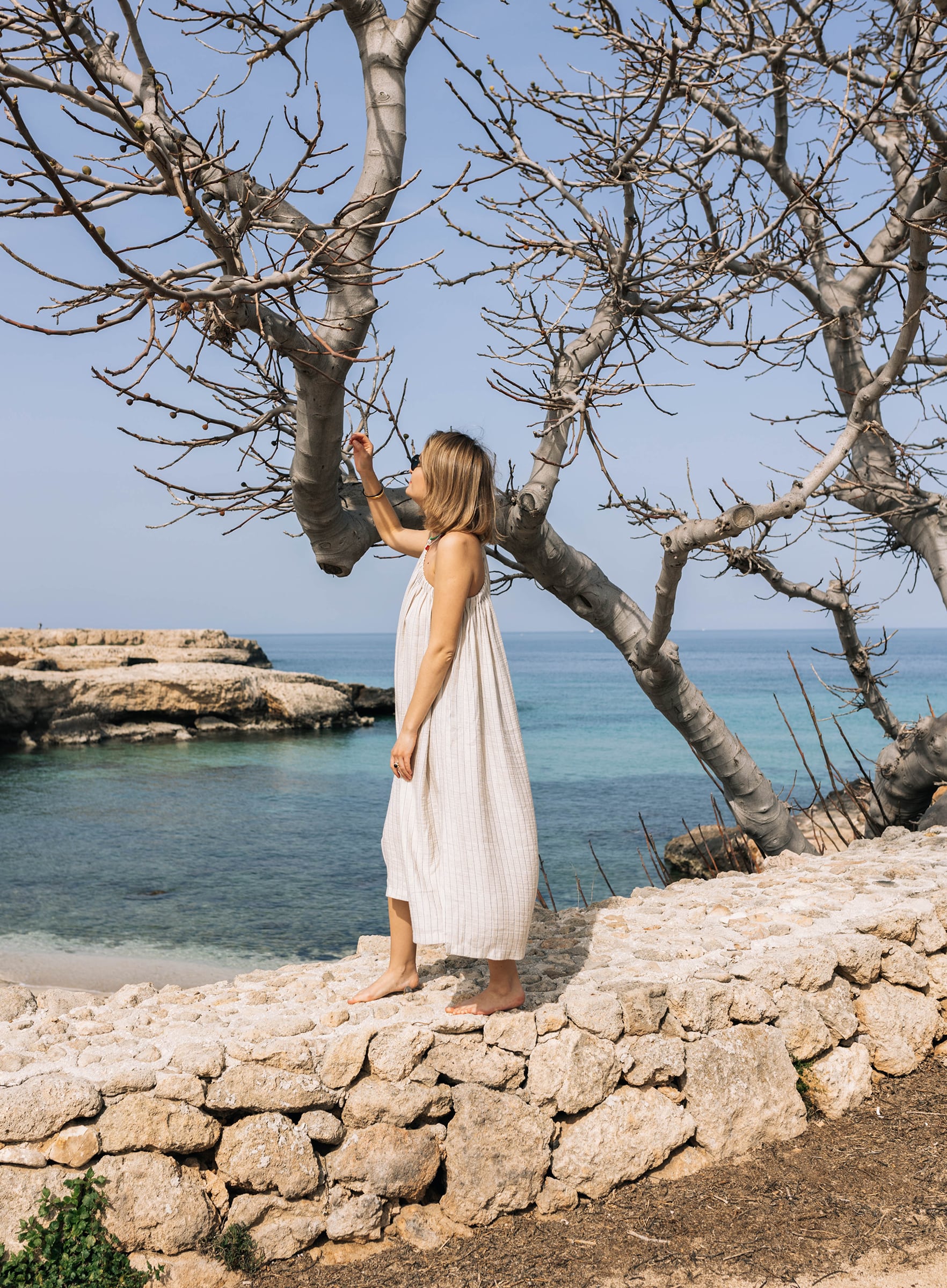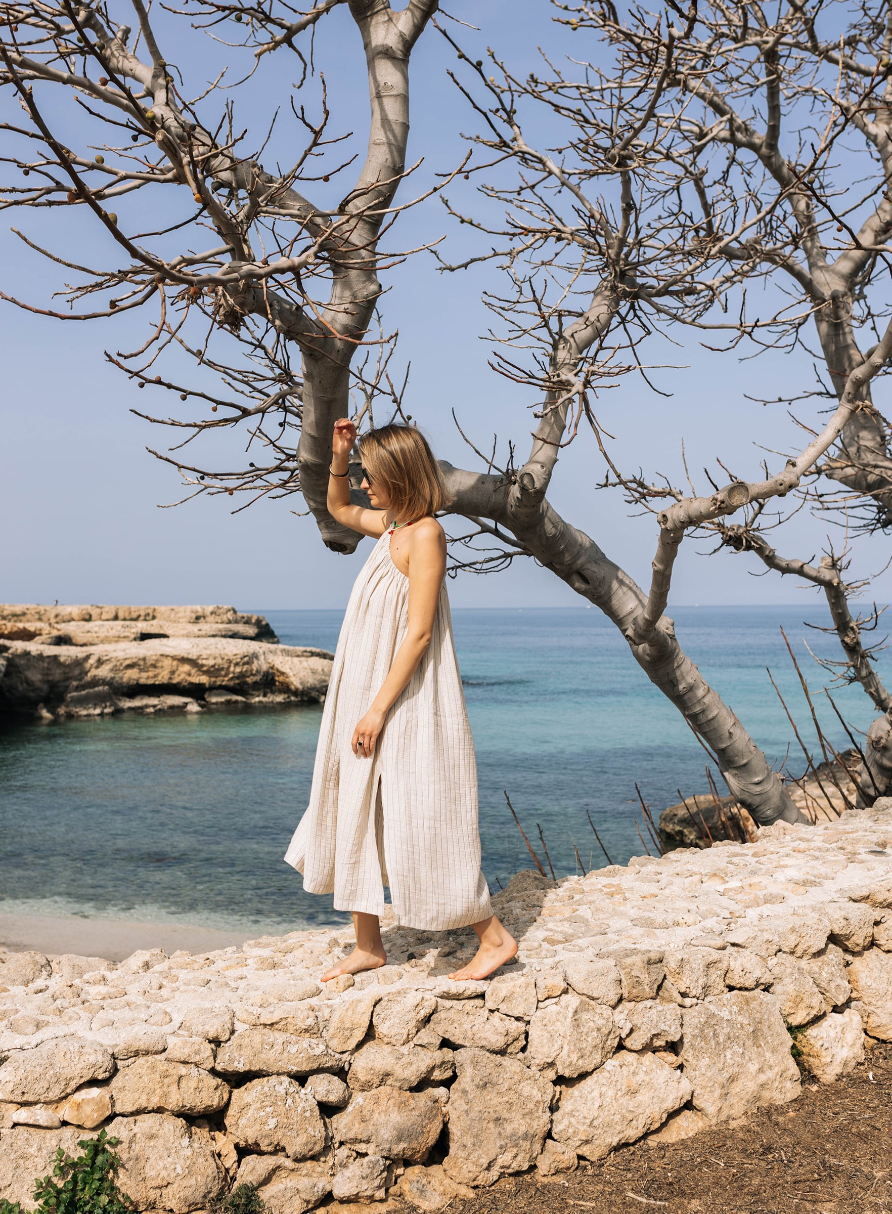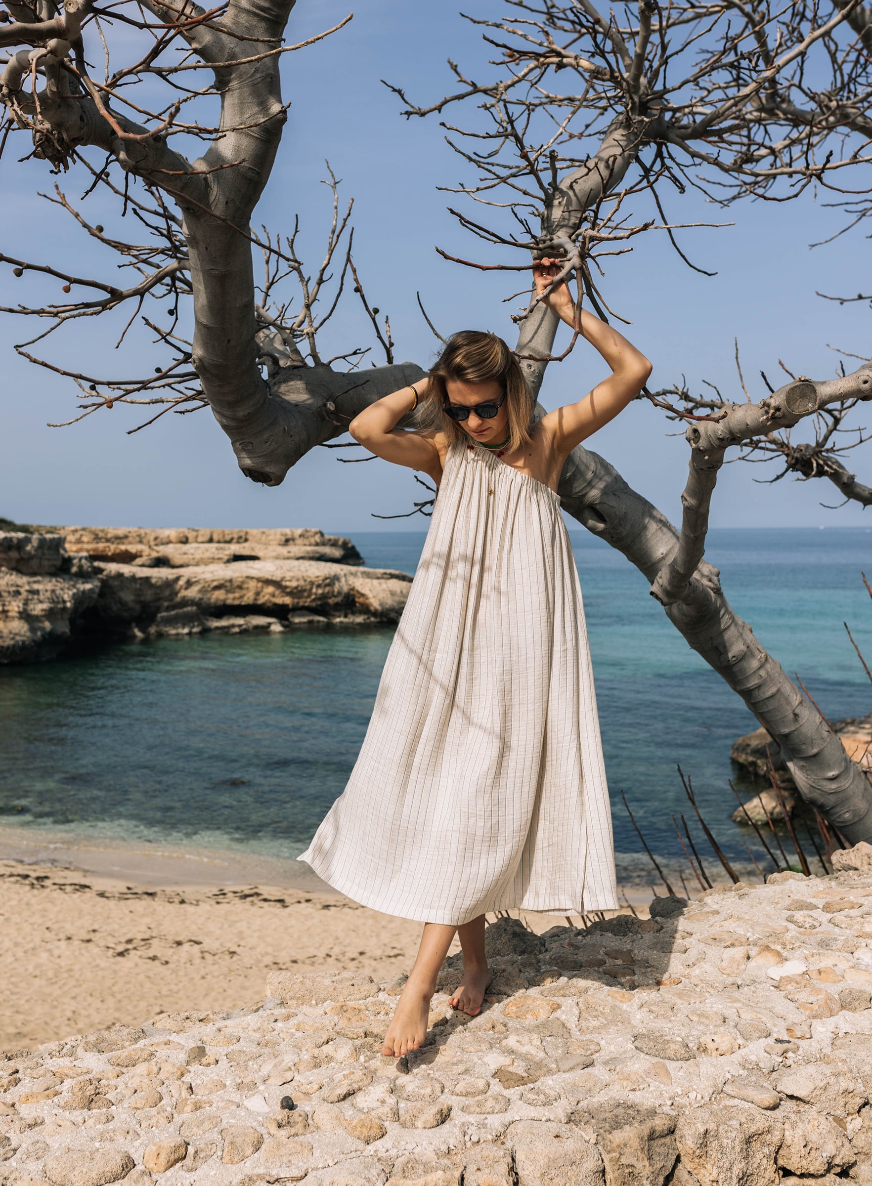 Ta sukienka będzie elegancka jeśli tego zapragniesz. W zestawie z sandałkami na delikatnym obcasie, pójdzie z Tobą na kolację przy świecach. Ale ale odnajdzie się nawet w towarzystwie japonek i koszyka podczas spaceru na targ. Uszyta z lekkiej tkaniny w subtelne paski. Oversizowy krój. W zestawie z paskiem, do swobodnego noszenia razem lub osobno.
