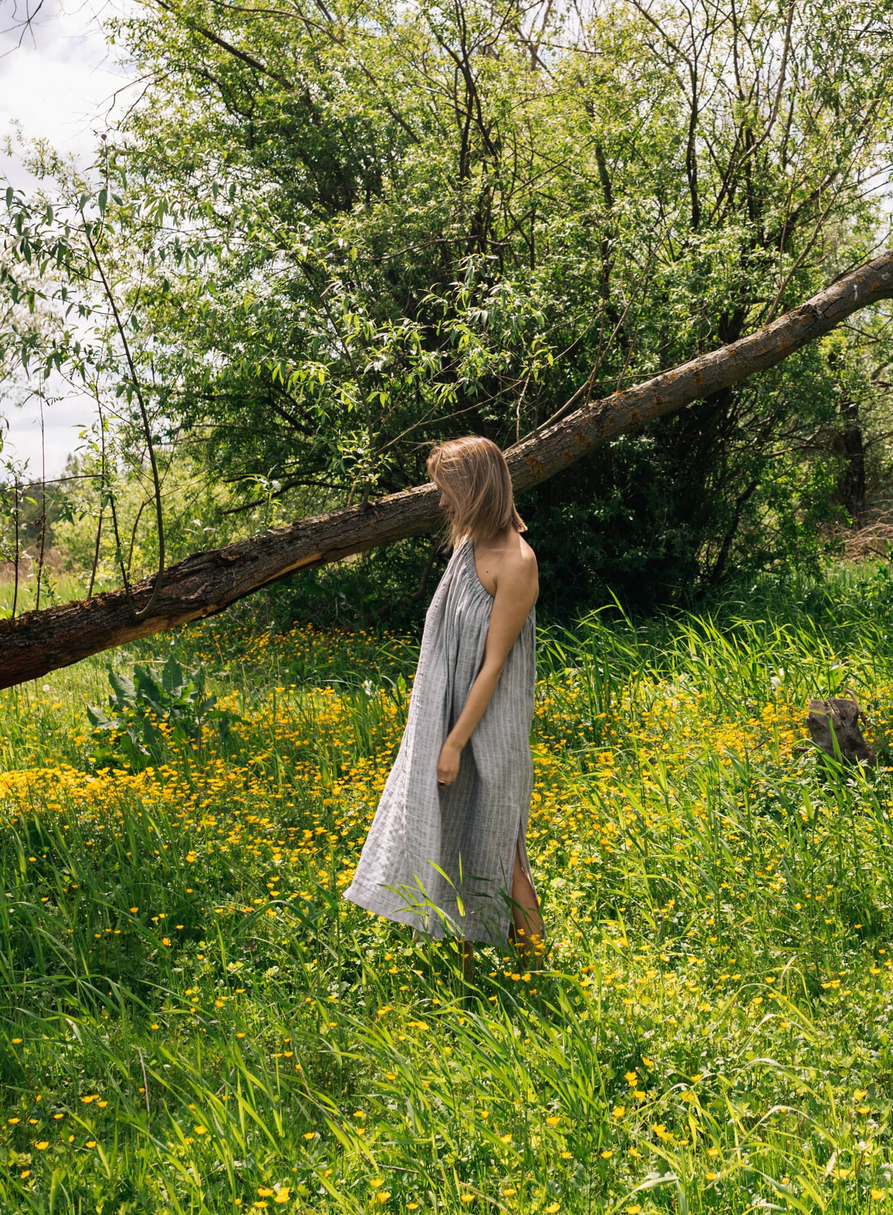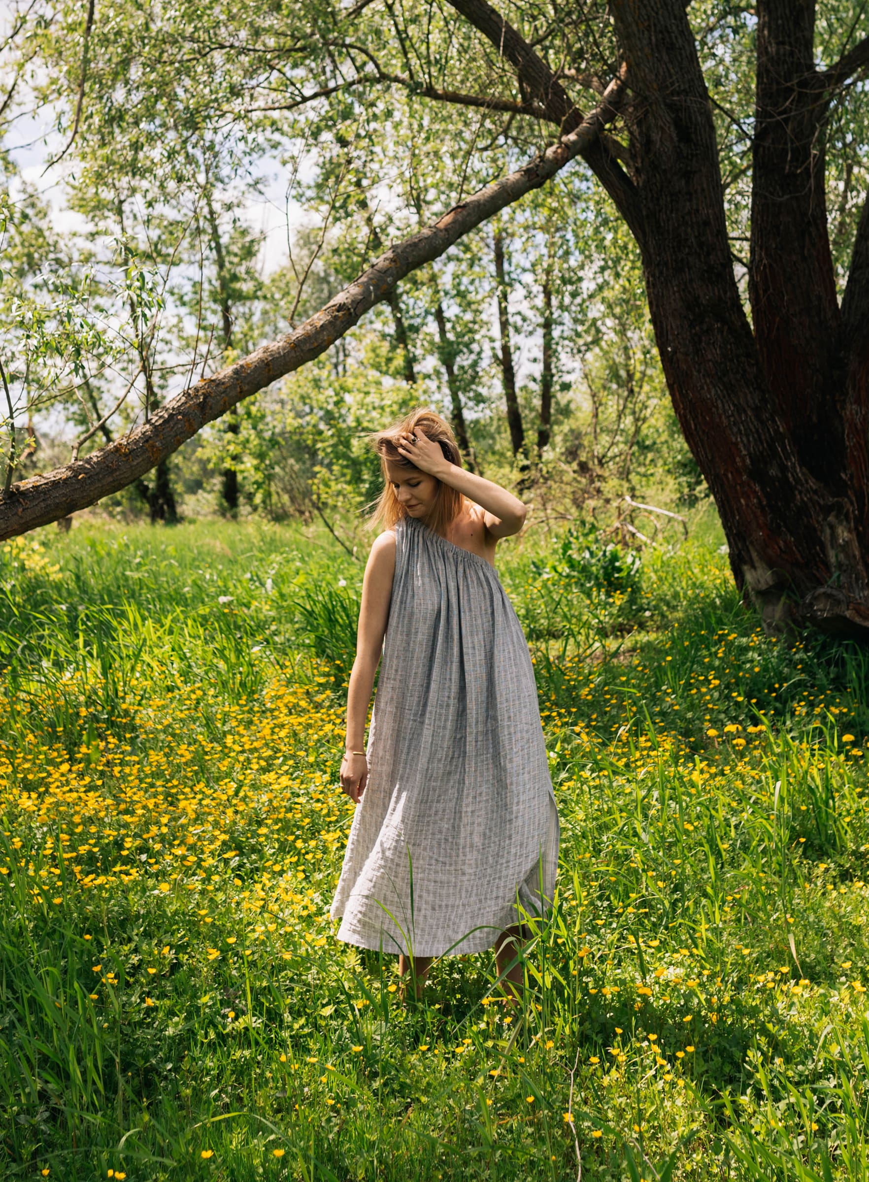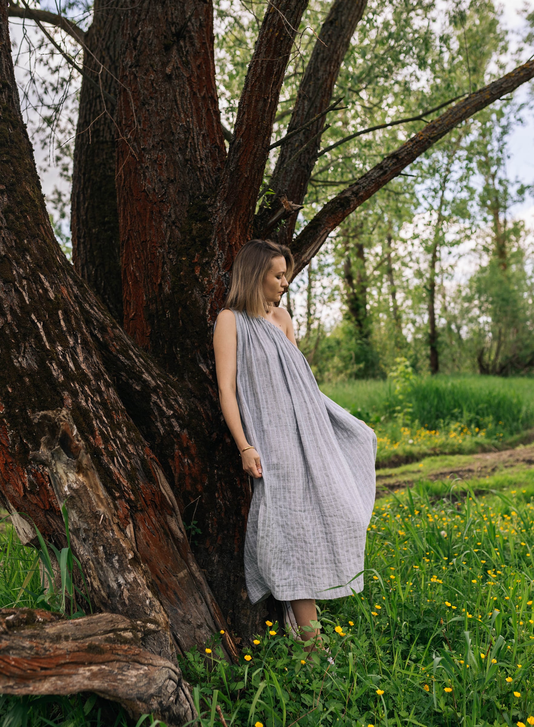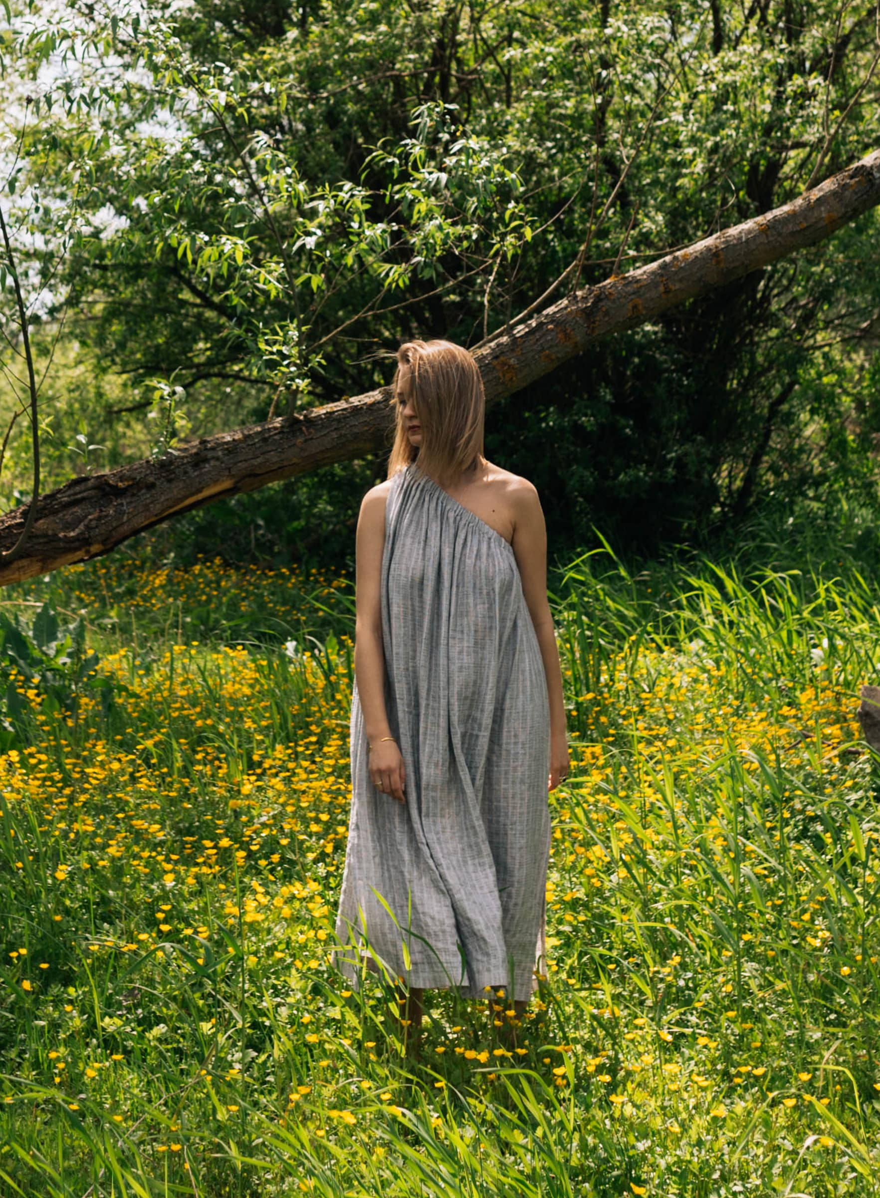 Ta sukienka będzie elegancka jeśli tego zapragniesz. W zestawie z sandałkami na delikatnym obcasie, pójdzie z Tobą na kolację przy świecach. Ale ale odnajdzie się nawet w towarzystwie japonek i koszyka podczas spaceru na targ. Uszyta z lekkiej tkaniny w subtelne paski. Oversizowy krój. W zestawie z paskiem, do swobodnego noszenia razem lub osobno.