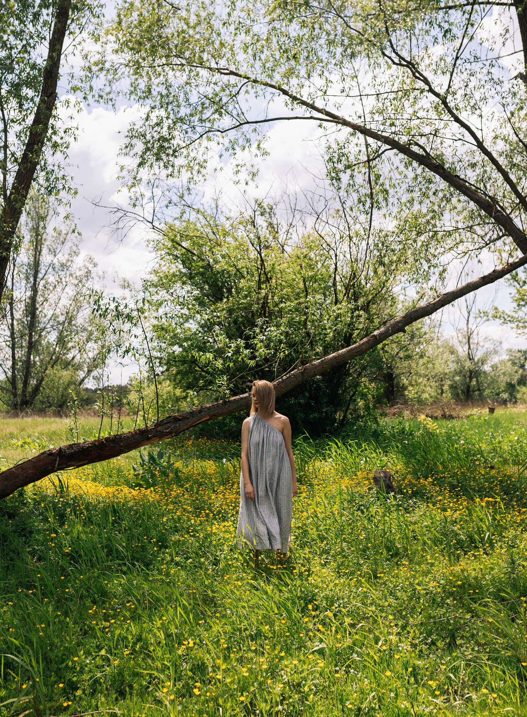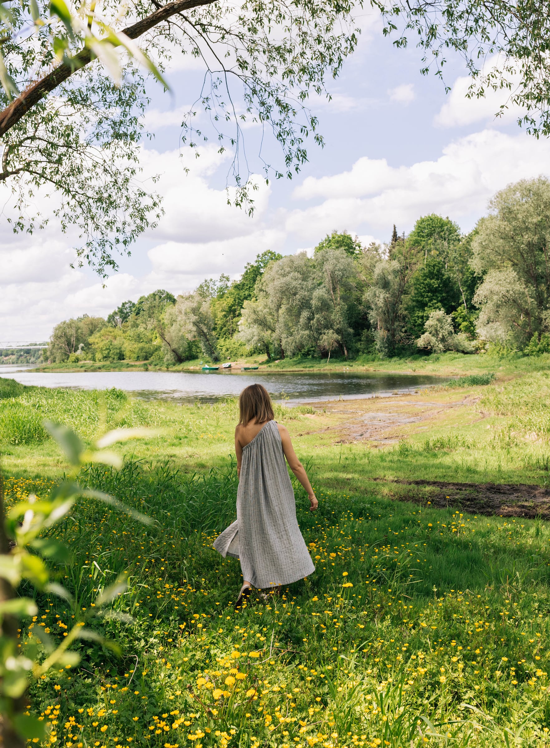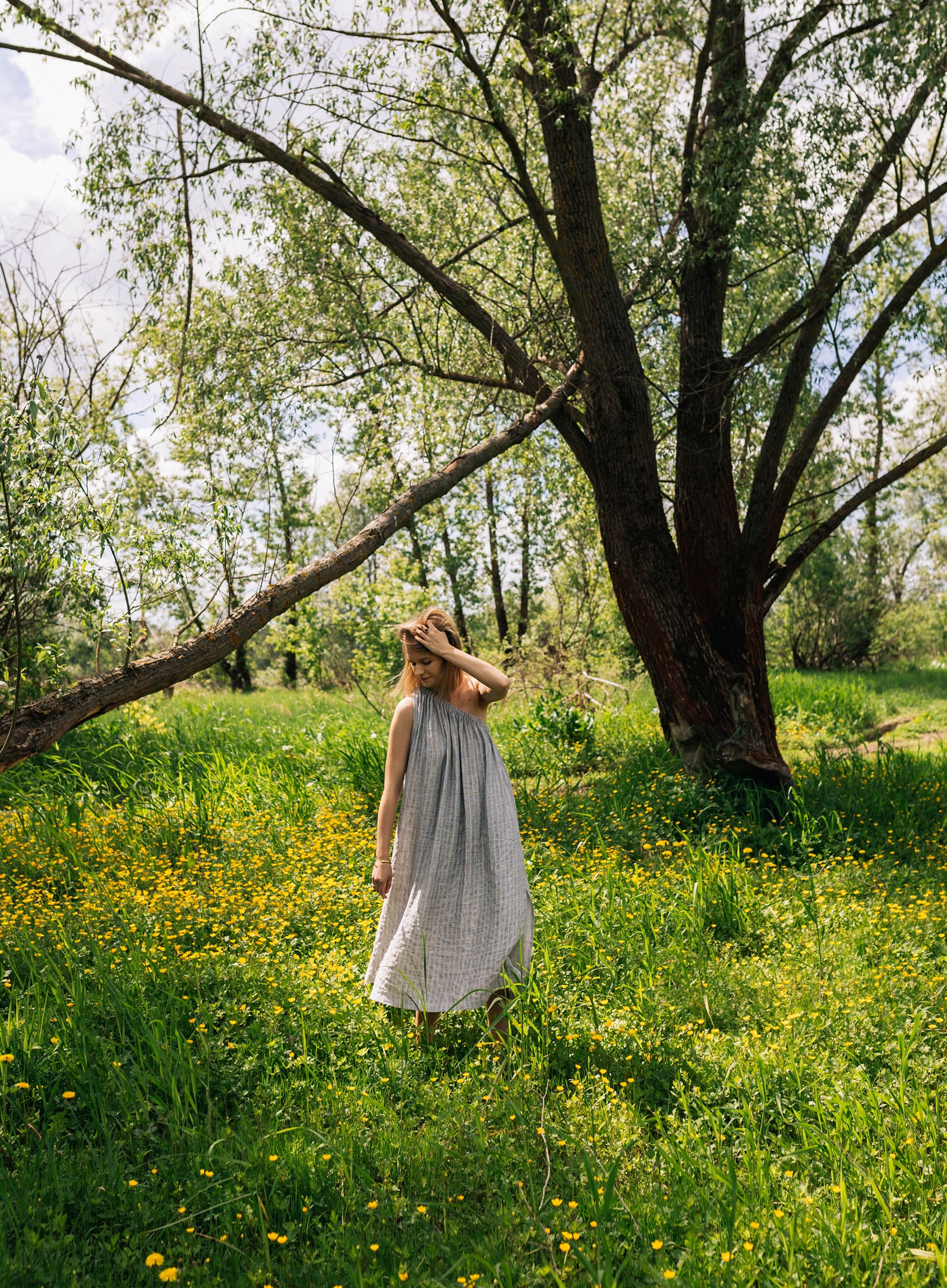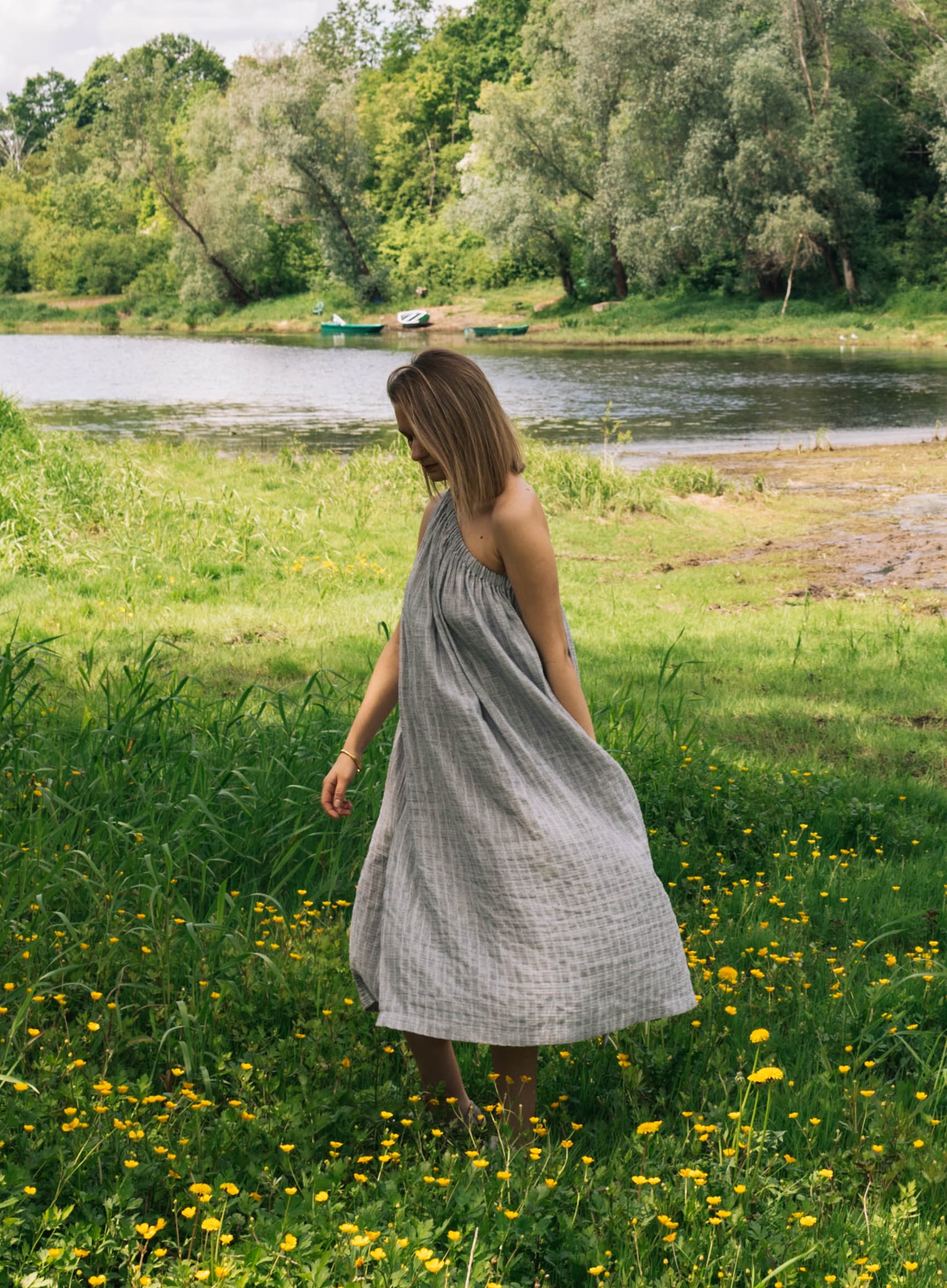 Ta sukienka będzie elegancka jeśli tego zapragniesz. W zestawie z sandałkami na delikatnym obcasie, pójdzie z Tobą na kolację przy świecach. Ale ale odnajdzie się nawet w towarzystwie japonek i koszyka podczas spaceru na targ. Uszyta z lekkiej tkaniny w subtelne paski. Oversizowy krój. W zestawie z paskiem, do swobodnego noszenia razem lub osobno.