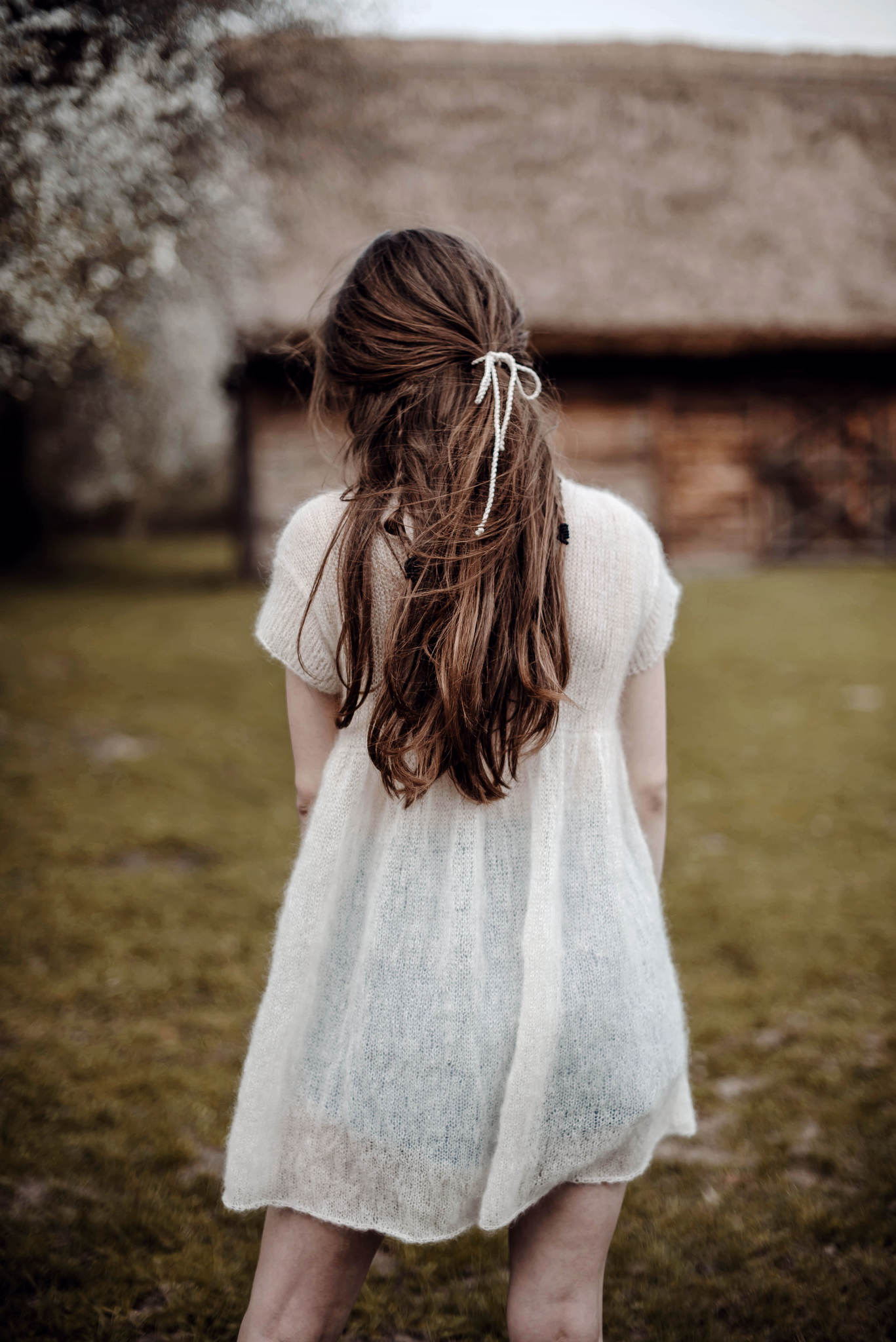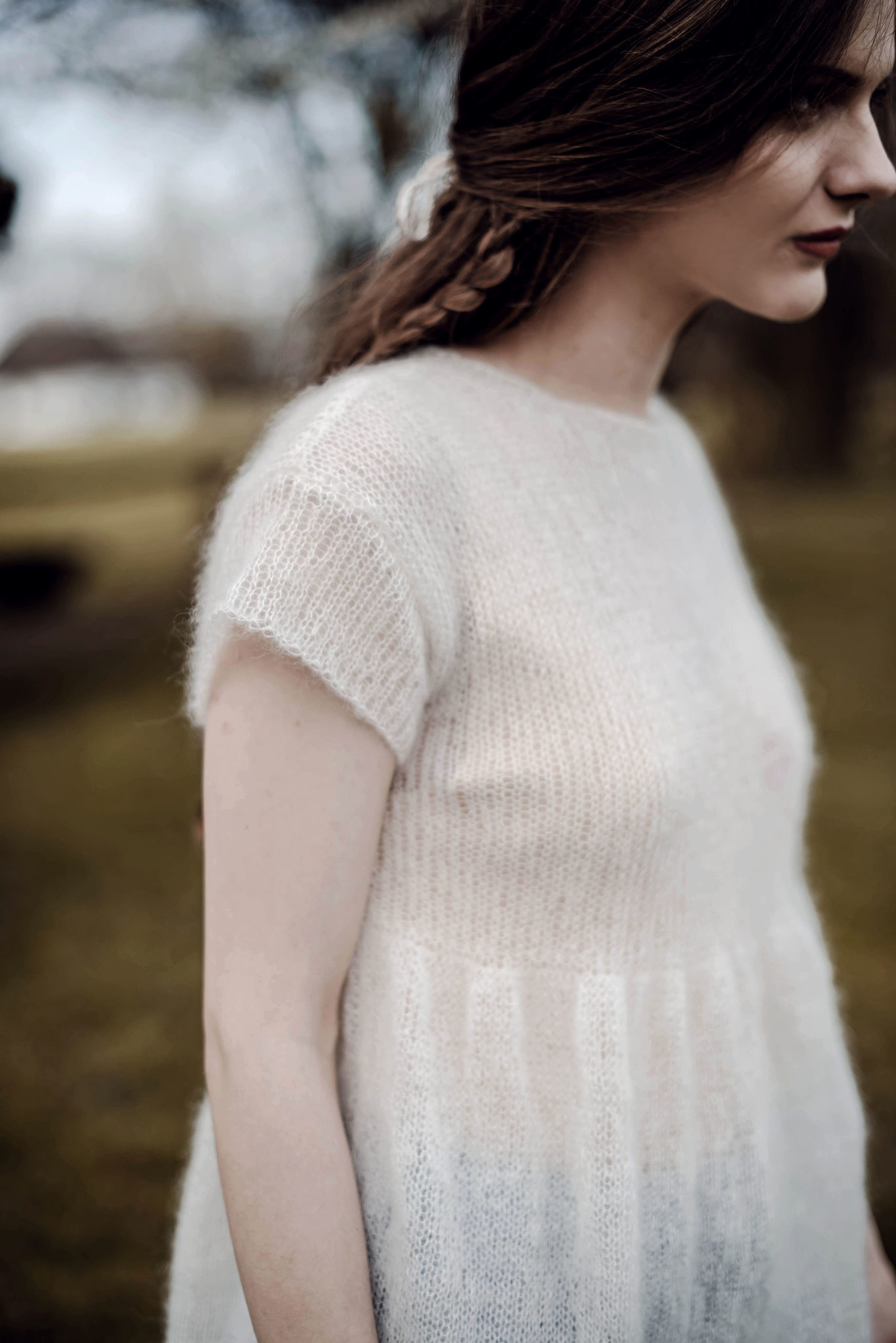 Delikatna i zwiewna sukienka midi z krótkim rękawkiem. Wydziergana ręcznie z lekkiej, cienkiej i miłej w dotyku włóczki. Odcięcie pod biustem i mocno rozszerzany dół. Na zamówienie sukienka jest dostępna w innych kolorach.