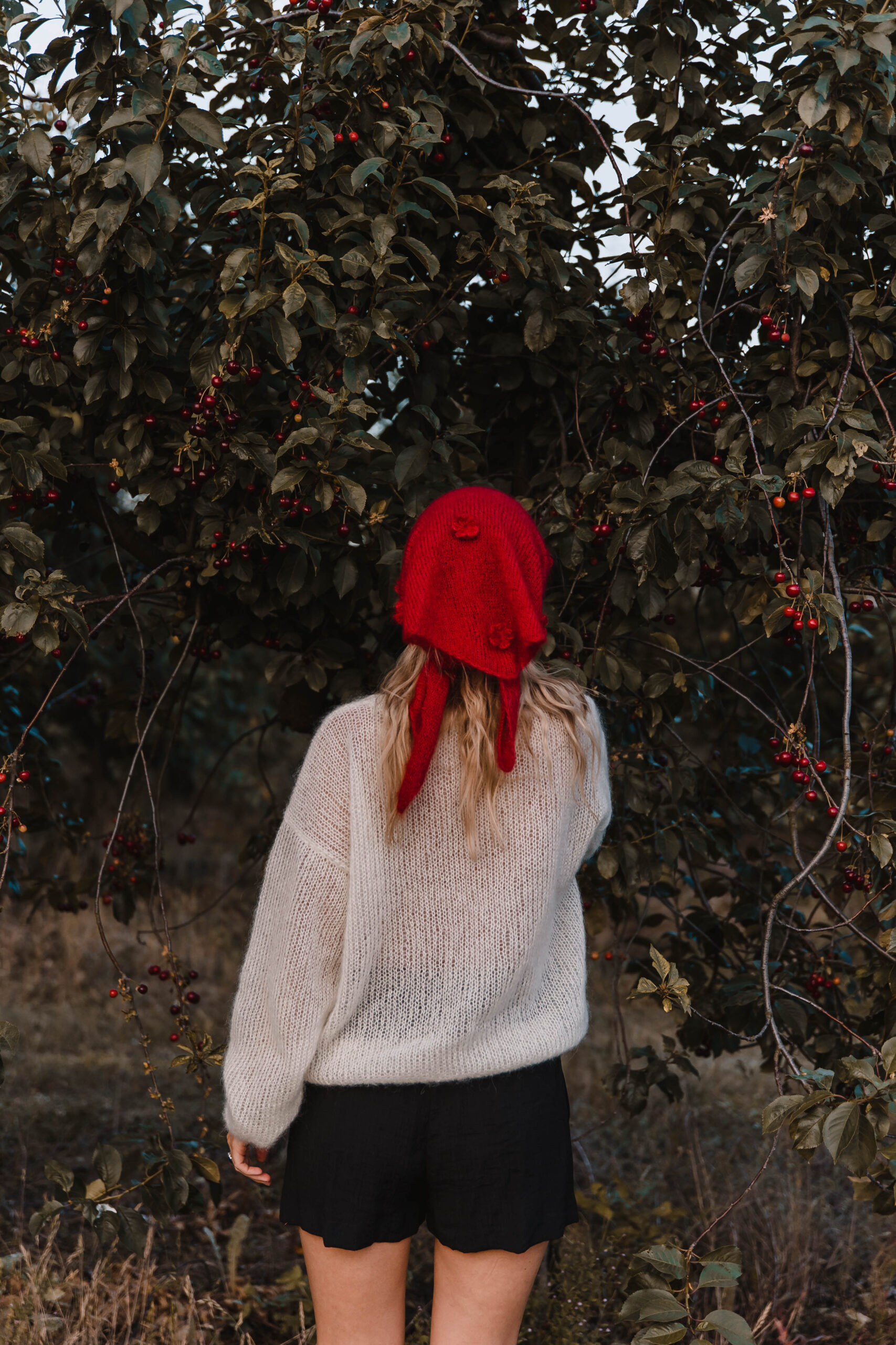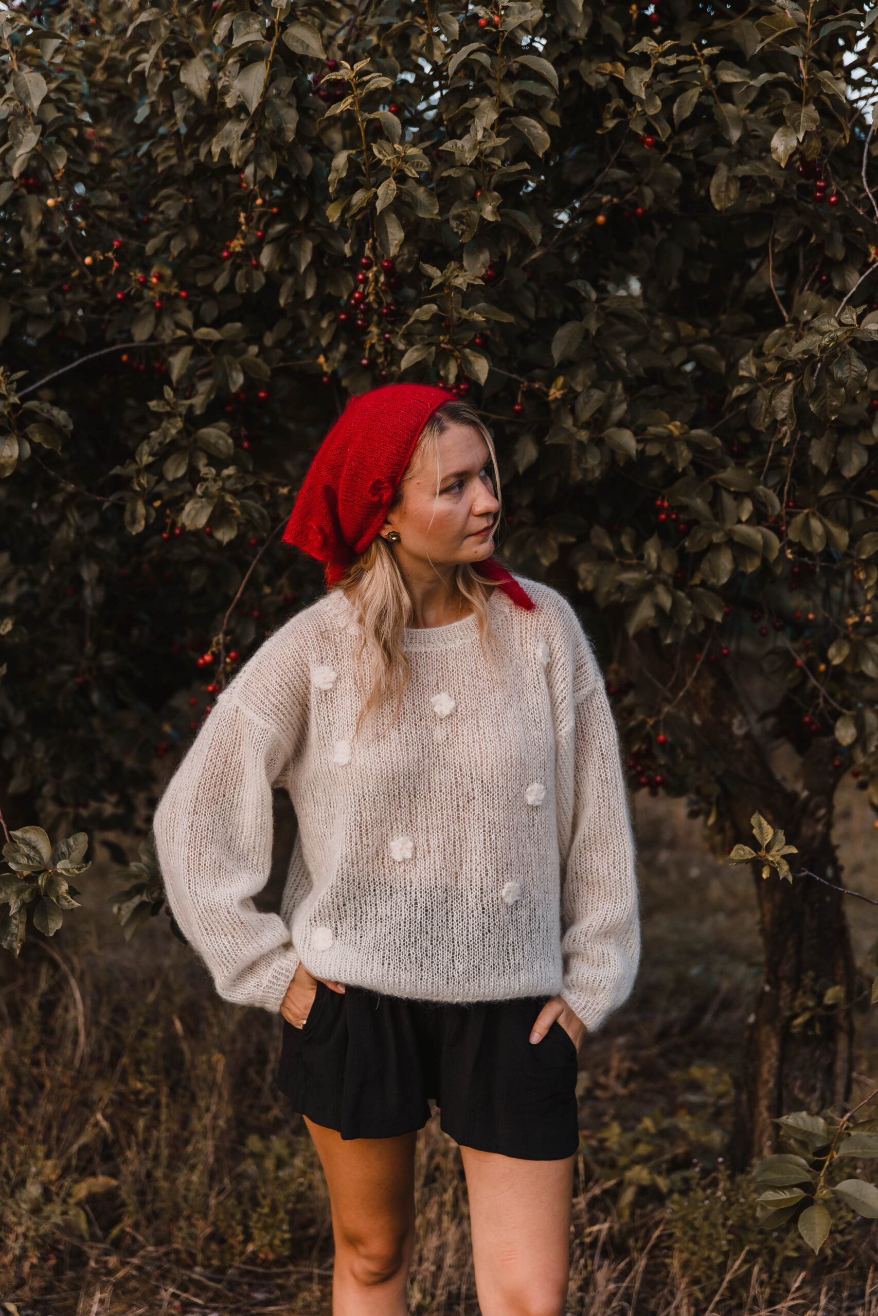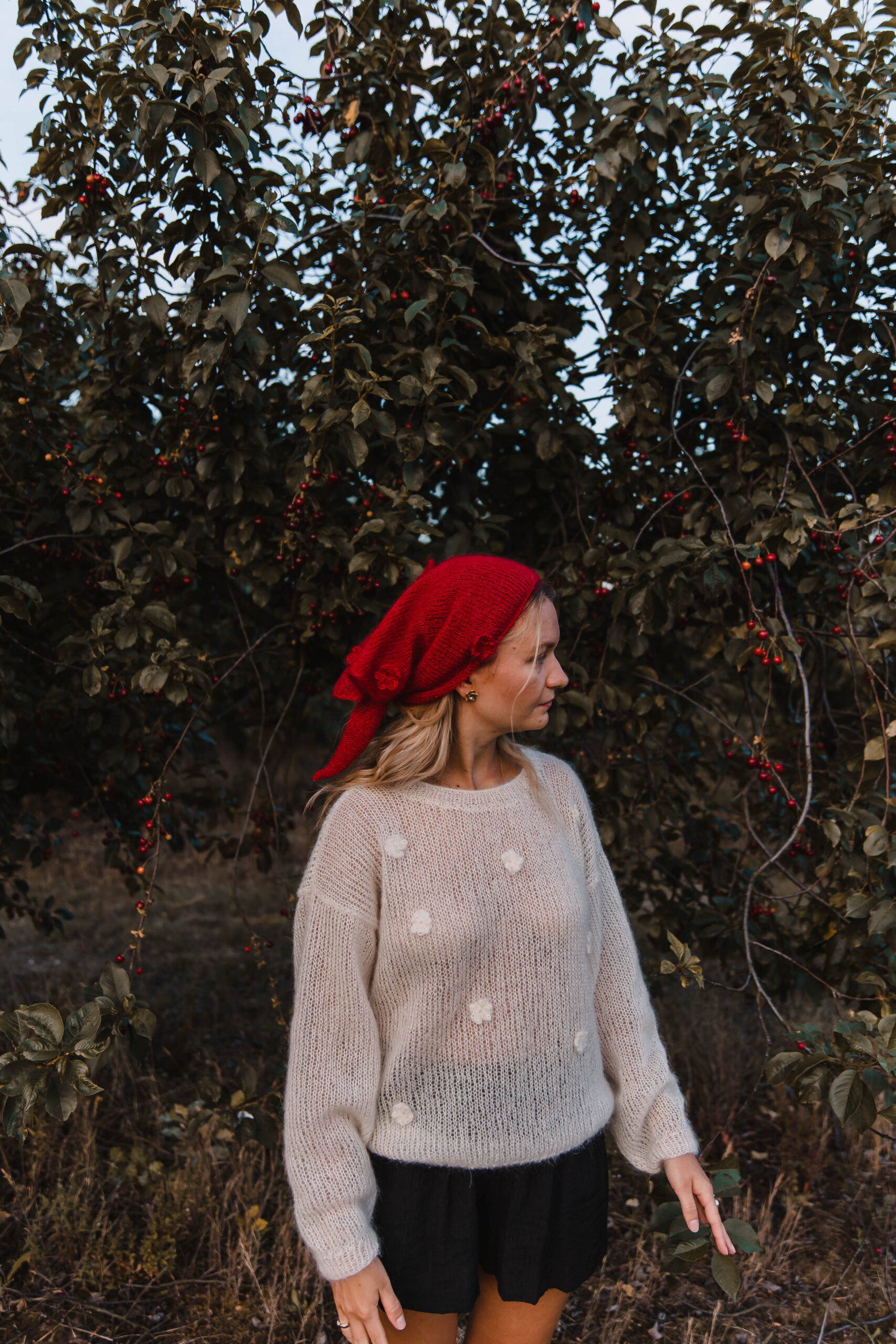 Niby tylko chustka, a jednak można z nią zrobić naprawdę wiele. Ręcznie zrobiona, miękka i ozdobiona szydełkowymi kwiatkami, wygląda świetnie zarówno pod brodą, jak i na szyi, na głowie, a nawet przewiązana w talii. Działa zawsze – niezależnie od humoru, pogody czy planów. Ma w sobie coś z babcinego stylu i coś bardzo dzisiejszego. Po prostu ma to „coś”.