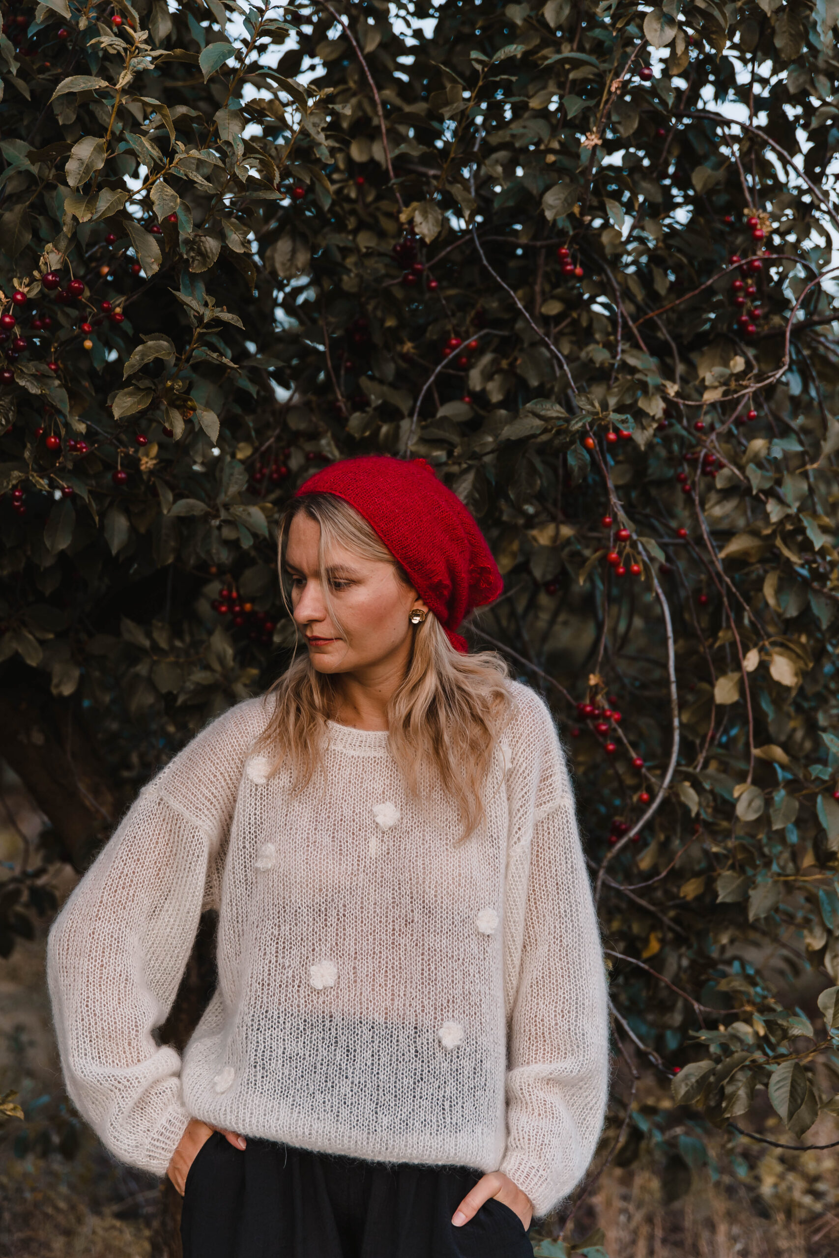 Pielęgnacja: pierz ręcznie w delikatnych płynach, susz na leżąco, nie prasuj. Zaprojektowano i wykonano całkowicie ręcznie w Polsce.