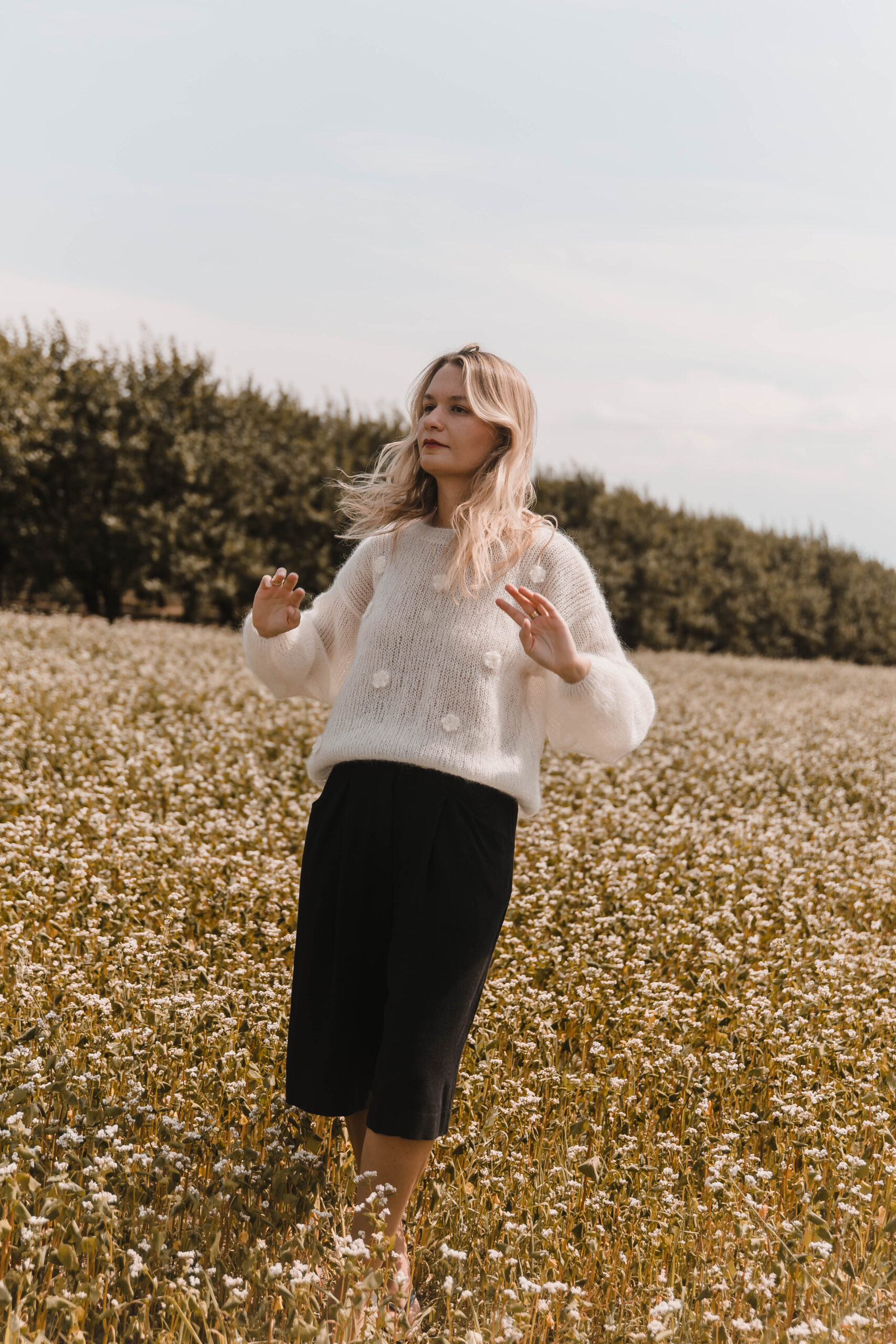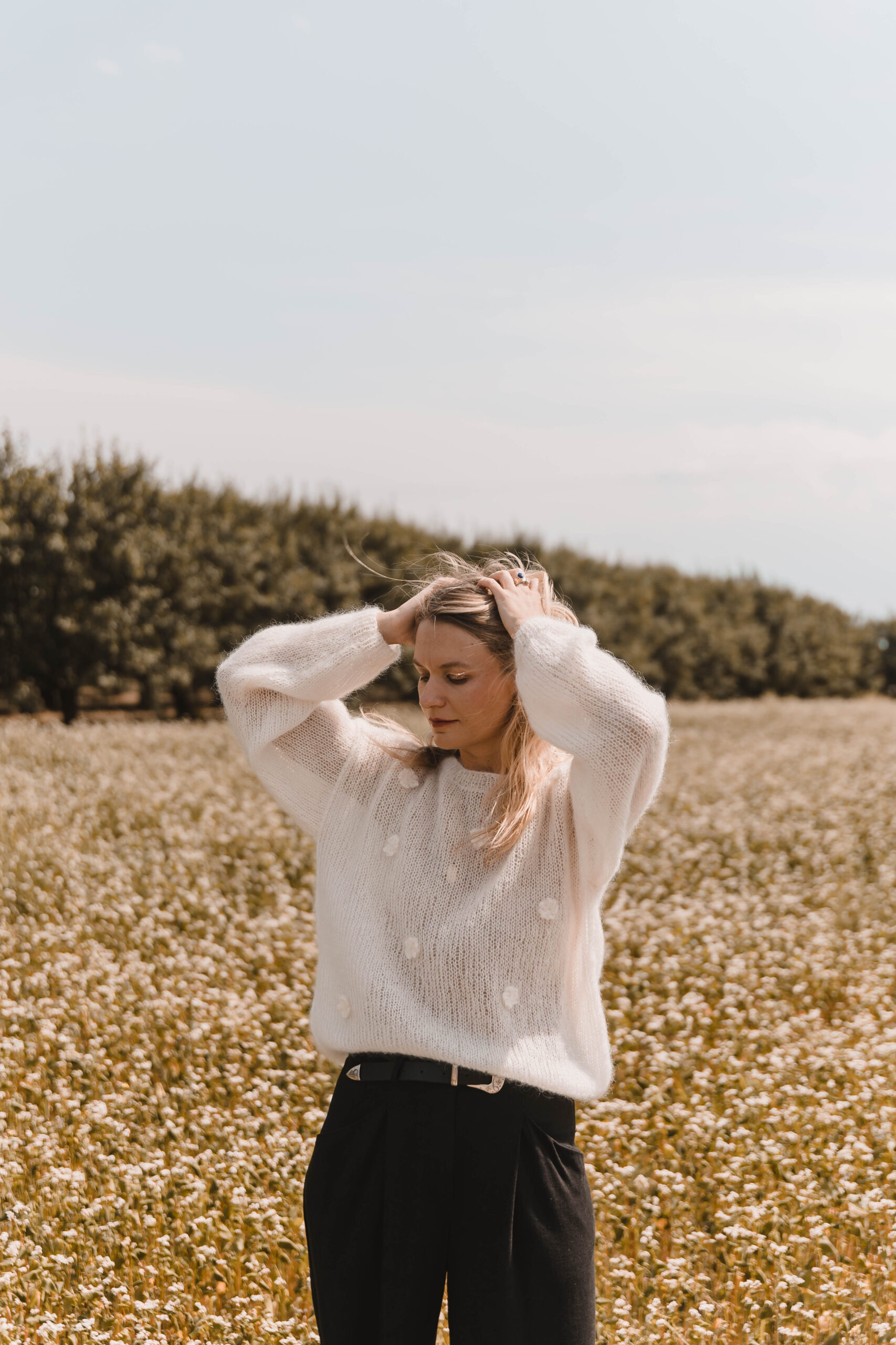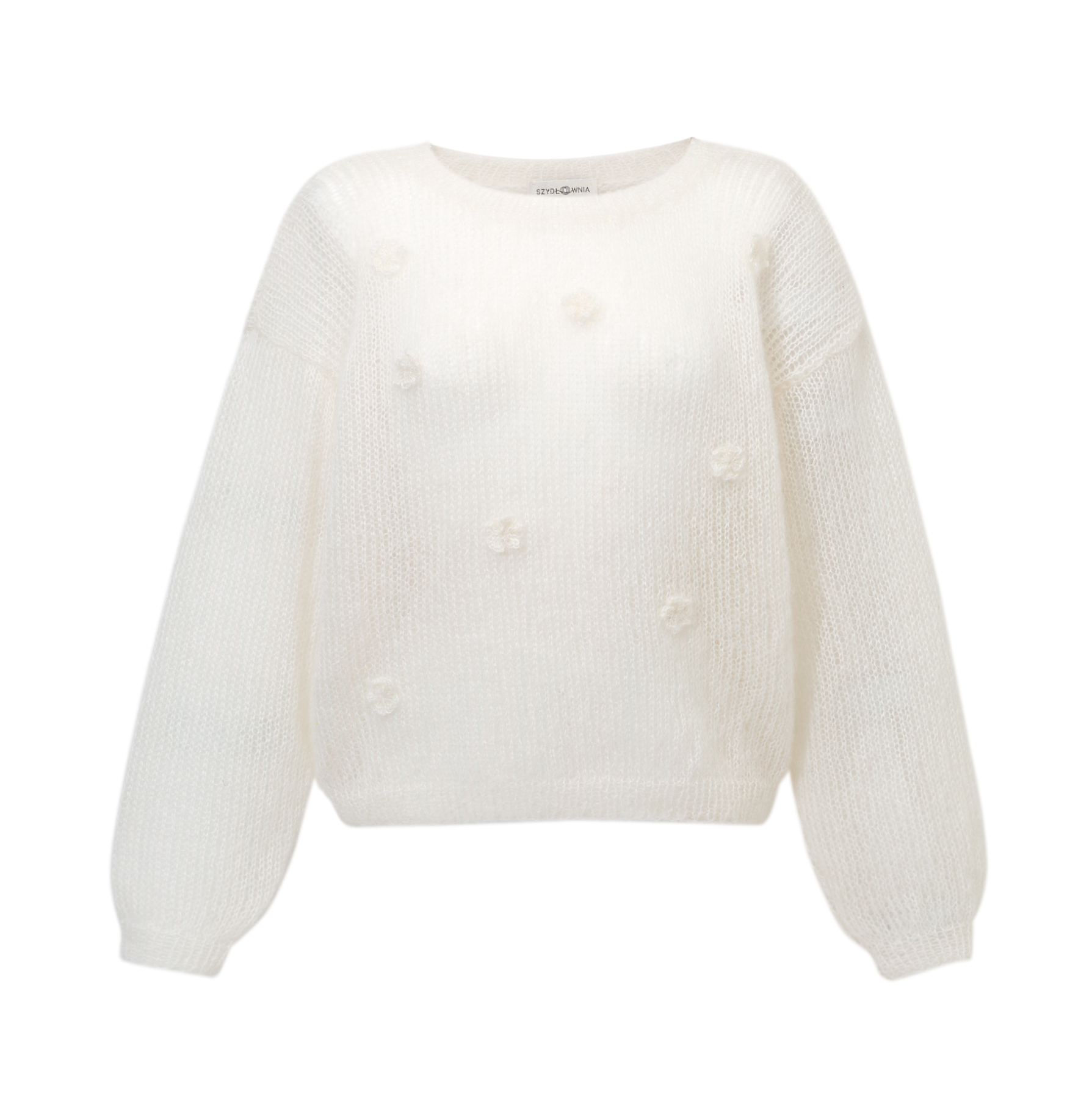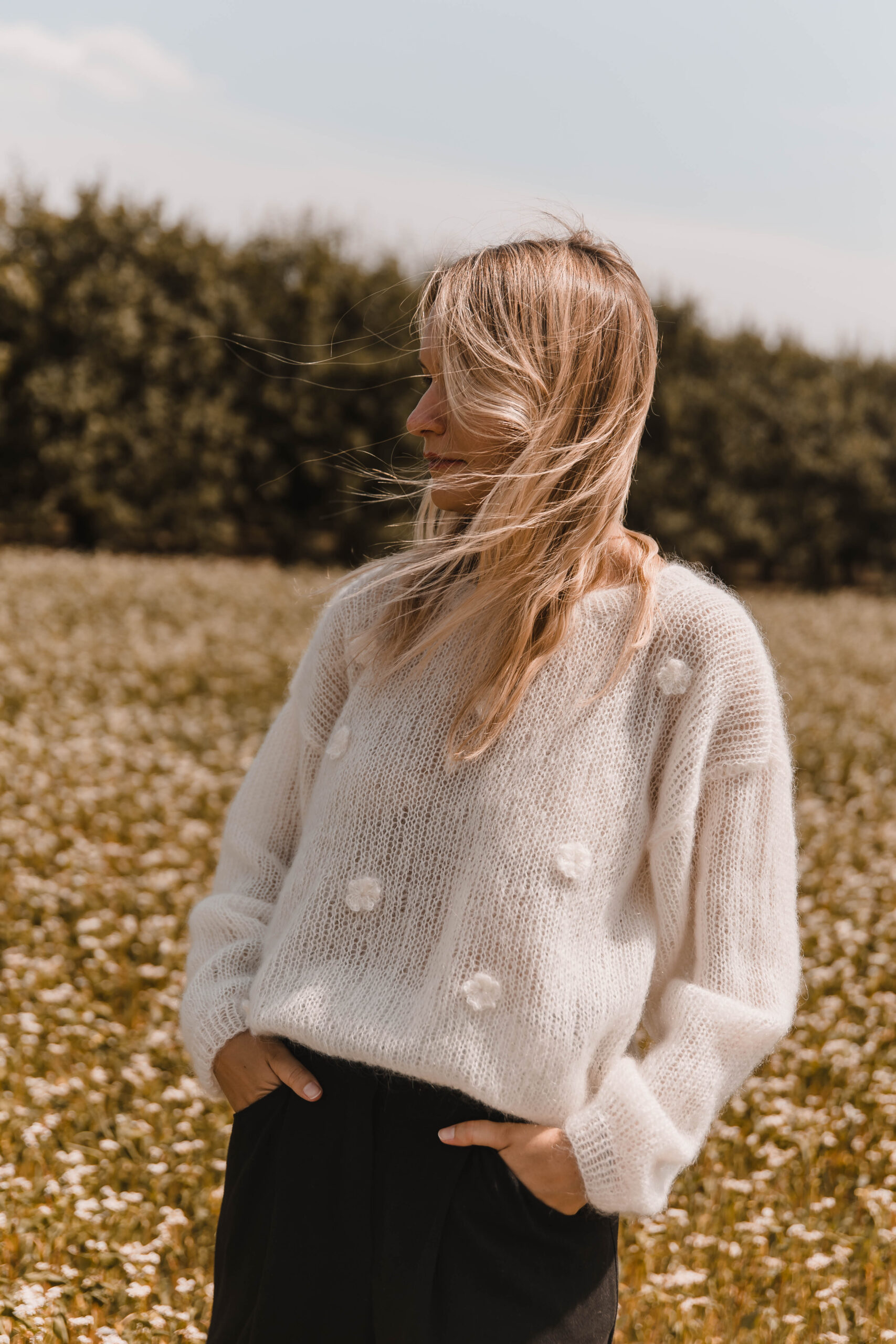 „Cloudette” to sweter jak z marzenia – miękki, puchaty i pełen uroku. Zrobiony na drutach z delikatnej przędzy, otula niczym chmurka w letni poranek. Jego wyjątkowość tkwi w detalach: kwiatki wykonane szydełkiem i ręcznie doszyte do dzianiny przywodzą na myśl czasy, gdy ubrania powstawały z sercem i cierpliwością. To połączenie rzemiosła i subtelnej estetyki w najczystszej postaci. „Cloudette” idealnie łączy dziewczęcość z autentycznym stylem handmade – noś ją do dżinsów, spódnicy w kwiaty albo tak, jak lubisz najbardziej. Bo ten sweter nie goni za trendami – on tworzy swój własny klimat.