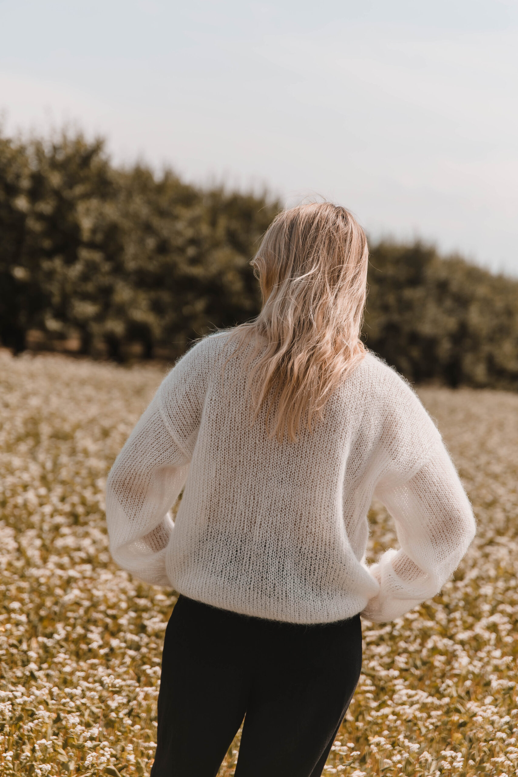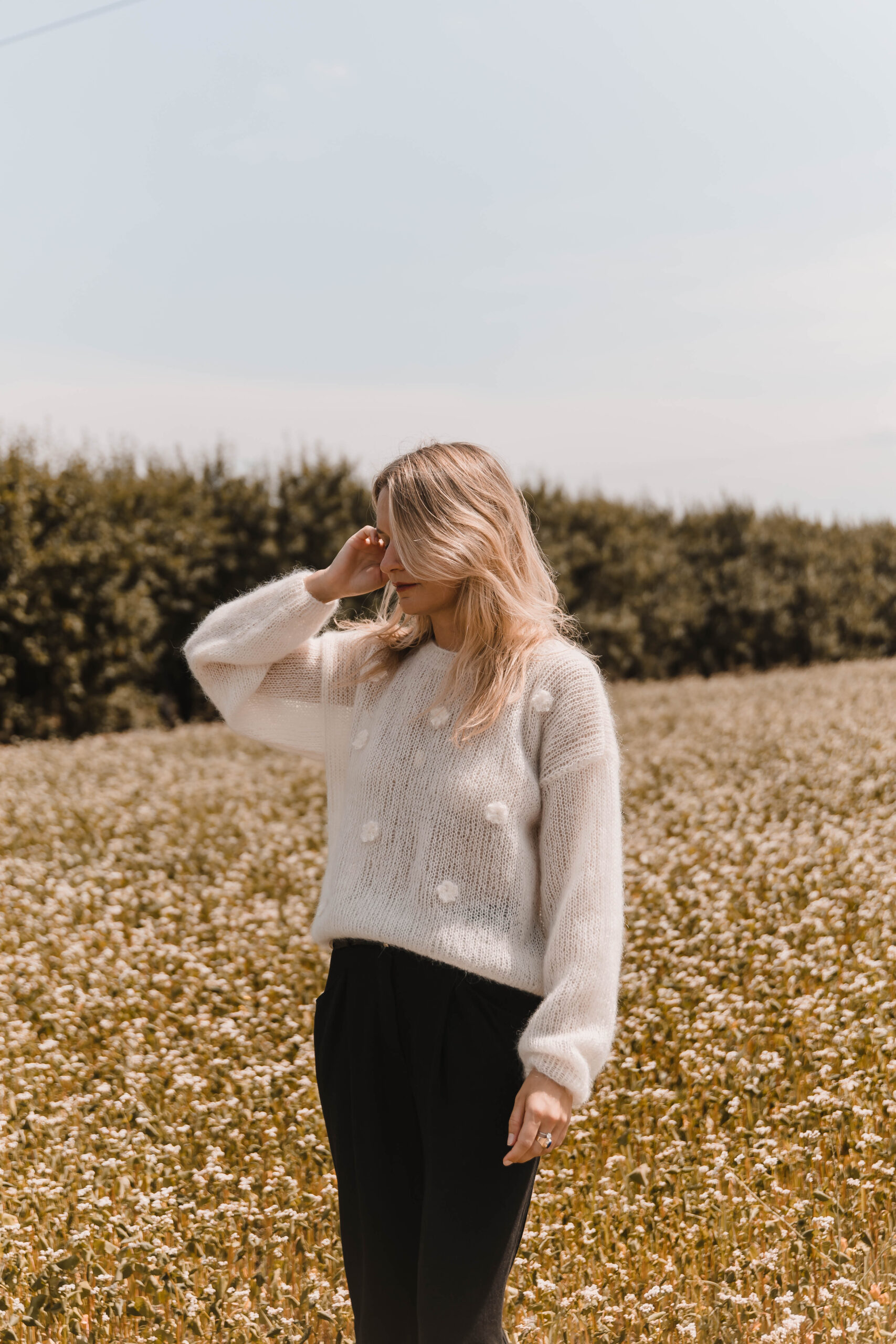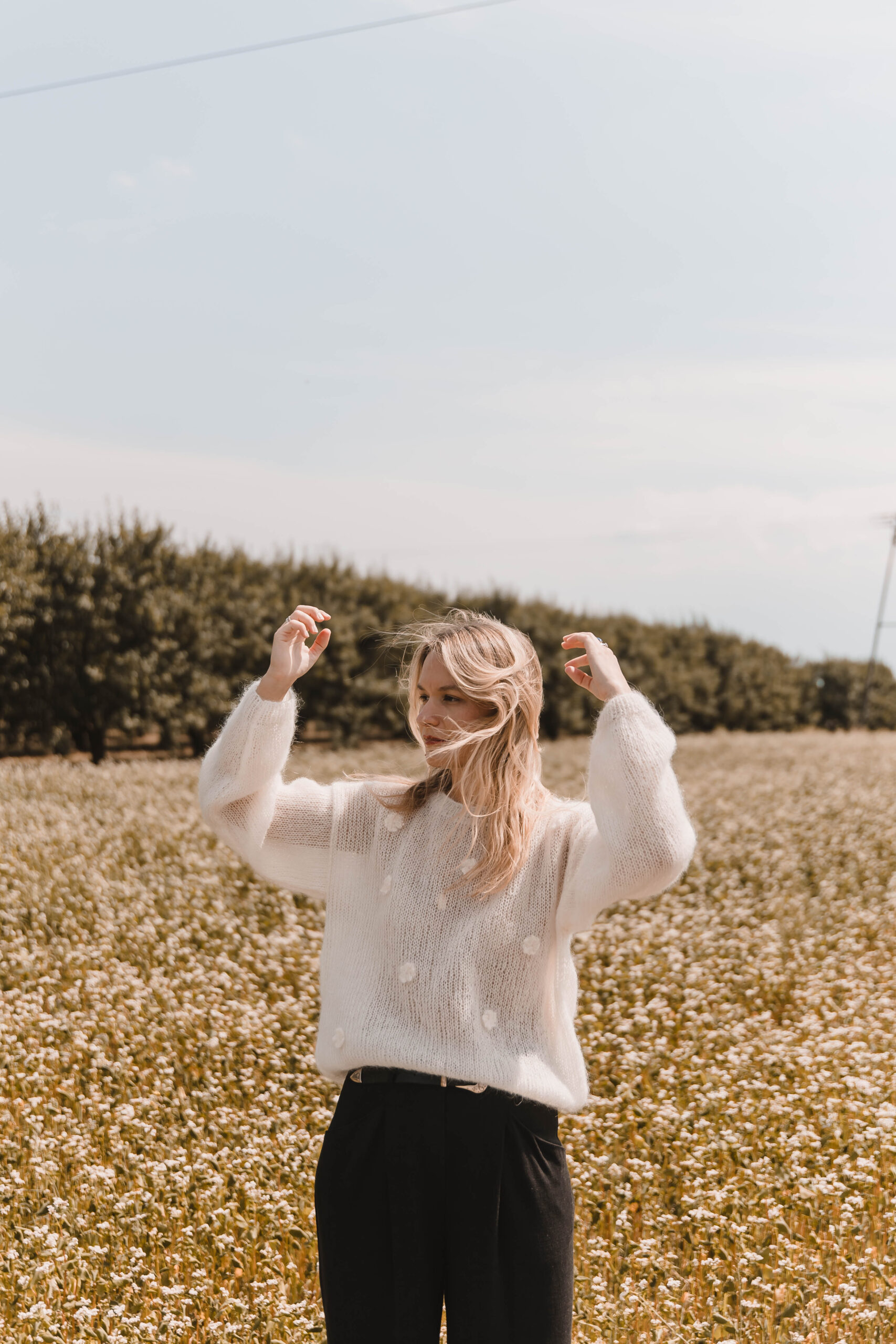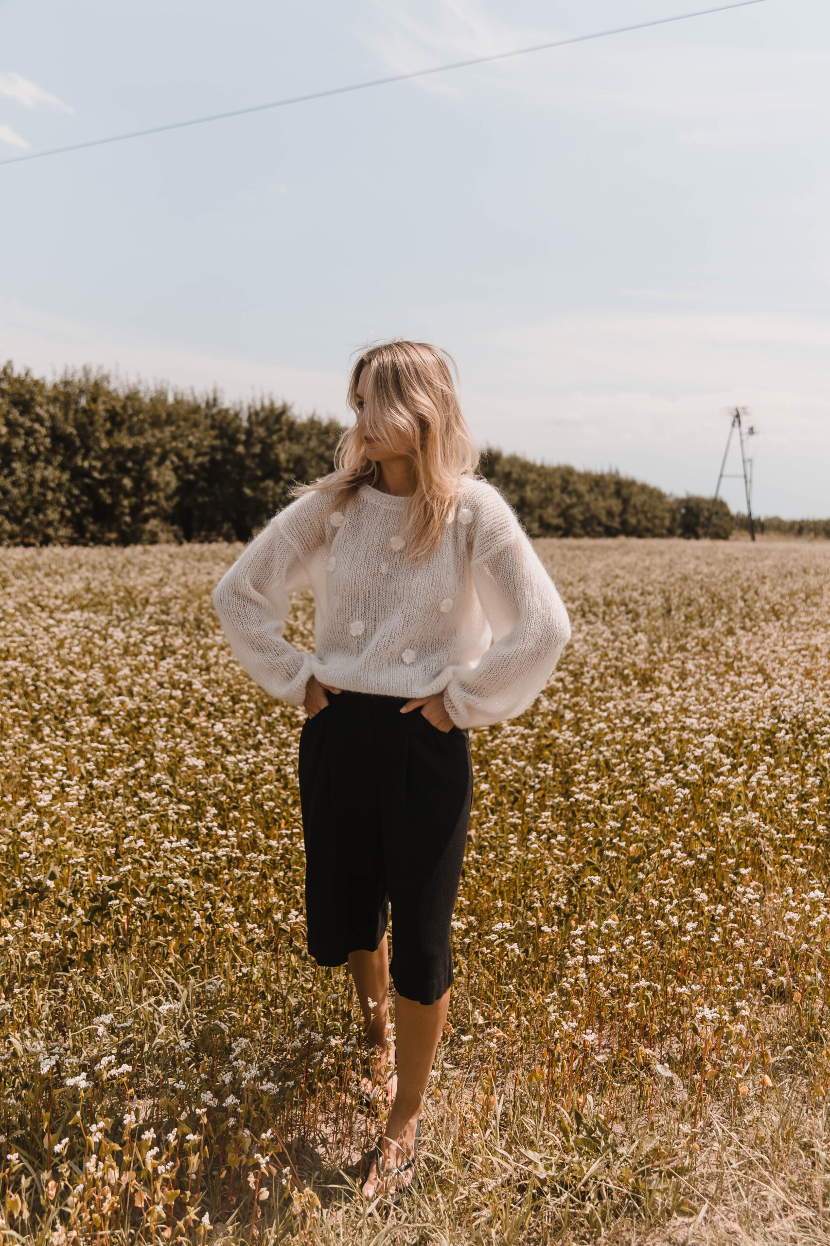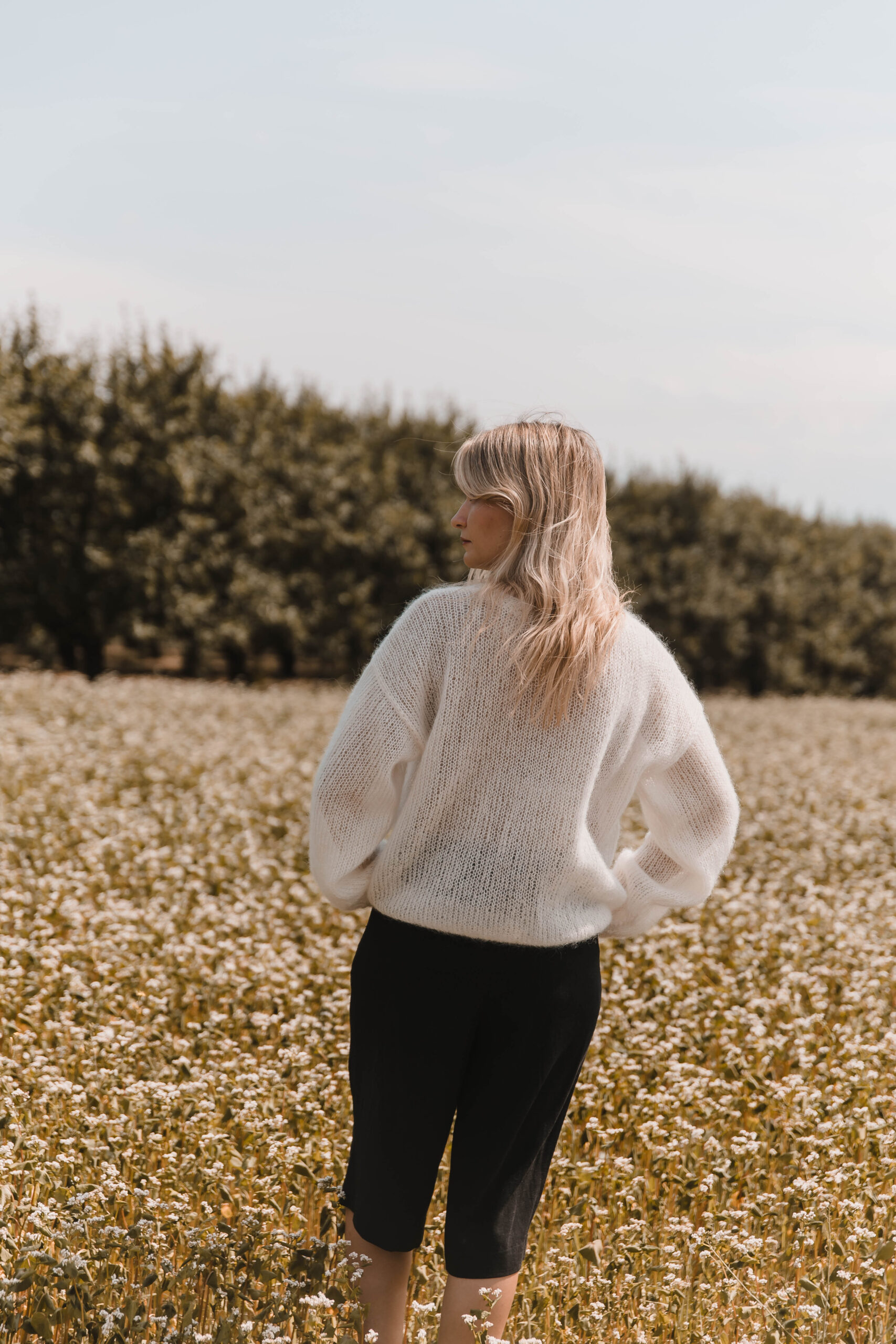 „Cloudette” to sweter jak z marzenia – miękki, puchaty i pełen uroku. Zrobiony na drutach z delikatnej przędzy, otula niczym chmurka w letni poranek. Jego wyjątkowość tkwi w detalach: kwiatki wykonane szydełkiem i ręcznie doszyte do dzianiny przywodzą na myśl czasy, gdy ubrania powstawały z sercem i cierpliwością. To połączenie rzemiosła i subtelnej estetyki w najczystszej postaci. „Cloudette” idealnie łączy dziewczęcość z autentycznym stylem handmade – noś ją do dżinsów, spódnicy w kwiaty albo tak, jak lubisz najbardziej. Bo ten sweter nie goni za trendami – on tworzy swój własny klimat.