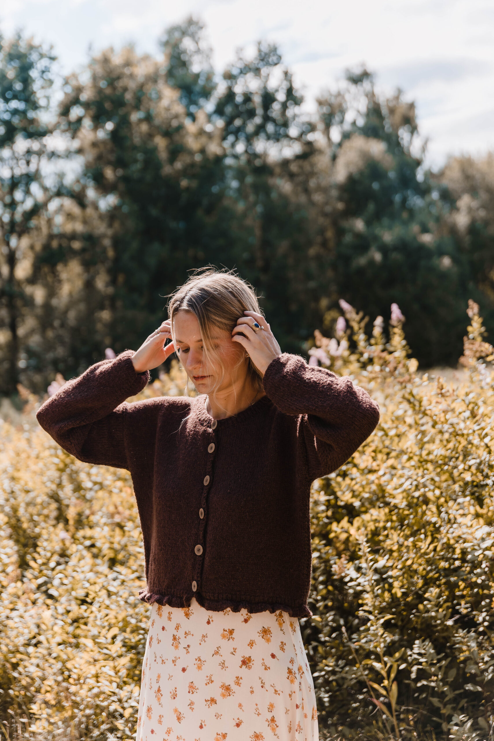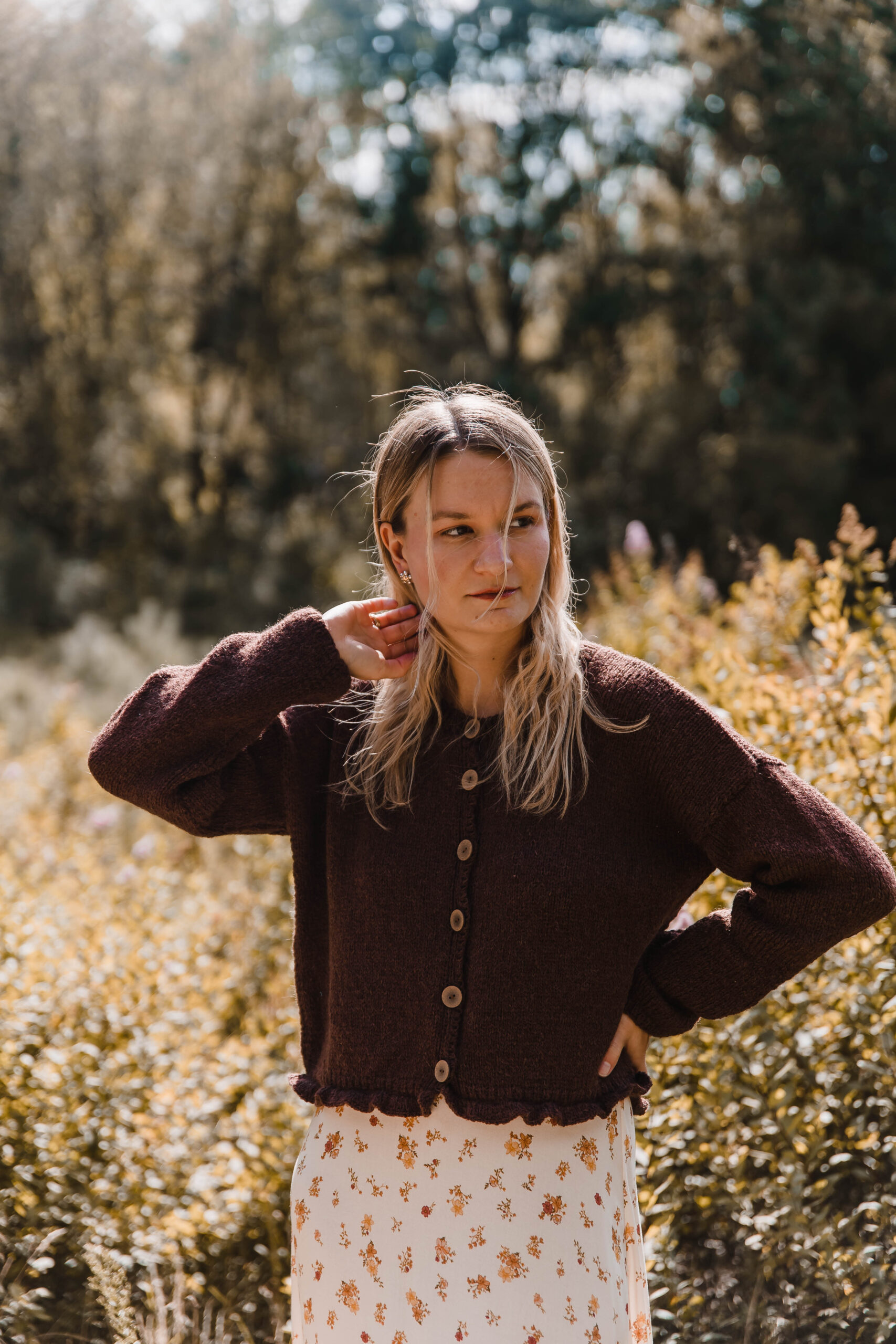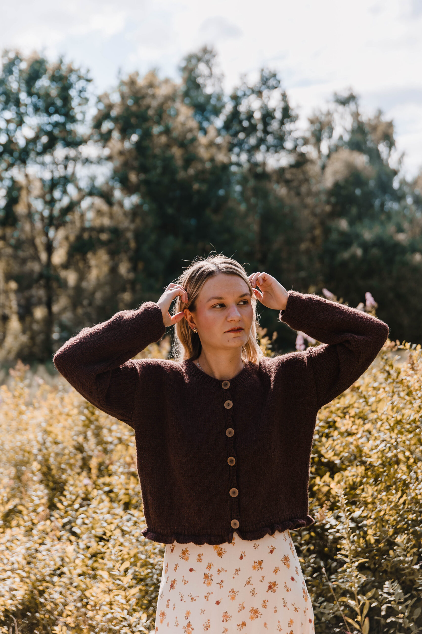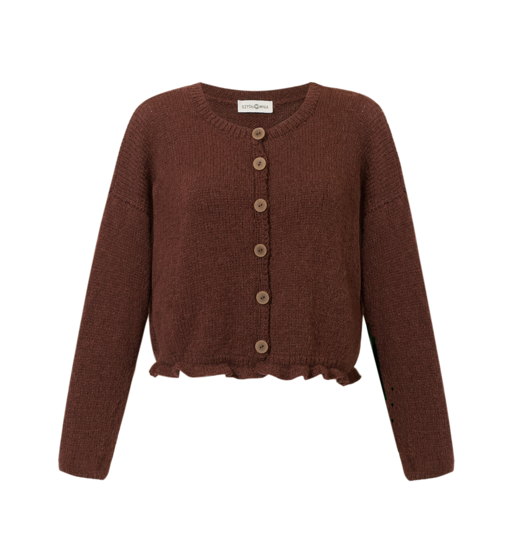 Krótka forma, miękka faktura i detal, który robi różnicę – delikatna falbanka na dole nadaje temu swetrowi lekko dziewczęcego charakteru. Zapinany na rząd klasycznych guzików, nosi się równie dobrze rozpięty, jak i w wersji „solo” zamiast bluzki. Jego ciepły, kakaowy odcień sprawia, że pasuje niemal do wszystkiego – od zwiewnej sukienki po jeansy i cięższe buty. To sweter, który wygląda niepozornie, ale w praktyce ratuje każdą stylizację.