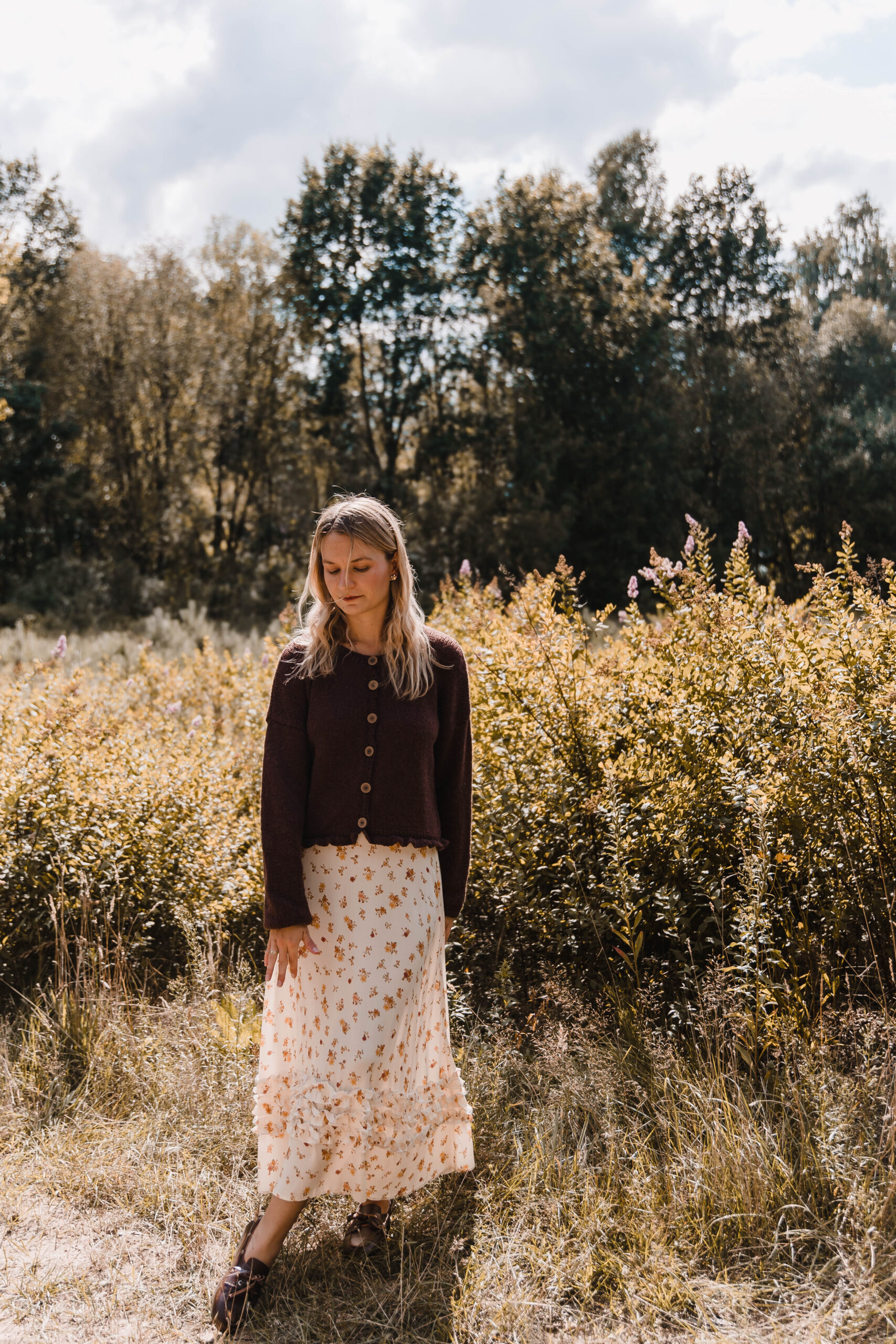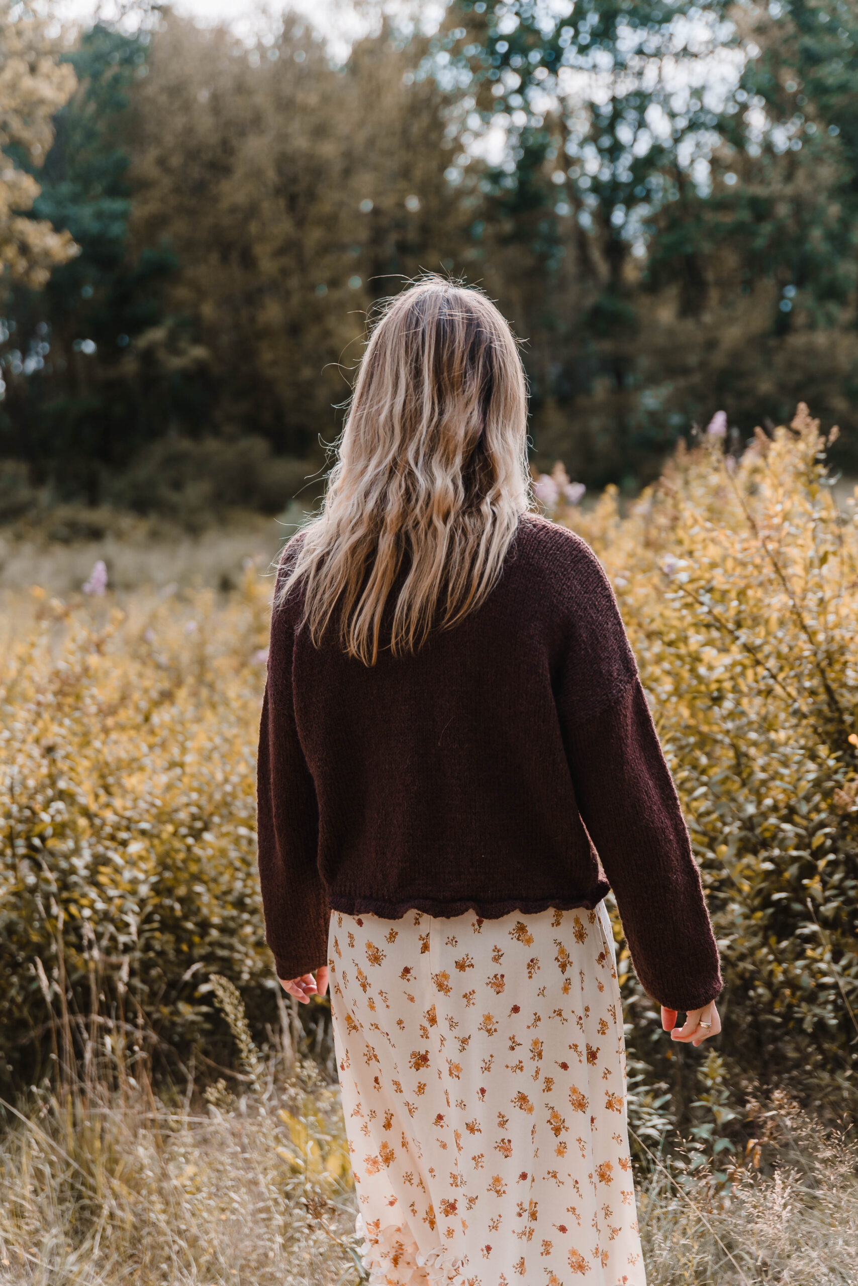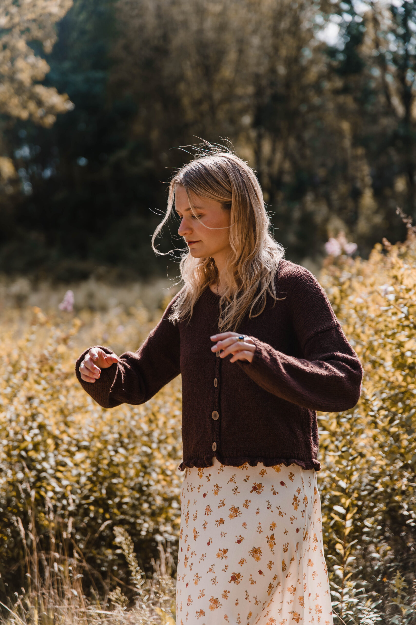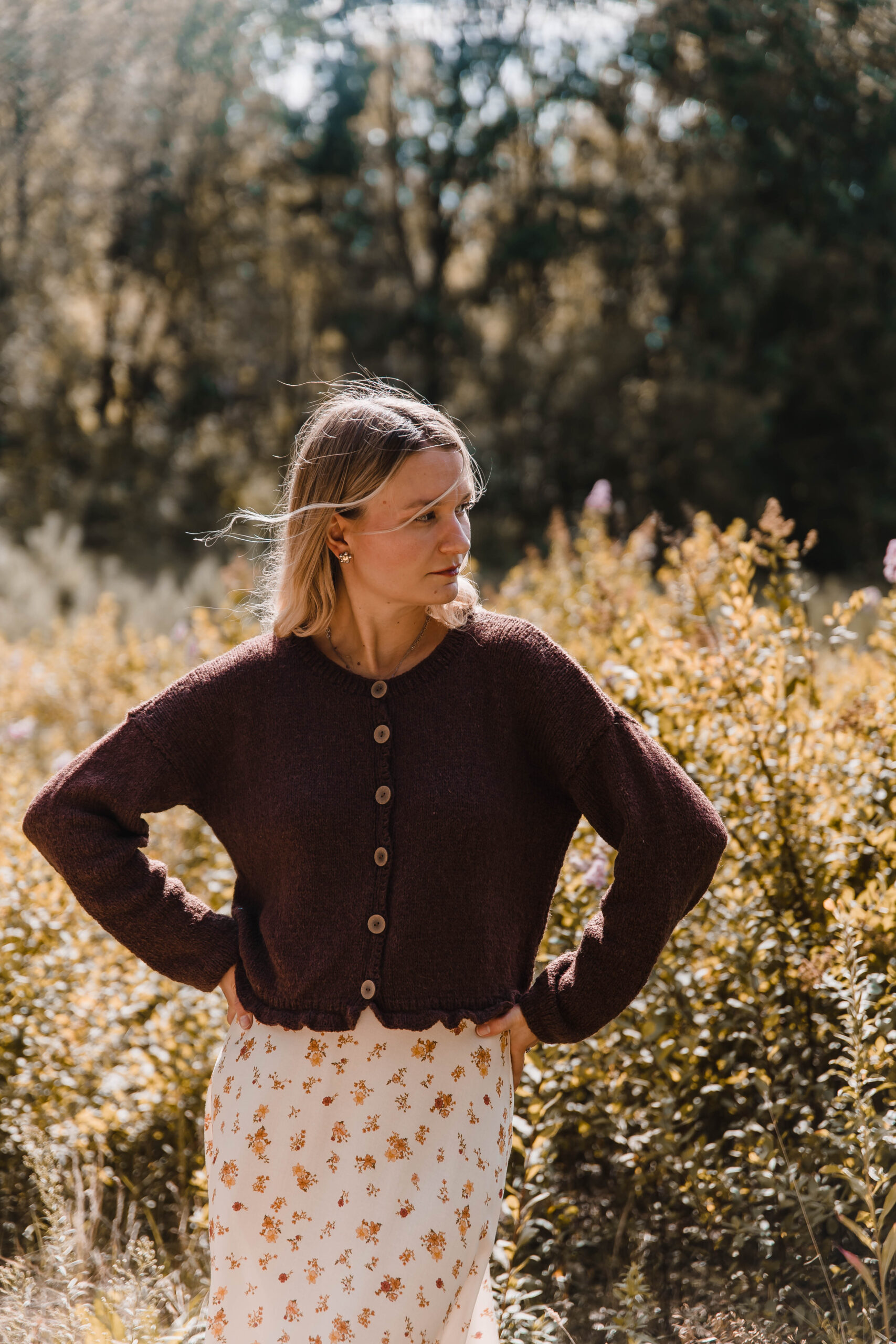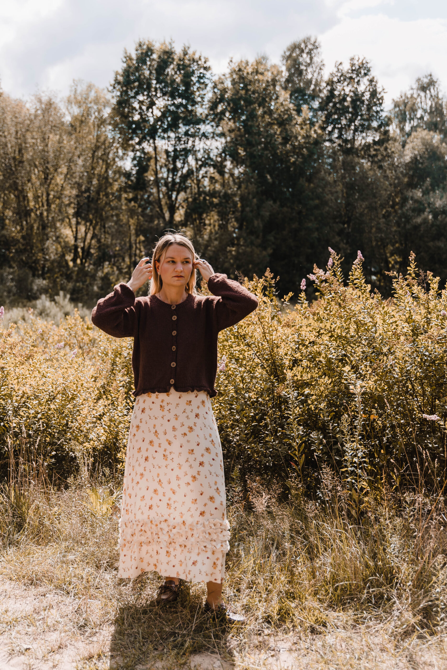 Krótka forma, miękka faktura i detal, który robi różnicę – delikatna falbanka na dole nadaje temu swetrowi lekko dziewczęcego charakteru. Zapinany na rząd klasycznych guzików, nosi się równie dobrze rozpięty, jak i w wersji „solo” zamiast bluzki. Jego ciepły, kakaowy odcień sprawia, że pasuje niemal do wszystkiego – od zwiewnej sukienki po jeansy i cięższe buty. To sweter, który wygląda niepozornie, ale w praktyce ratuje każdą stylizację.