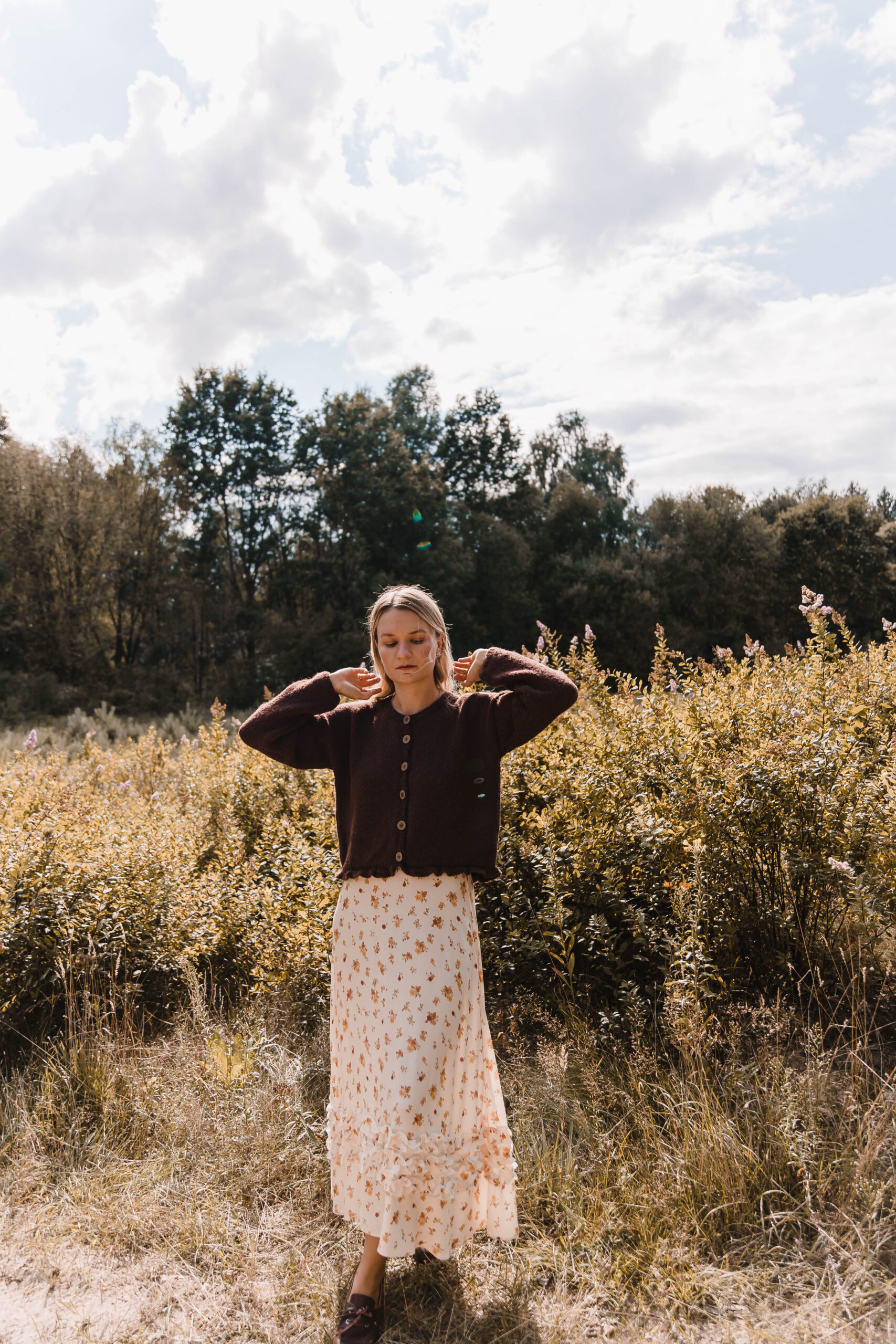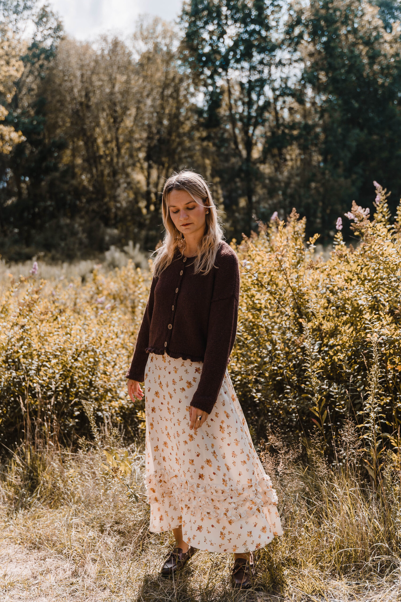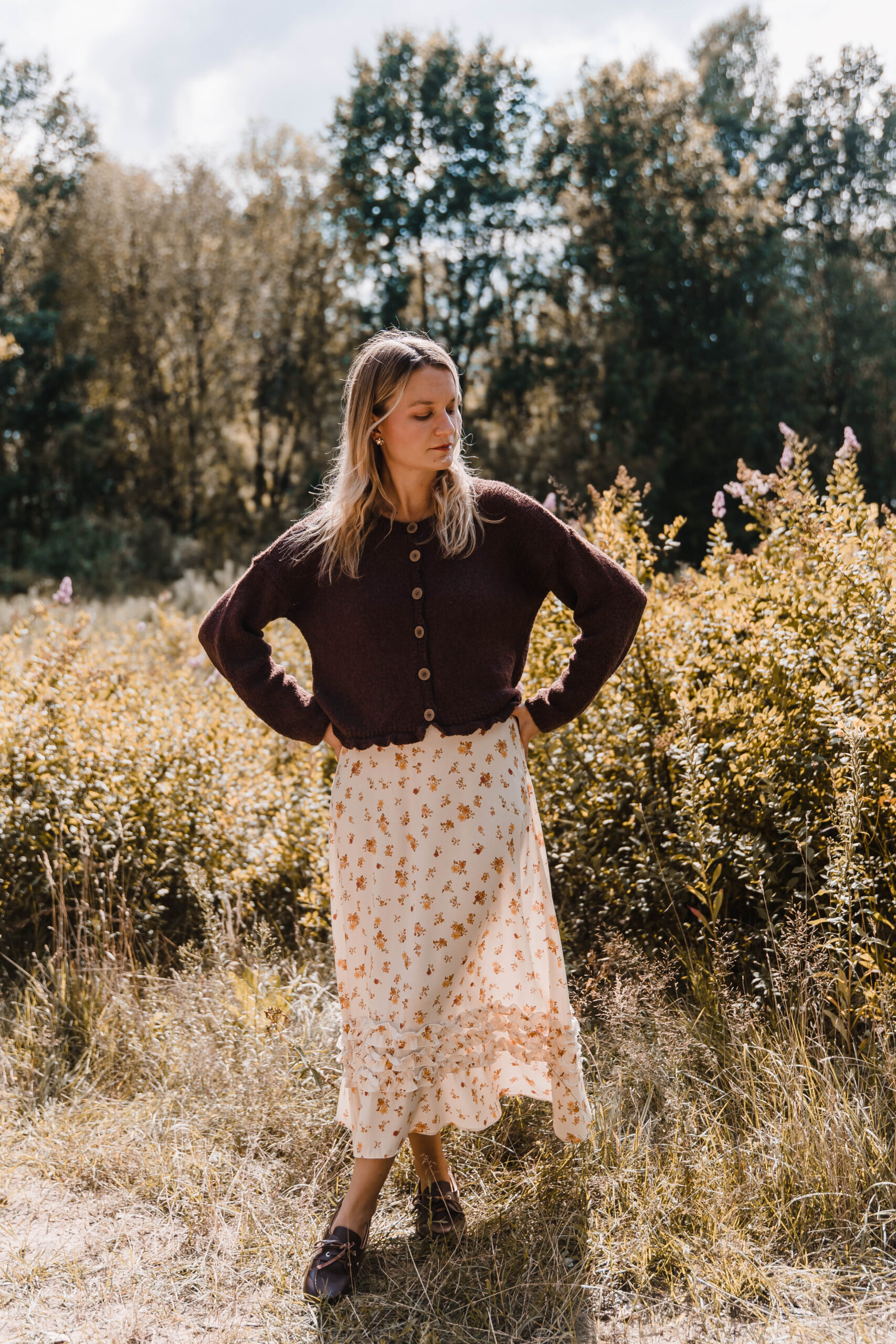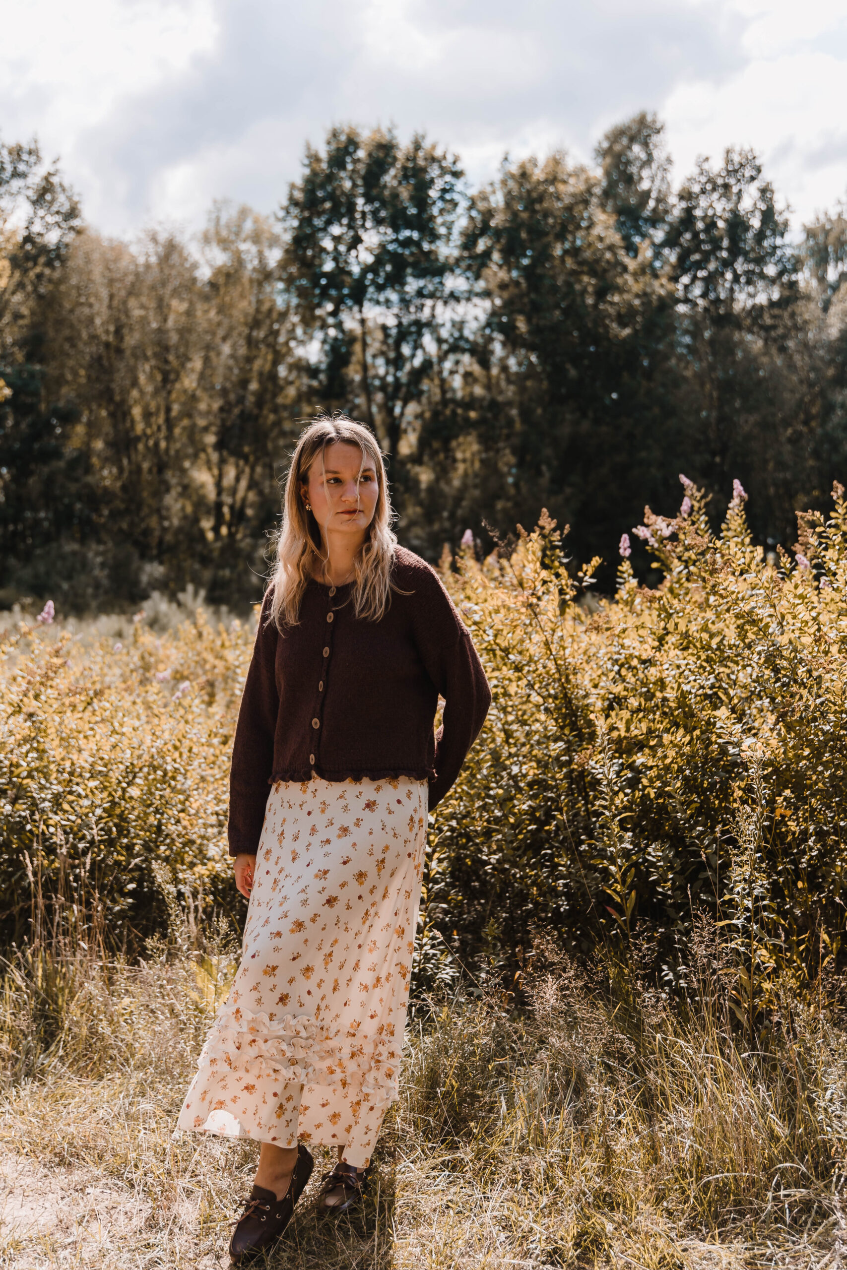 Krótka forma, miękka faktura i detal, który robi różnicę – delikatna falbanka na dole nadaje temu swetrowi lekko dziewczęcego charakteru. Zapinany na rząd klasycznych guzików, nosi się równie dobrze rozpięty, jak i w wersji „solo” zamiast bluzki. Jego ciepły, kakaowy odcień sprawia, że pasuje niemal do wszystkiego – od zwiewnej sukienki po jeansy i cięższe buty. To sweter, który wygląda niepozornie, ale w praktyce ratuje każdą stylizację.
