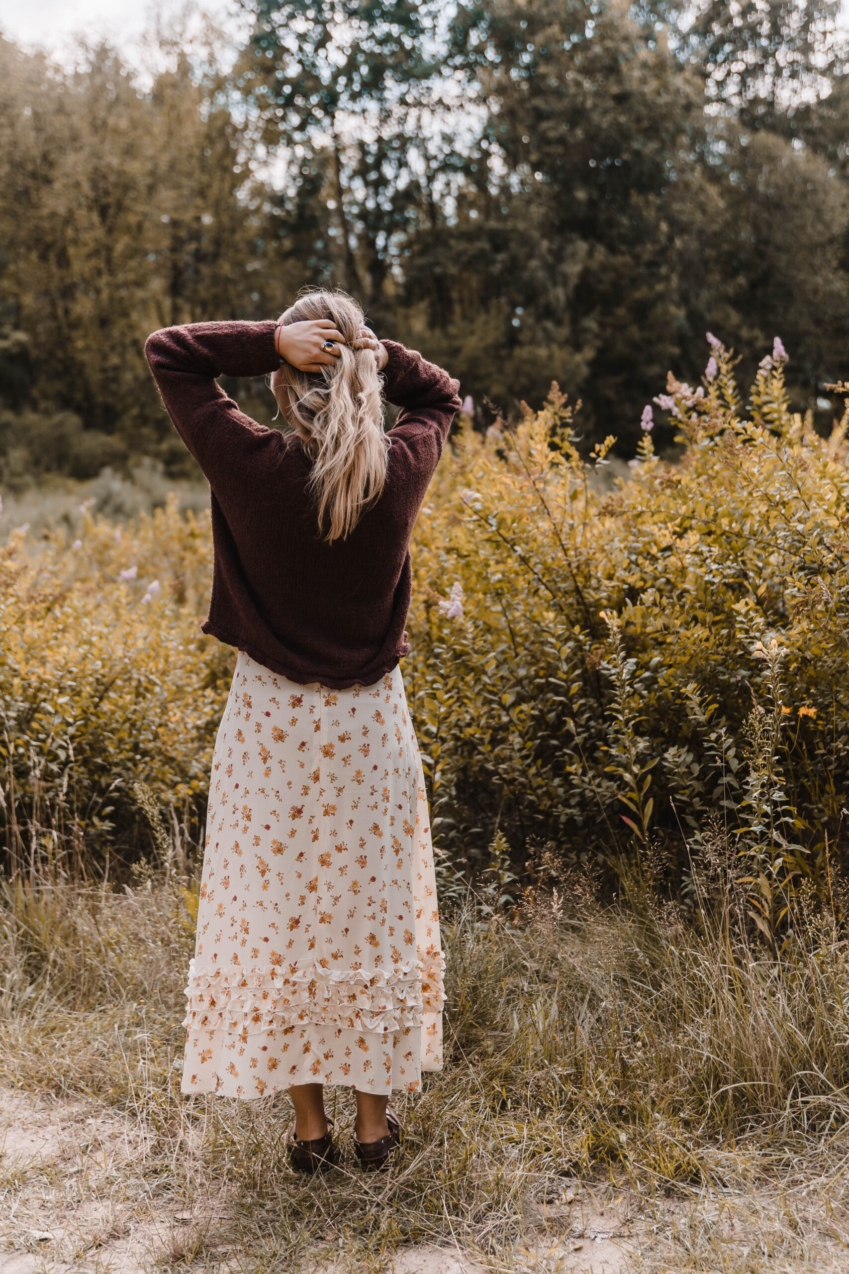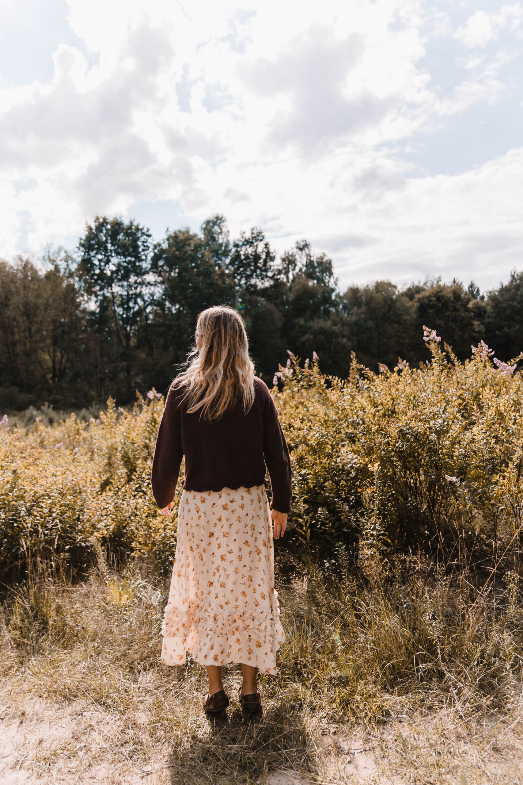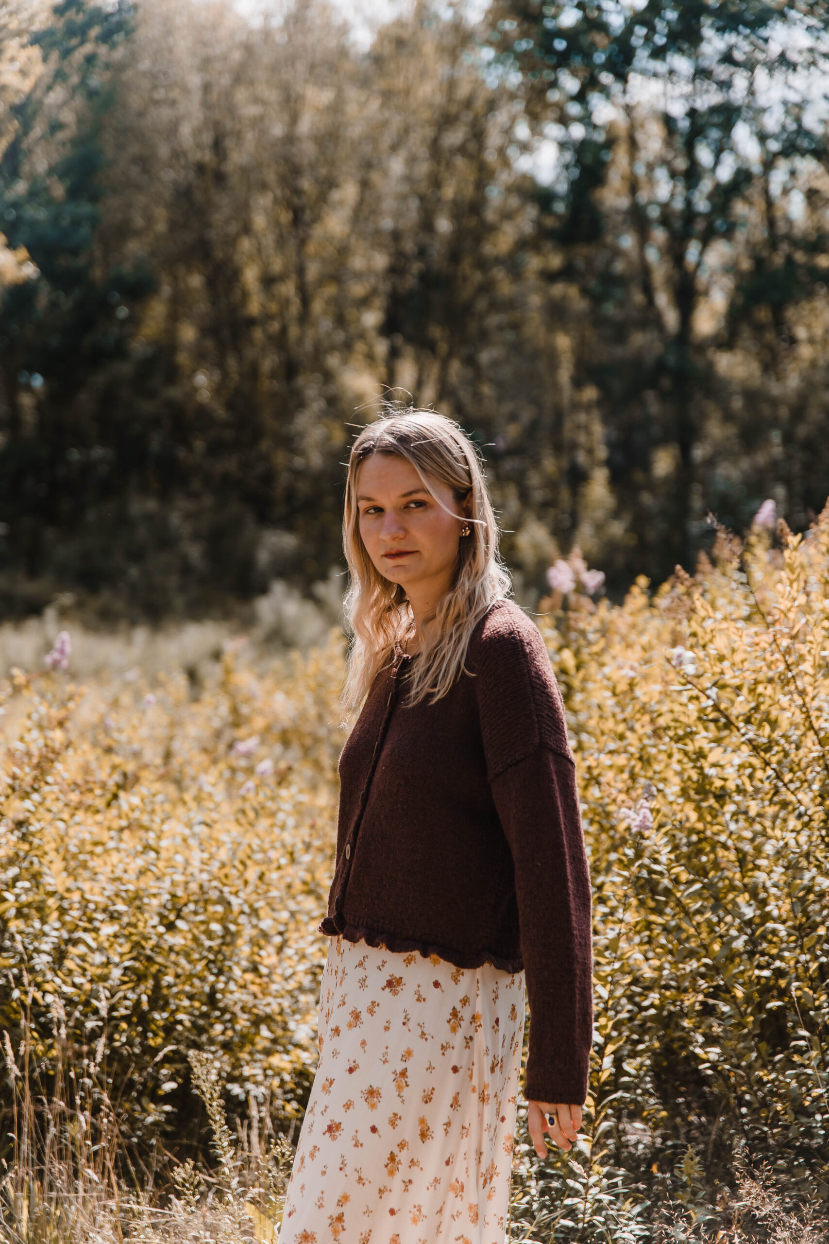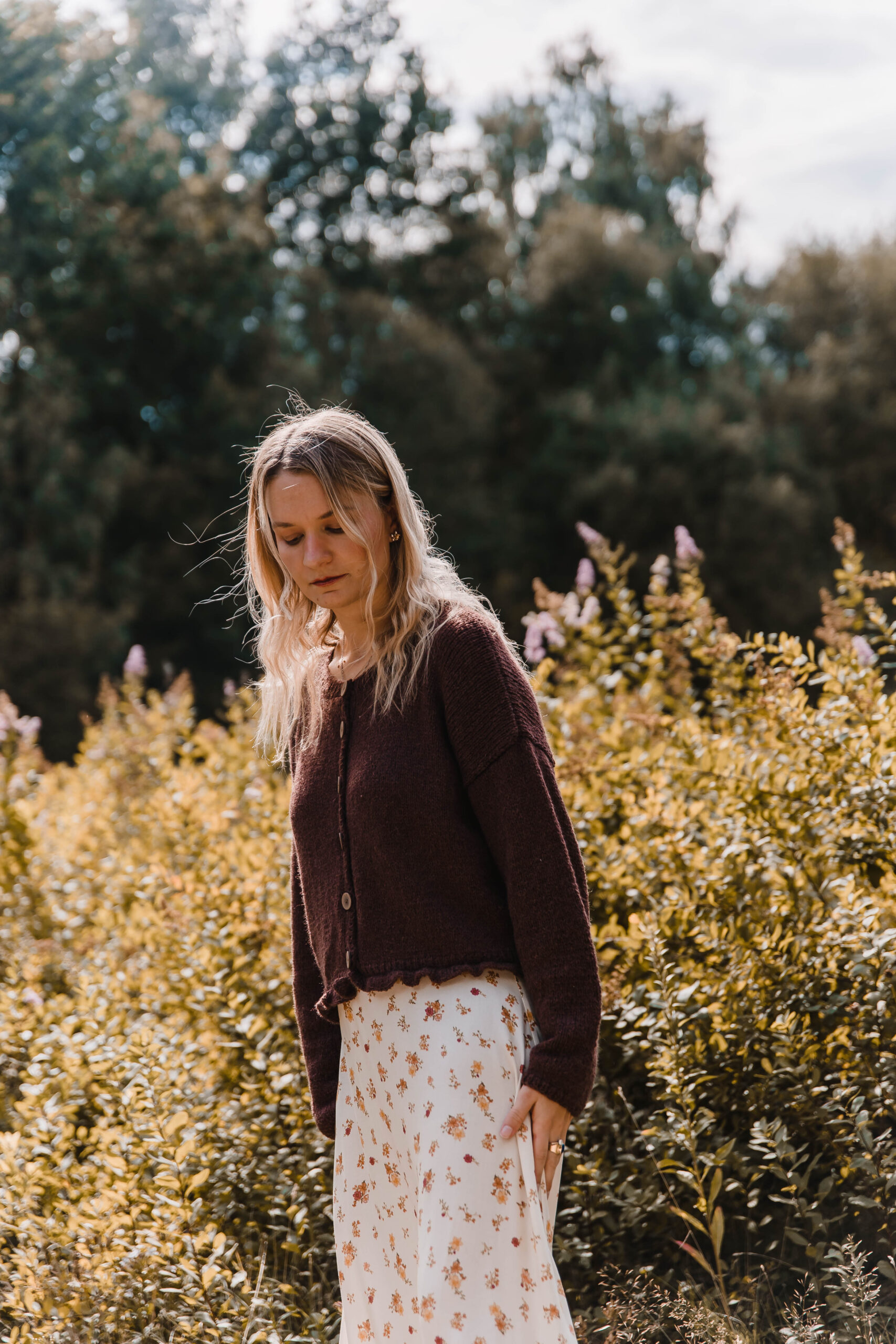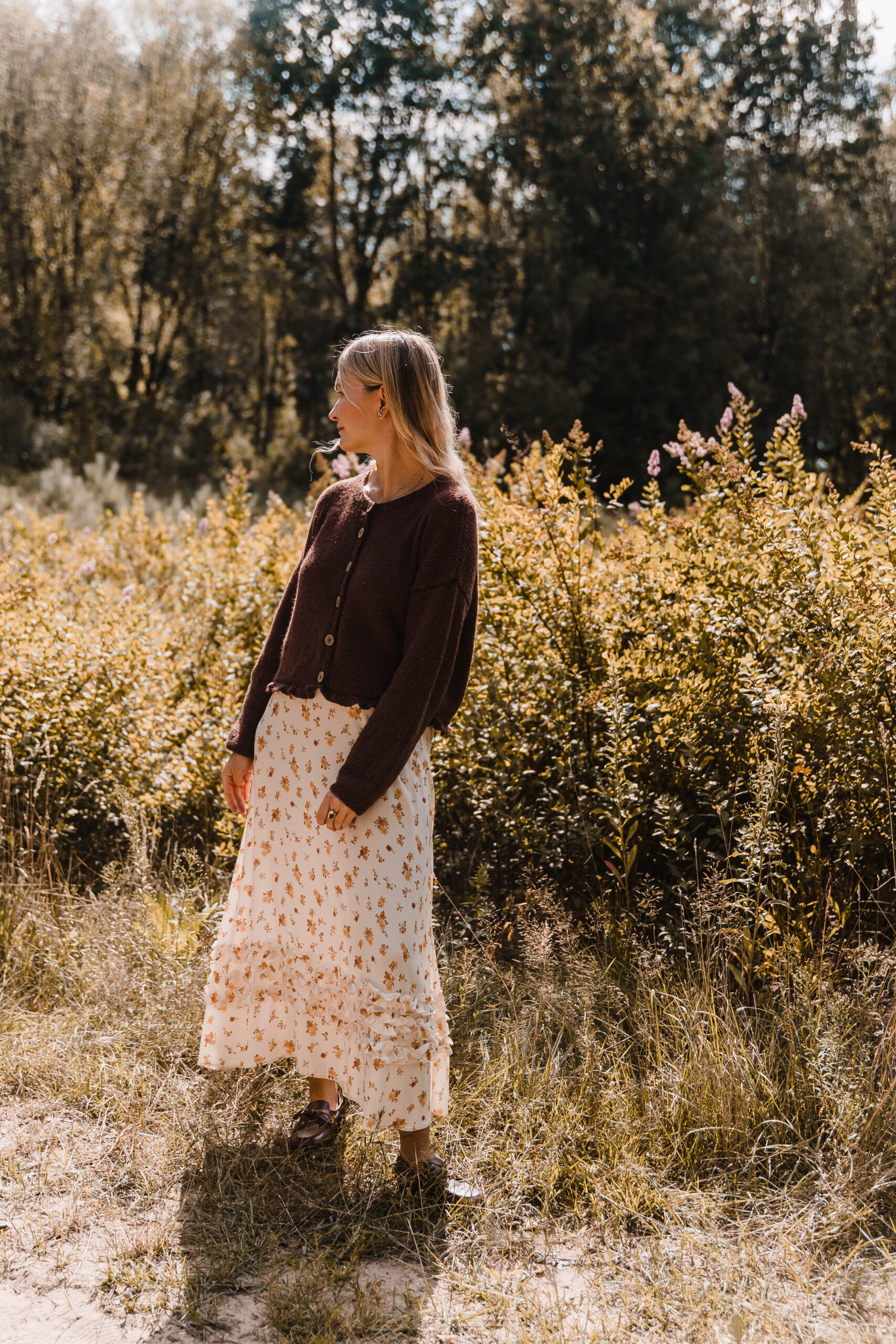 Krótka forma, miękka faktura i detal, który robi różnicę – delikatna falbanka na dole nadaje temu swetrowi lekko dziewczęcego charakteru. Zapinany na rząd klasycznych guzików, nosi się równie dobrze rozpięty, jak i w wersji „solo” zamiast bluzki. Jego ciepły, kakaowy odcień sprawia, że pasuje niemal do wszystkiego – od zwiewnej sukienki po jeansy i cięższe buty. To sweter, który wygląda niepozornie, ale w praktyce ratuje każdą stylizację.