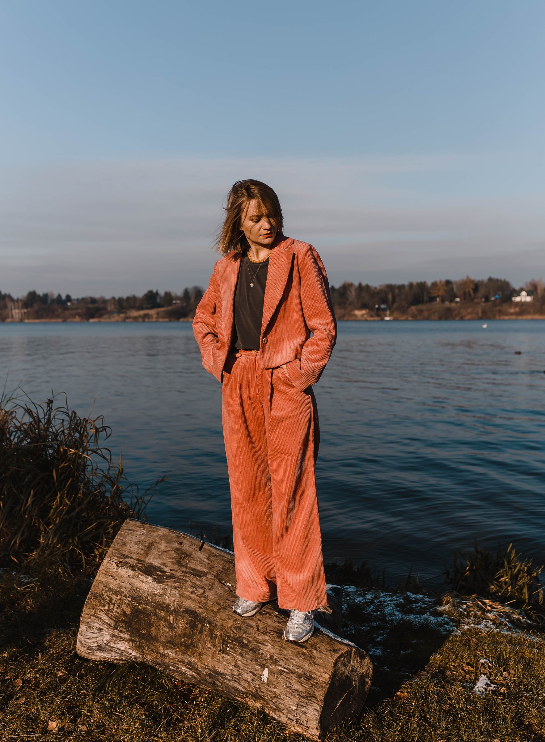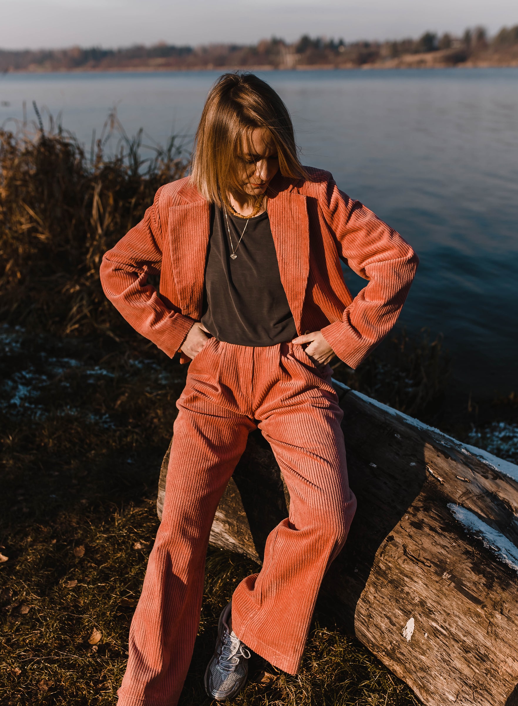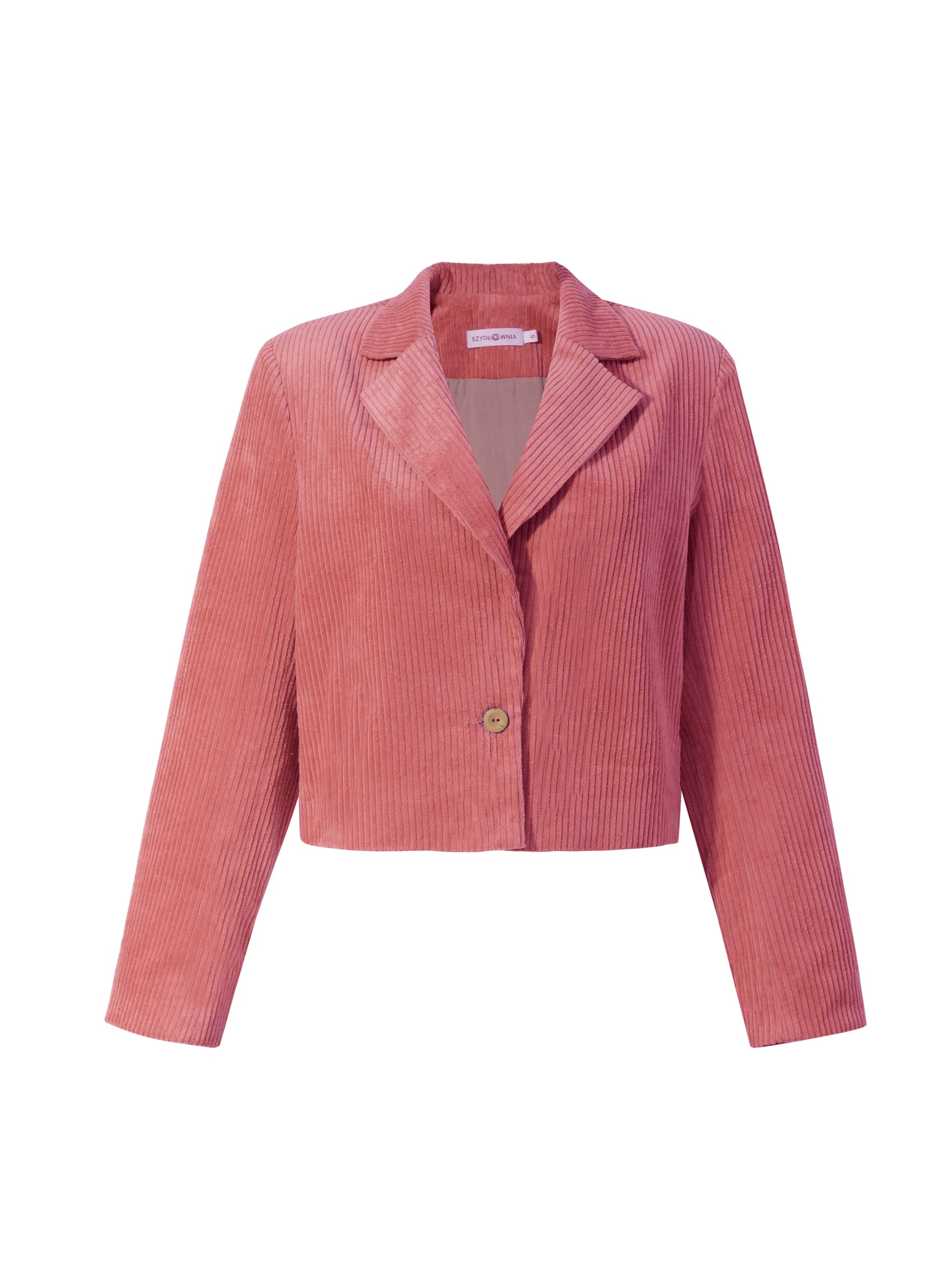 Sztruksowa taliowana marynatka z poduszkami na ramionach, zapinana na jeden guzik, uszyta na podszewce wiskozowej. Do kompletu ze spodniami (do kupienia osobno). Kolor: stary róż.