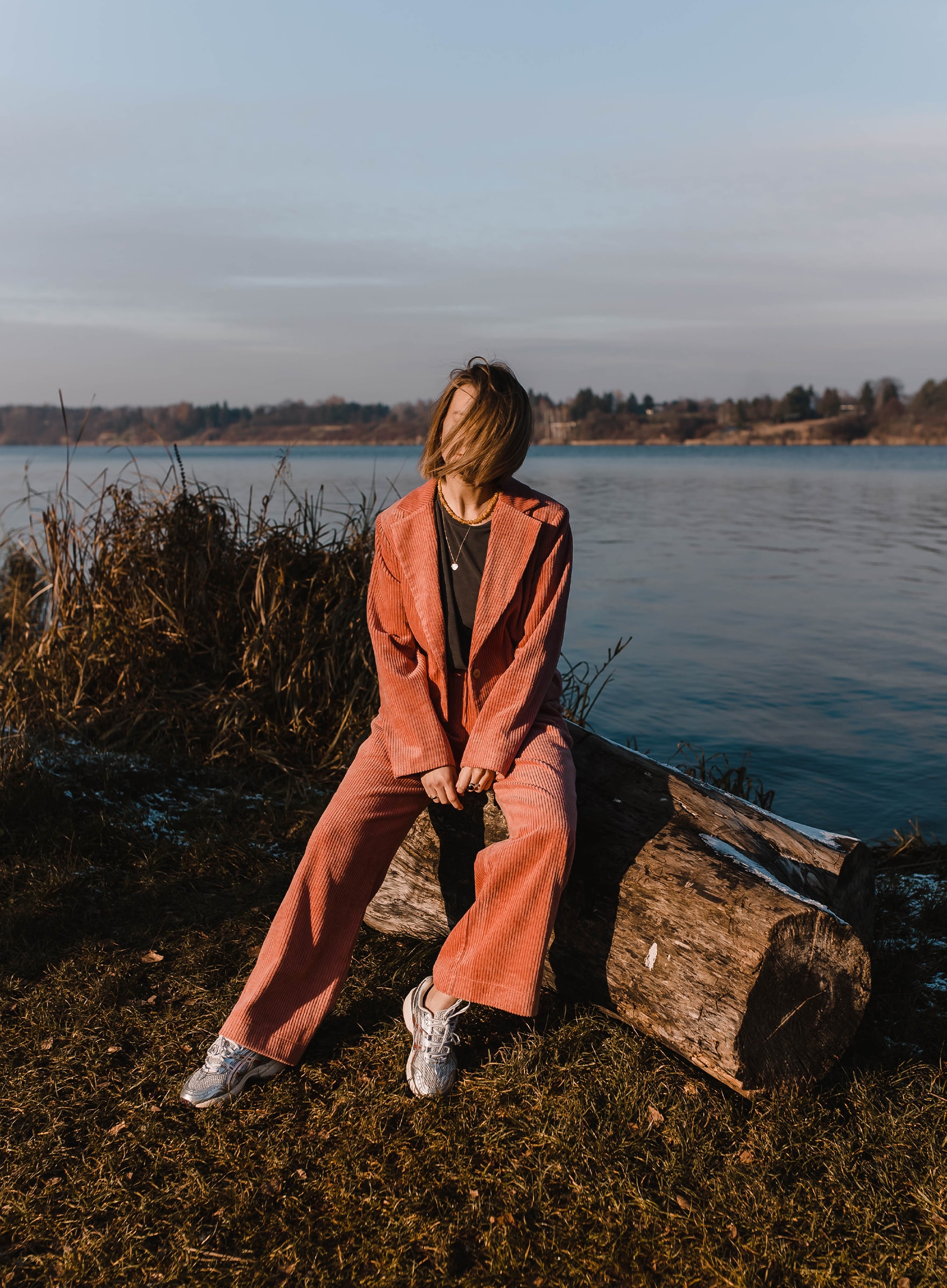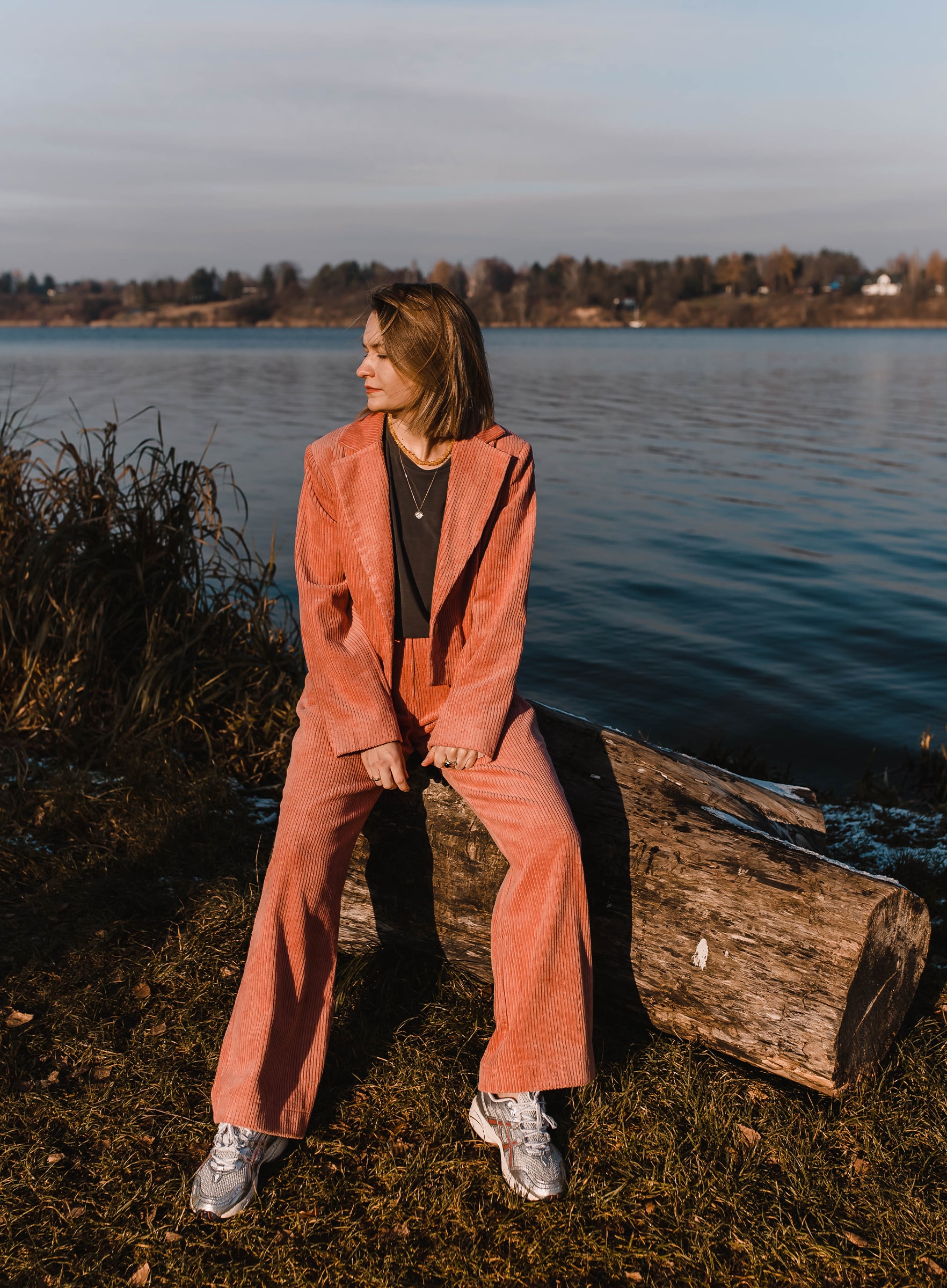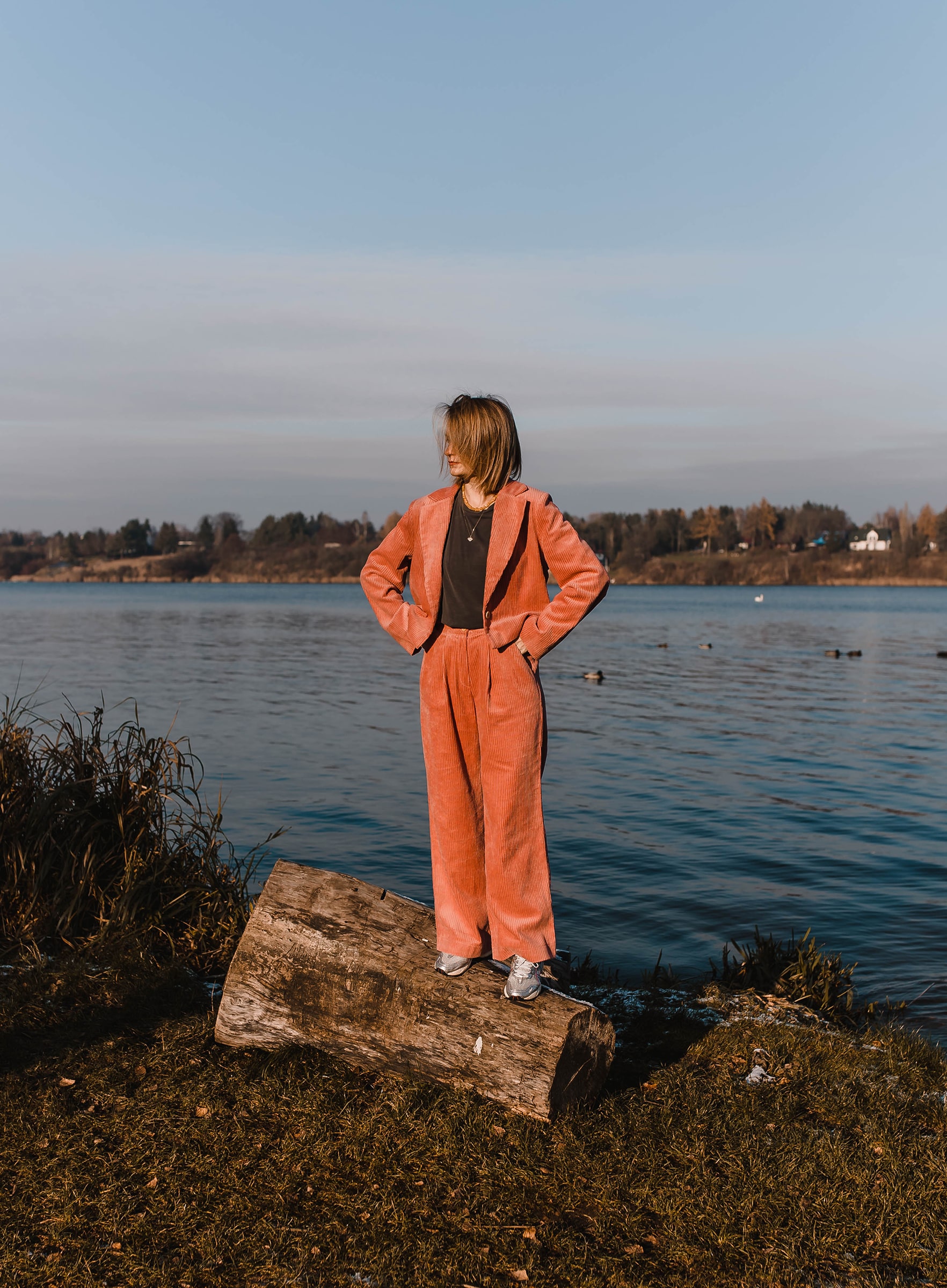 Sztruksowa taliowana marynatka z poduszkami na ramionach, zapinana na jeden guzik, uszyta na podszewce wiskozowej. Do kompletu ze spodniami (do kupienia osobno). Kolor: stary róż.