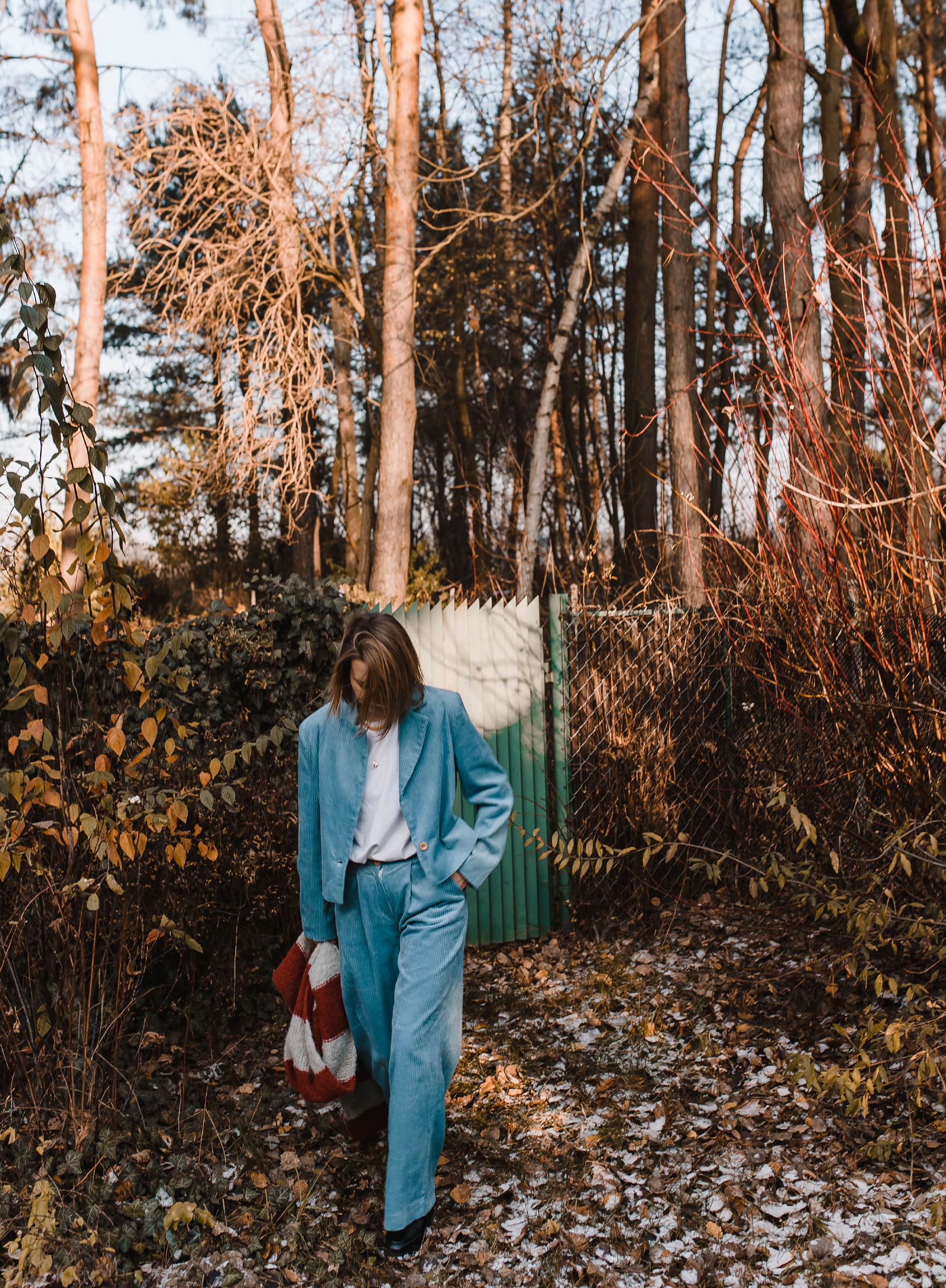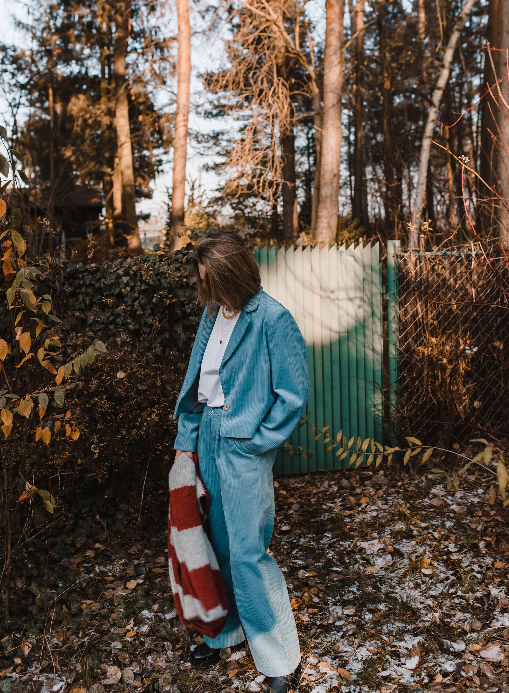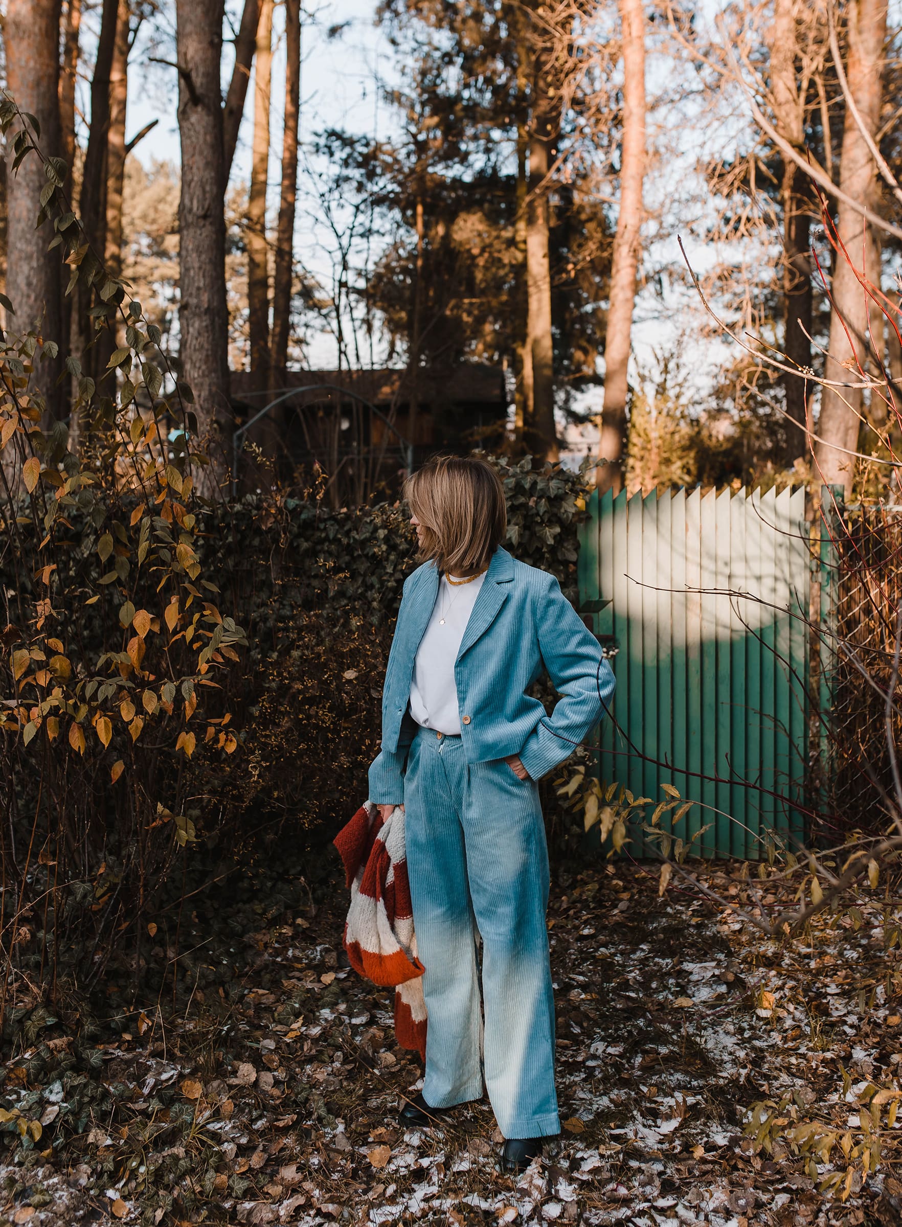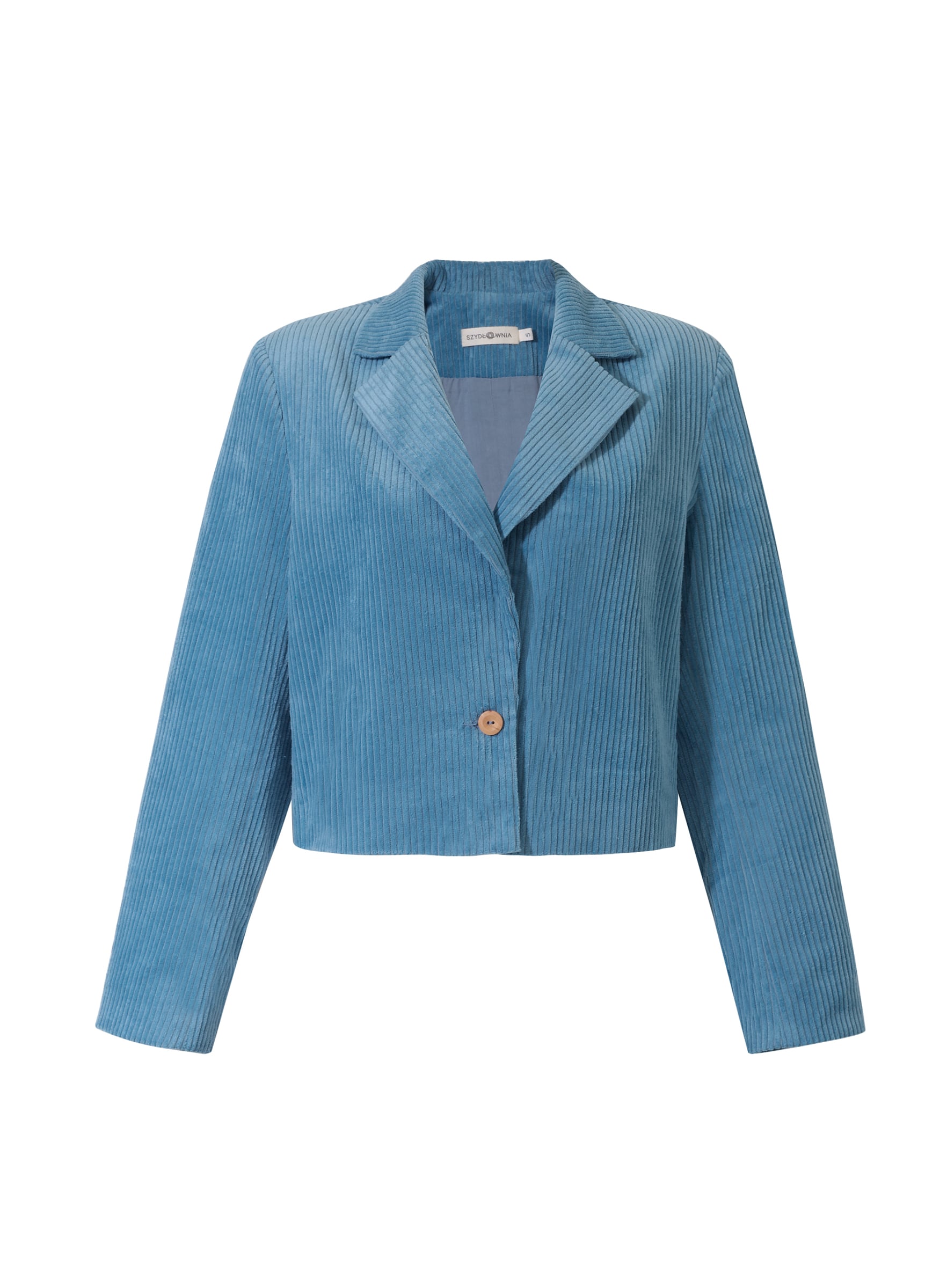 Sztruksowa taliowana marynatka z poduszkami na ramionach, zapinana na jeden guzik, uszyta na podszewce wiskozowej. Do kompletu ze spodniami (do kupienia osobno). Kolor: niebieski.