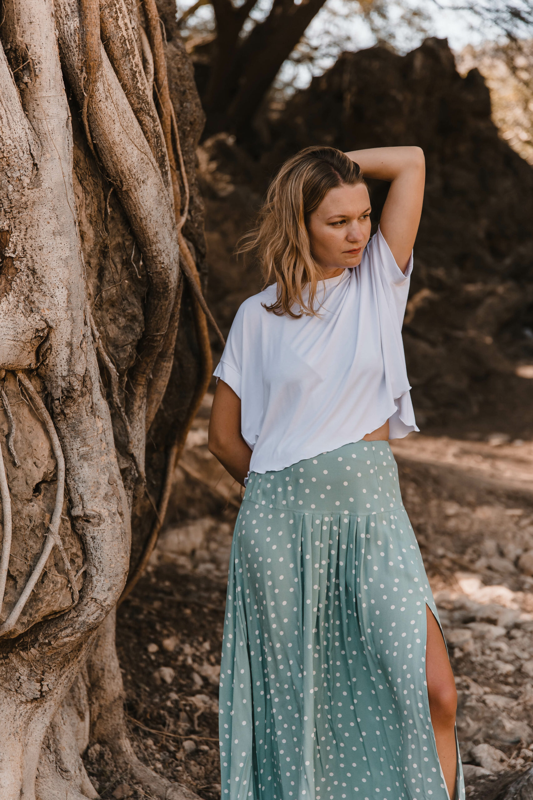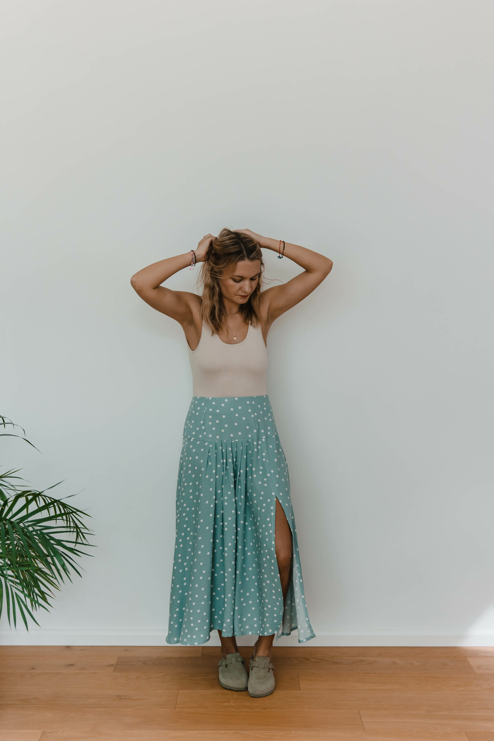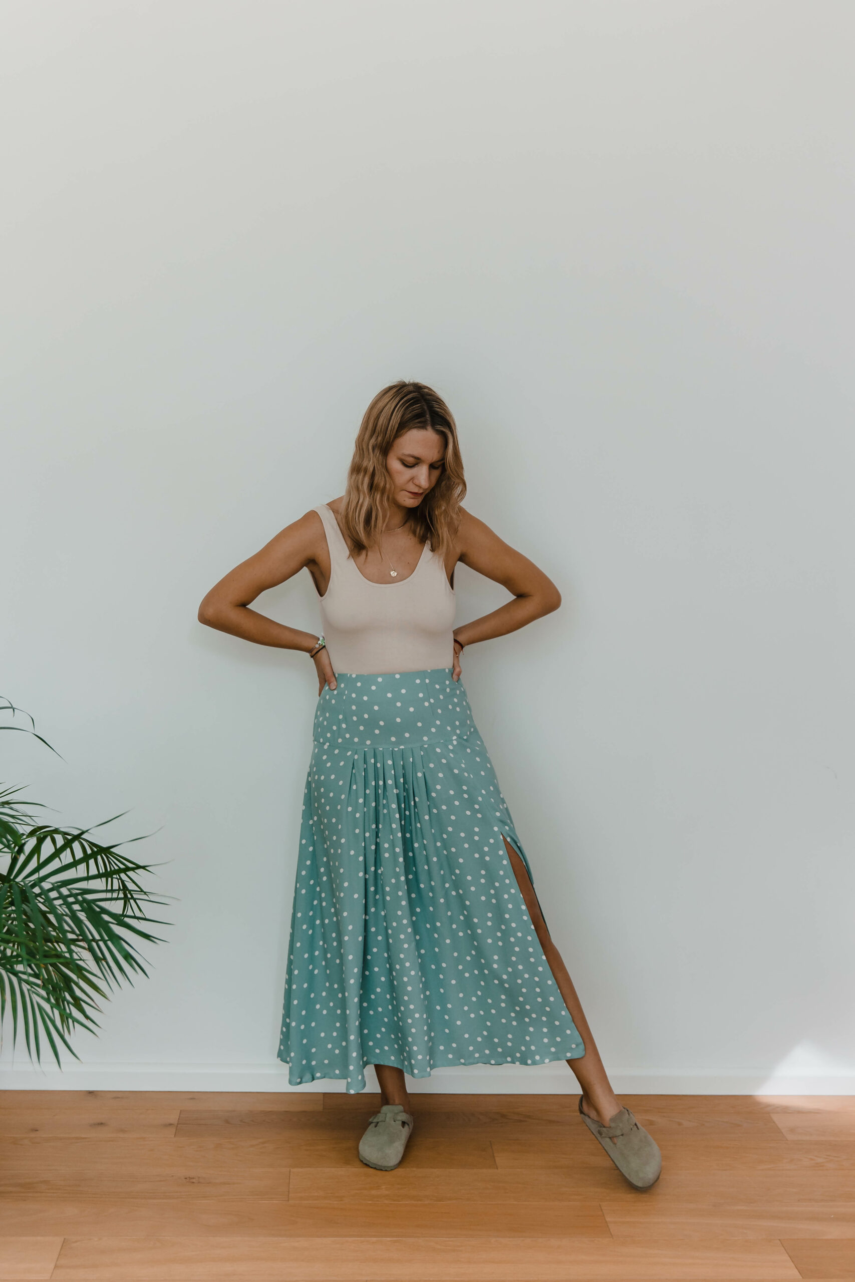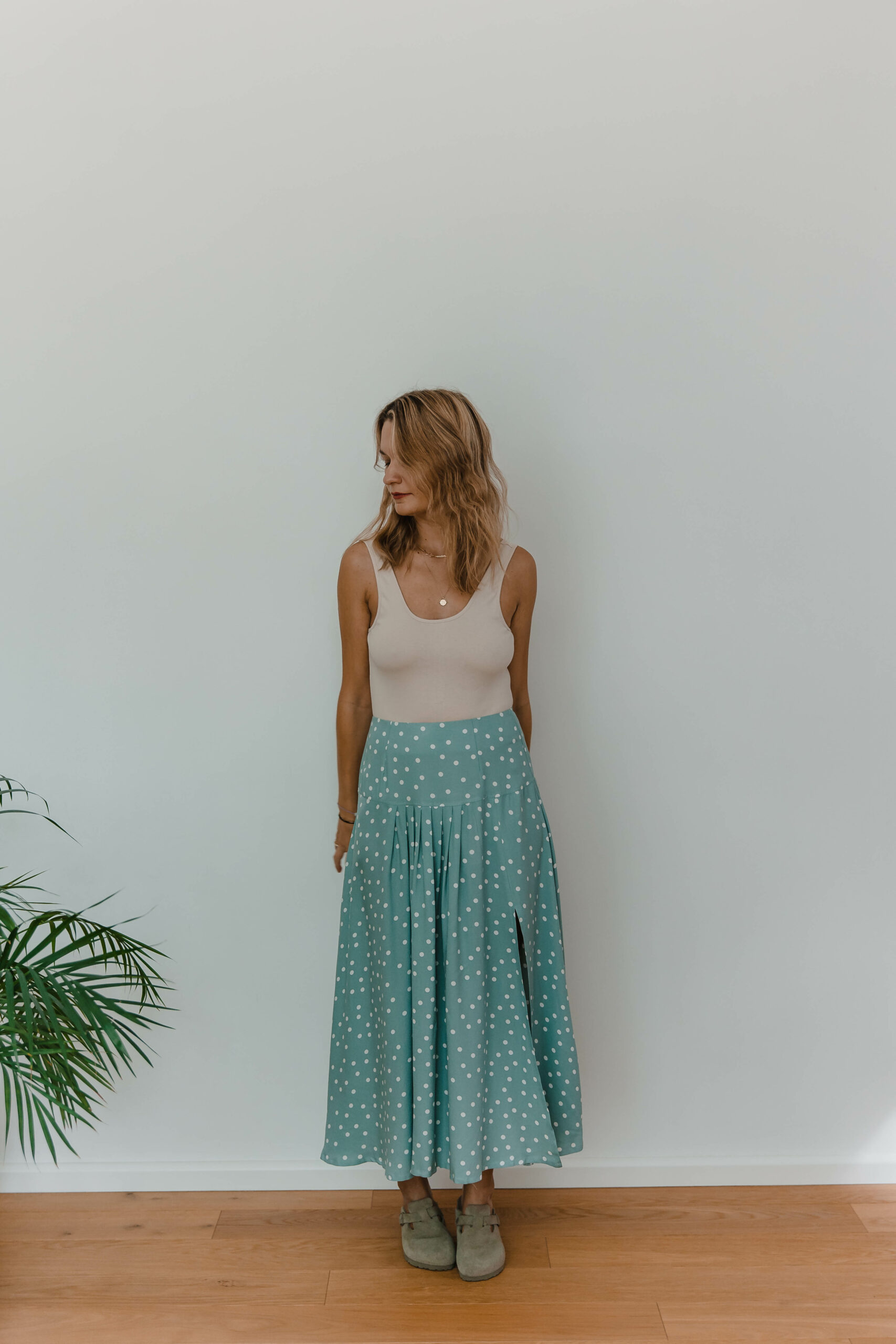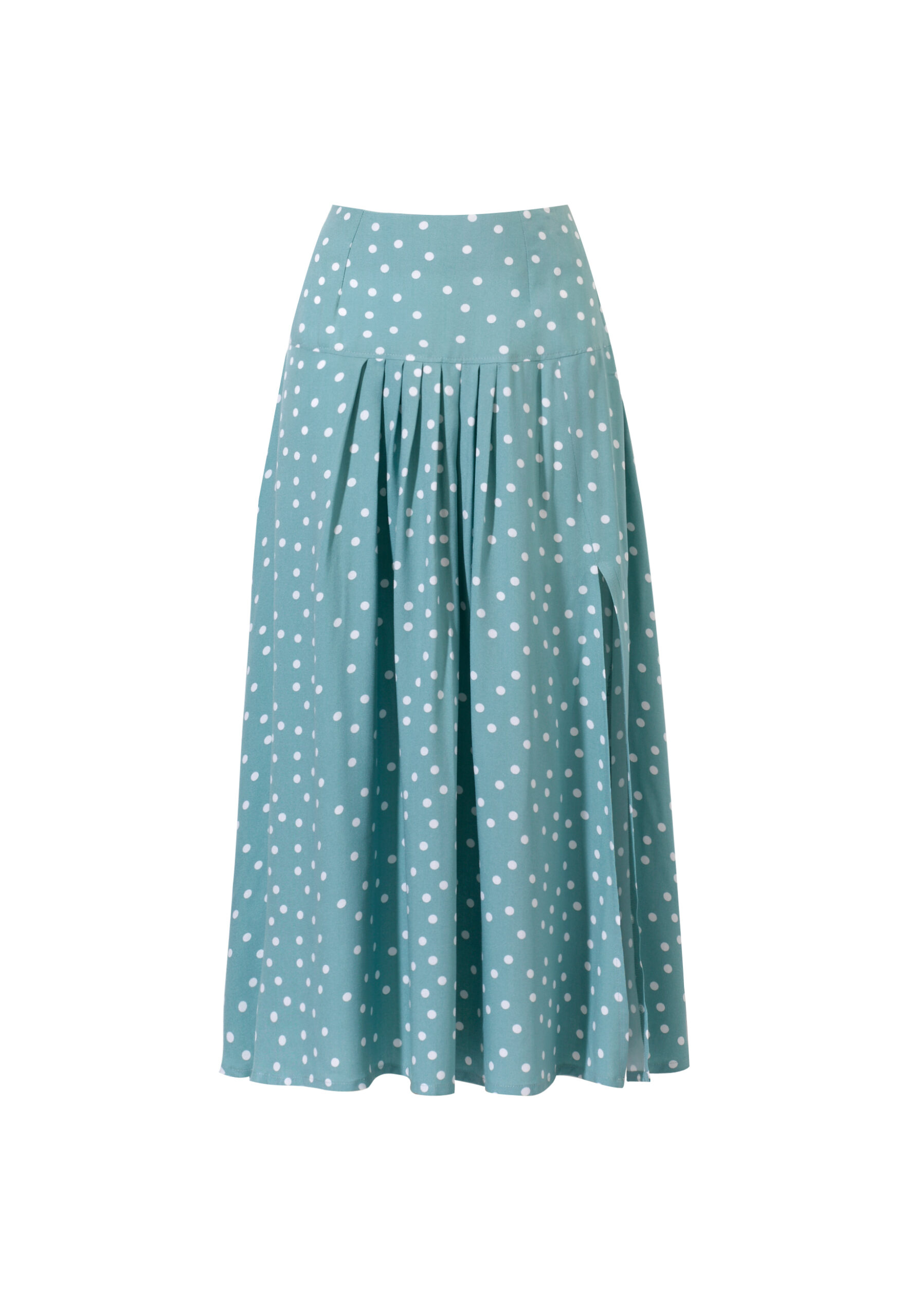 Dots Skirt to idealne połączenie uroku retro i nowoczesnego stylu. Zakładki z przodu dodają niepowtarzalnego charakteru, podczas gdy rozcięcie na nodze nadaje subtelnej zmysłowości.
