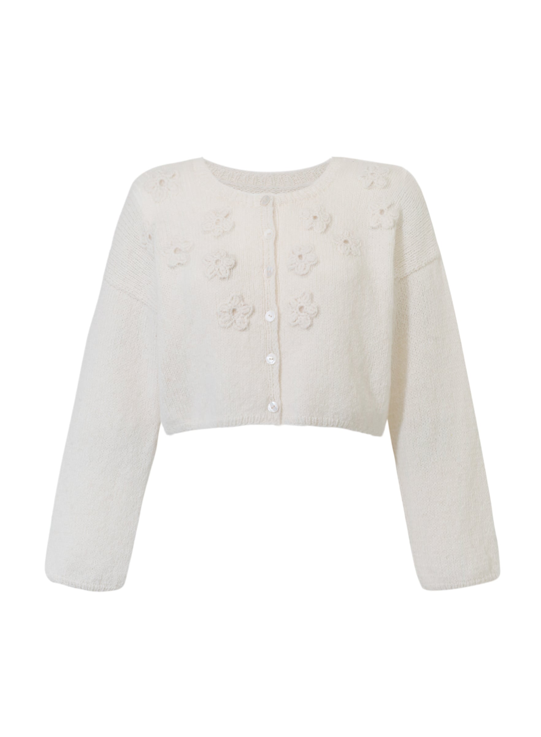 Lekki kardigan ozdobiony haftowanymi kwiatkami. Wydziergany ręcznie z włóczki z alpaki i merynosa.