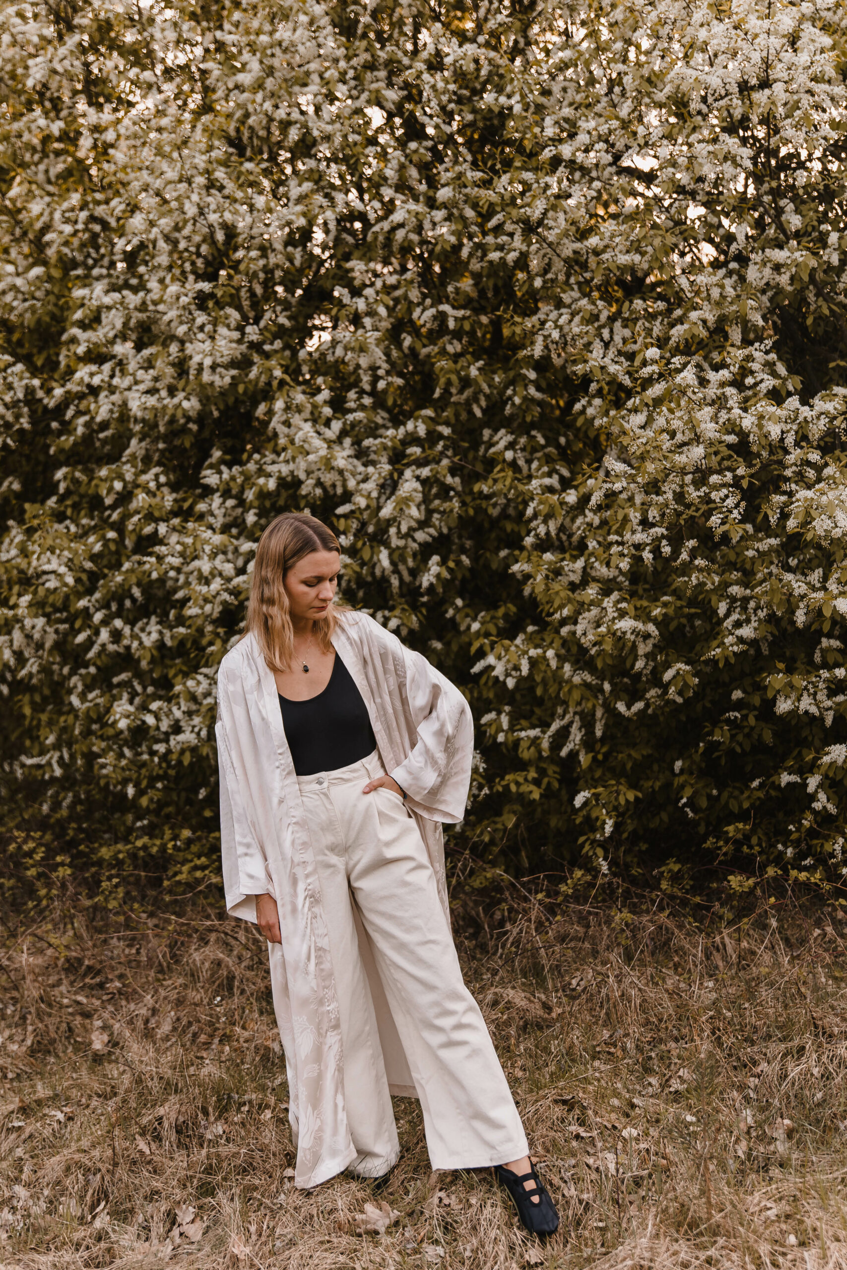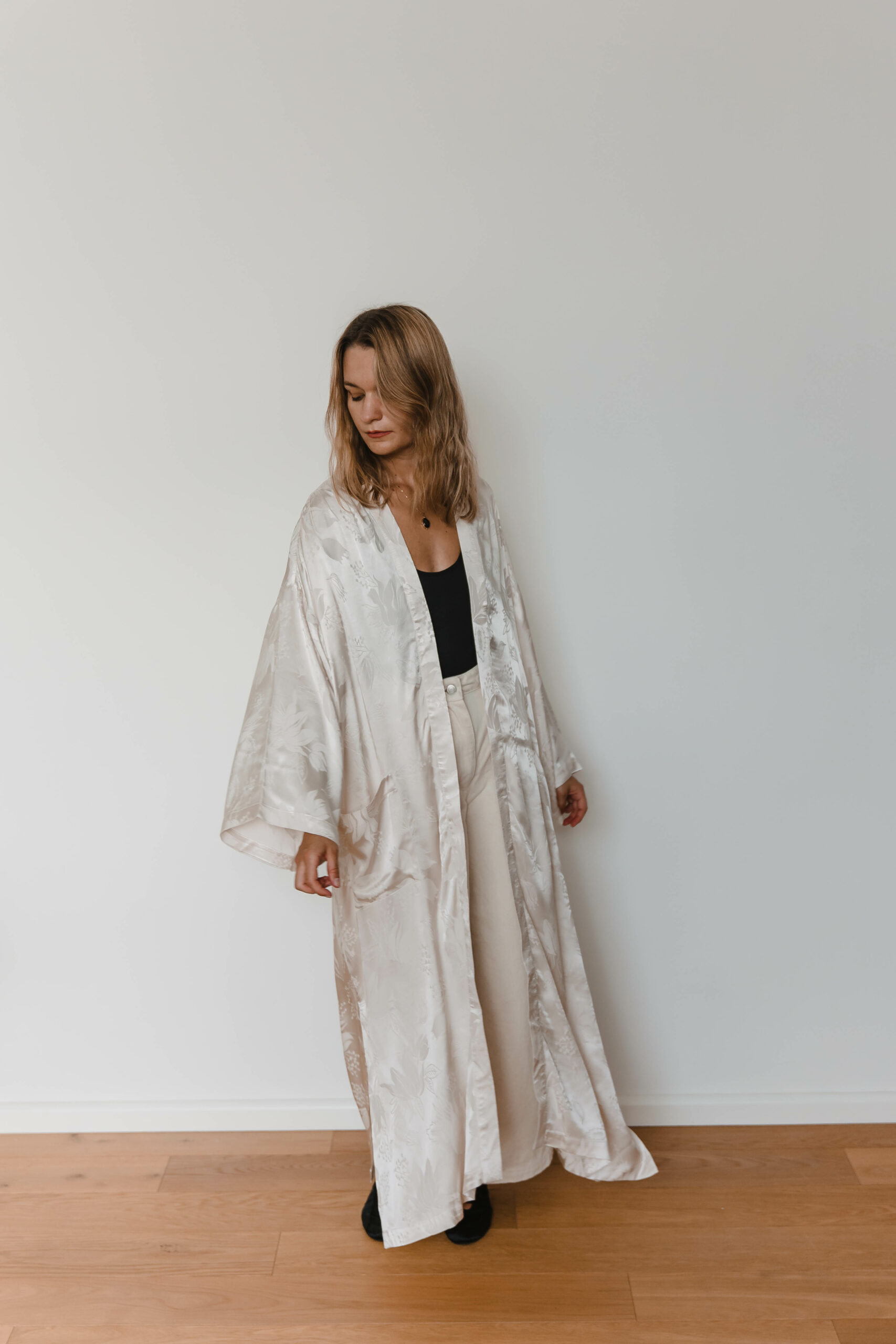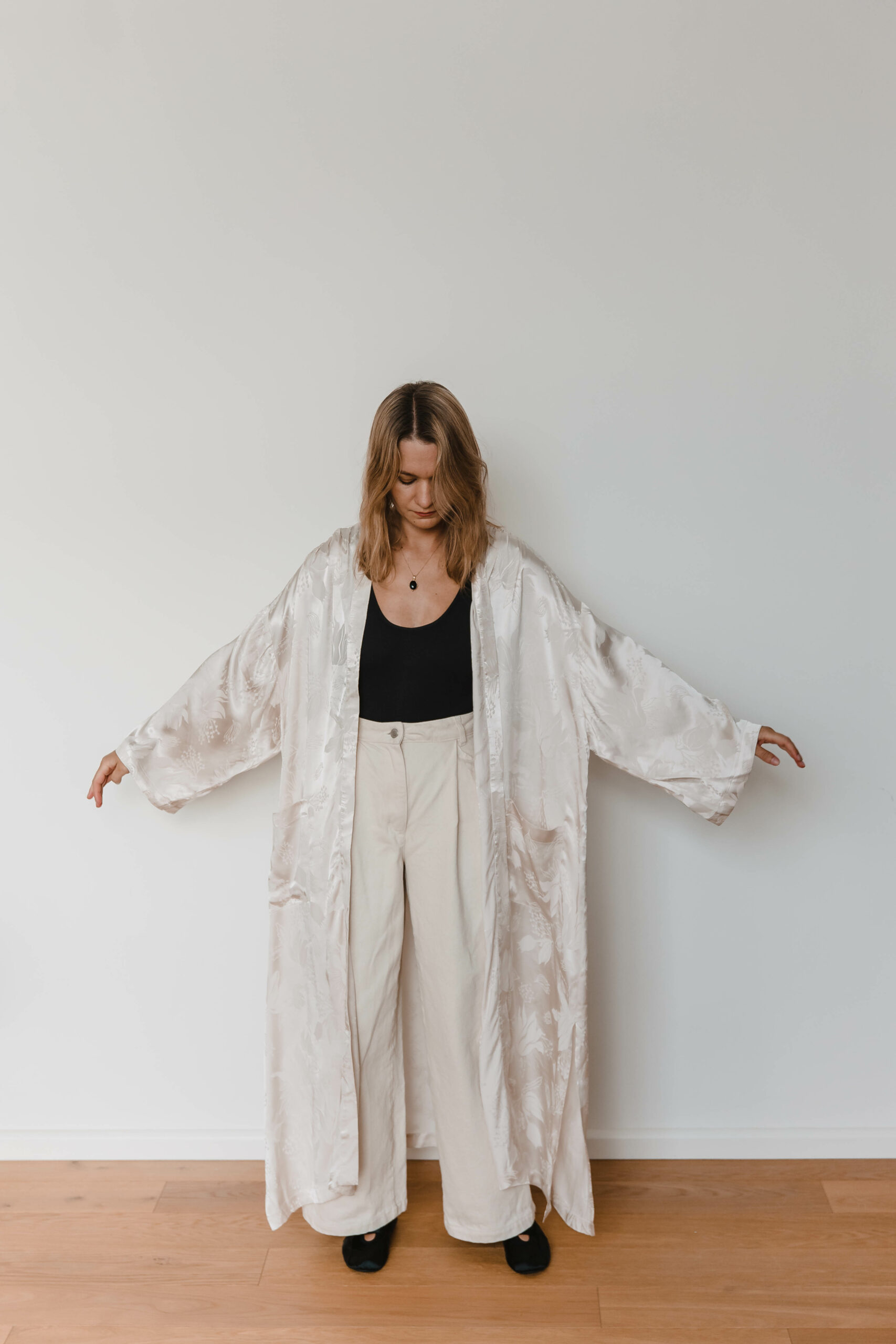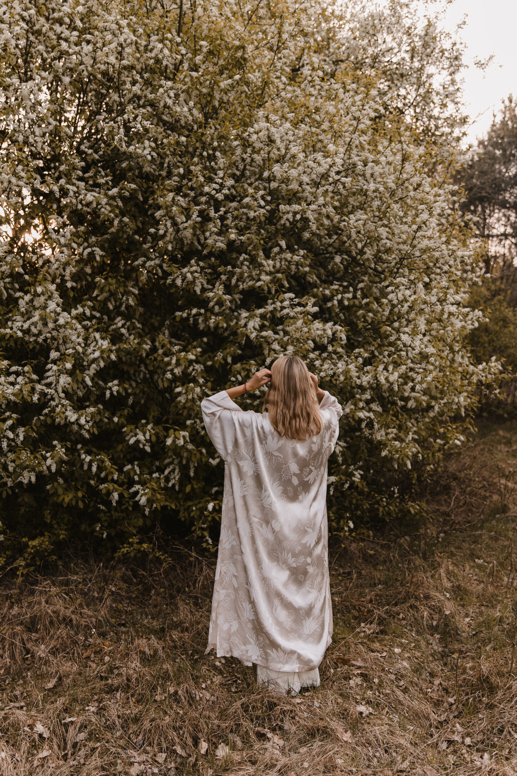 Flower Kimono jak na swoją długość i mięsistość tkaniny jest niezwykle lekkie i zwiewne, doskonale na letnie dni. Doda Twojej garderobie odrobinę romantycznego uroku. Tłoczony wzór kwiatów nadaje mu delikatności i świeżości. Długi fason zapewnia swobodę, a kieszenie dodają praktyczności. Możesz nosić je również jako sukienkę! Wystarczy, że przewiążesz je w pasie dołączonym paskiem 🙂