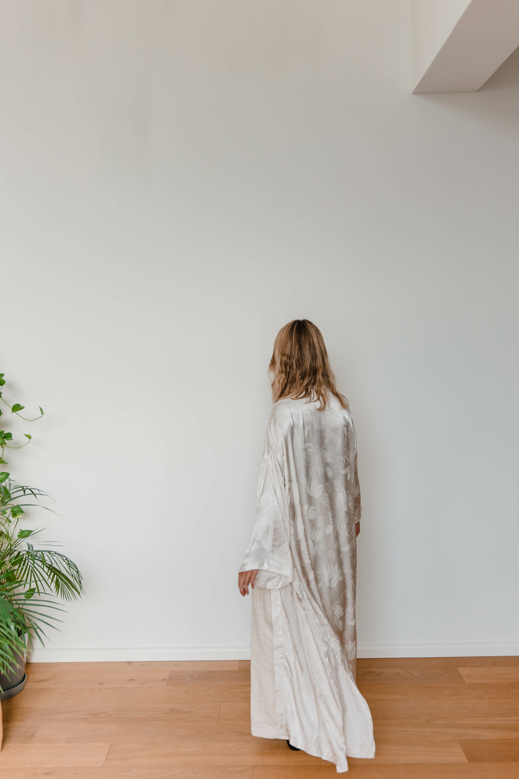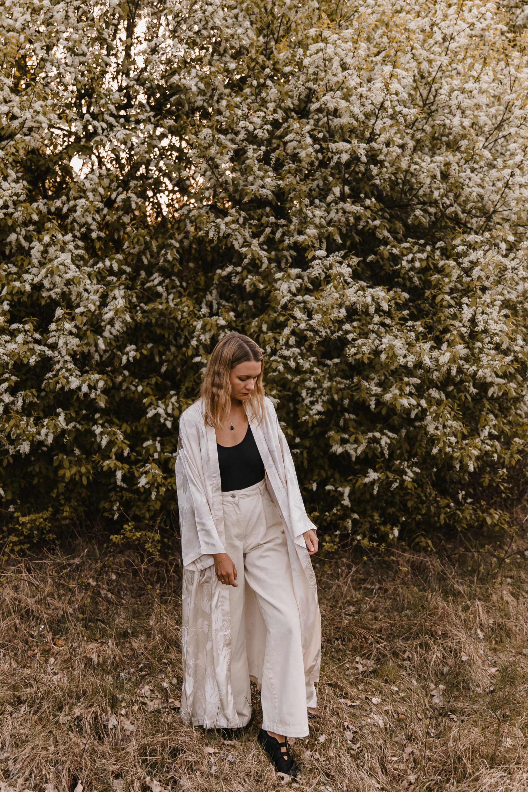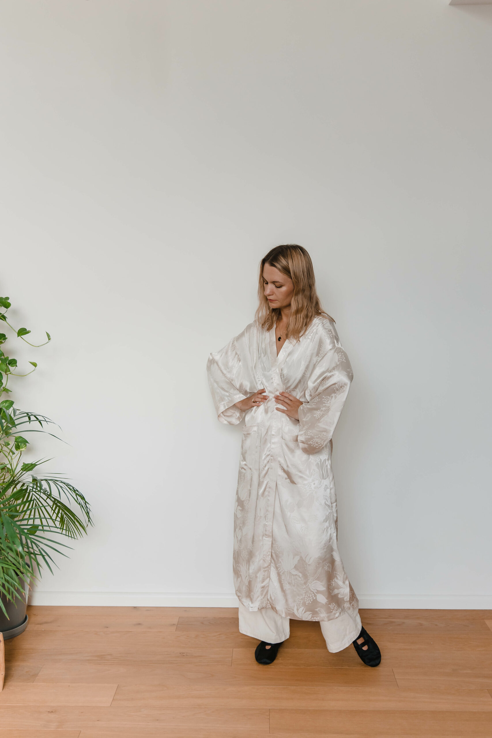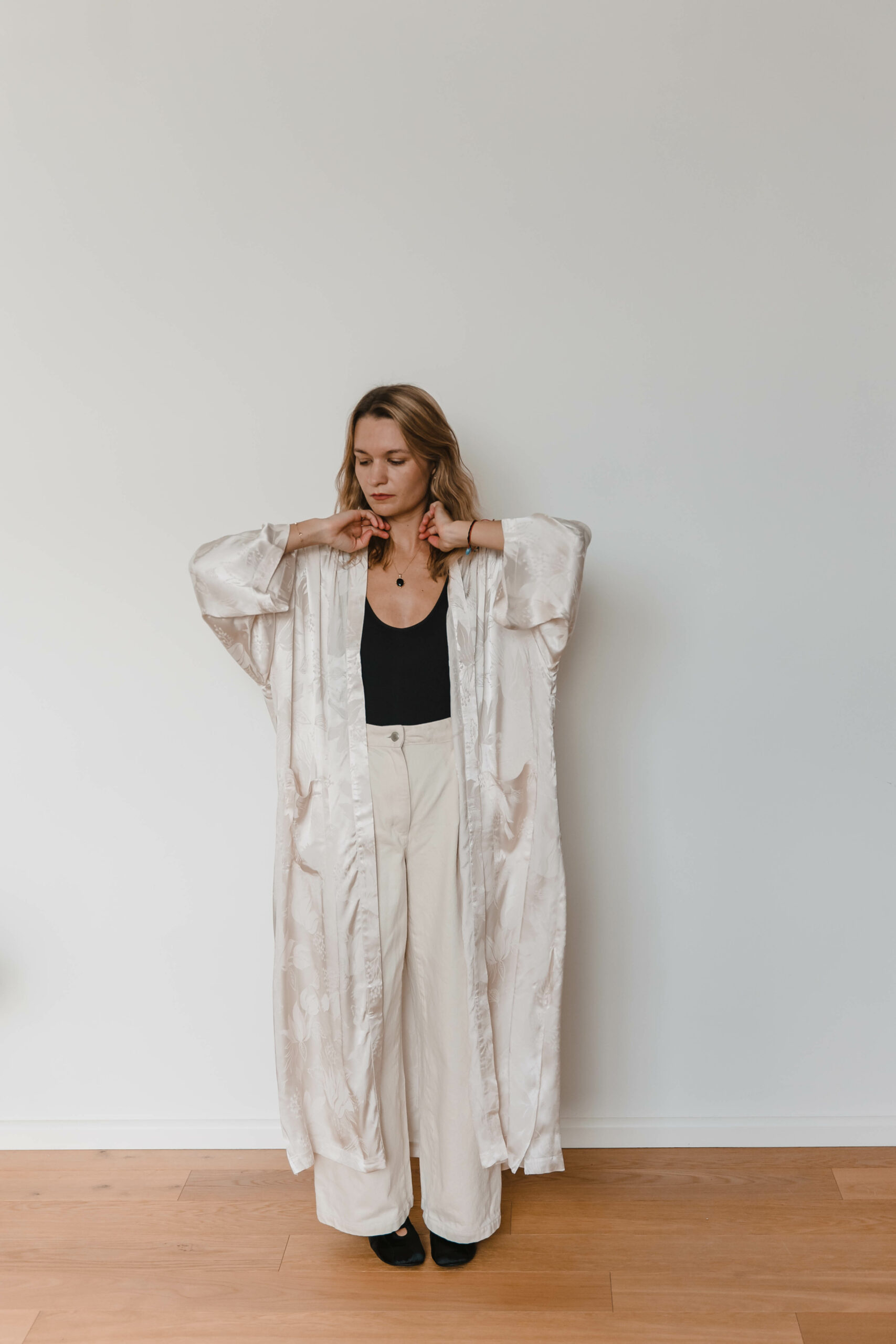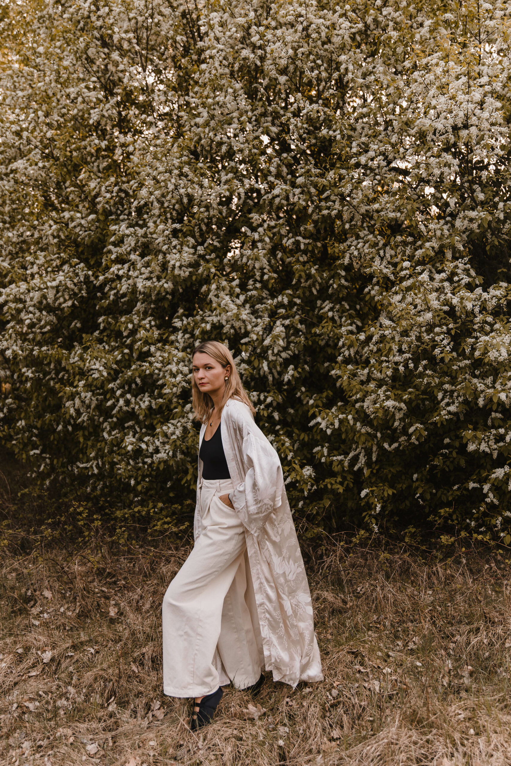 Flower Kimono jak na swoją długość i mięsistość tkaniny jest niezwykle lekkie i zwiewne, doskonale na letnie dni. Doda Twojej garderobie odrobinę romantycznego uroku. Tłoczony wzór kwiatów nadaje mu delikatności i świeżości. Długi fason zapewnia swobodę, a kieszenie dodają praktyczności. Możesz nosić je również jako sukienkę! Wystarczy, że przewiążesz je w pasie dołączonym paskiem 🙂