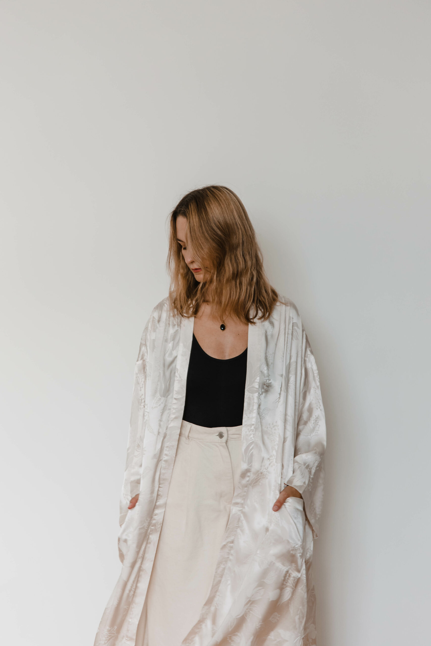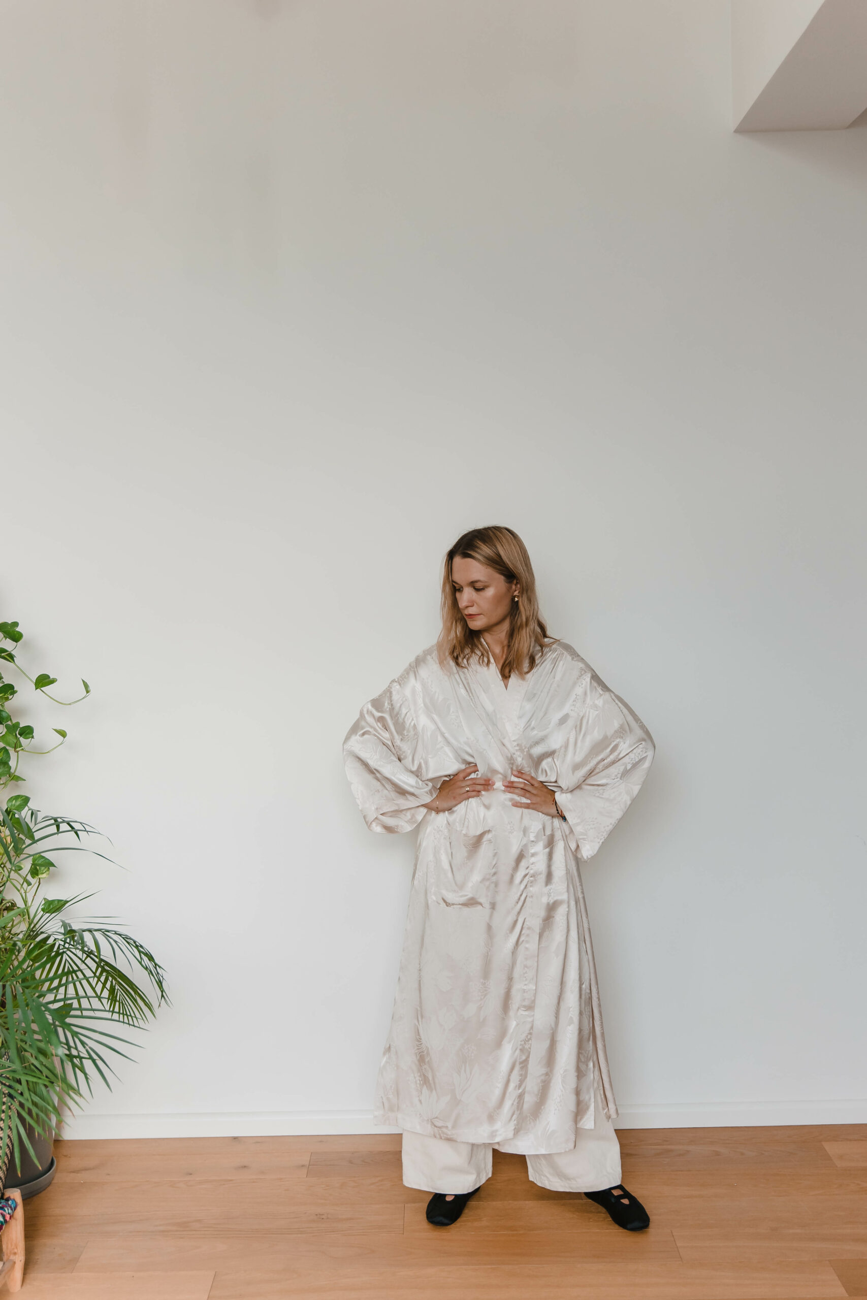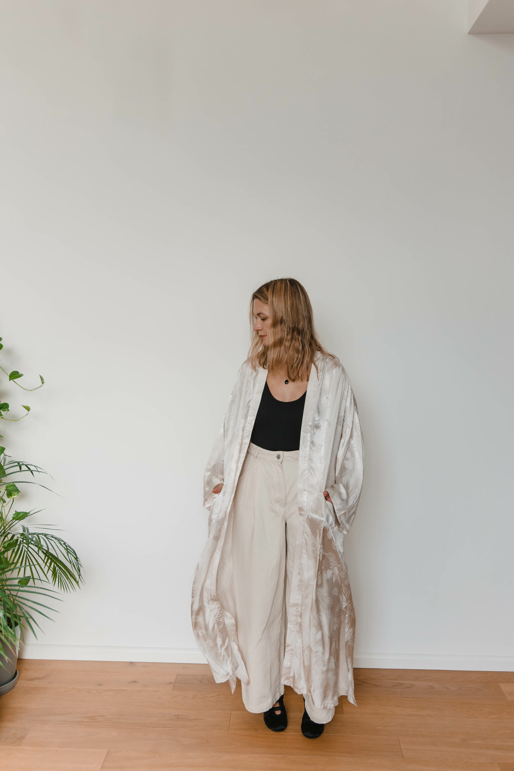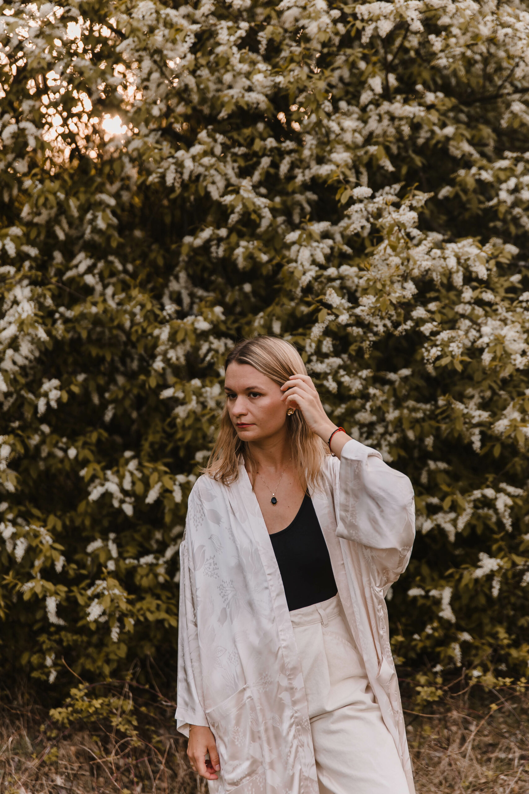 Flower Kimono jak na swoją długość i mięsistość tkaniny jest niezwykle lekkie i zwiewne, doskonale na letnie dni. Doda Twojej garderobie odrobinę romantycznego uroku. Tłoczony wzór kwiatów nadaje mu delikatności i świeżości. Długi fason zapewnia swobodę, a kieszenie dodają praktyczności. Możesz nosić je również jako sukienkę! Wystarczy, że przewiążesz je w pasie dołączonym paskiem 🙂