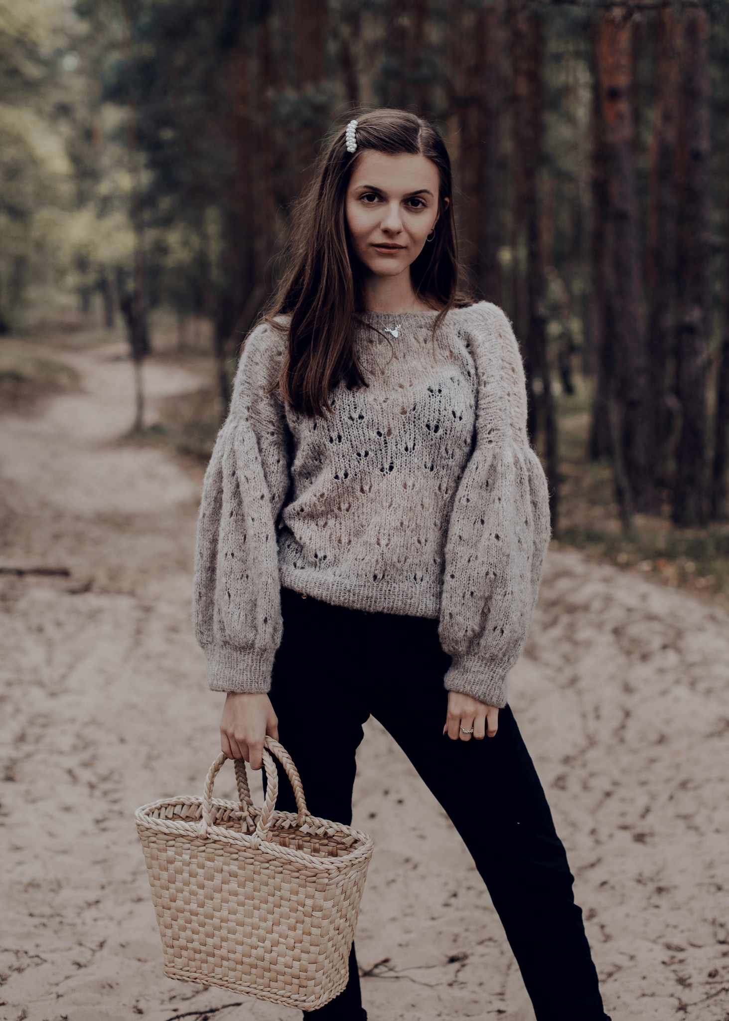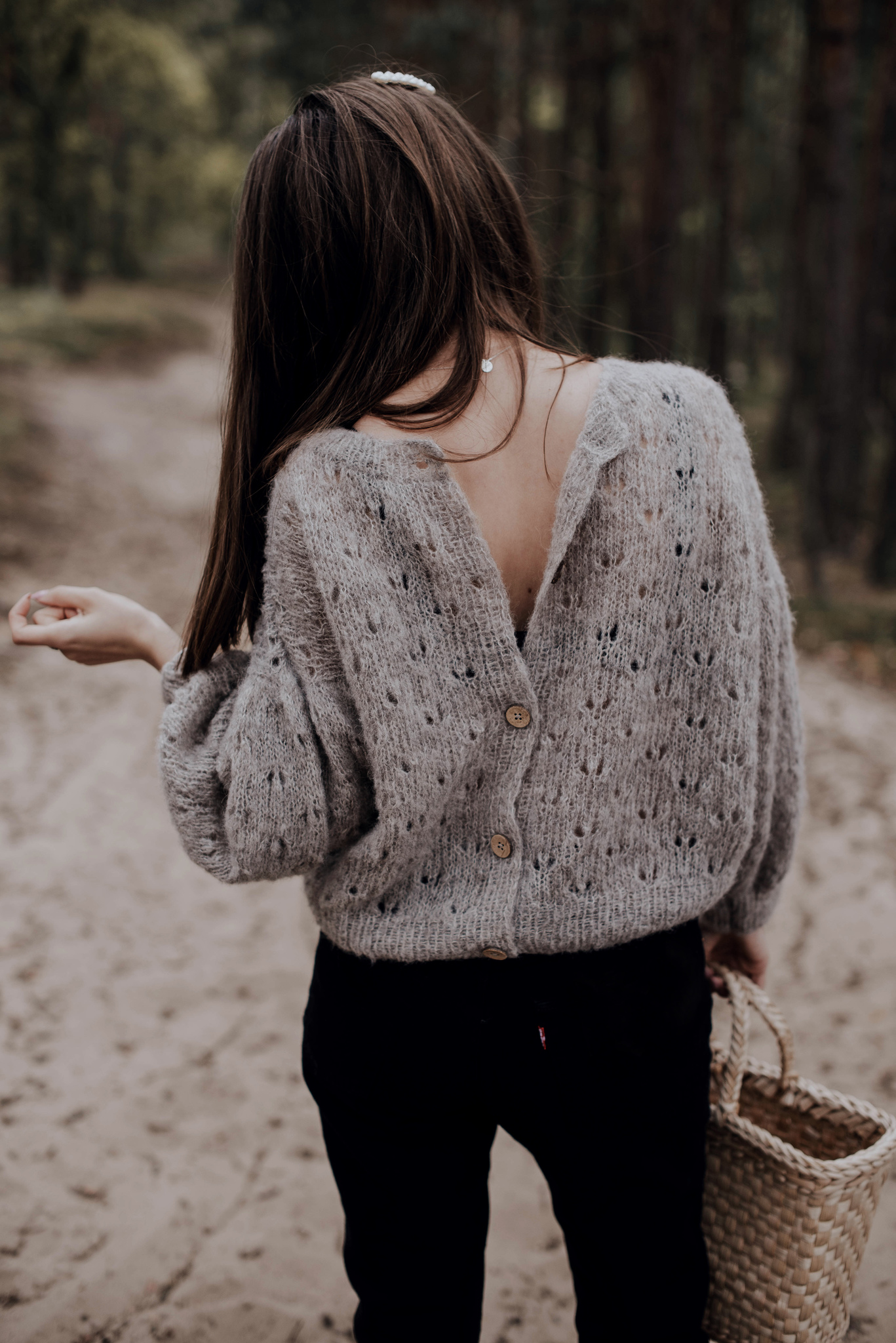 Ażurowy sweter wydziergany ręcznie z delikatnej włóczki z alpaki z dodatkiem jedwabiu, zapinany na guziki z kokosa. Szerokie, bufiaste rękawy wykończone ściągaczem. Sweter zaprojektowano tak, by można go było nosić dwustronnie- z guzikami z przodu lub z tyłu. Na zamówienie dostępny jest w innych kolorach.