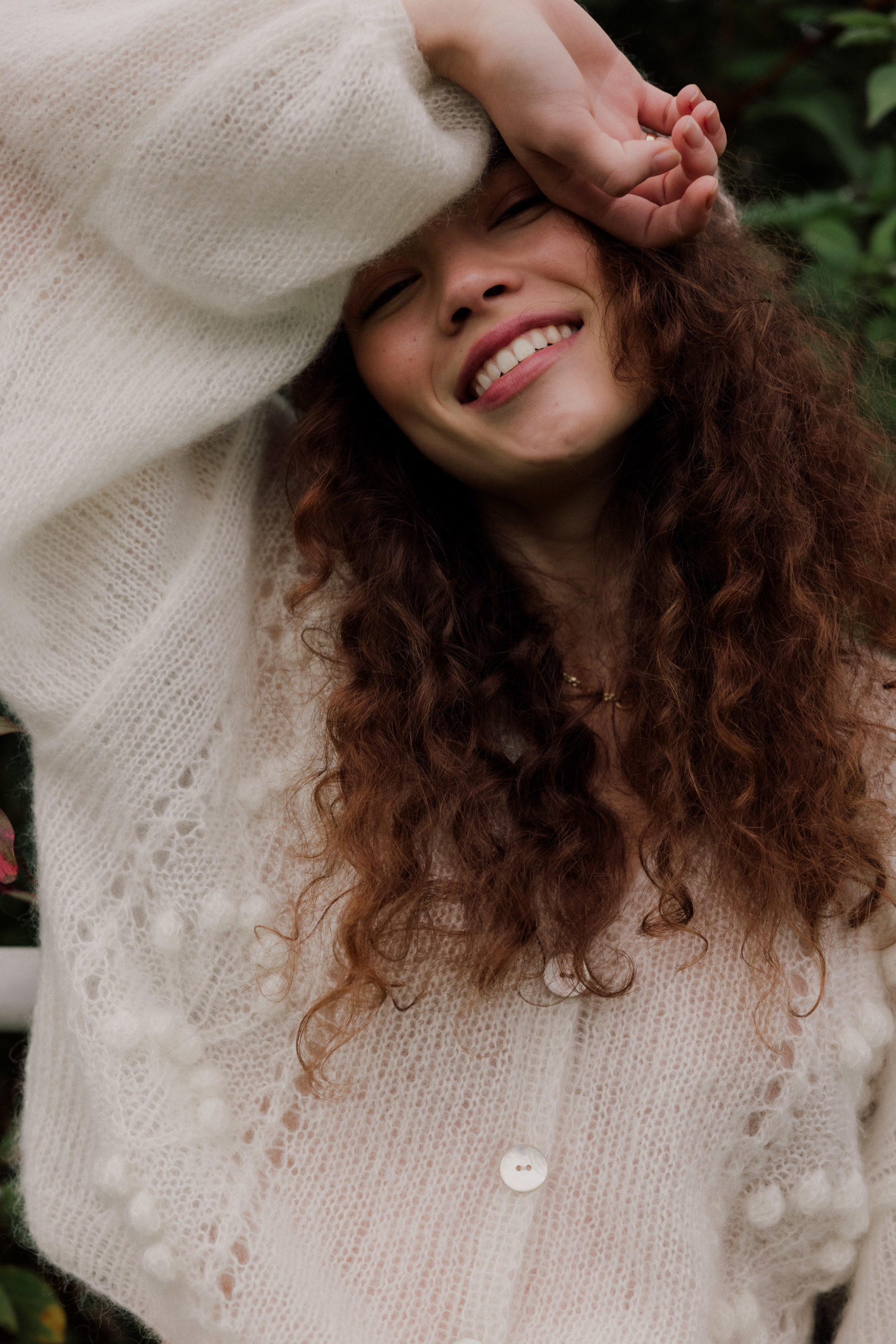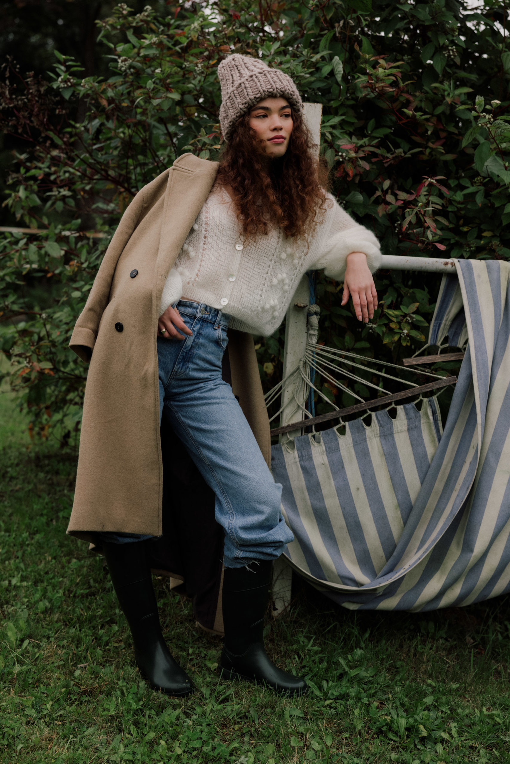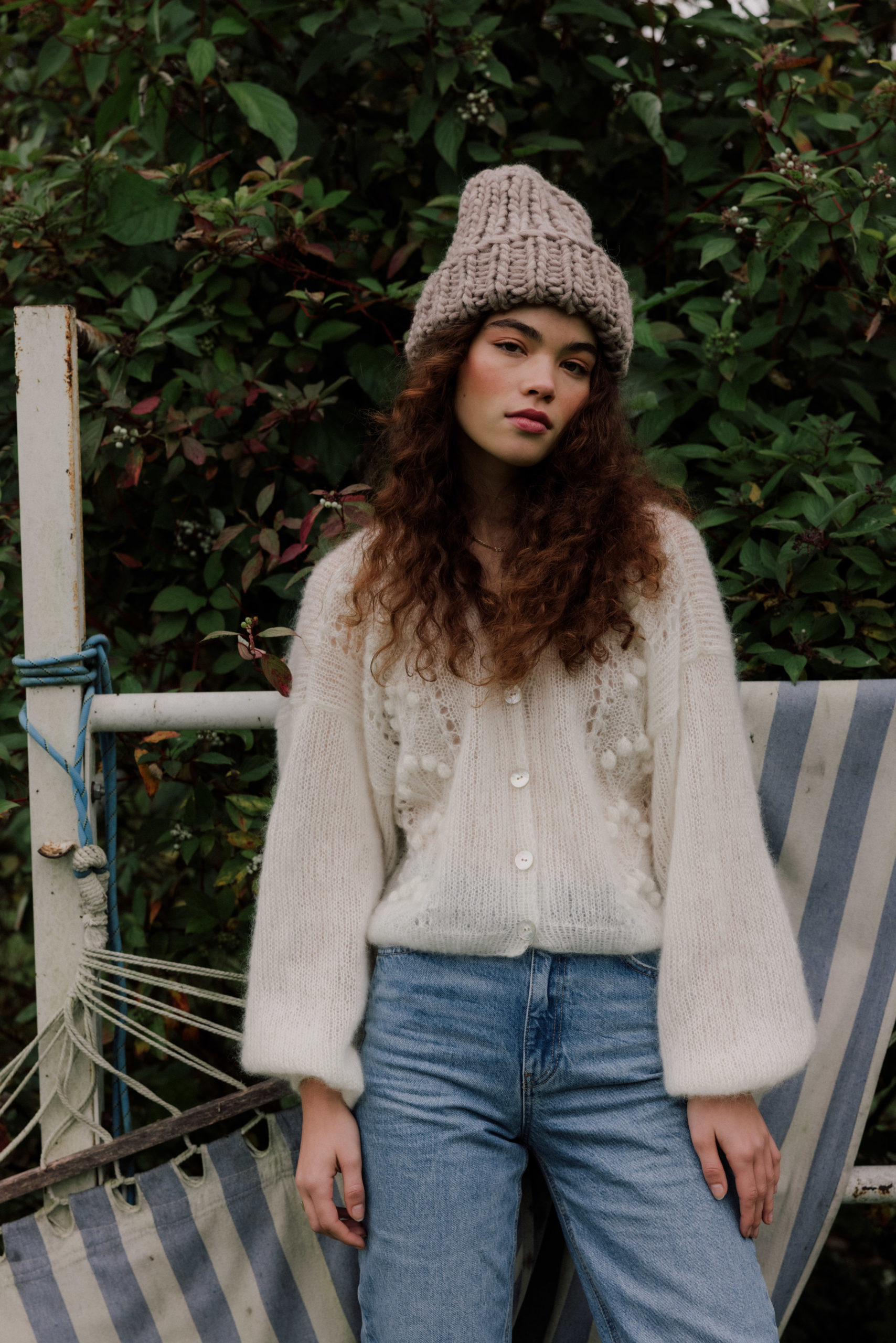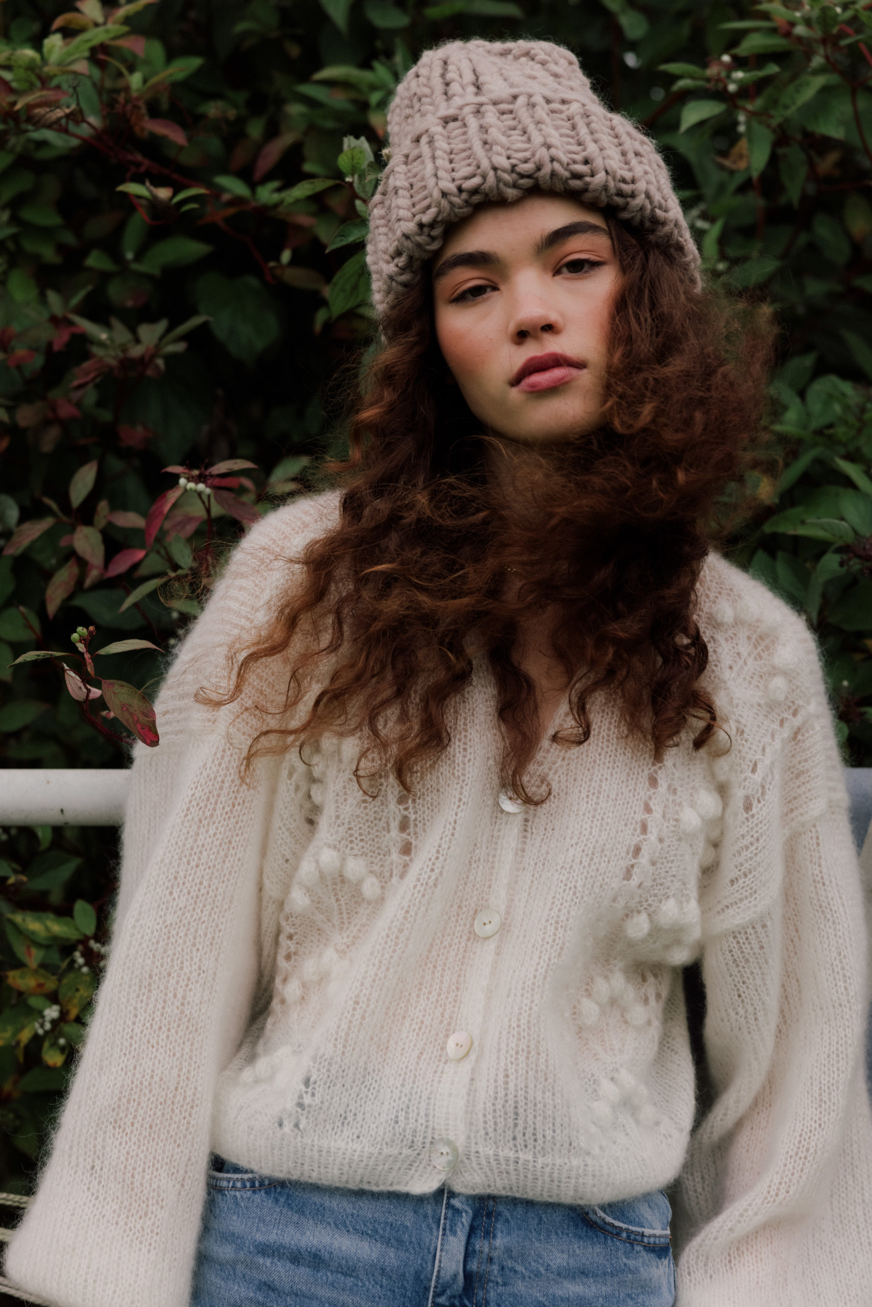 Ultra delikatny kardigan typu chmurka zdobiony bąbelkami. Inspirowany naszym swetrem August (sprawdź koniecznie). Z przodu zapinany na guziki z masy perłowej. Romantyczny, kobiecy i super lekki. Na zamówienie kardigan jest dostępny w innych kolorach.