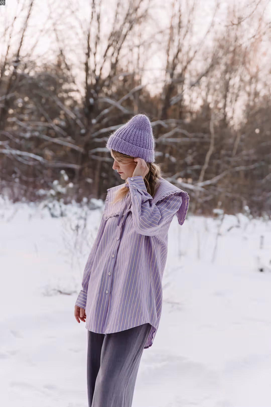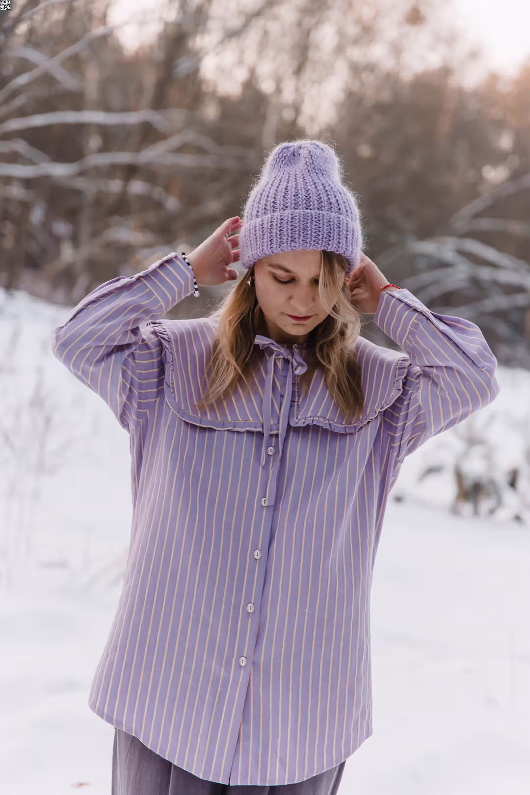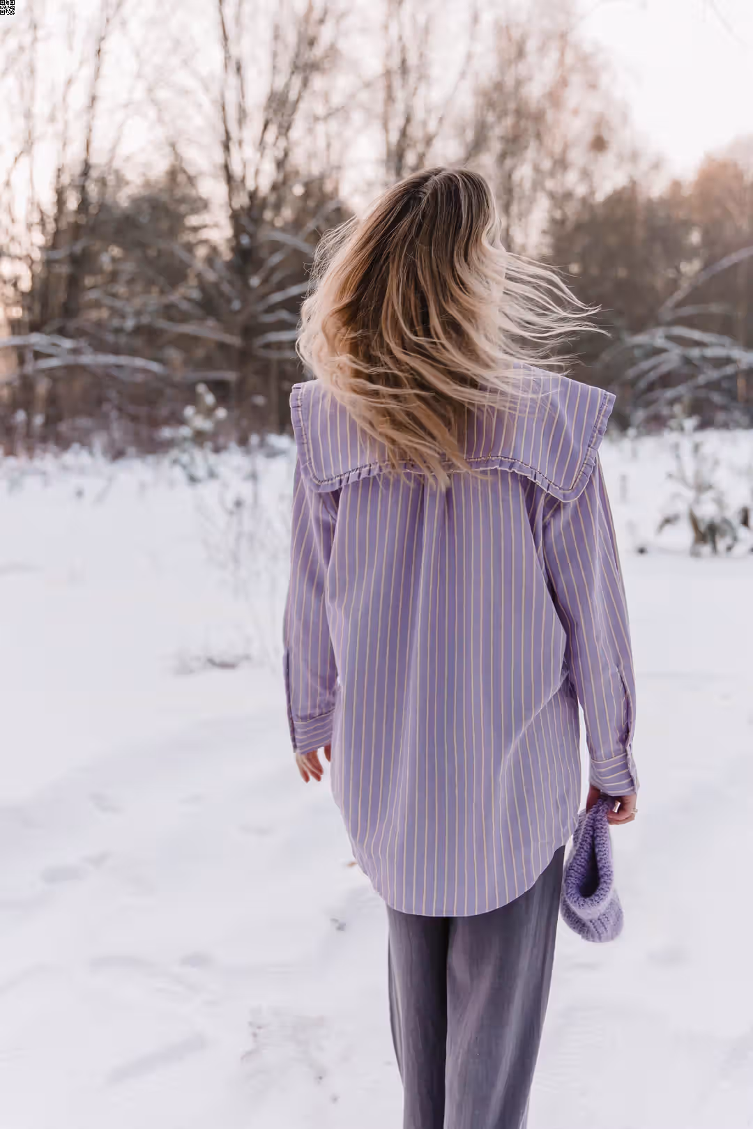 IRIS powstała z myślą o swobodzie. O tej, kiedy nie trzeba się zastanawiać „jak to nosić”, tylko po prostu zakładasz i idziesz. Ma klasyczną formę w paski, ale z detalem, który pozwala się pobawić — kołnierzyk możesz nosić przy szyi albo przewiązać w pasie, zmieniając proporcje i charakter całości. Raz romantycznie, raz bardziej nonszalancko. To koszula na różne dni i różne nastroje. Nie narzuca się, ale daje możliwości. Dokładnie taka, jaką lubimy najbardziej.