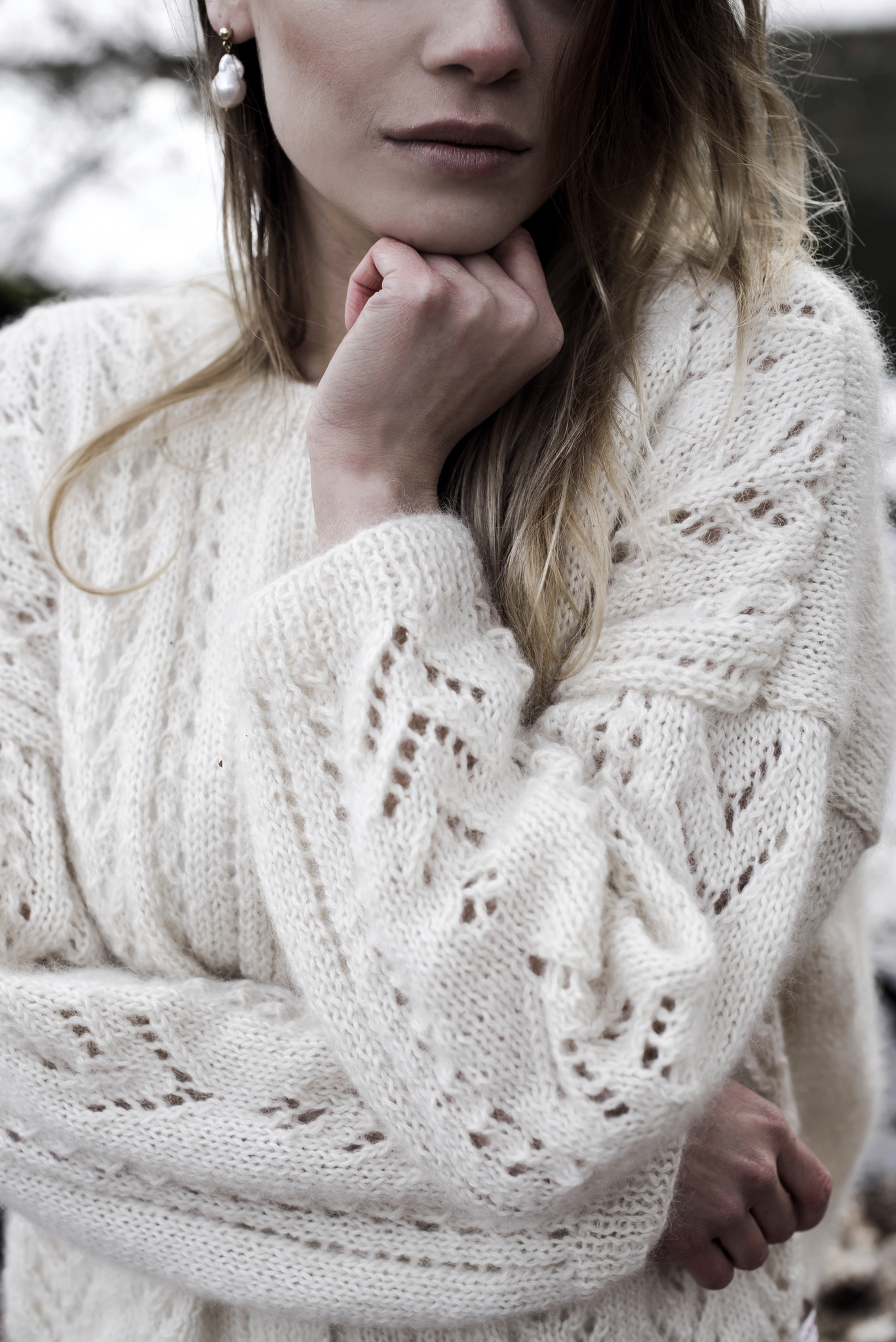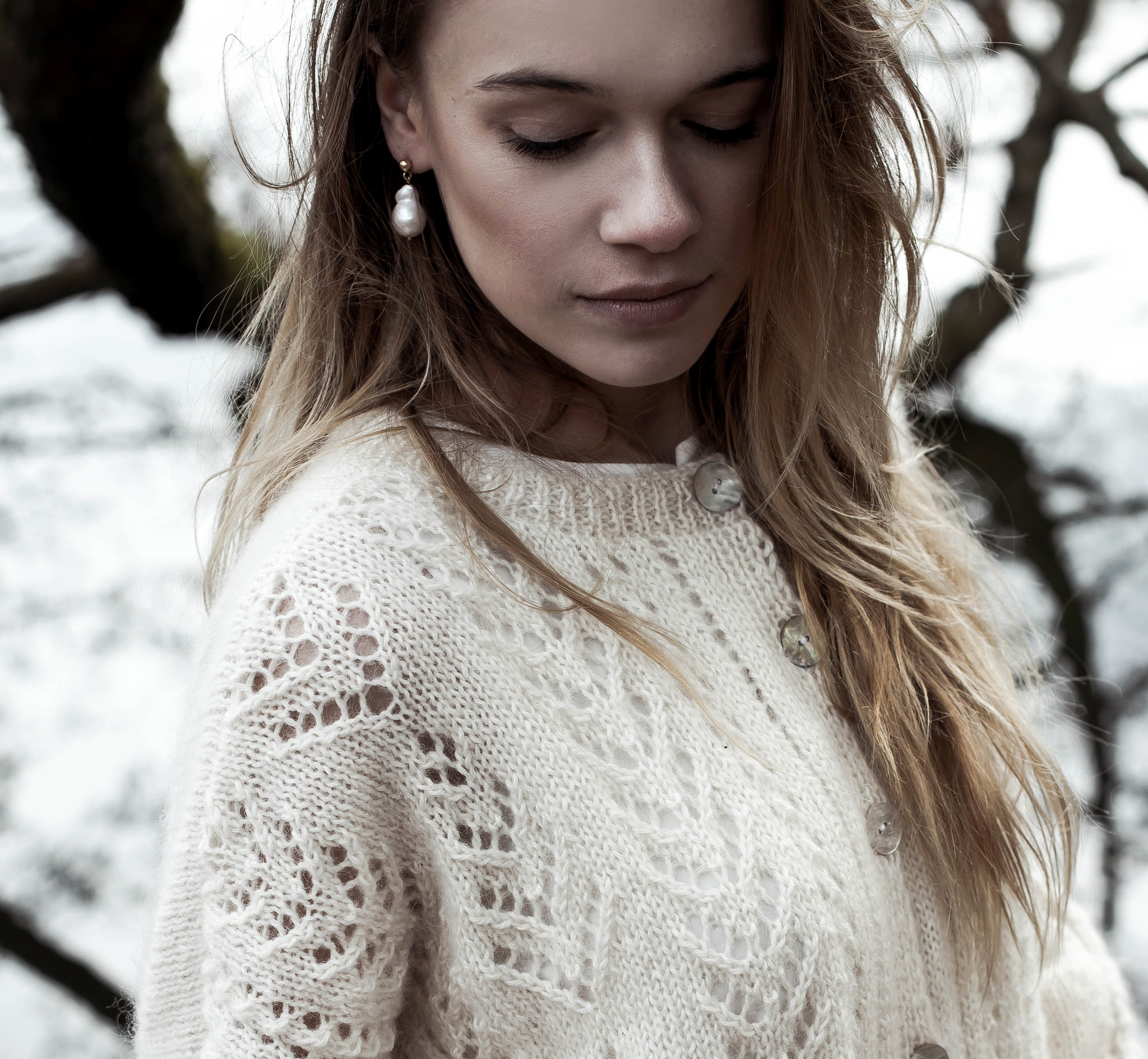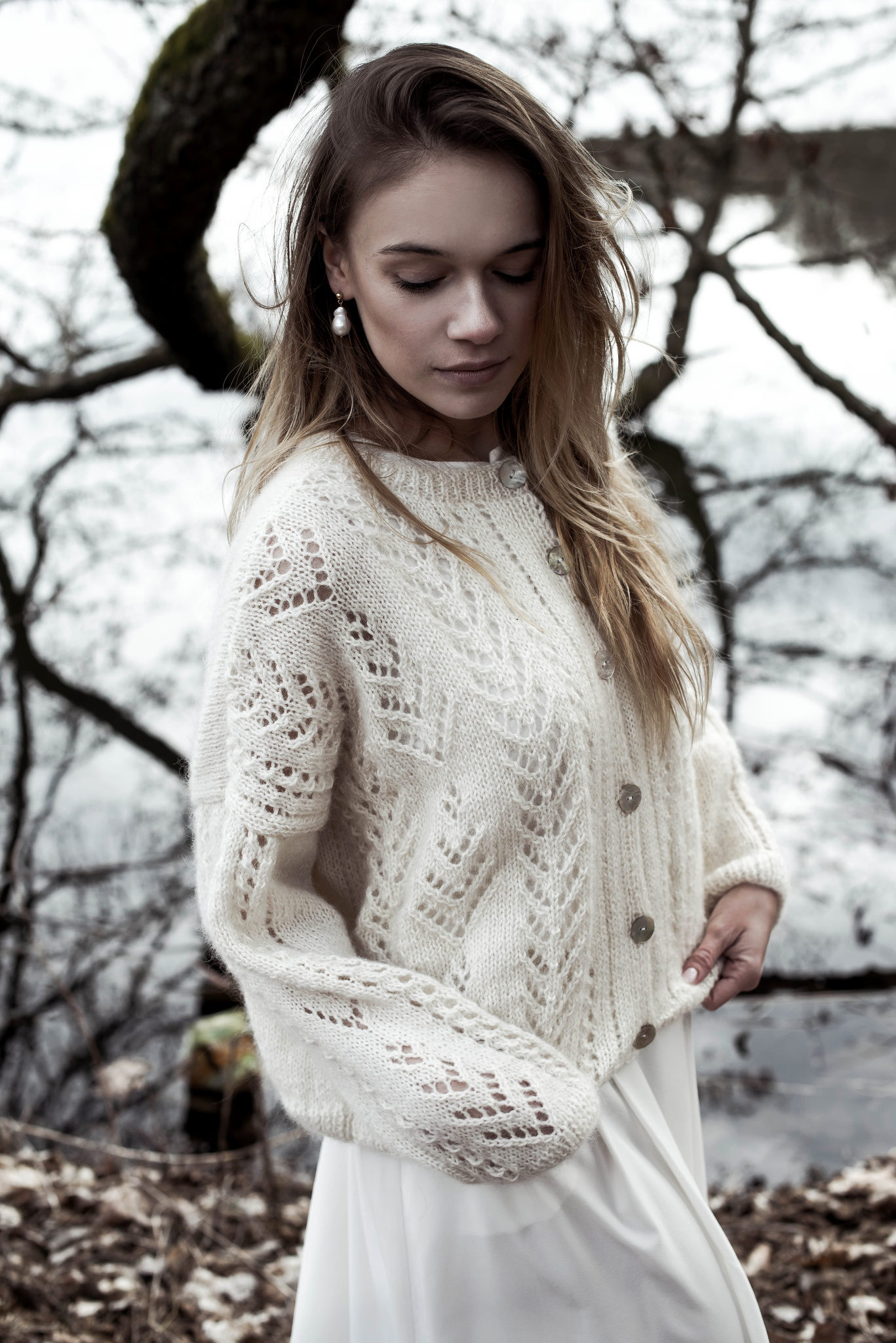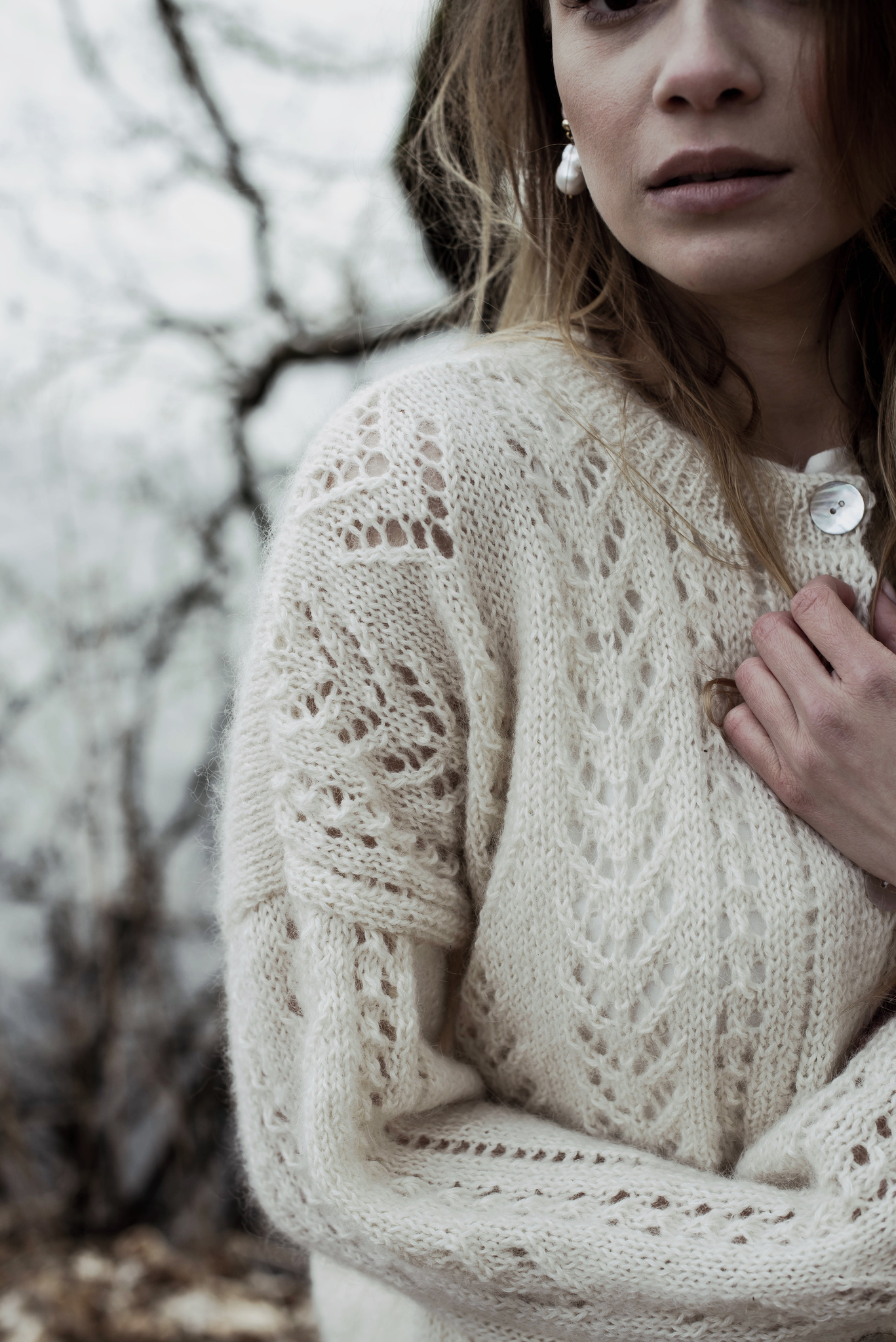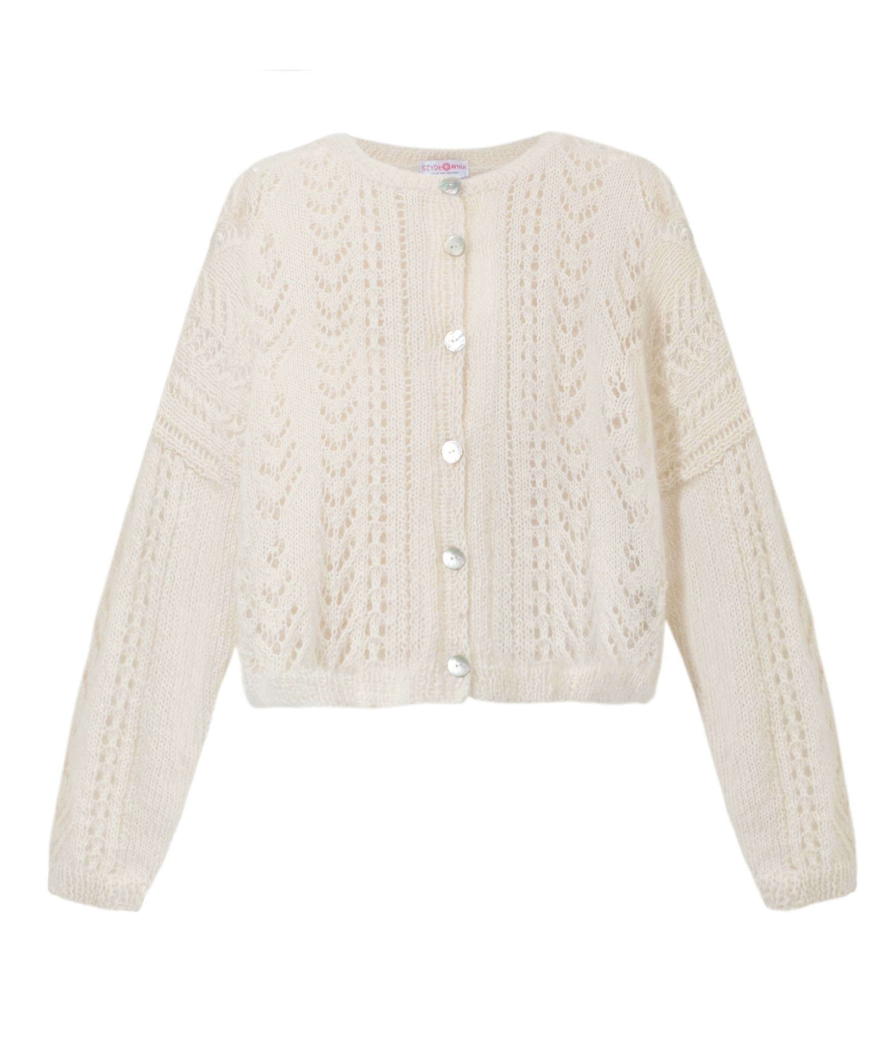 Ręcznie robiony sweter zapinany na ozdobne guziki z masy perłowej. Ażurowe zdobienia z przodu i na rękawkach. Luźny fason, wykończony ściągaczem. Ozdobny ścieg i bardzo delikatna włóczka sprawiają, że sweter nadaje się nie tylko na codzień ale również na szczególne okazje takie jak ślub i wesele. Na zamówienie dostępny jest w innych kolorach.