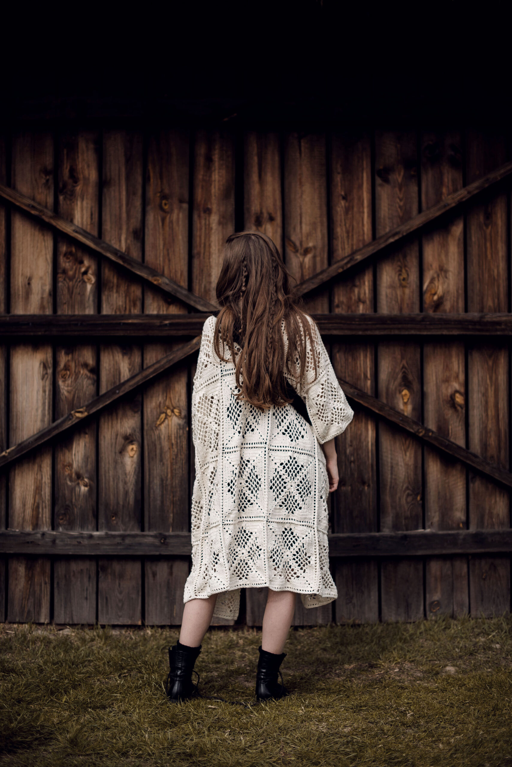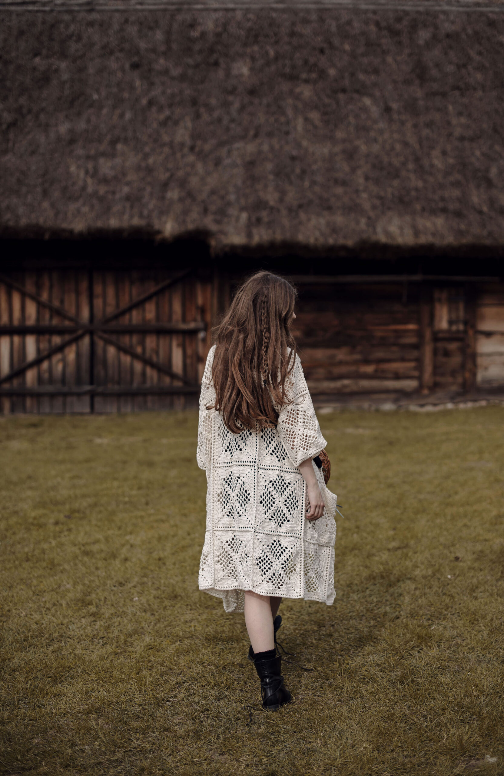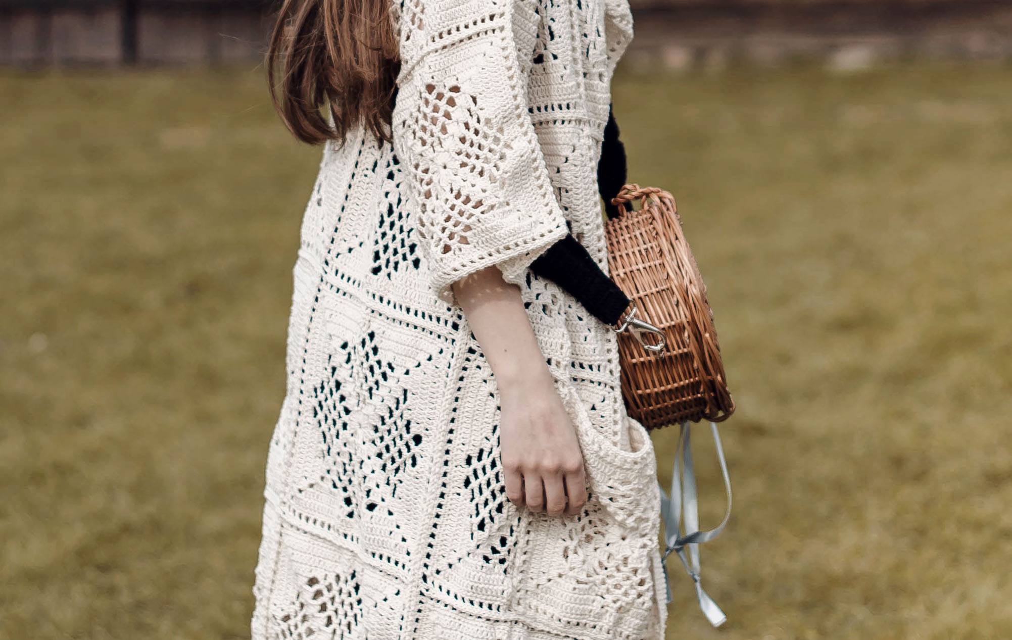 Ażurowy kardigan z kieszeniami w kolorze ecru wykonany całkowicie ręcznie na szydełku. Luźne, szerokie rękawki. Na zamówienie kardigan dostępny jest w innych kolorach.
