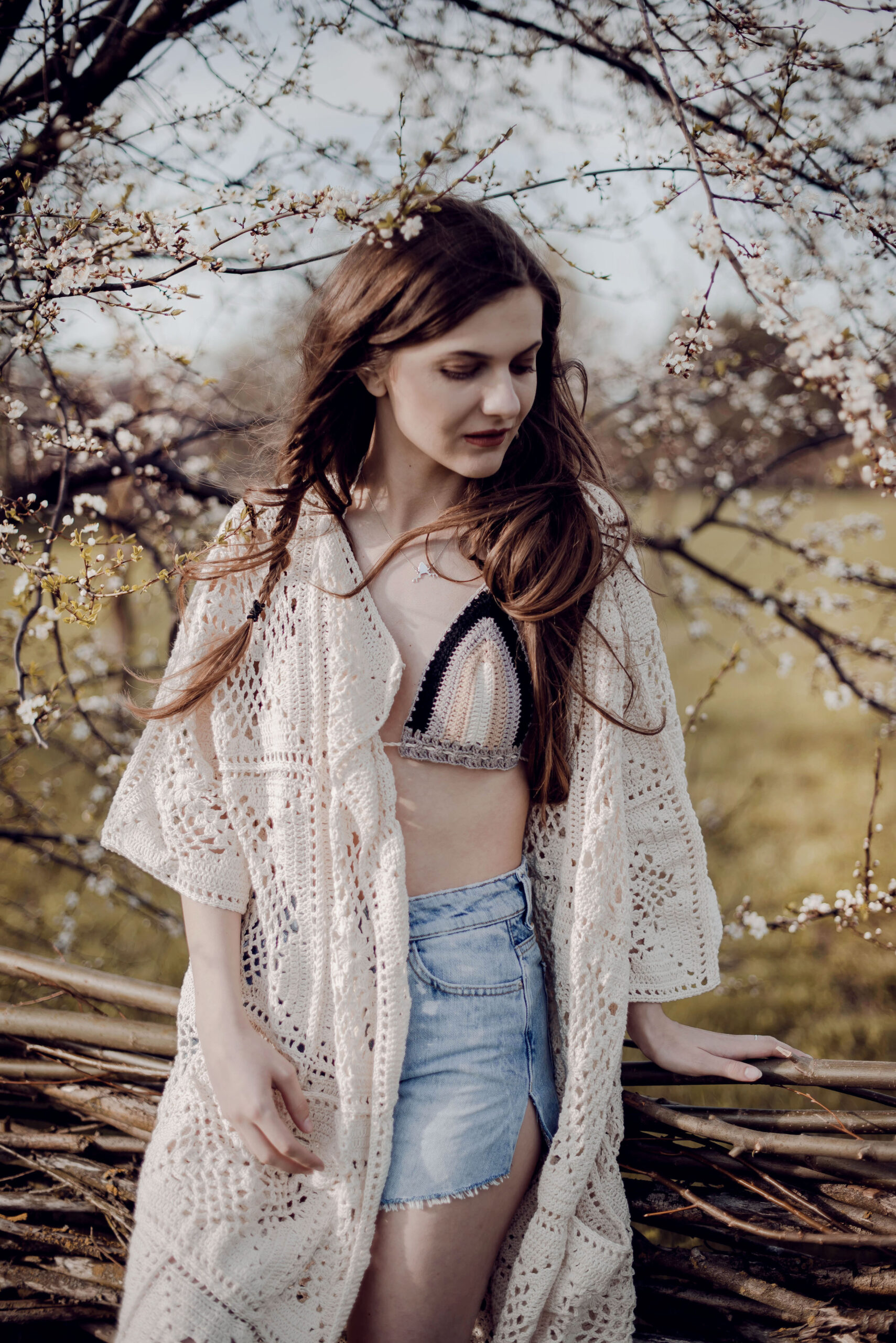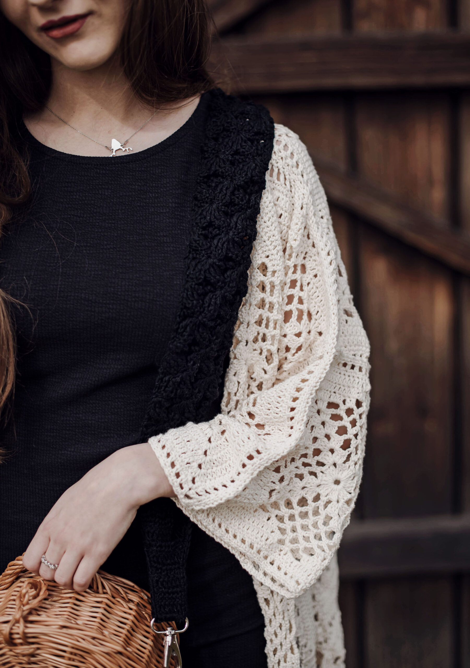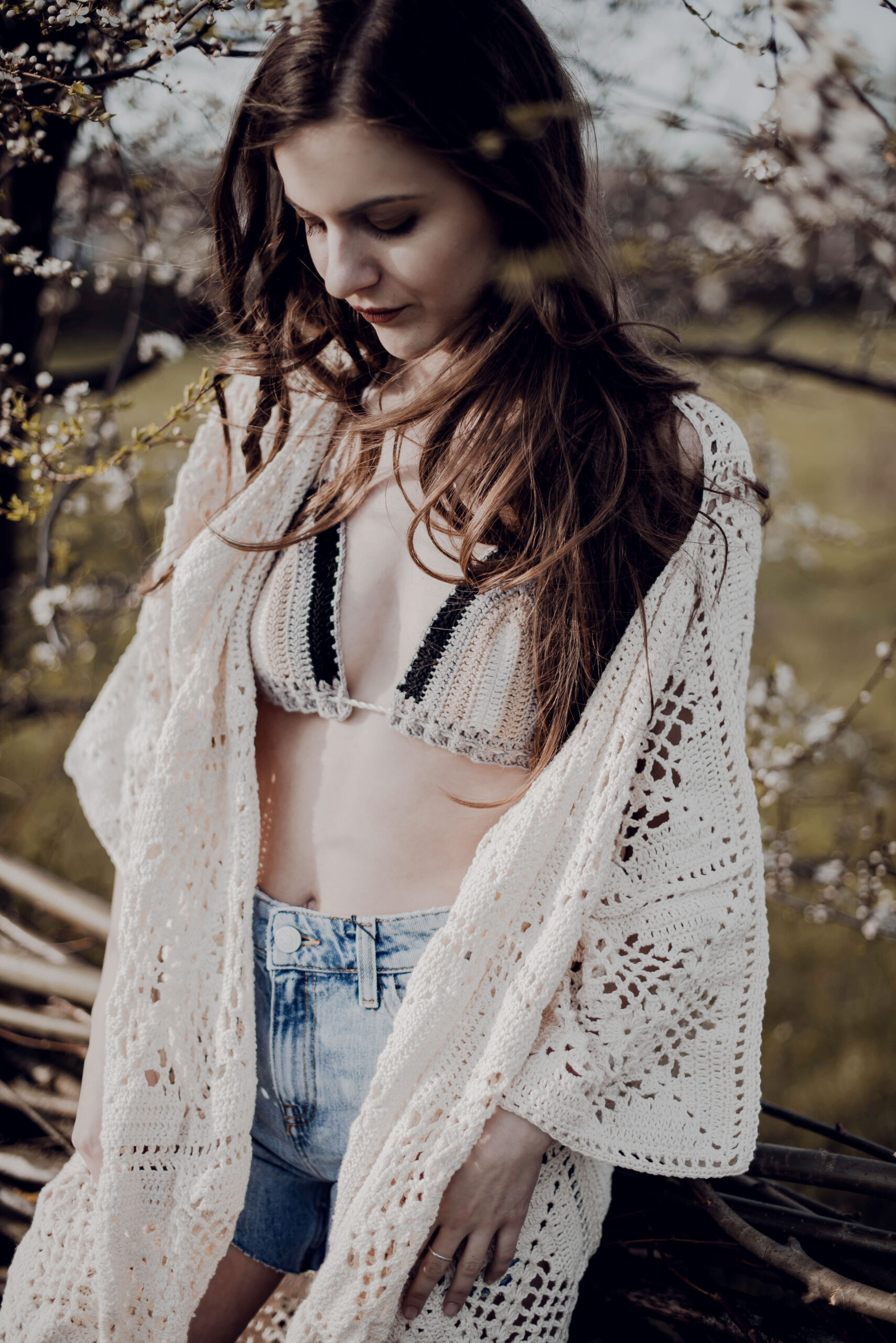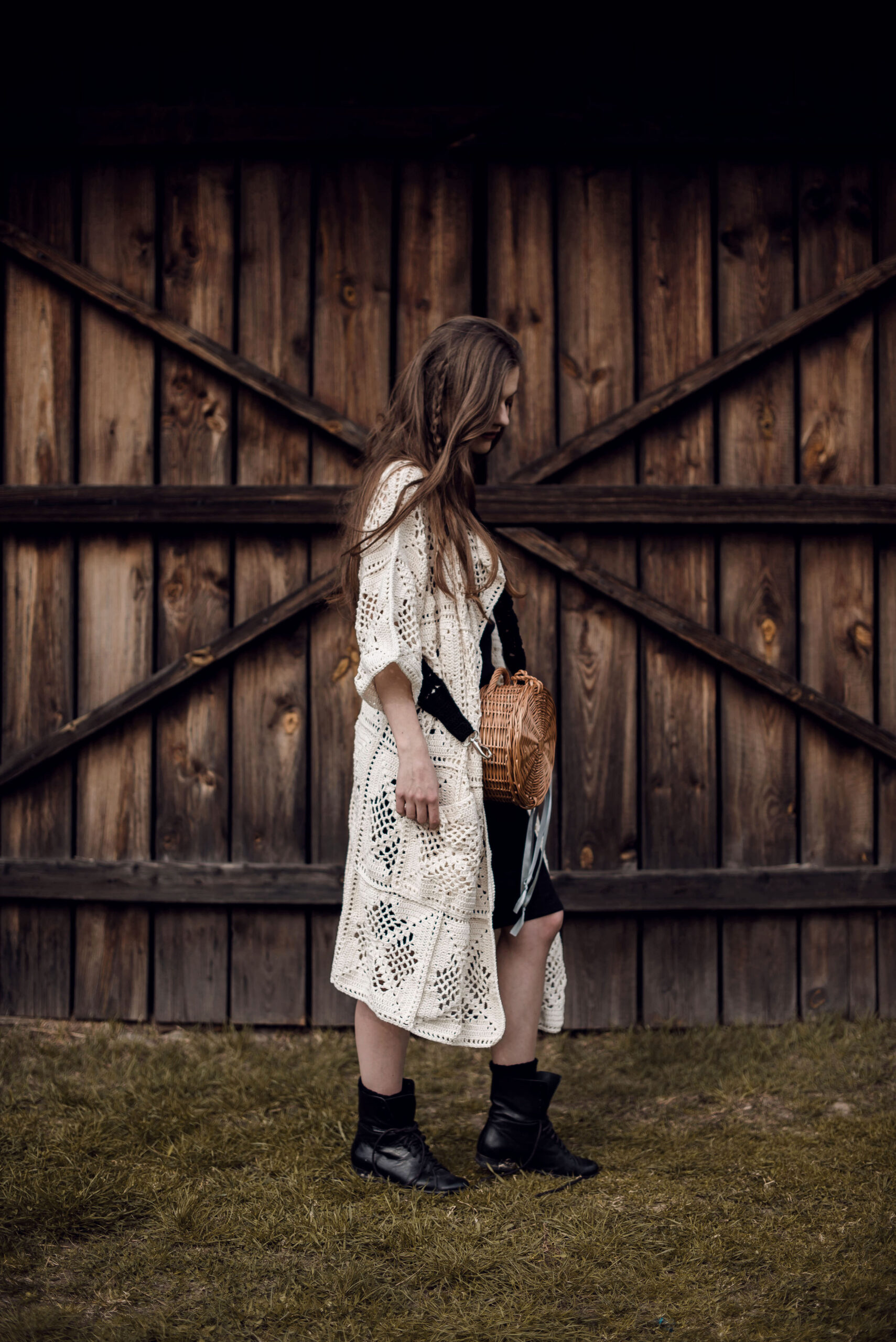 Ażurowy kardigan z kieszeniami w kolorze ecru wykonany całkowicie ręcznie na szydełku. Luźne, szerokie rękawki. Na zamówienie kardigan dostępny jest w innych kolorach.