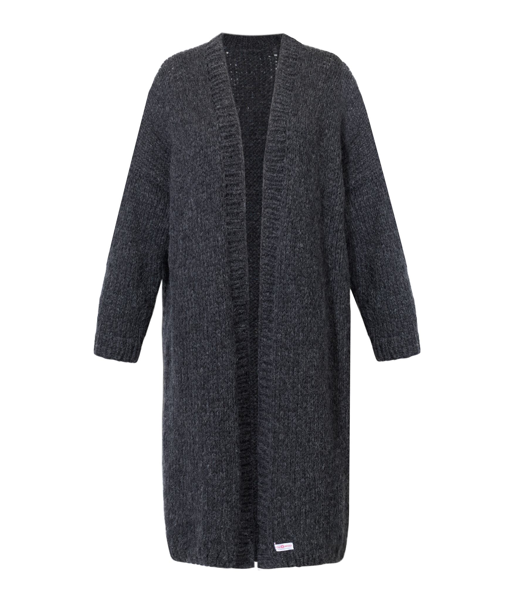 Długi, klasyczny kardigan wydziergany ręcznie splotem prostym z ciepłej i miłej w dotyku wełny i wykończony ściągaczem. Na zamówienie kardigan dostępny jest w innych kolorach.