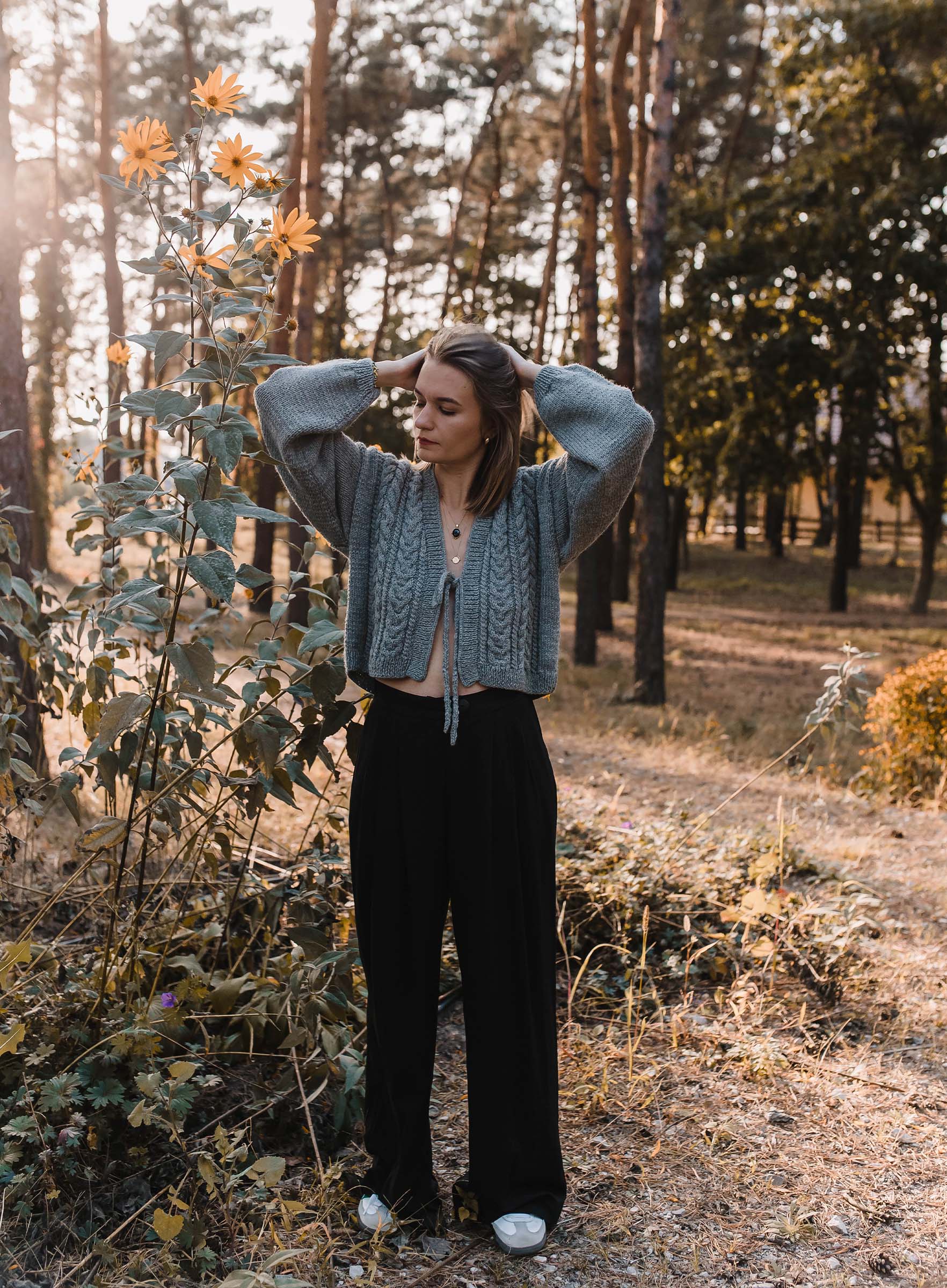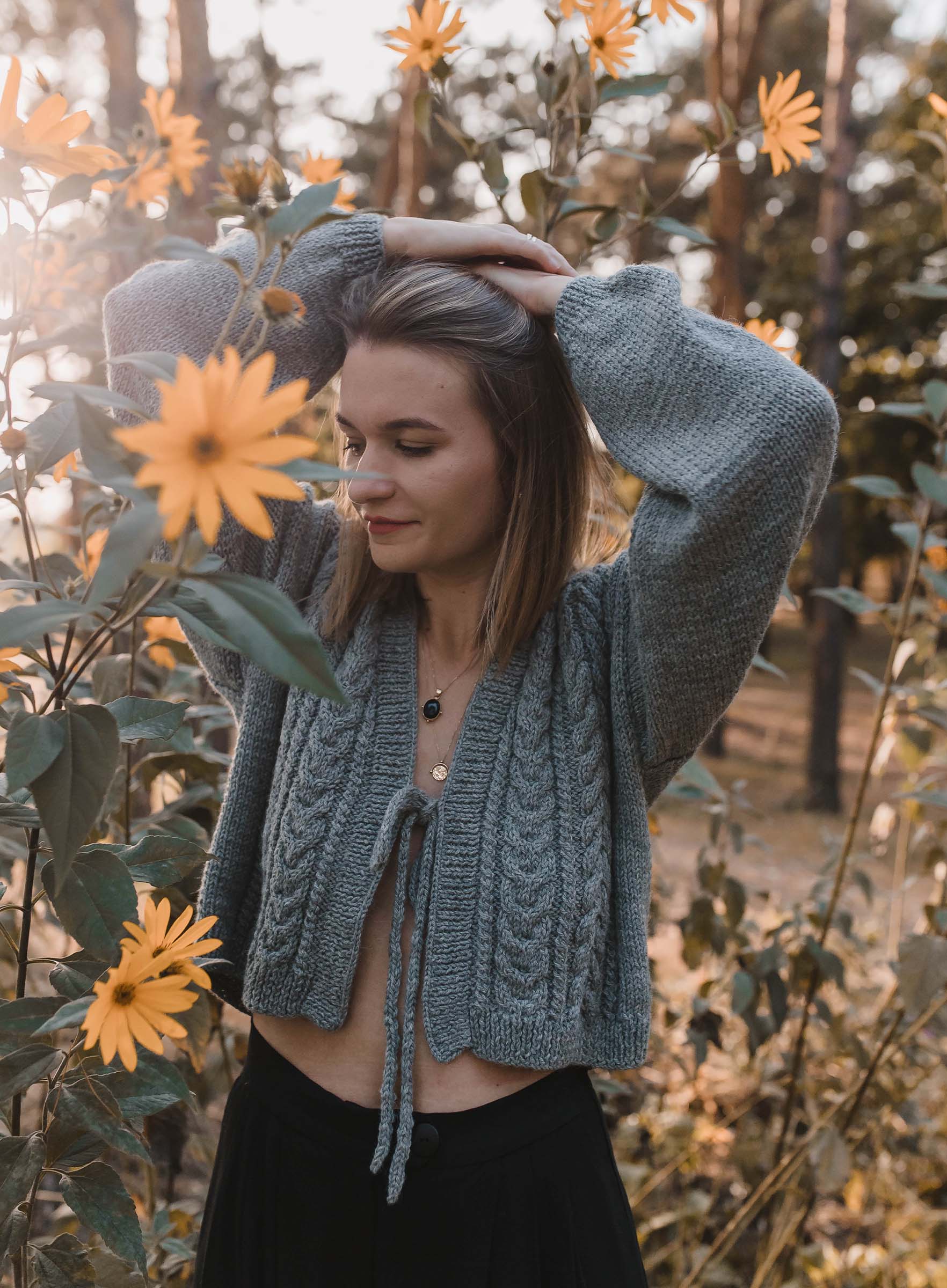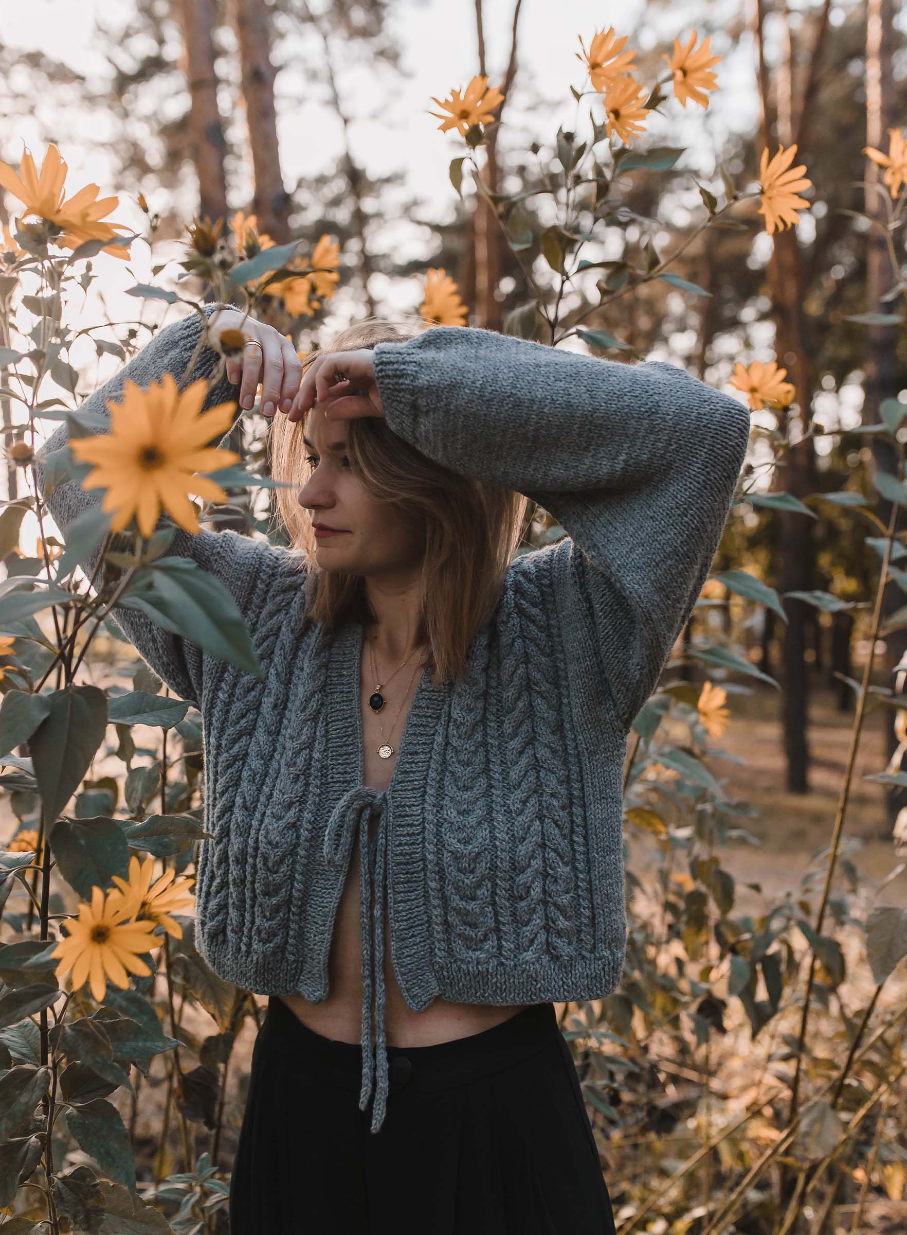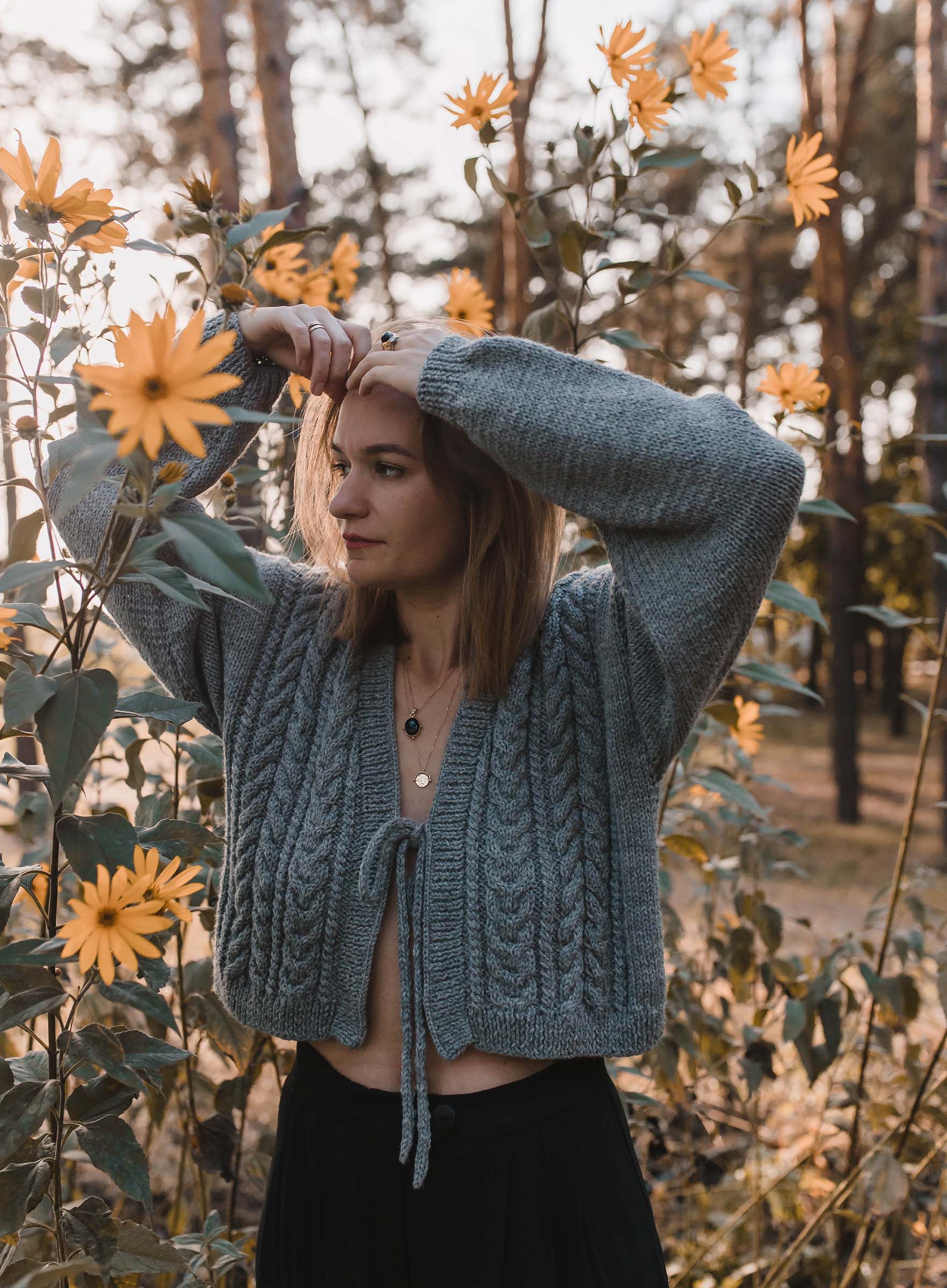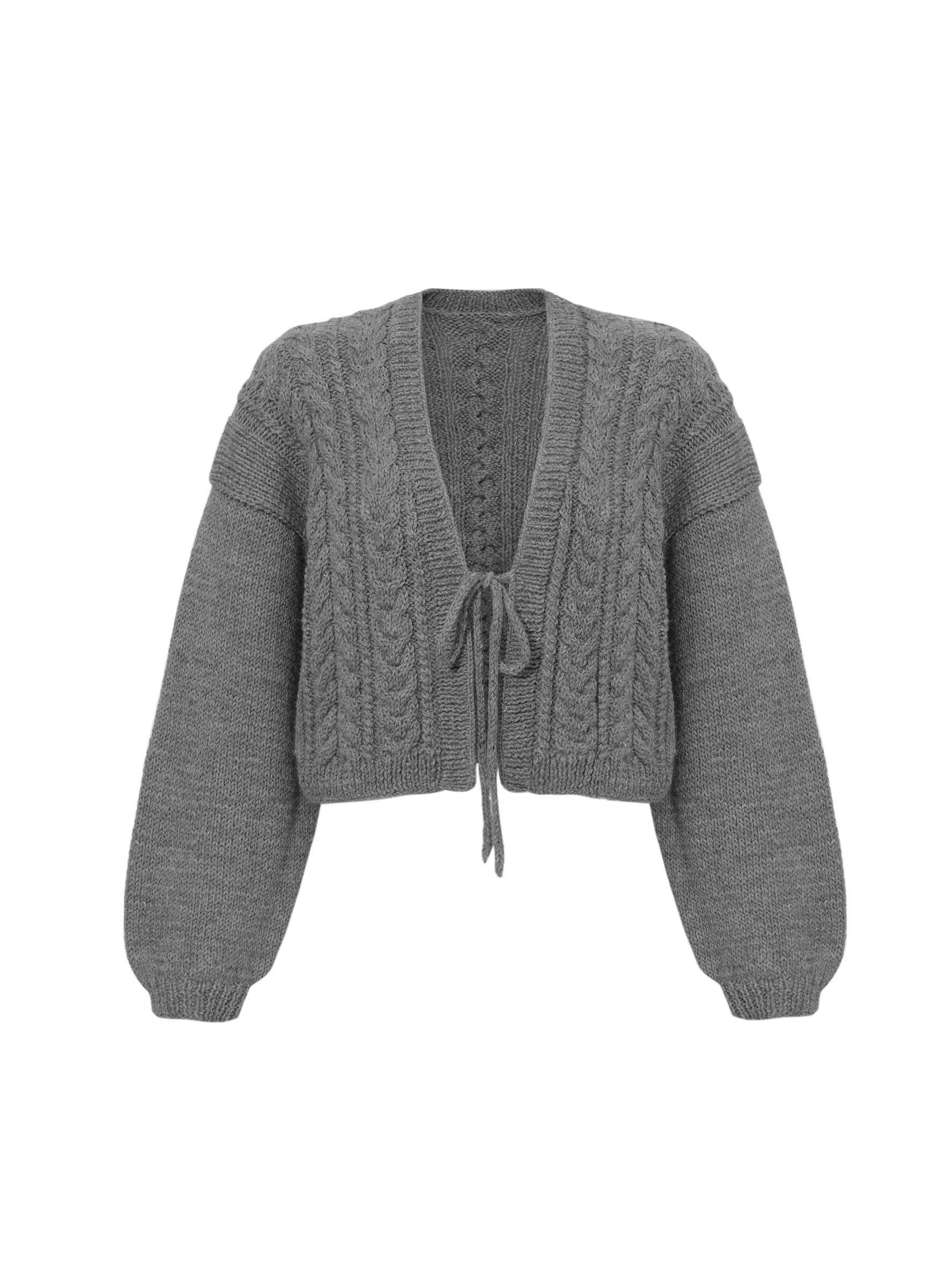 Sweter w warkoczowy splot. wykończony ściągaczem. Posiada wiązanie na wysokości biustu.