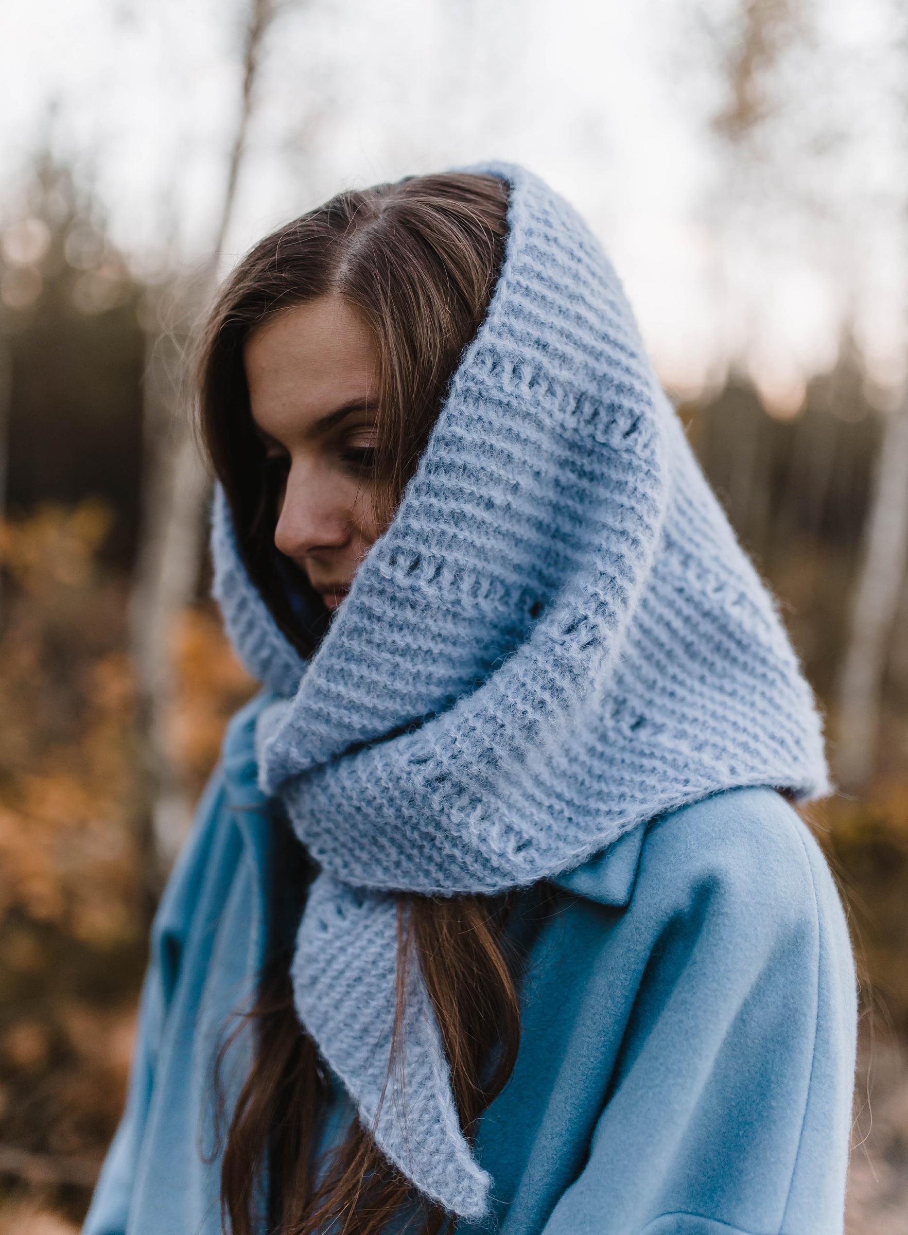 Chustka w kolorze lawendowym wydziergana ręcznie ściegiem francuskim. Do noszenia na głowie albo wokoło szyi.